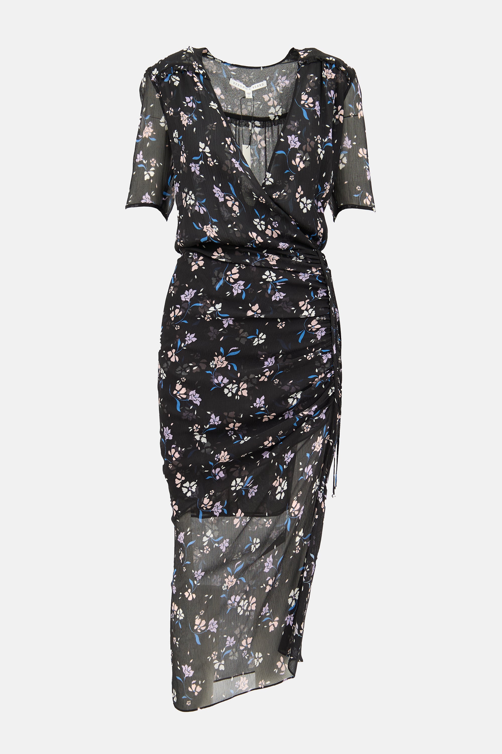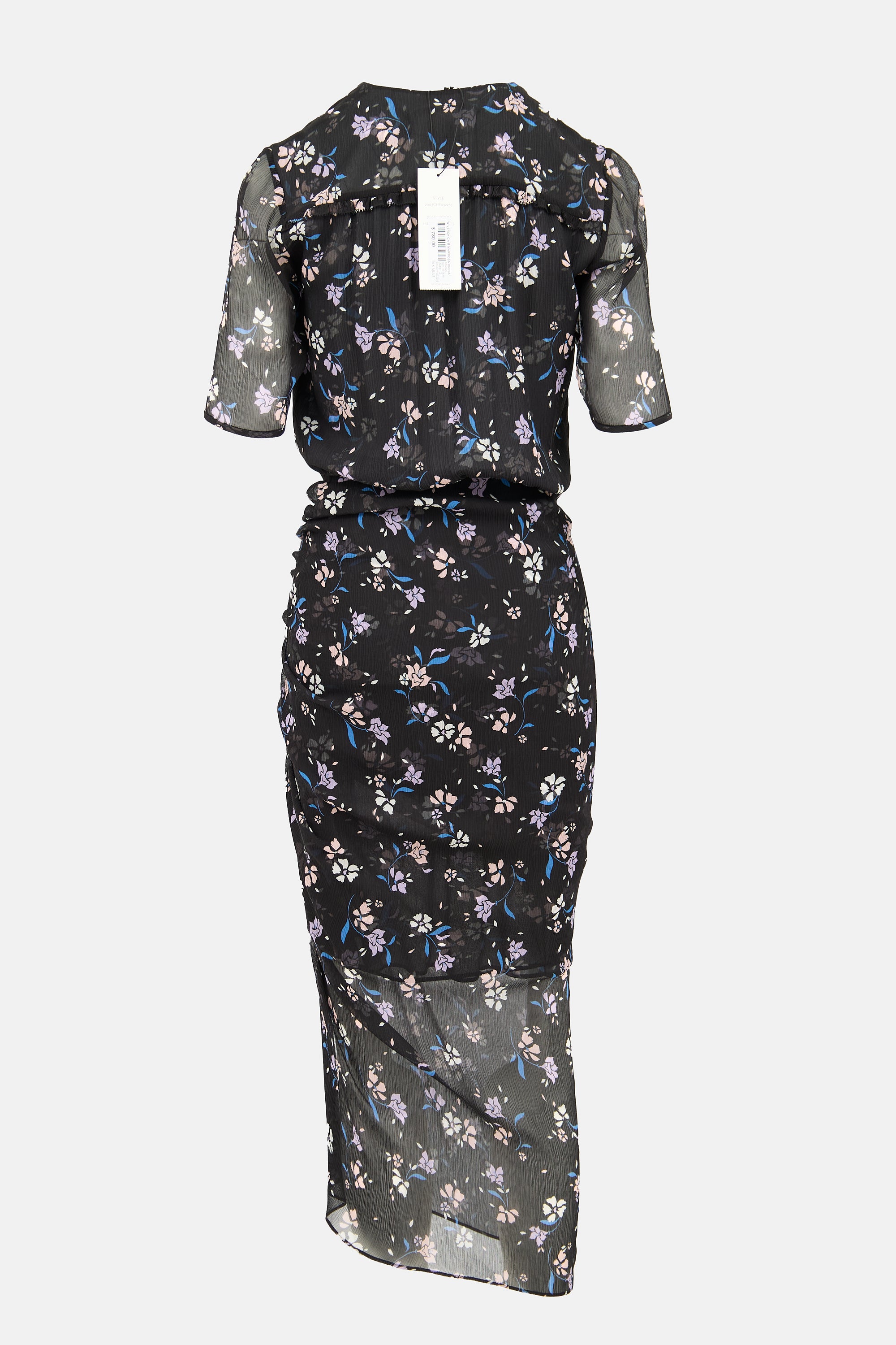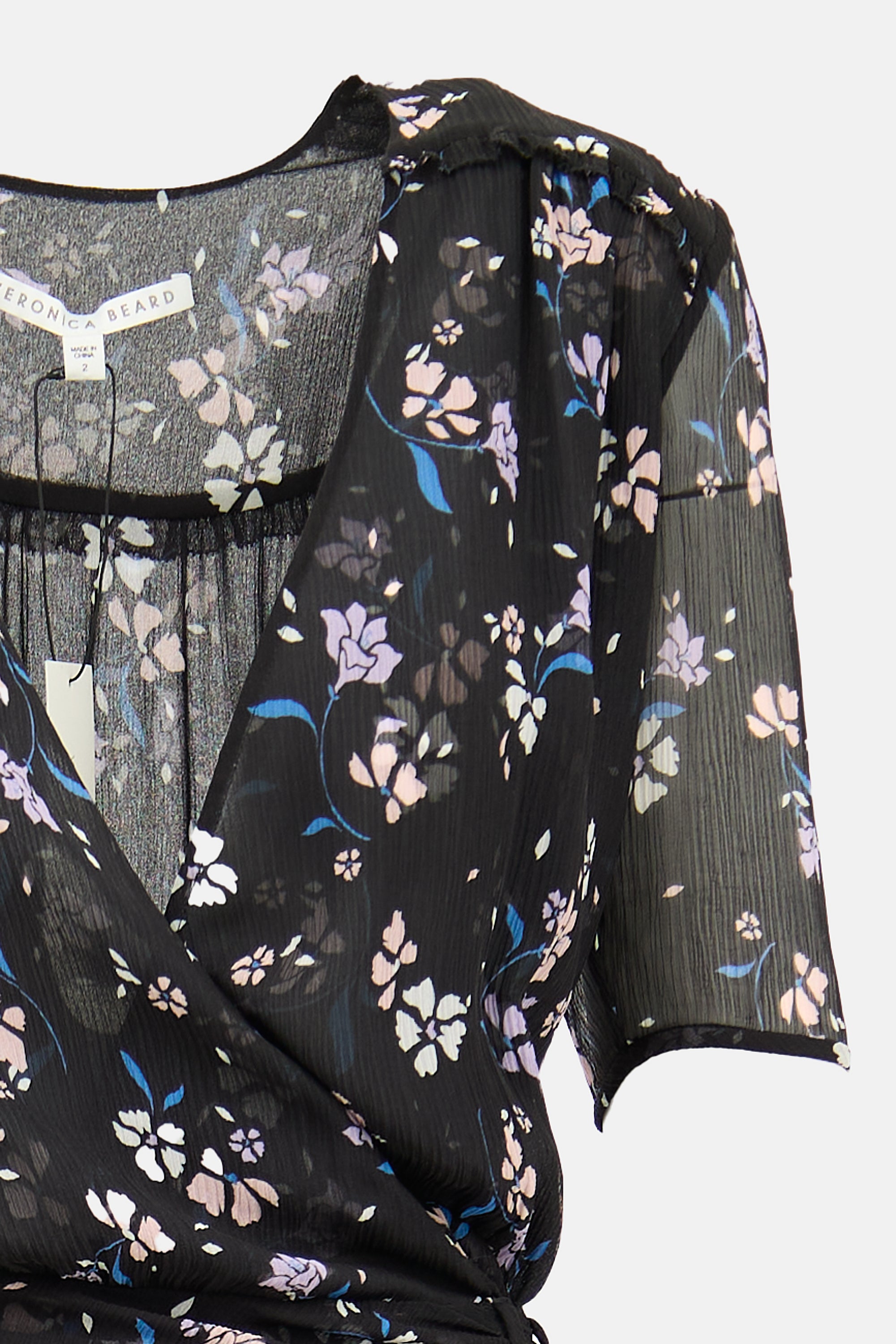 Veronica Beard black and multicolour Mariposa dress featuring floral print, surplice neckline, zip closure at front with tie fastening, and ruched skirt. Half lined.