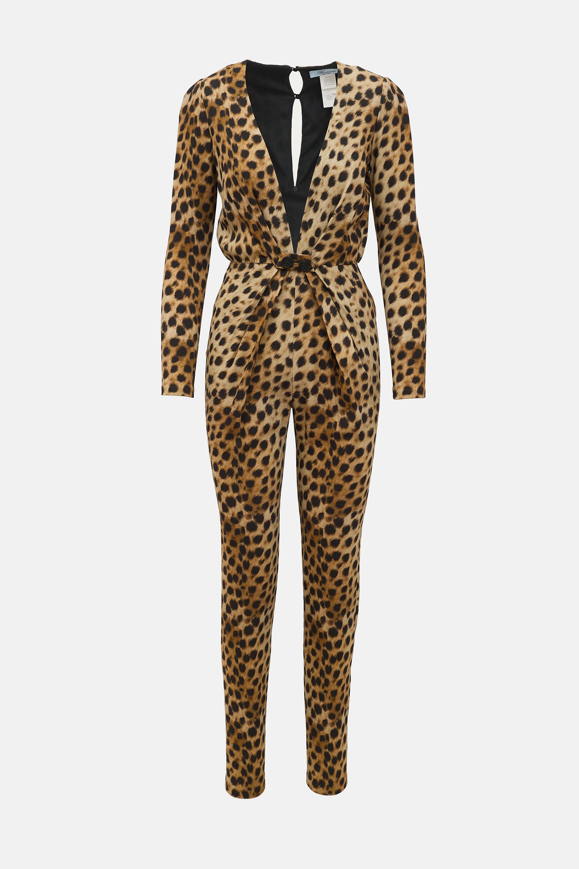 Pre-owned Blumarine brown leopard printed jumpsuit featuring a plunging V-neckline, gathered front with button detail, back zip and button closure, and slim leg. Lined.