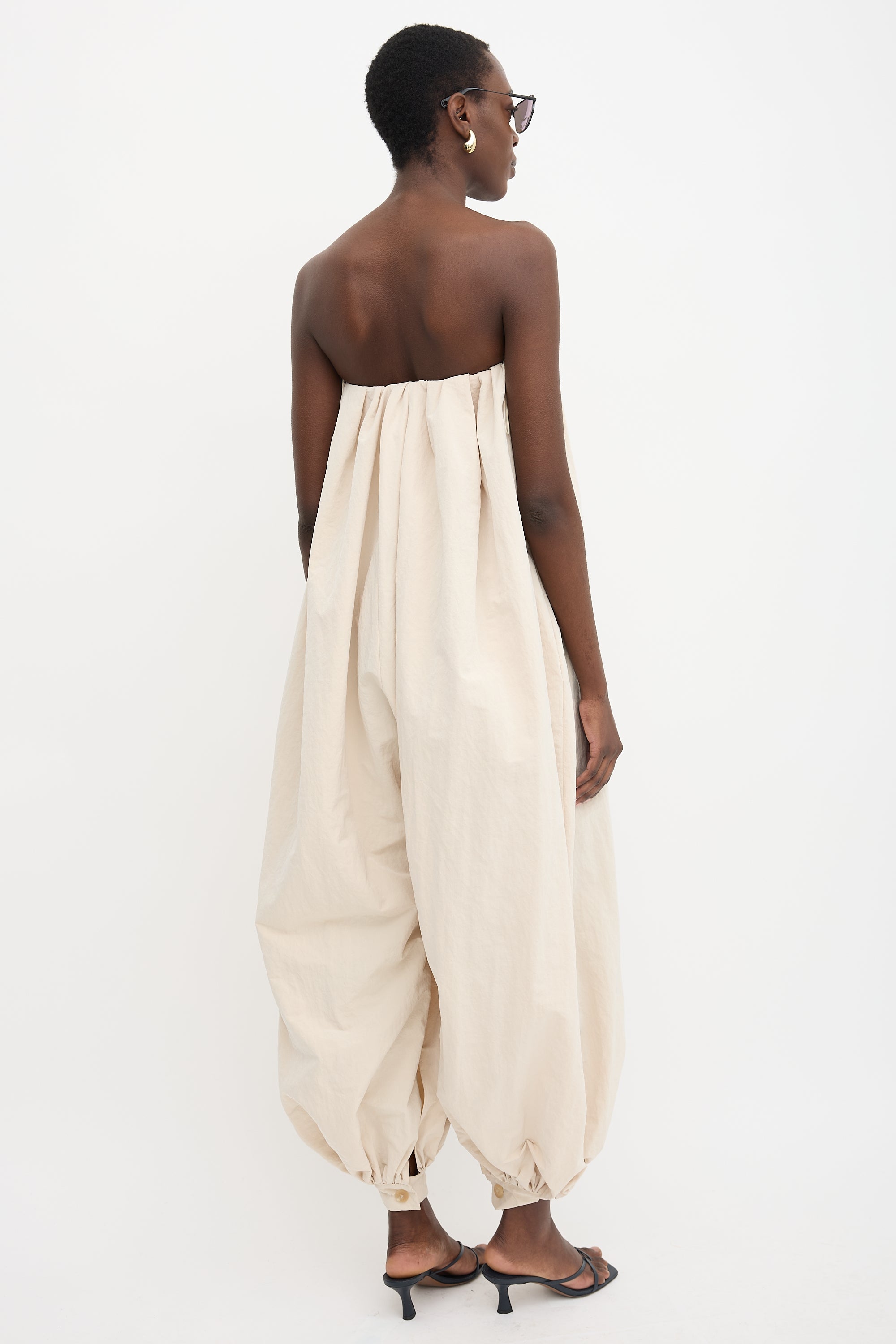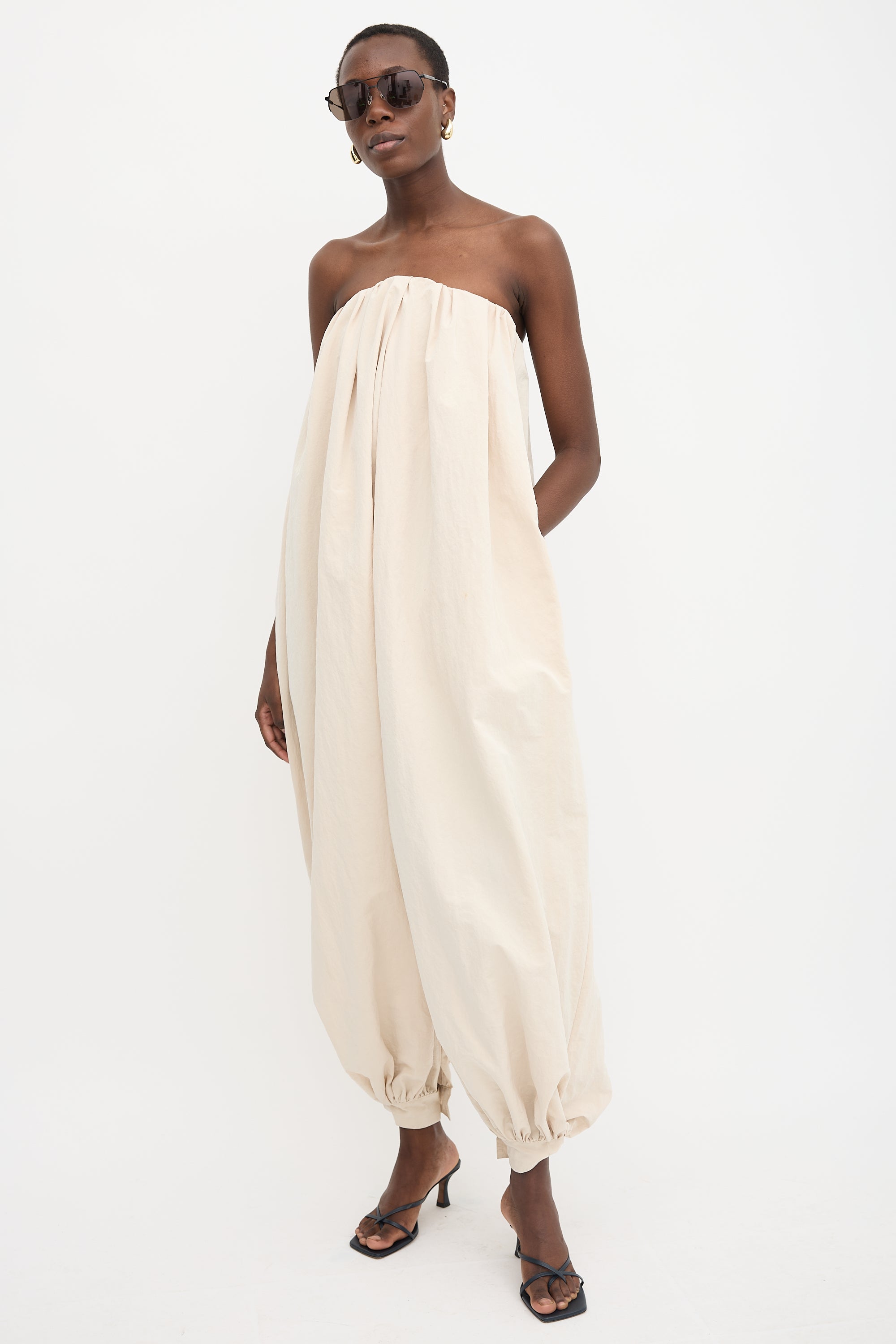 Pre-owned Jacquemus beige La Combinaison Calisson jumpsuit featuring a straight pleated neckline, interior boned corset, two inseam pockets, concealed back button closure, and wide legs with buttoned cuffs.