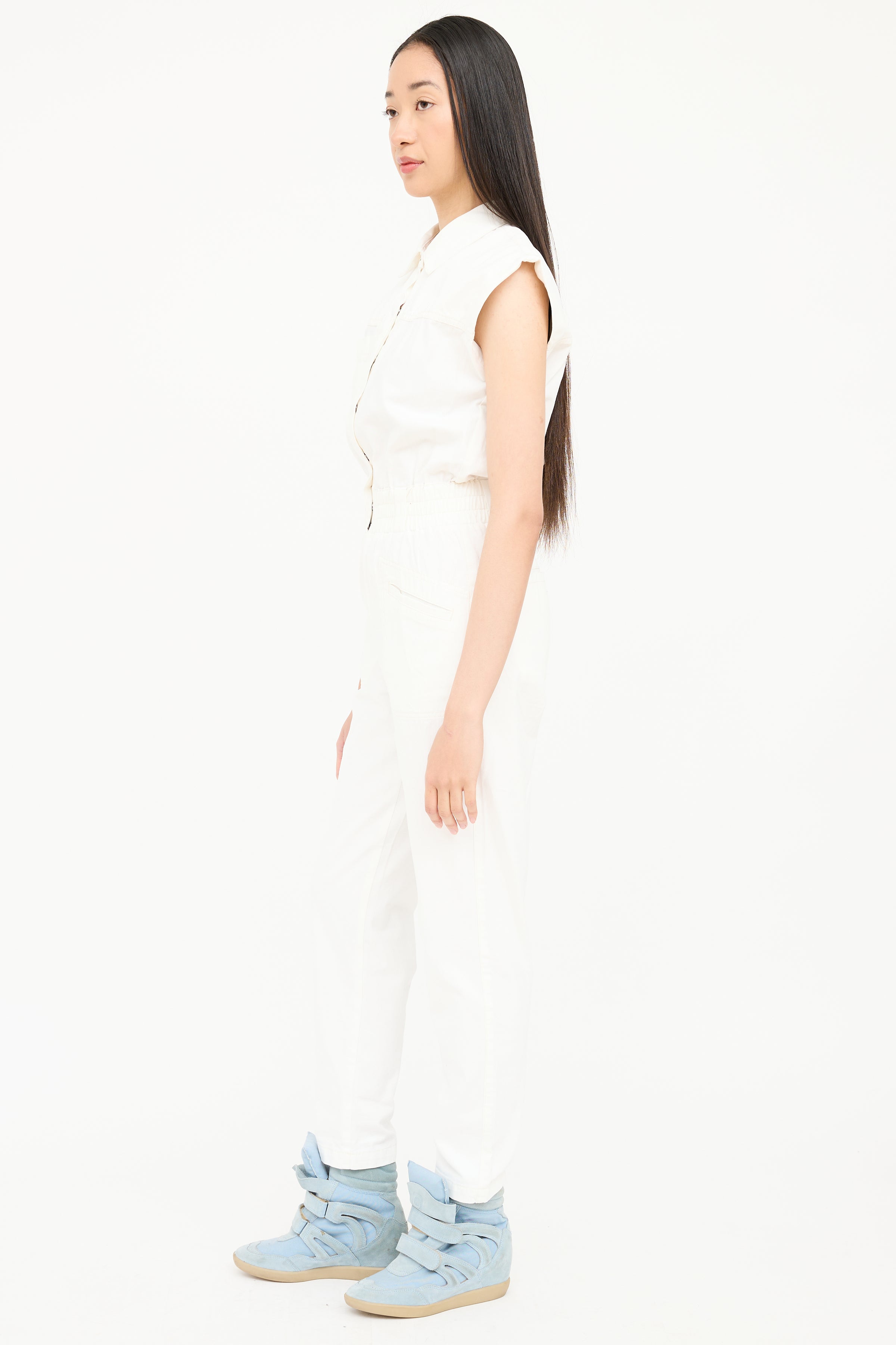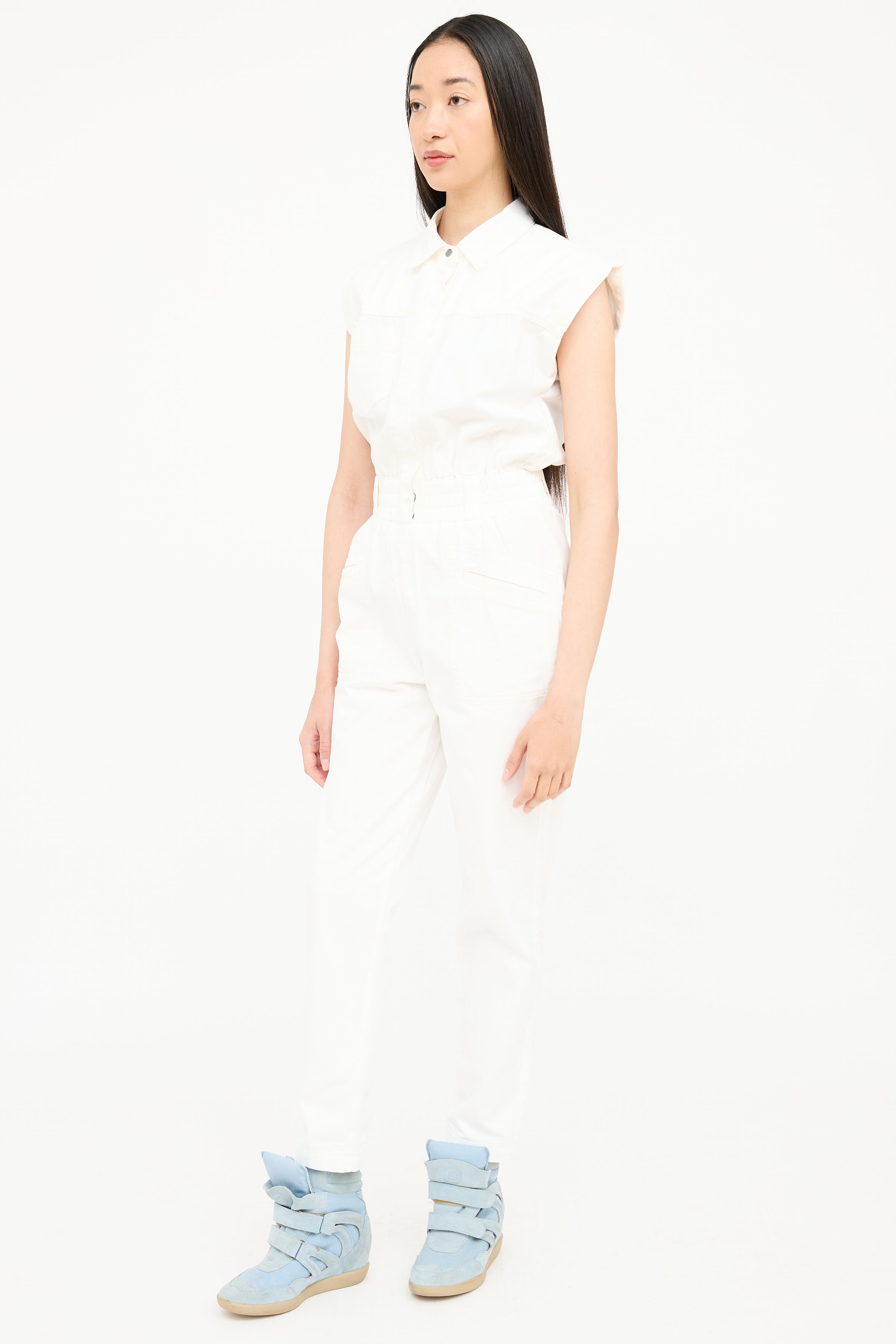 Pistola white sleeveless jumpsuit featuring a pointed collar, one patch pocket at chest, cinched waist, two slip pockets at hip, tapered leg, and snap button closure at front.