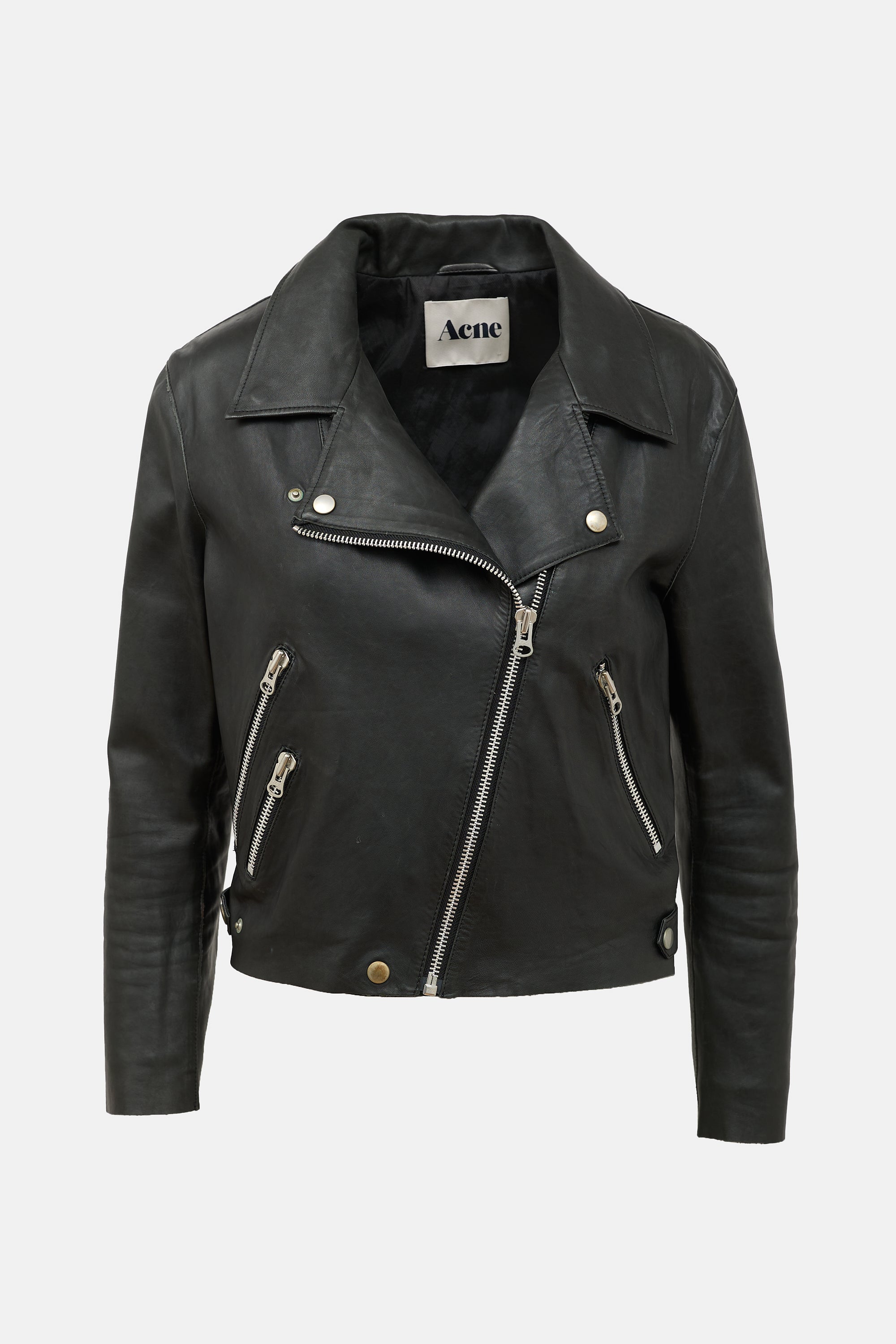 Pre-owned Acne Studios black leather biker jacket featuring wide collar and lapel, asymmetric zip up front, three front zip pockets, one interior zip pocket, snap buttons at side hem, zipped cuffs, and raw edges. Partially lined.