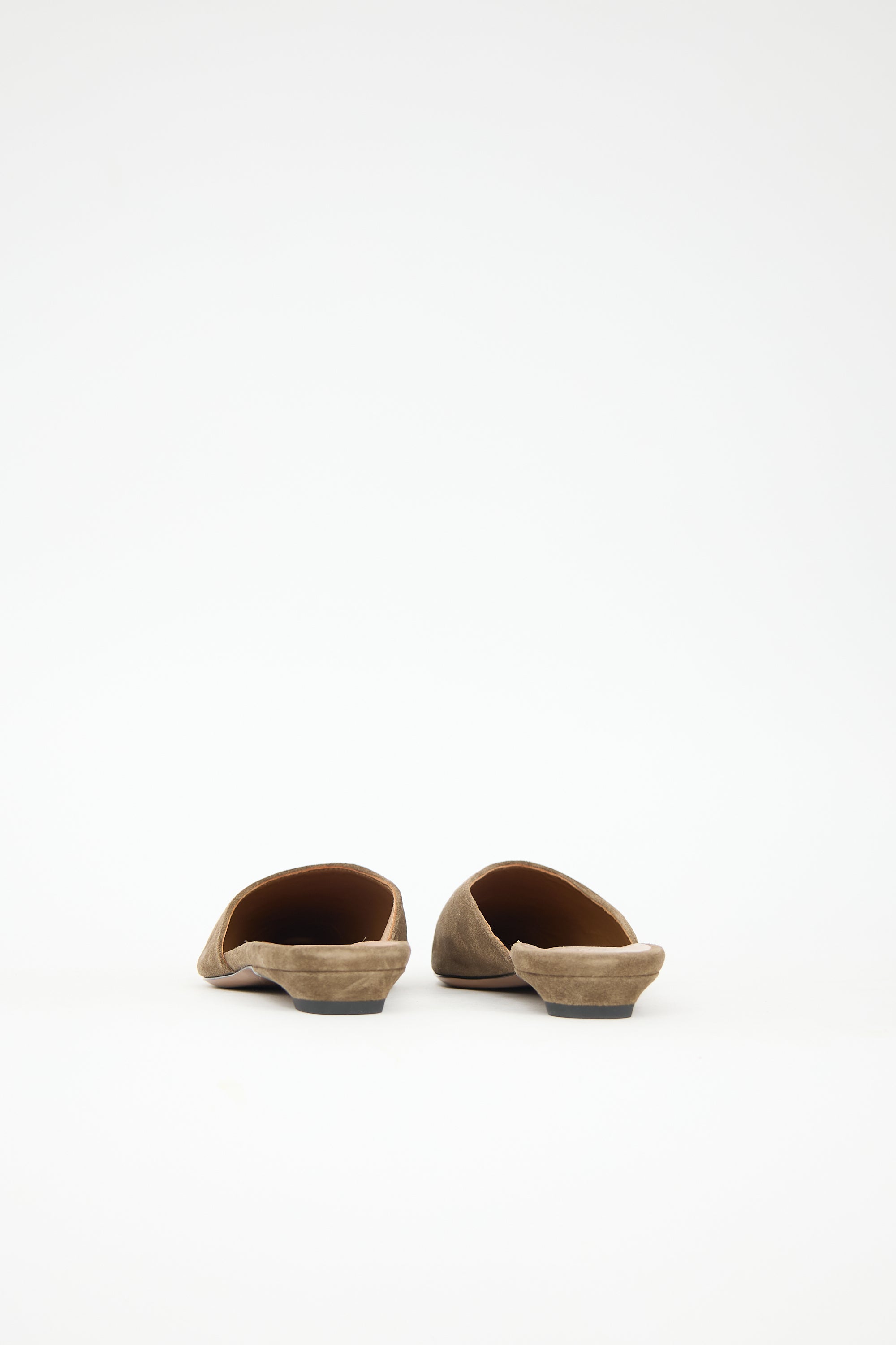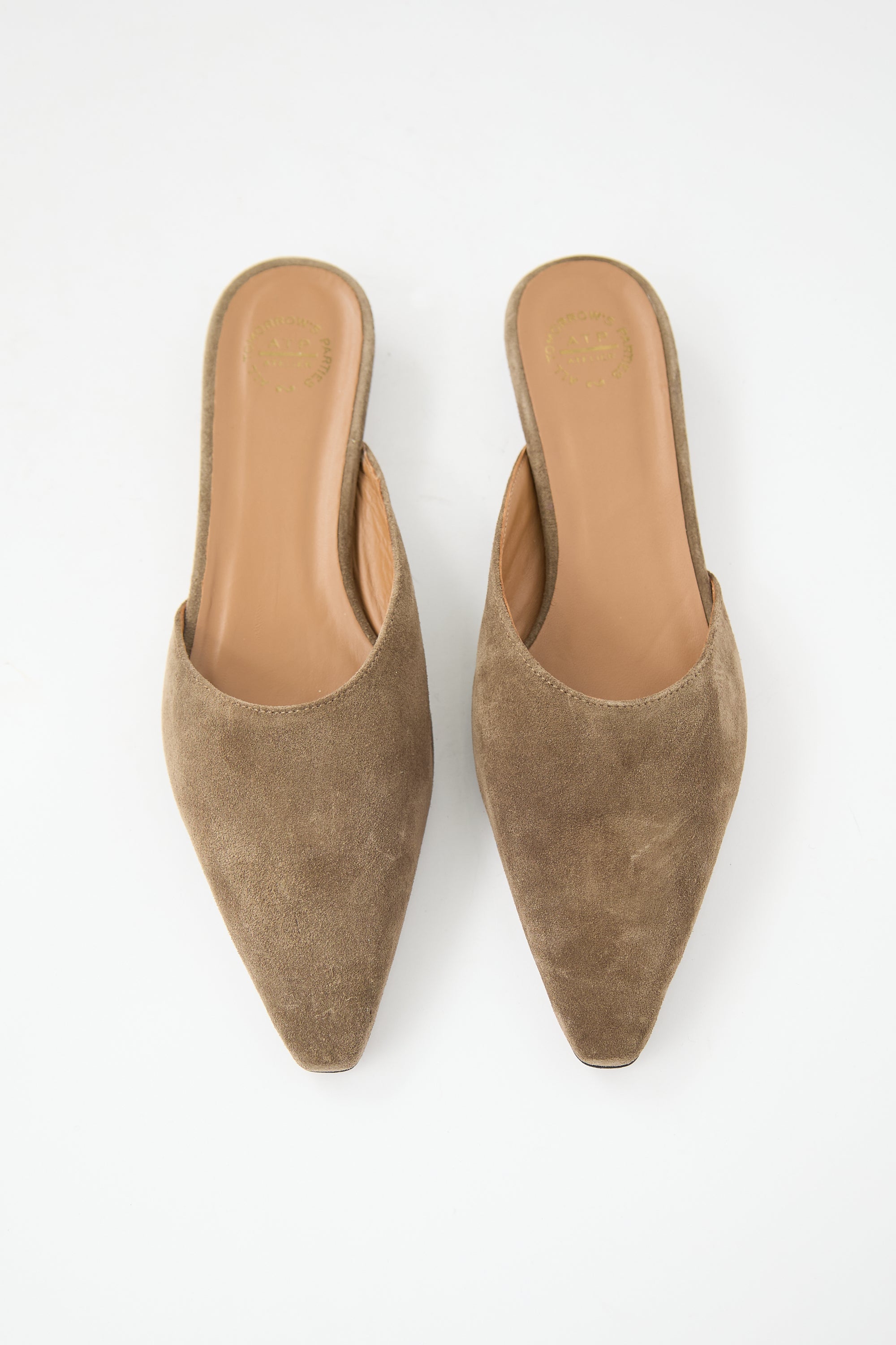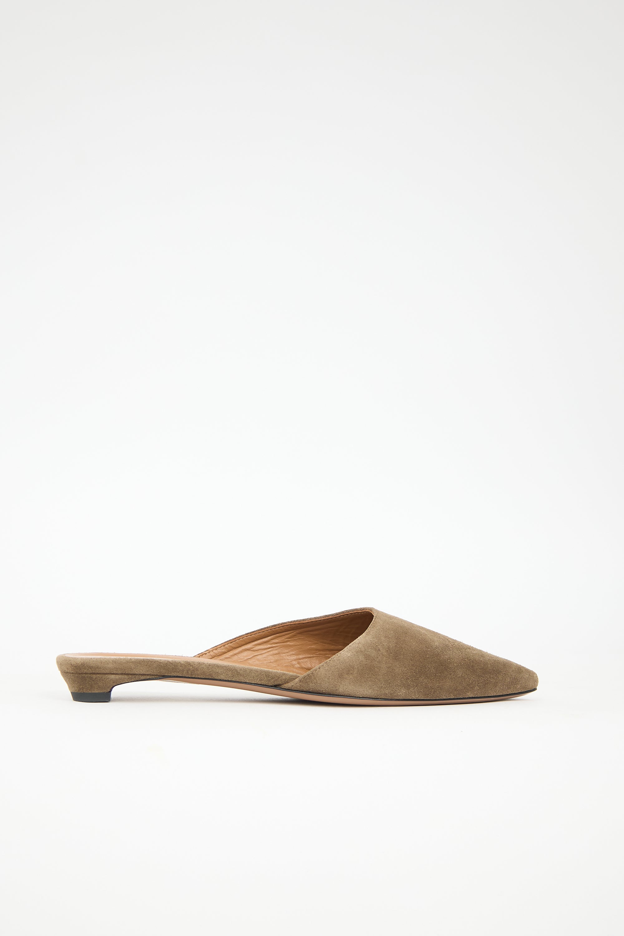 Pre-owned ATP Atelier khaki green suede Fioli mules featuring almond toe, short covered kitten heel, and leather insole and outsole.
