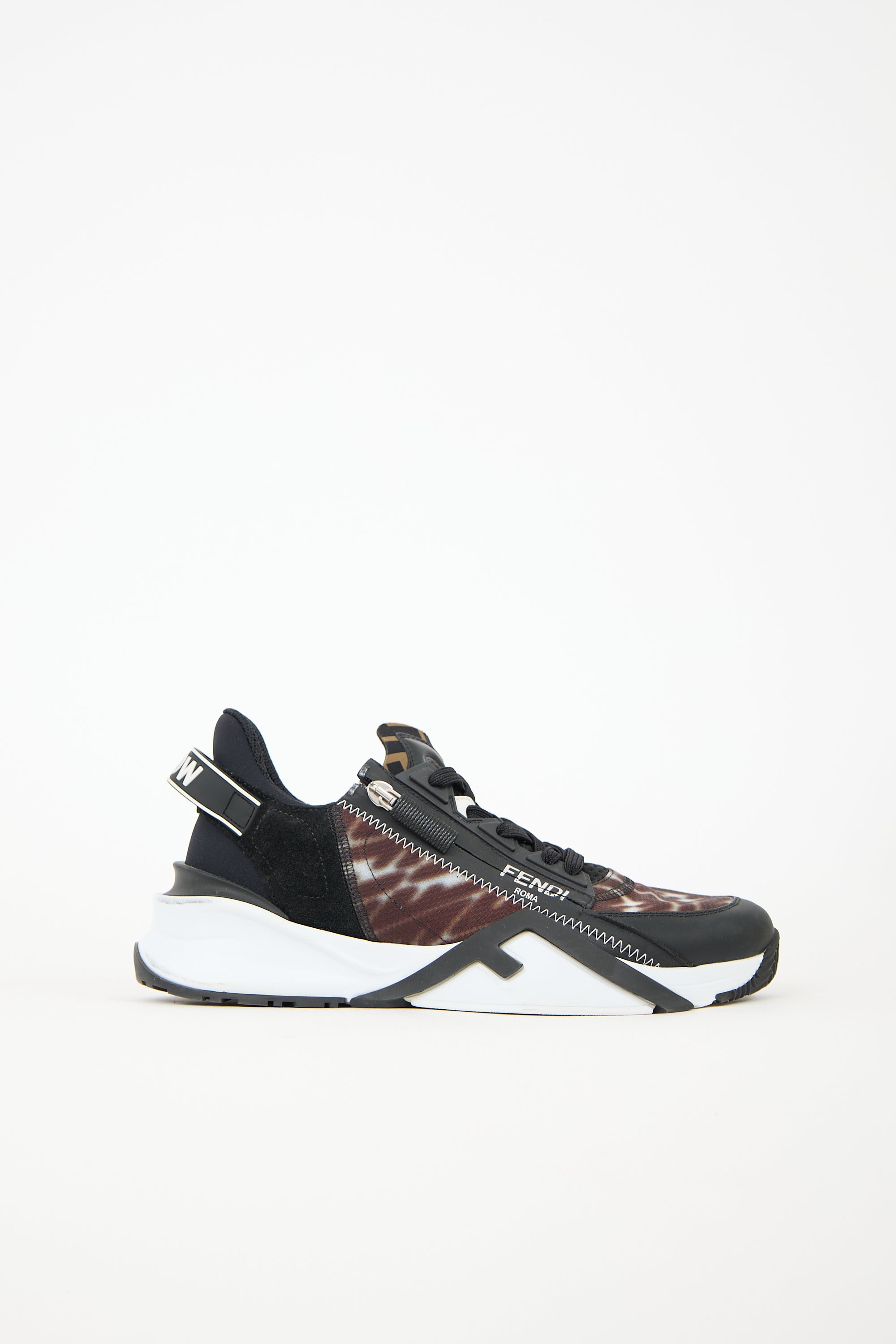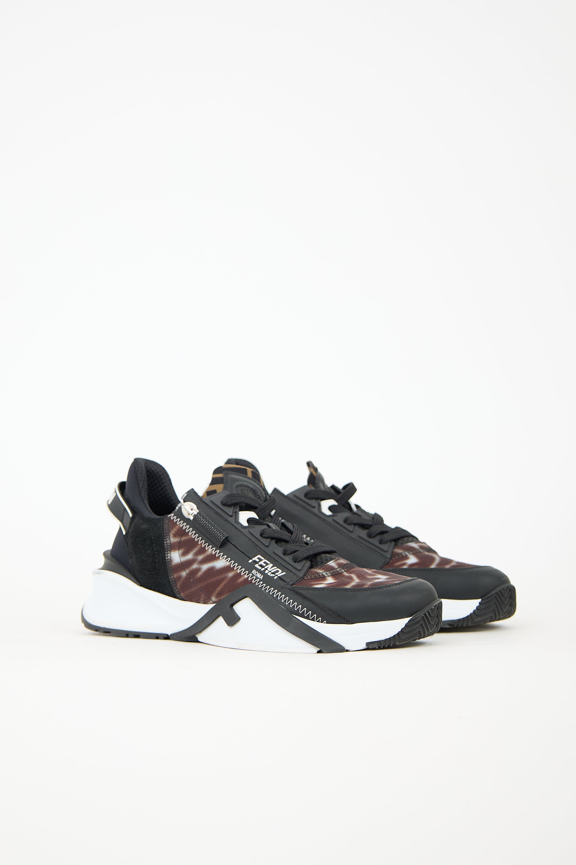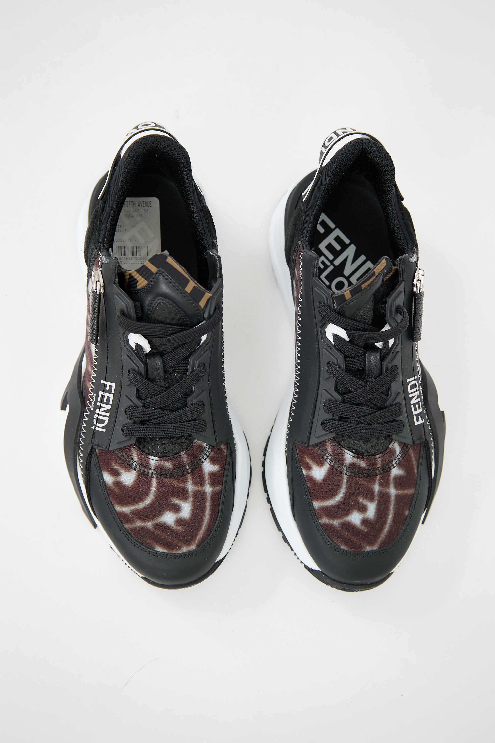 Pre-owned Fendi black and multicolour Flow sneakers featuring rounded toe, distorted FF printed upper, lace up front with side zip closure, rubberized Fendi Flow logo tab at back, and rubber outsole with F rubber logo at side. Includes original dust bag.