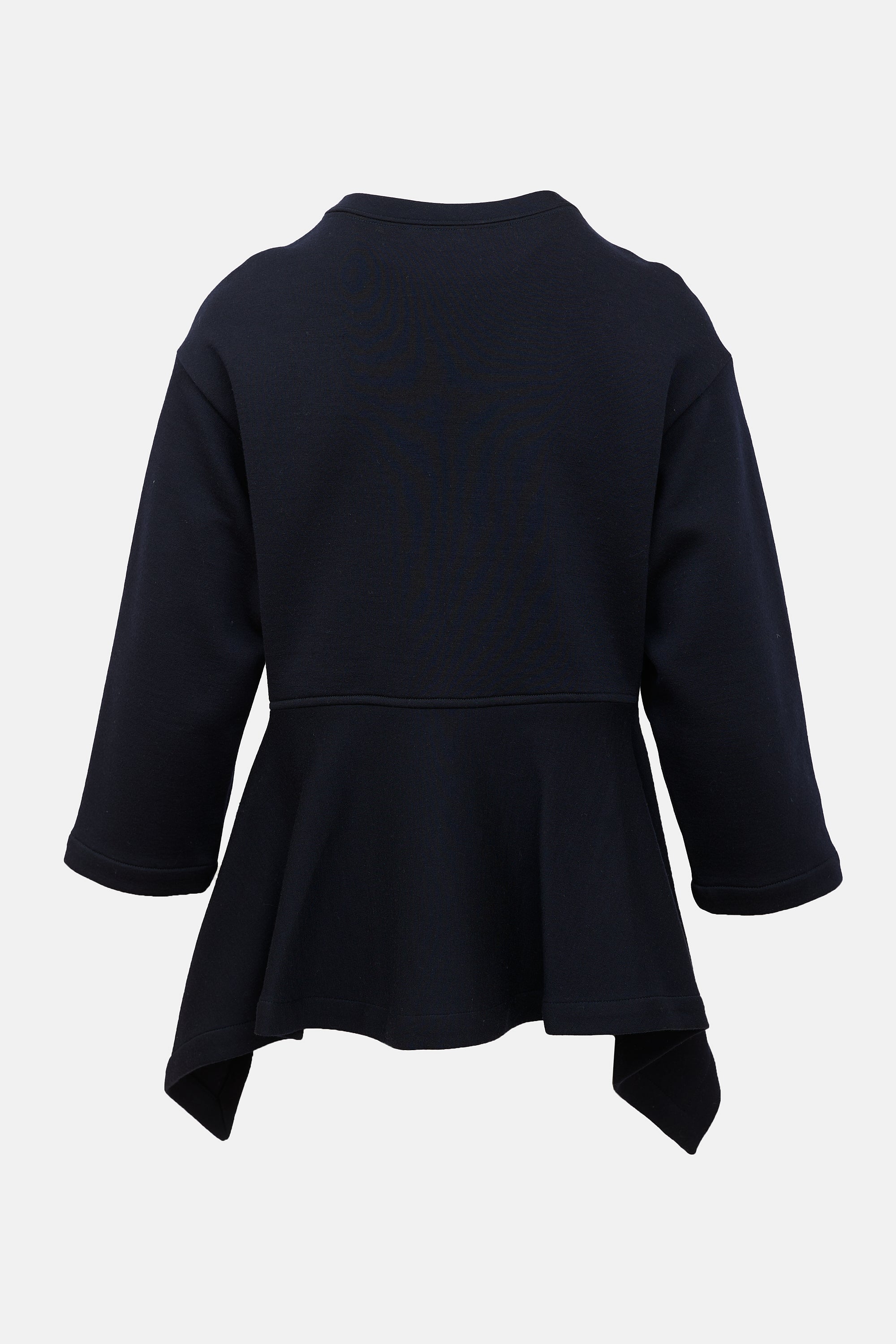 Pre-owned Marni navy jersey knit jacket featuring round neckline, two way zip up front, and draped lower back panel.