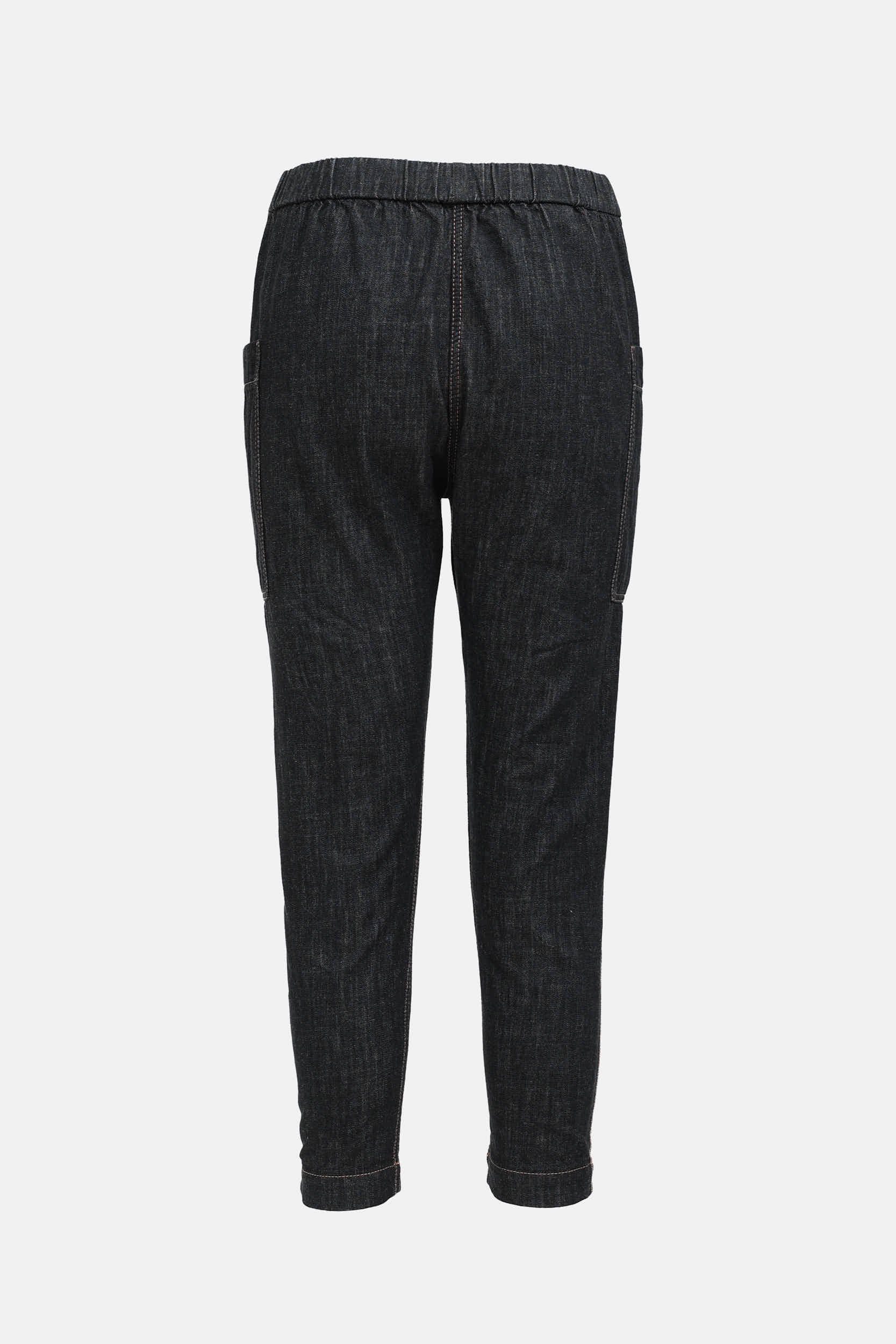 Pre-owned Brunello Cucinelli dark wash denim trousers featuring a drawstring waist, two patch pockets at hip, monili trim at sides, and tapered leg.