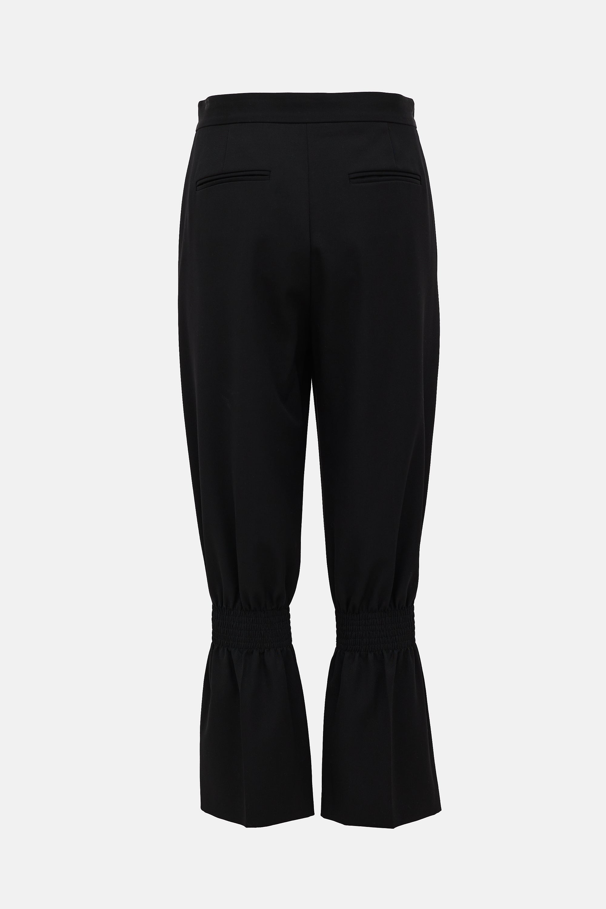 Pre-owned Stella McCartney black wool pants featuring a high rise, zip fly with hook and eye fastening, four pocket styling, smocked knee, and cropped straight leg.