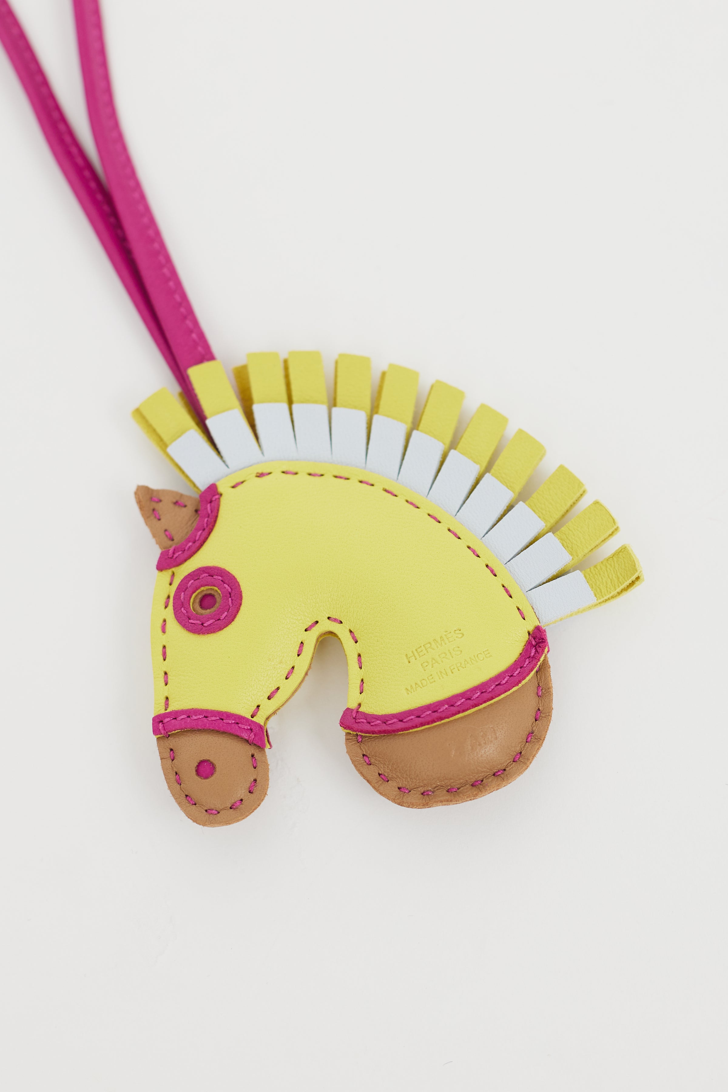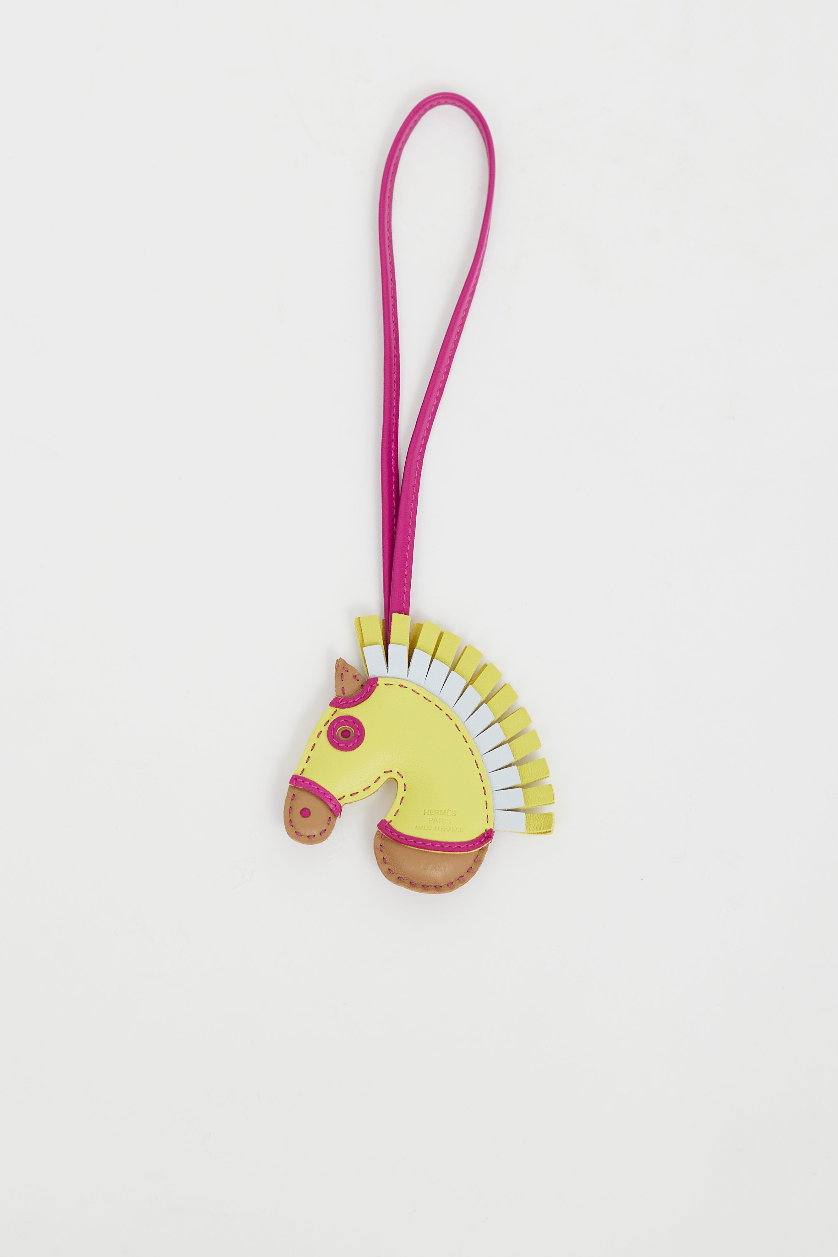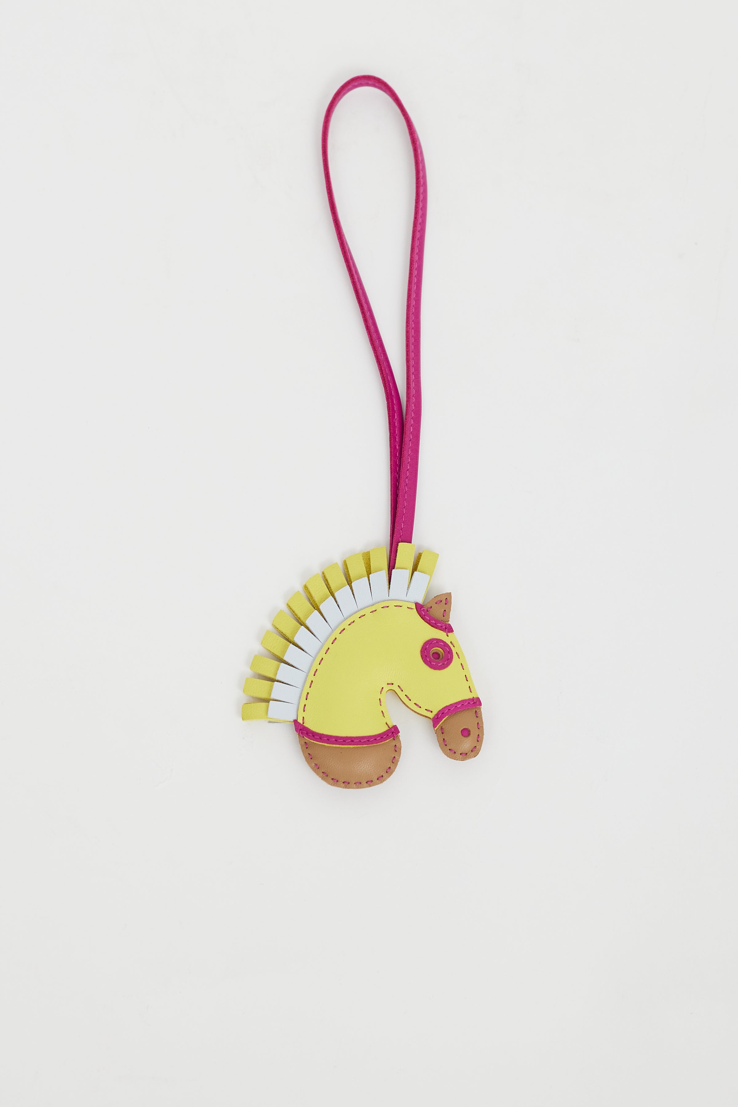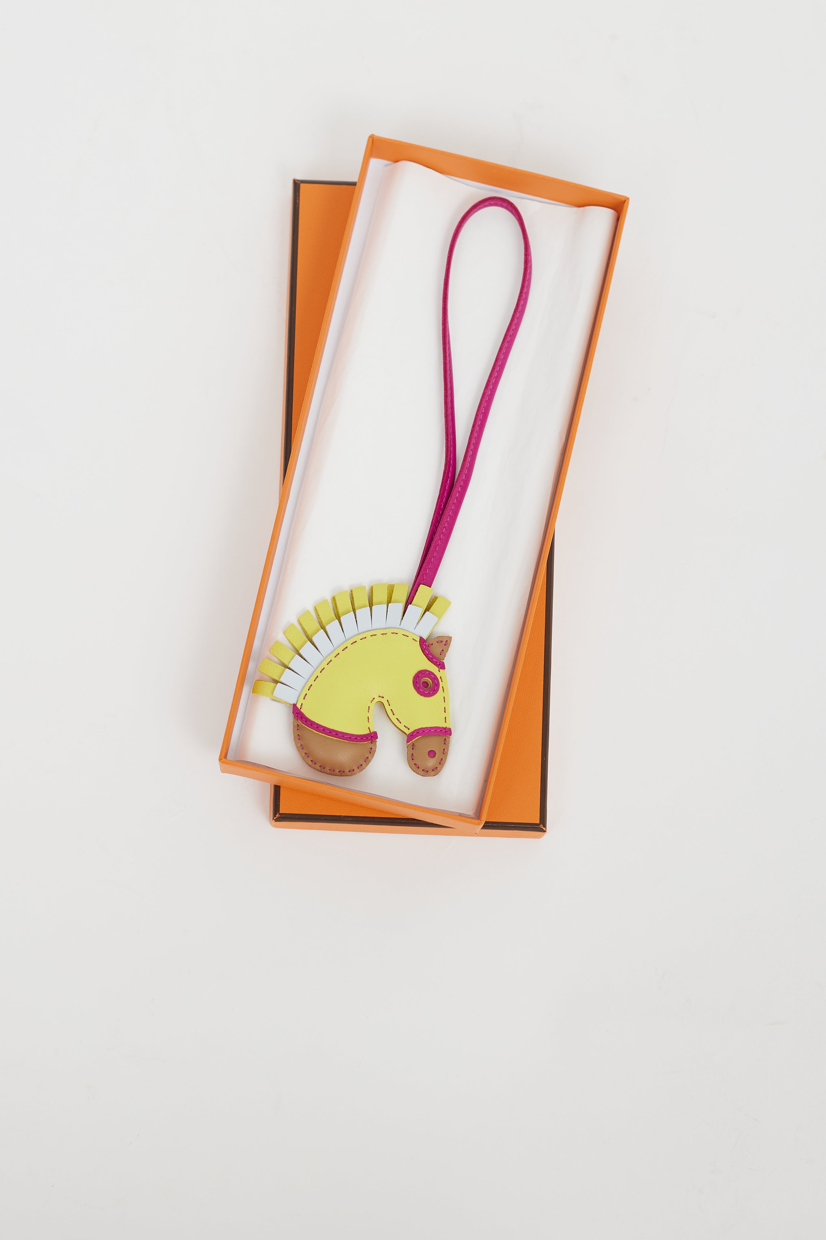 Pre-owned Hermès Lime and Kraft Milo Geegee Camail bag charm featuring milo lambkin leather material, contrast stitching, and yellow, purple, and brown throughout. Comes with original box.