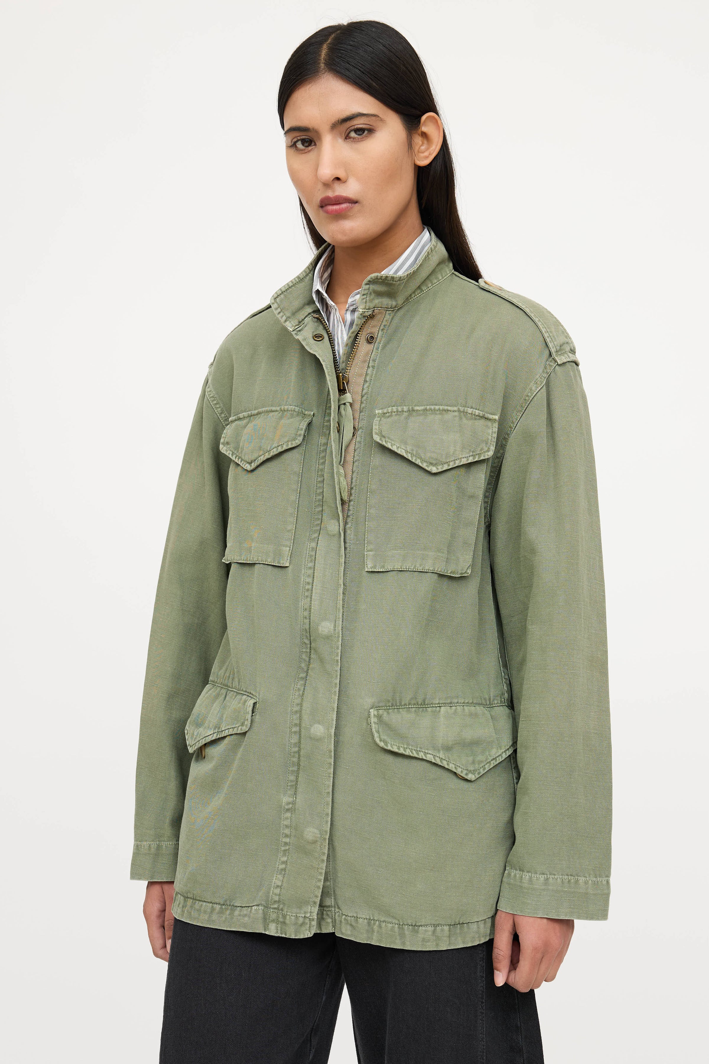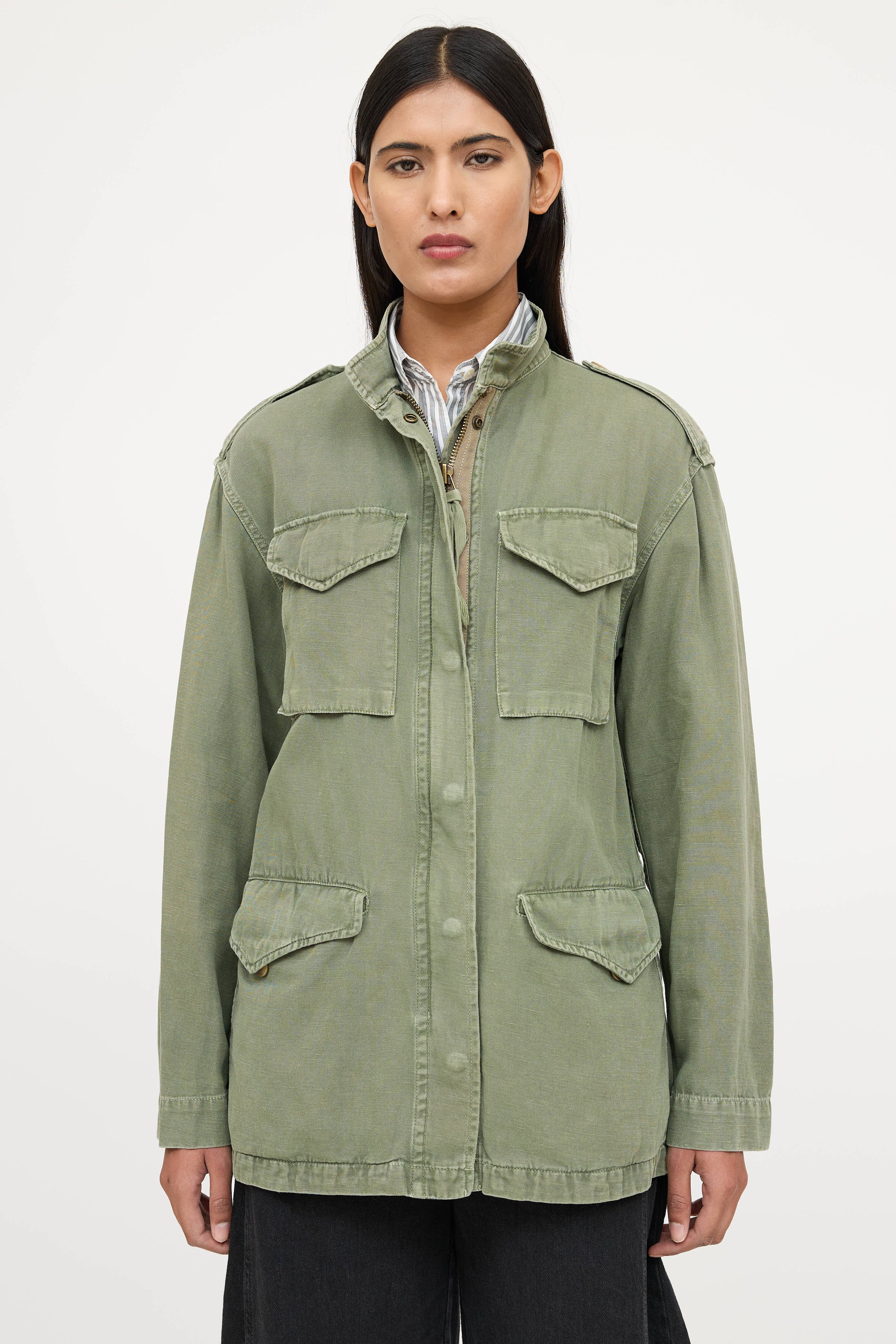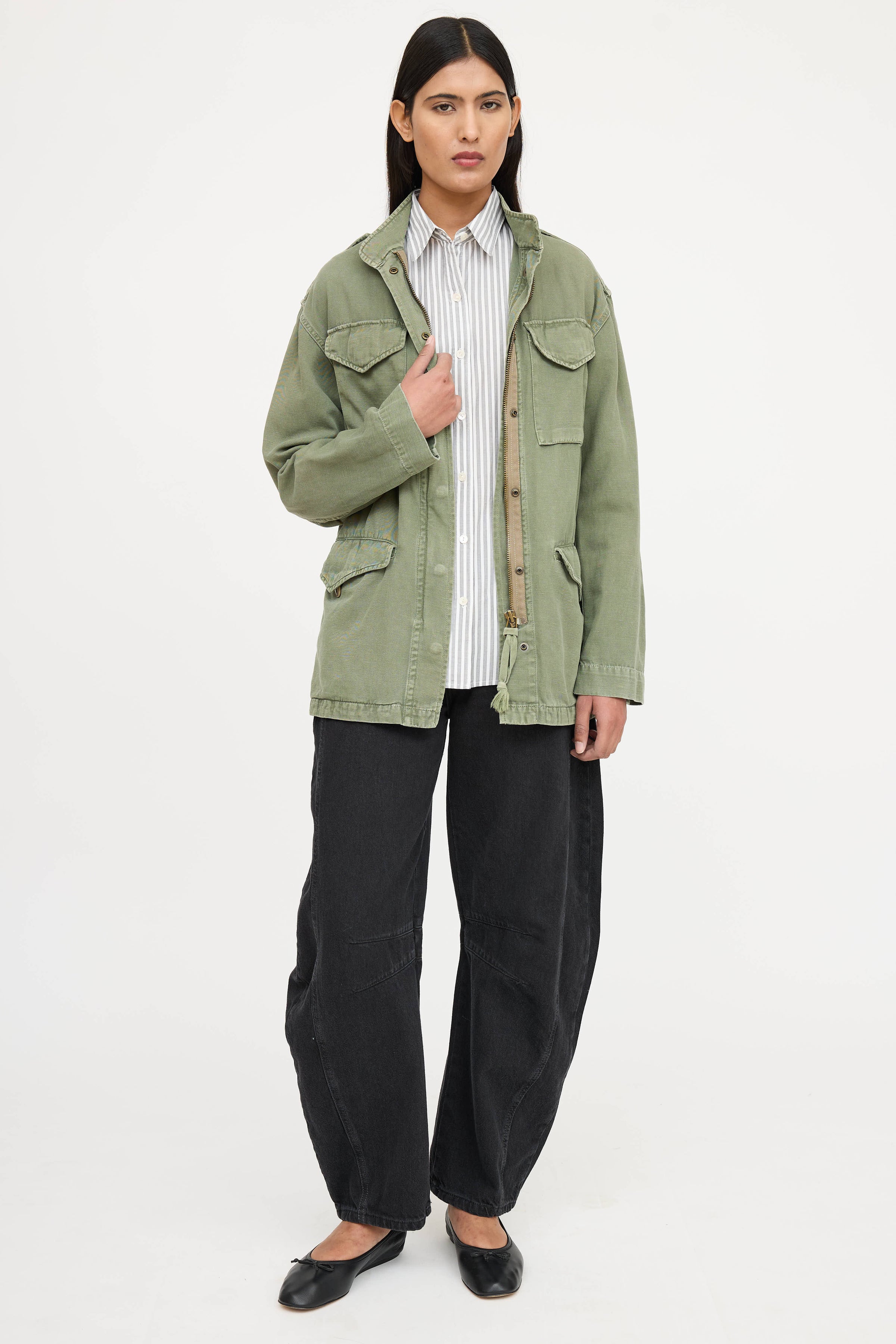 Pre-owned Nili Lotan green utility jacket featuring a front zip and snap button closure, four flap pockets at front, epaulettes at shoulder and inner drawstrings at waist.