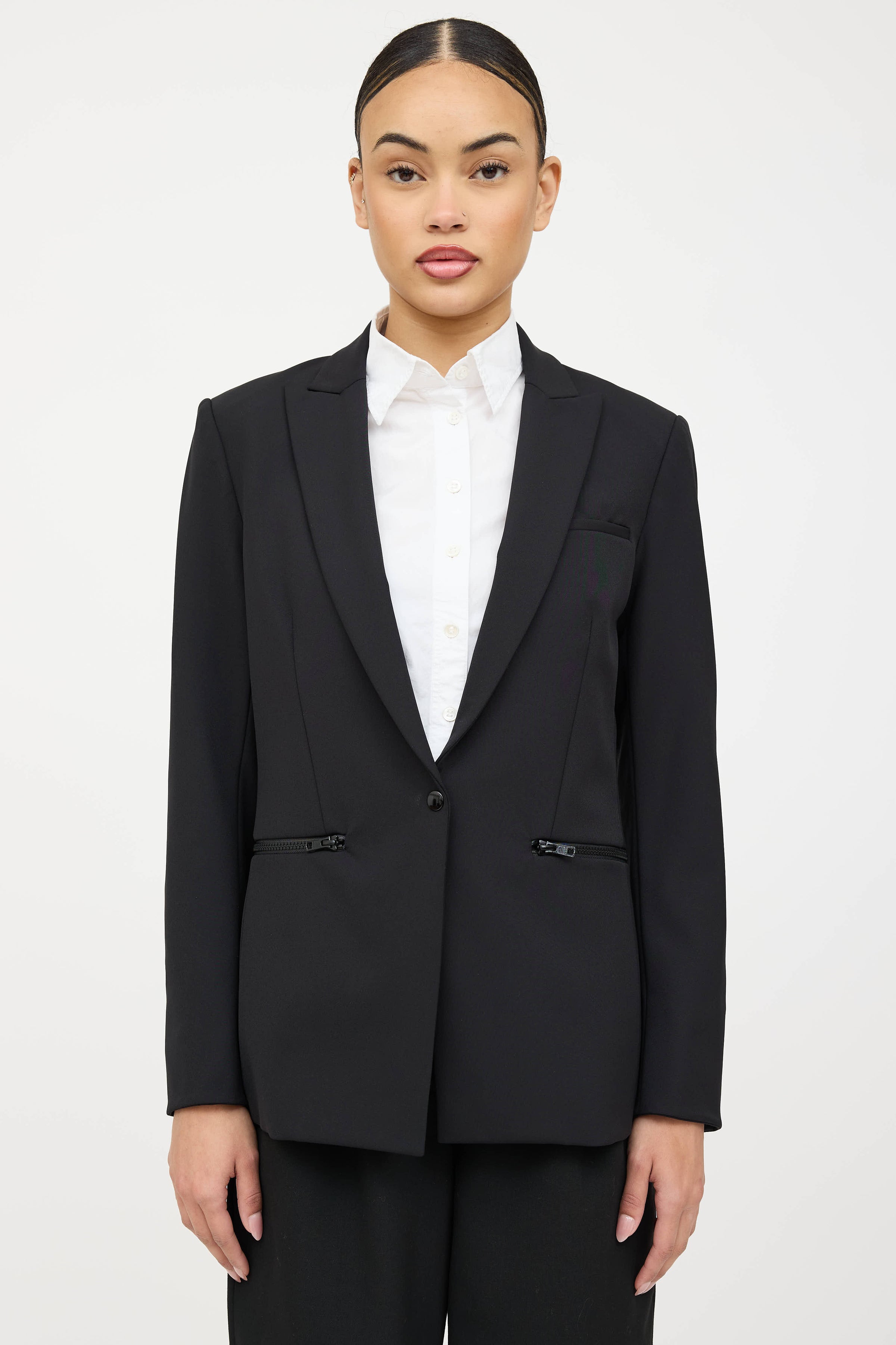 Pre-owned Veronica Beard black blazer featuring a peak lapel, long sleeves with snap button cuffs, one welt pocket at chest, two zip pockets at hip, and snap button closure. Lined.