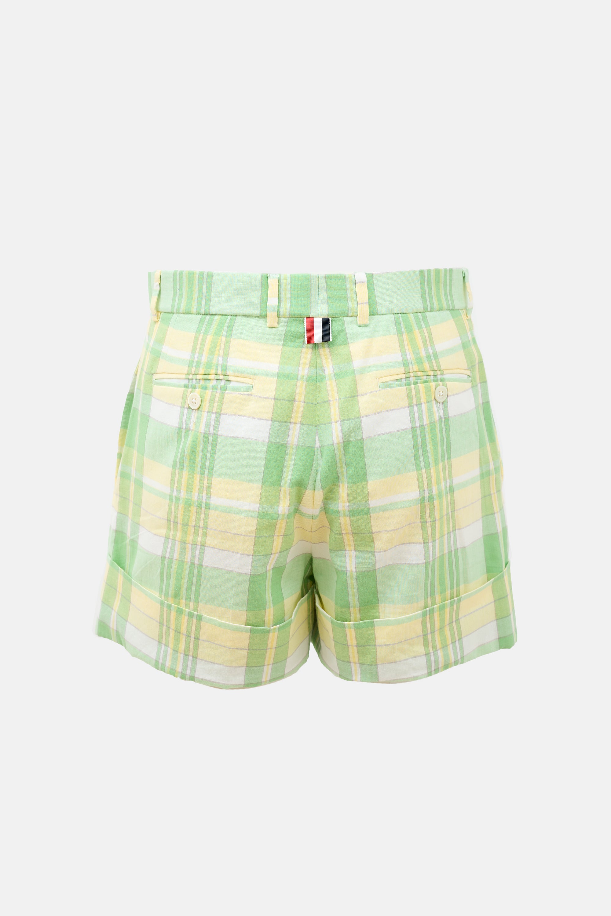 Pre-owned Thom Browne green and yellow plaid shorts featuring a mid rise, zip fly, belt loops, four pocket styling, signature RWB grosgrain tag at back, and rolled cuffs.