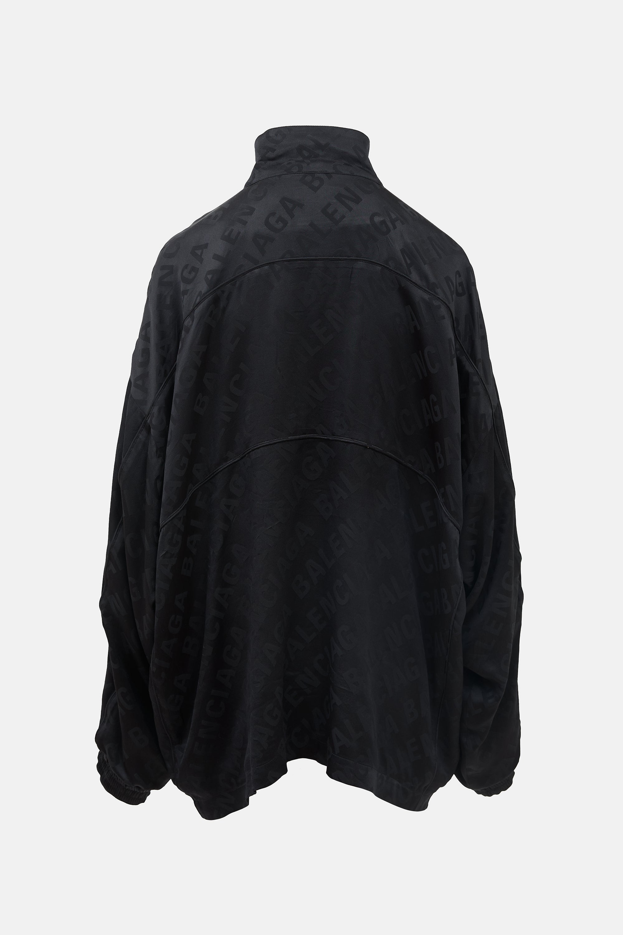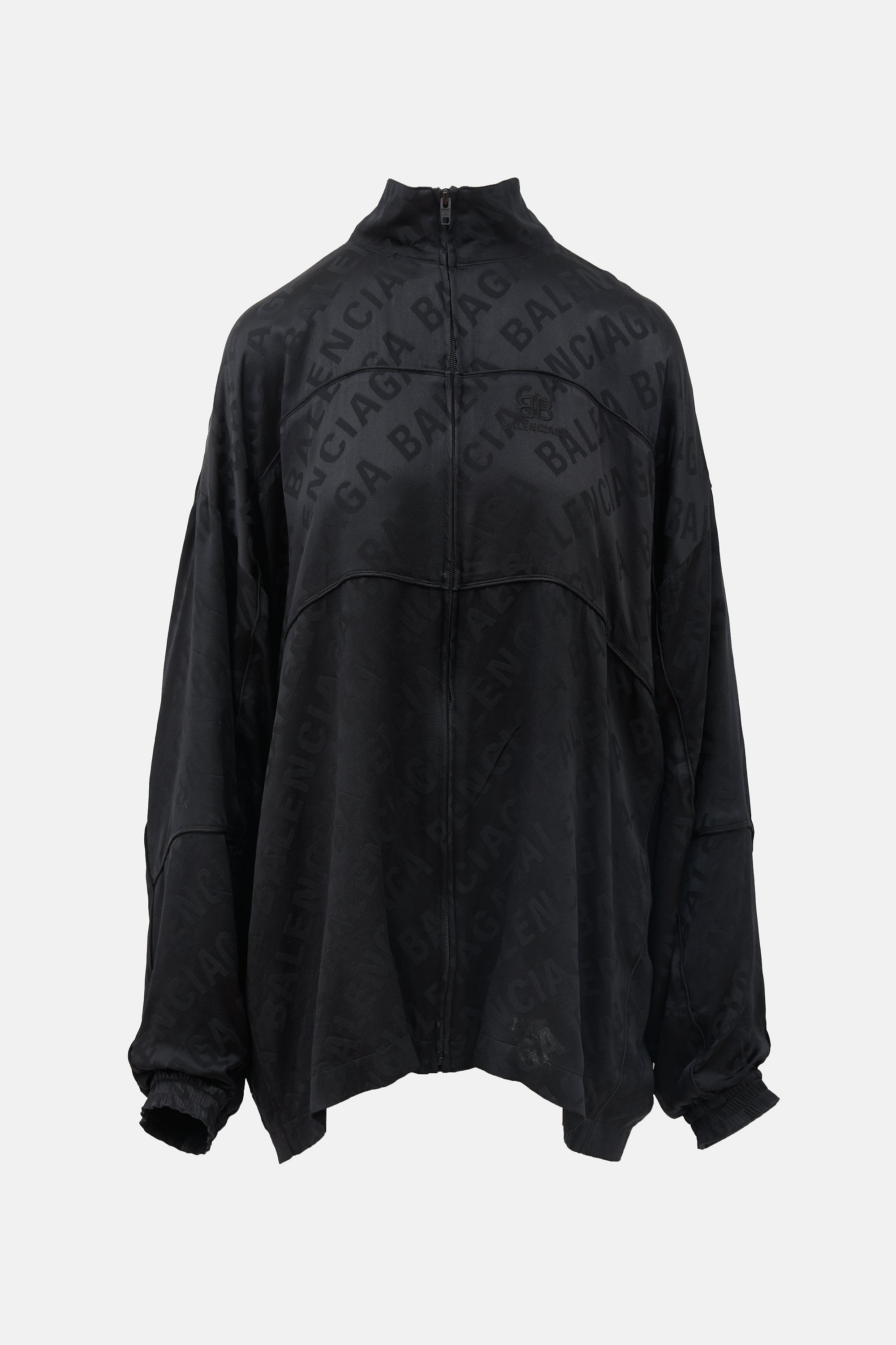 Pre-owned Balenciaga Homewear black silk zip up sweater featuring a funnel collar, tonal jacquard logo throughout, embroidered logo at chest, piped seams, and elasticized cuffs. Lined.