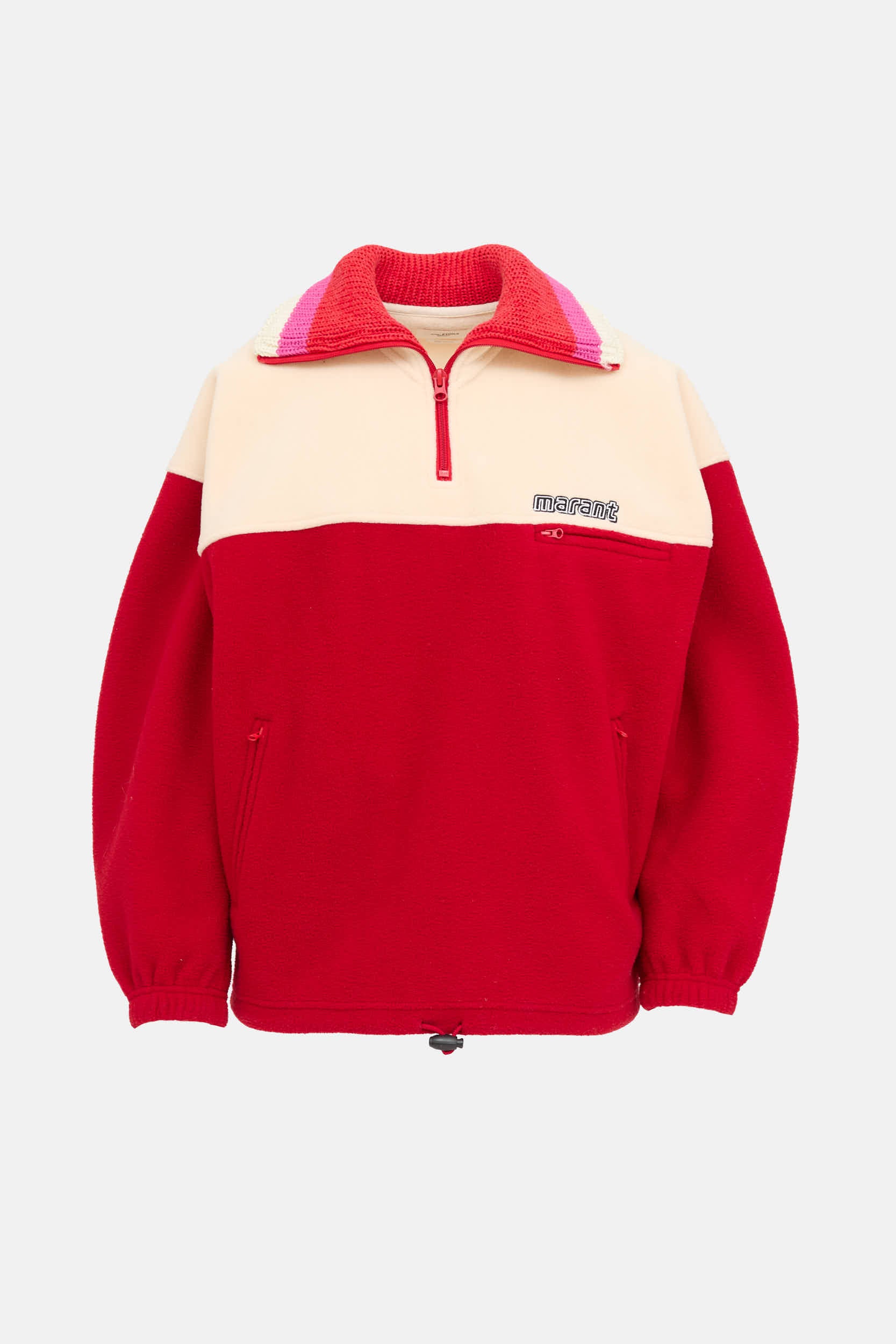 Pre-owned Isabel Marant Étoile red and mulitcolor Mamet long sleeve sweatshirt featuring stand collar, three quarter zip front, embroidered logo at chest with zip pocket, zip pockets at side, and cinched drawstring hemline with toggle closure.