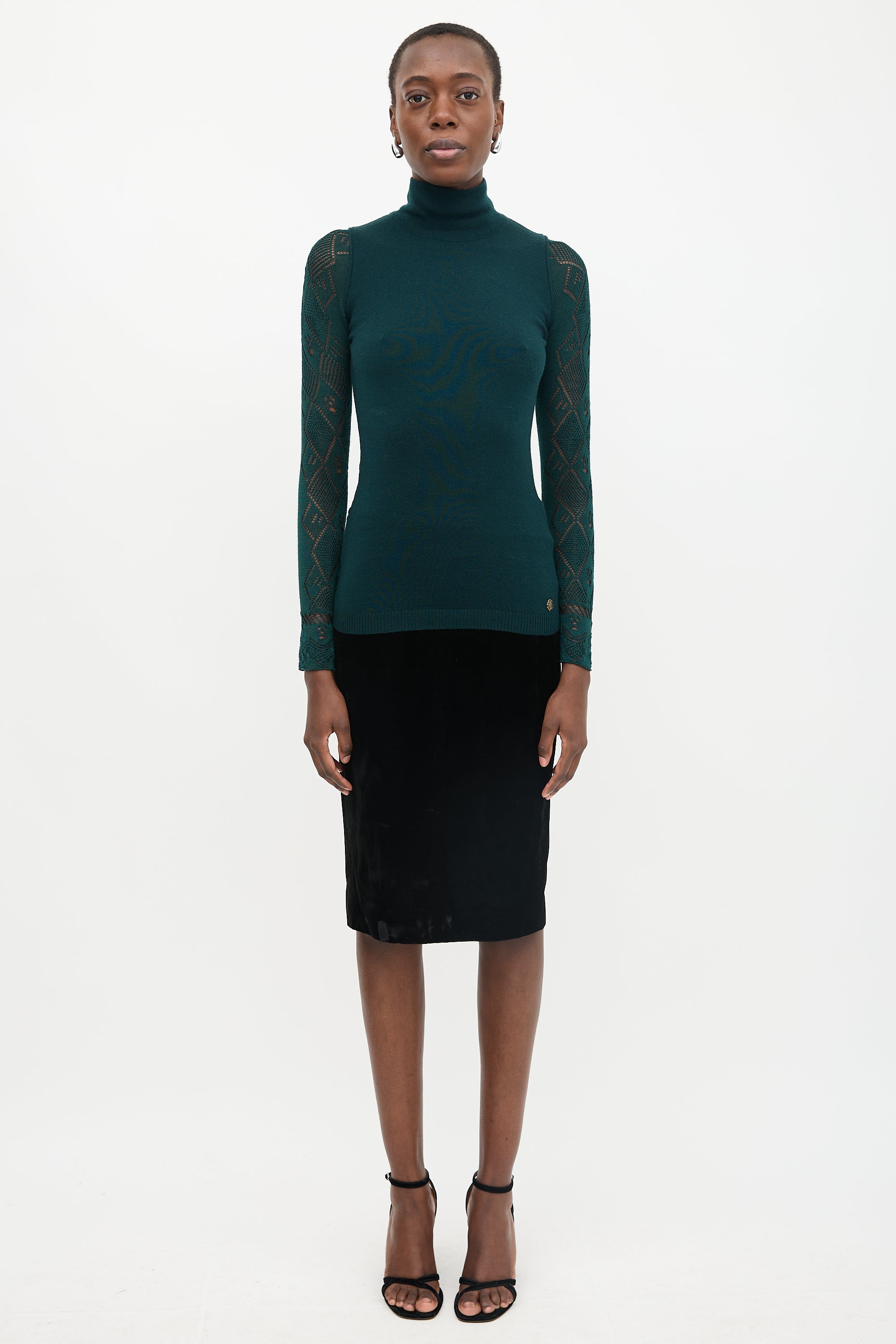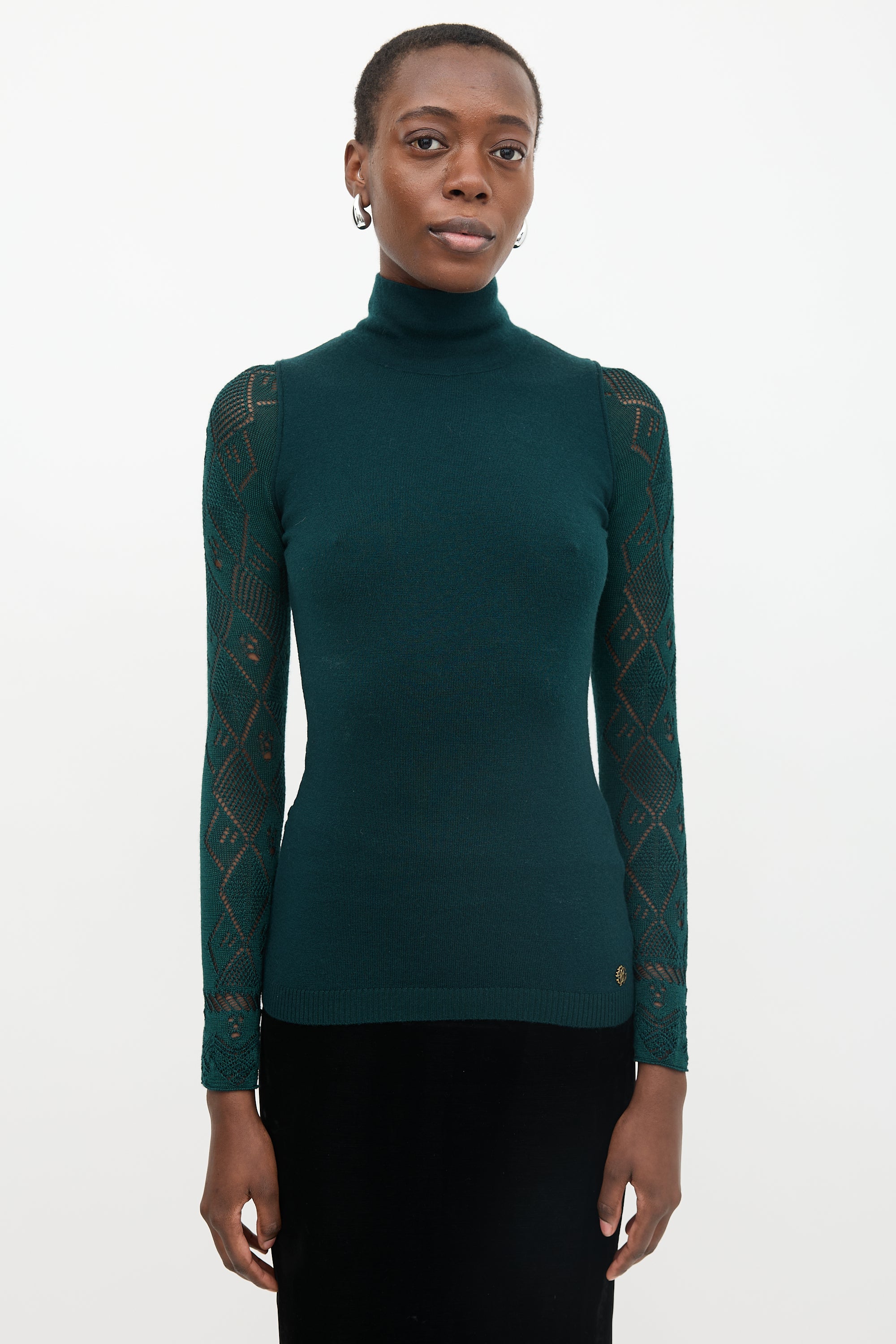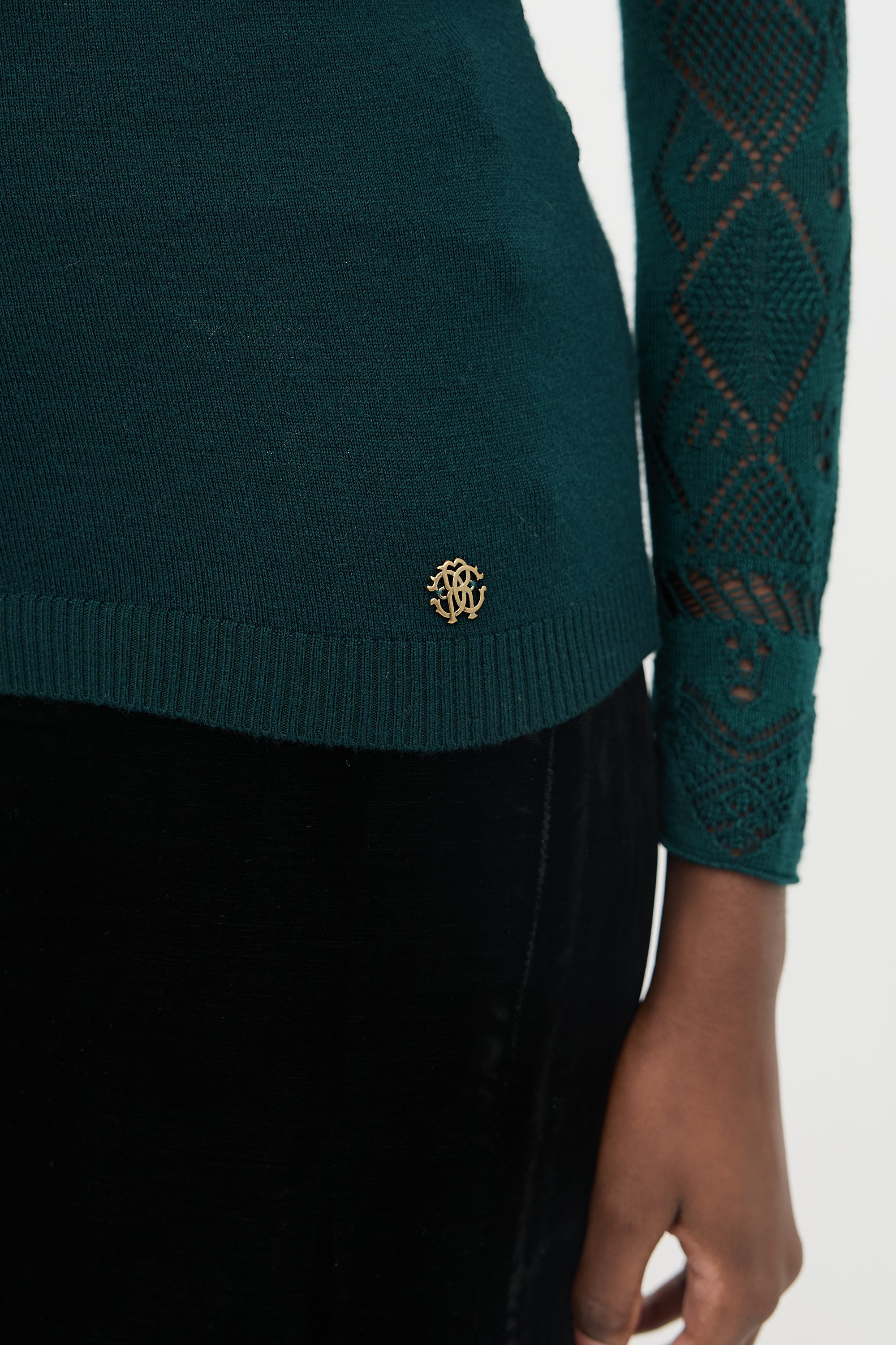 Pre-owned Roberto Cavalli green wool sweater featuring a turtleneck, open pointelle knit sleeves and back, scalloped trims, gold tone logo hardware, and a ribbed hem.