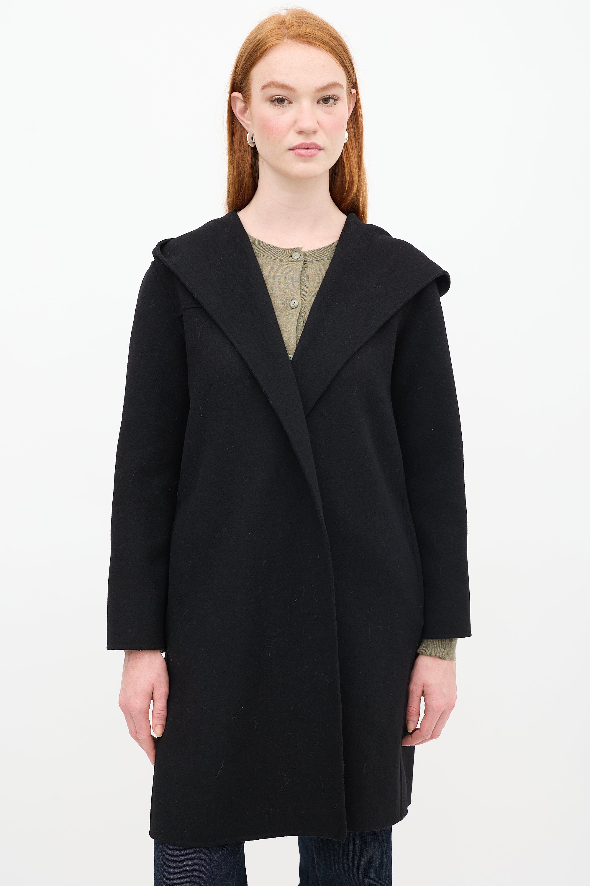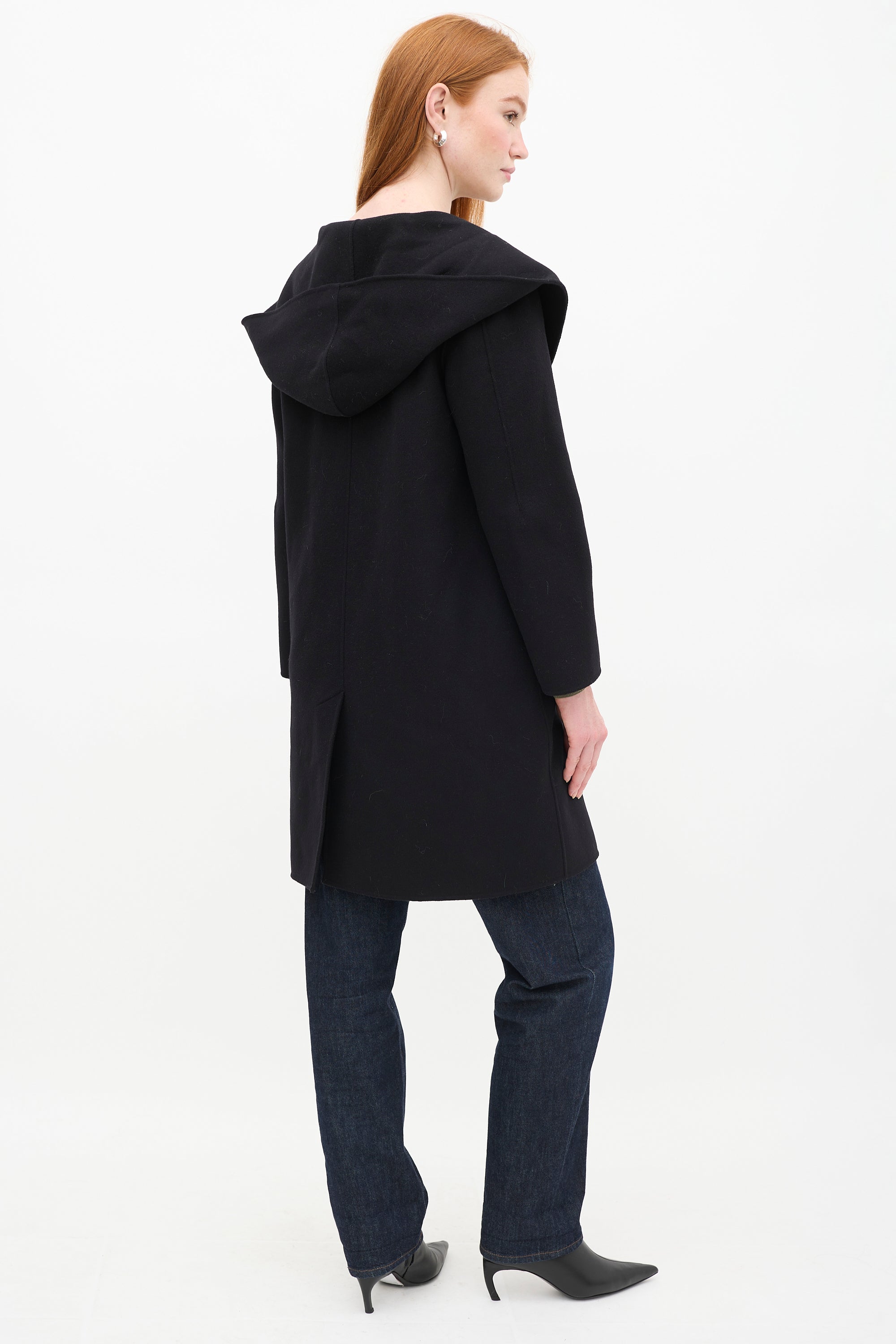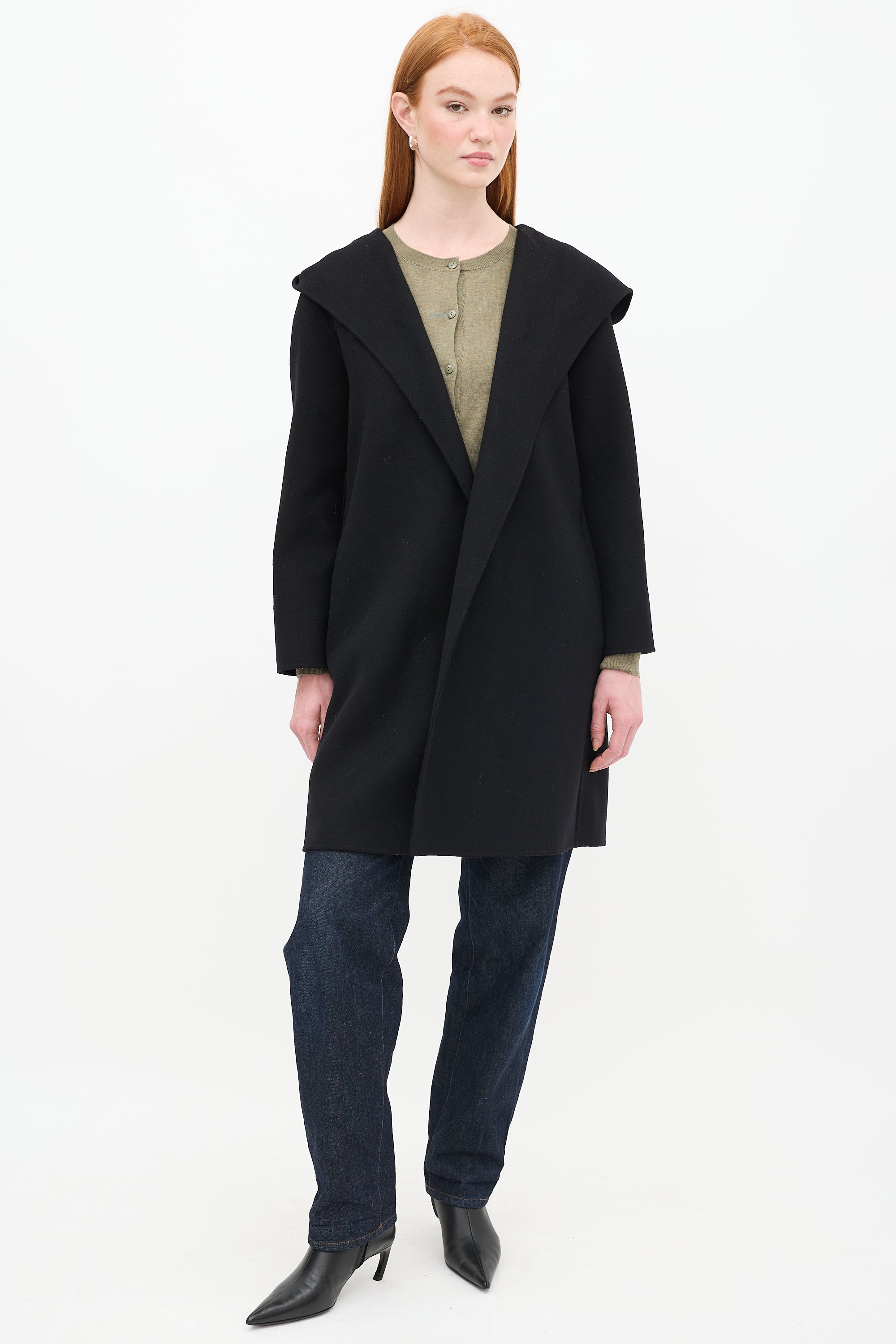 Pre-owned Weekend Max Mara black wool coat featuring an attached hood, long sleeves, two slip pockets at hip, and open front.