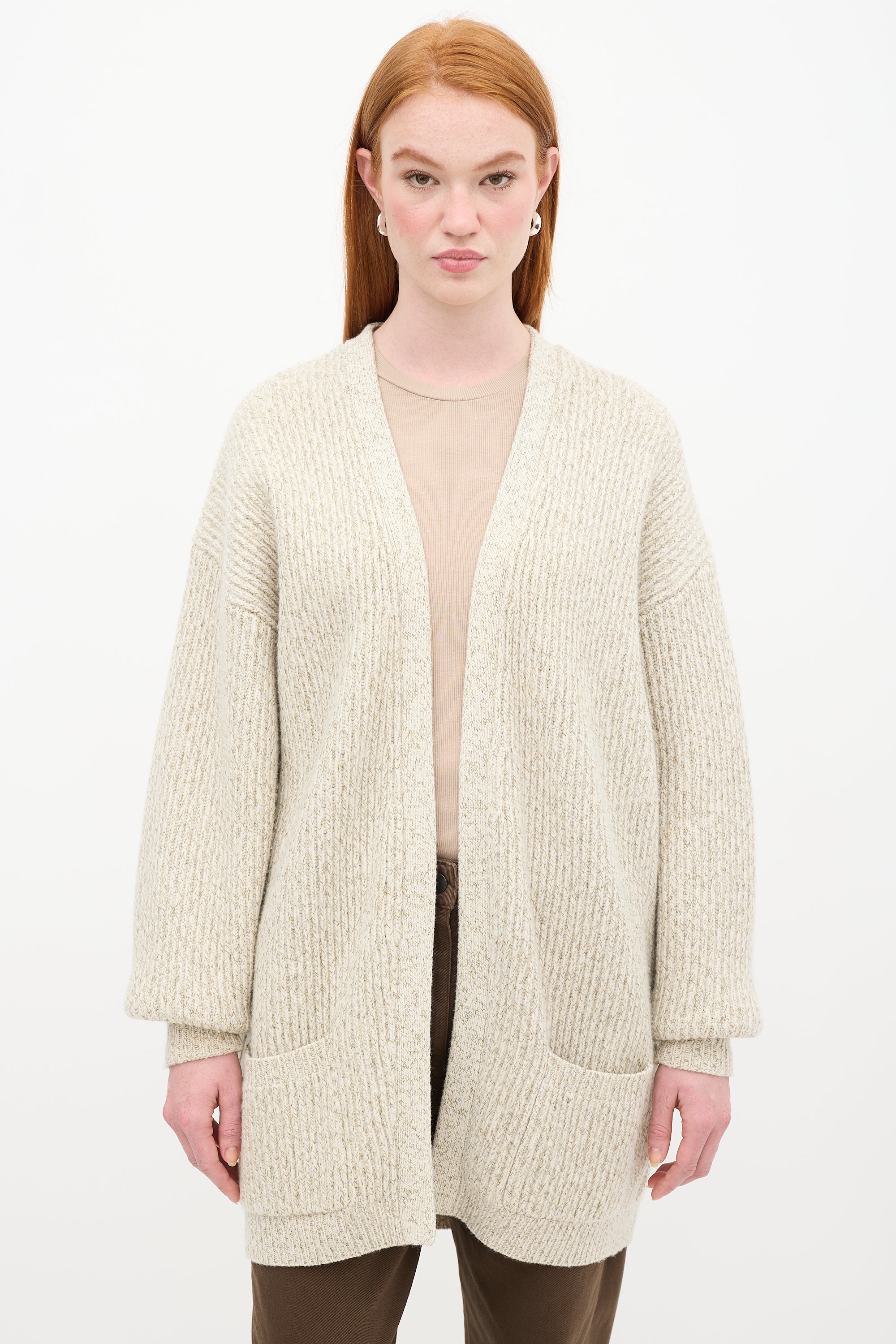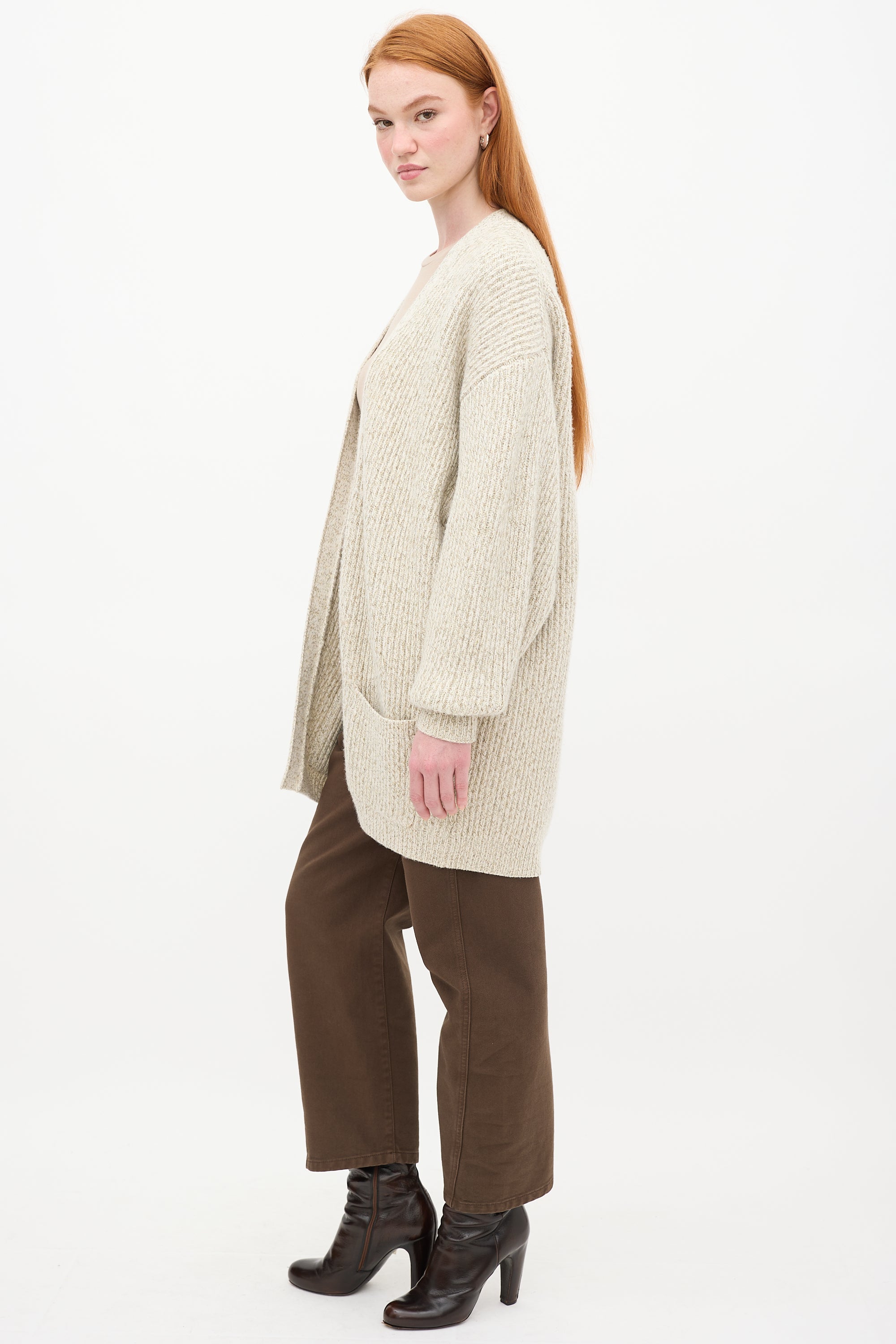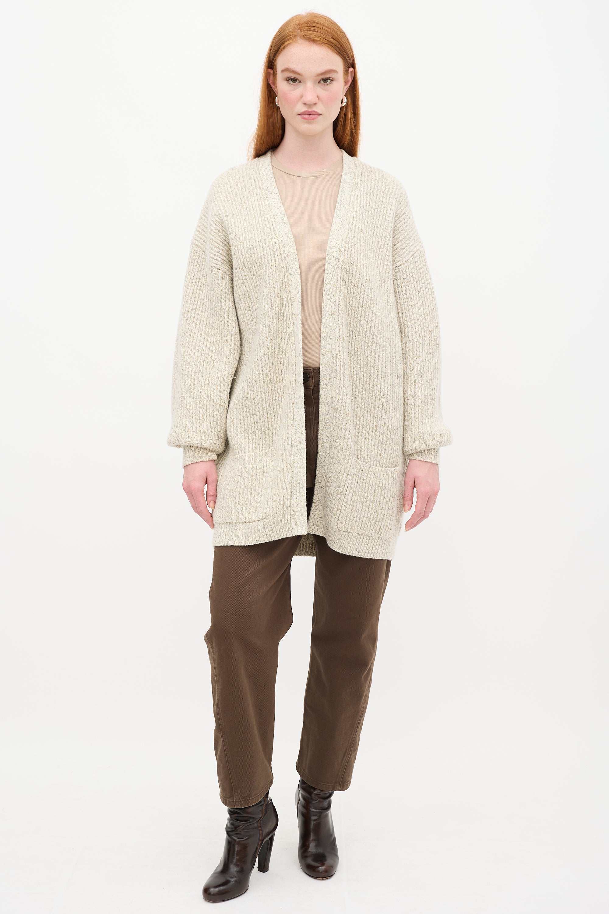 Pre-owned Toteme beige wool marbled knit cardigan featuring a V-neckline, long sleeves, ribbed detailing, two patch pockets at hip, and open front.