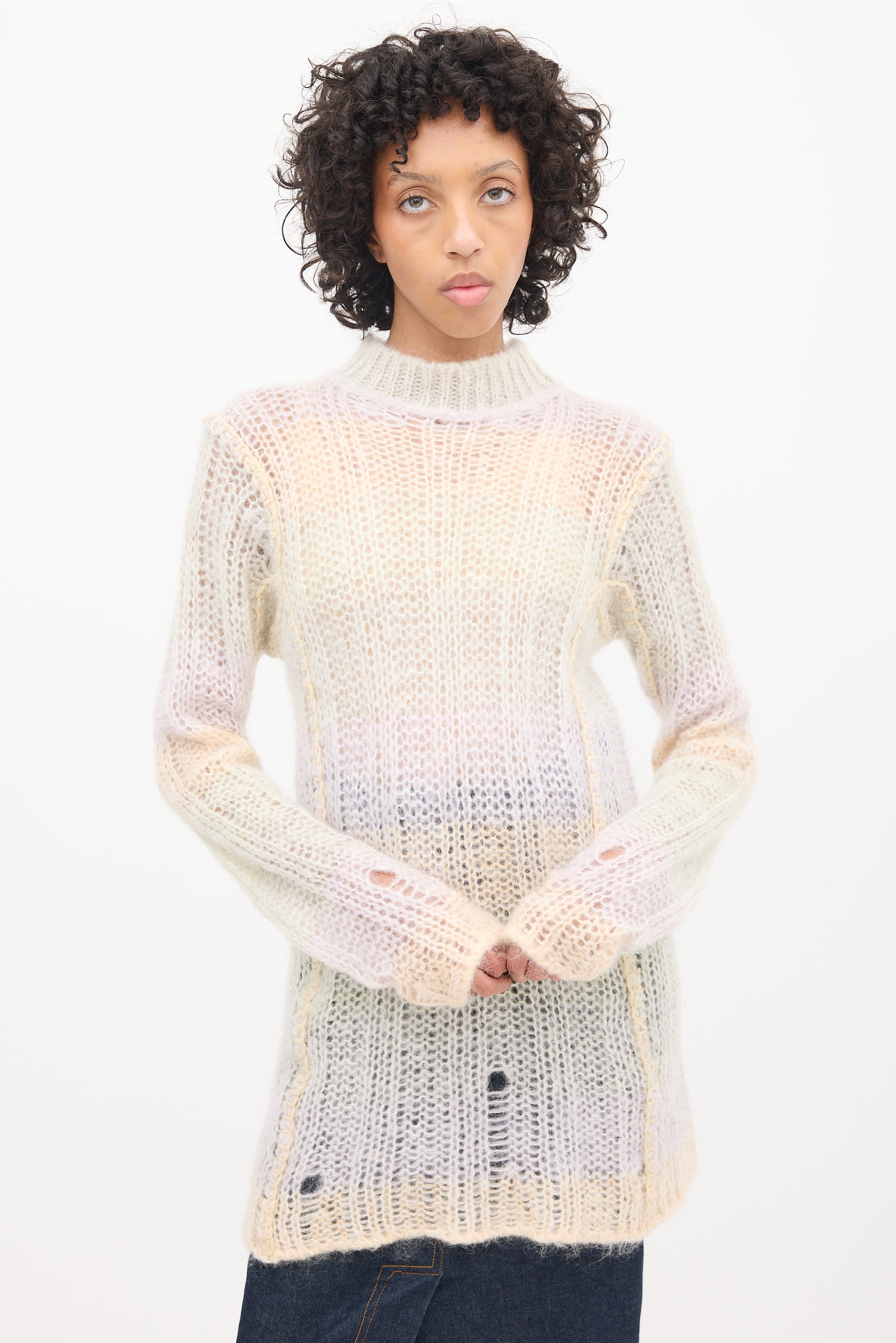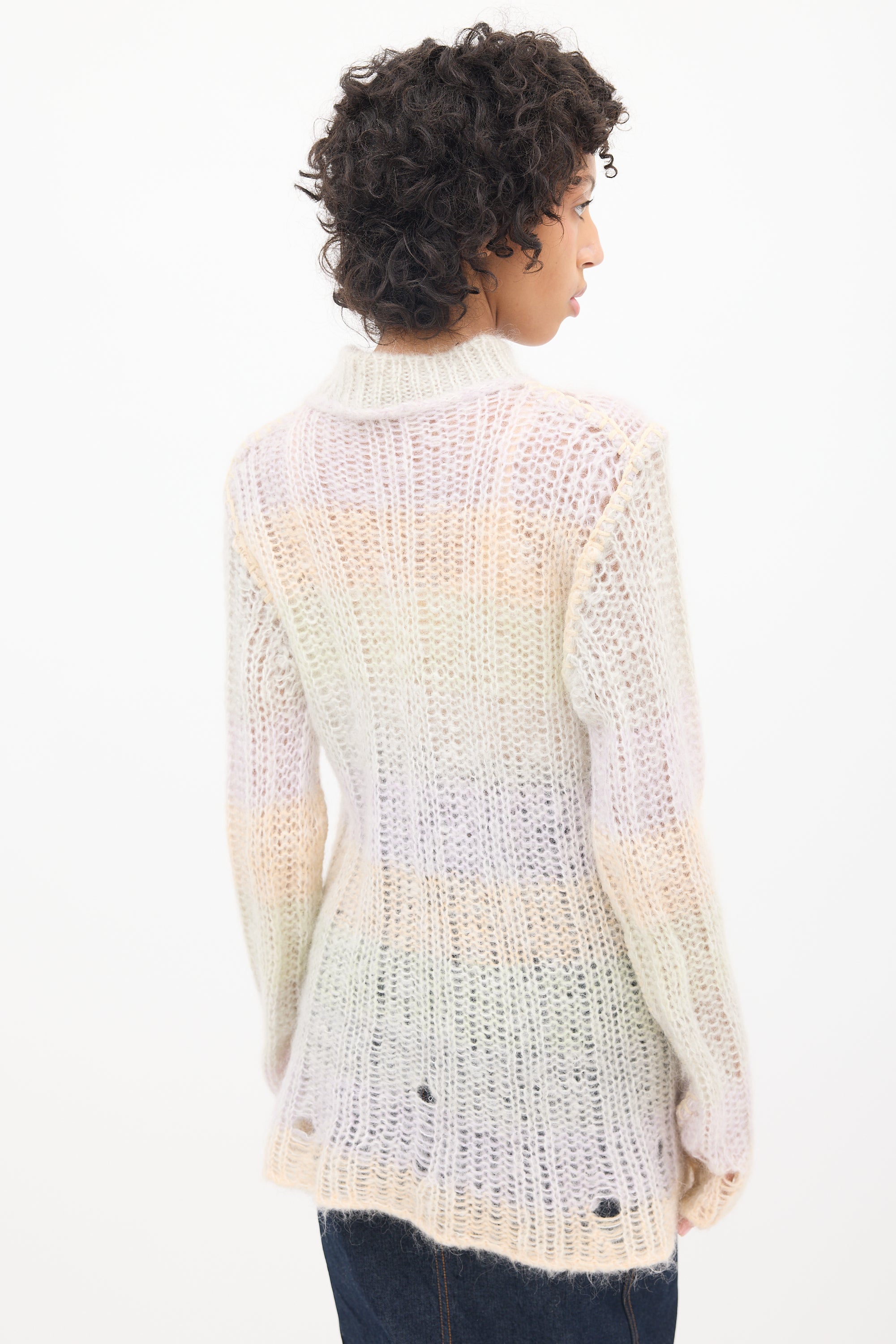 Pre-owned Acne Studios multicolour mohair blend sweater featuring a mock neck, loose knit, even hem, long sleeves, blanket stitch detail, and wide horizontal stripes throughout.
