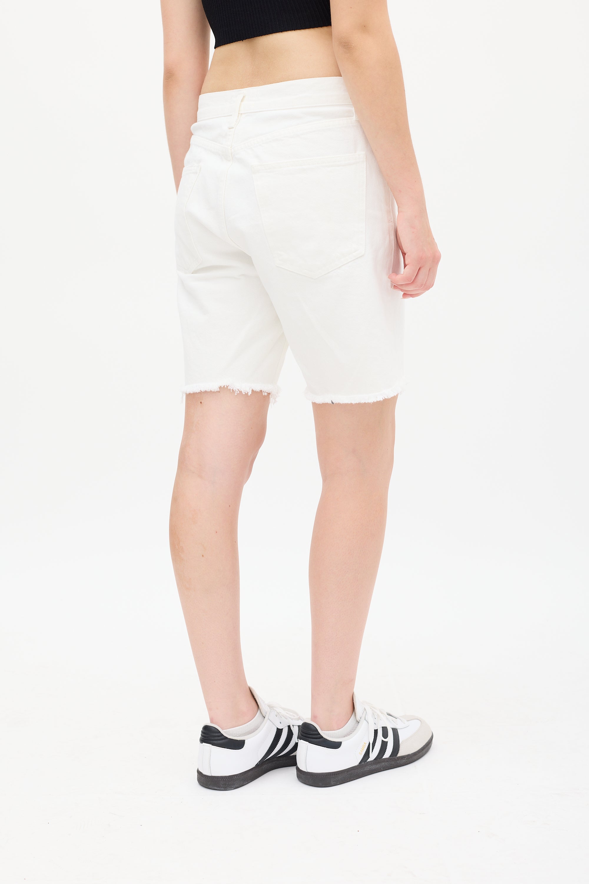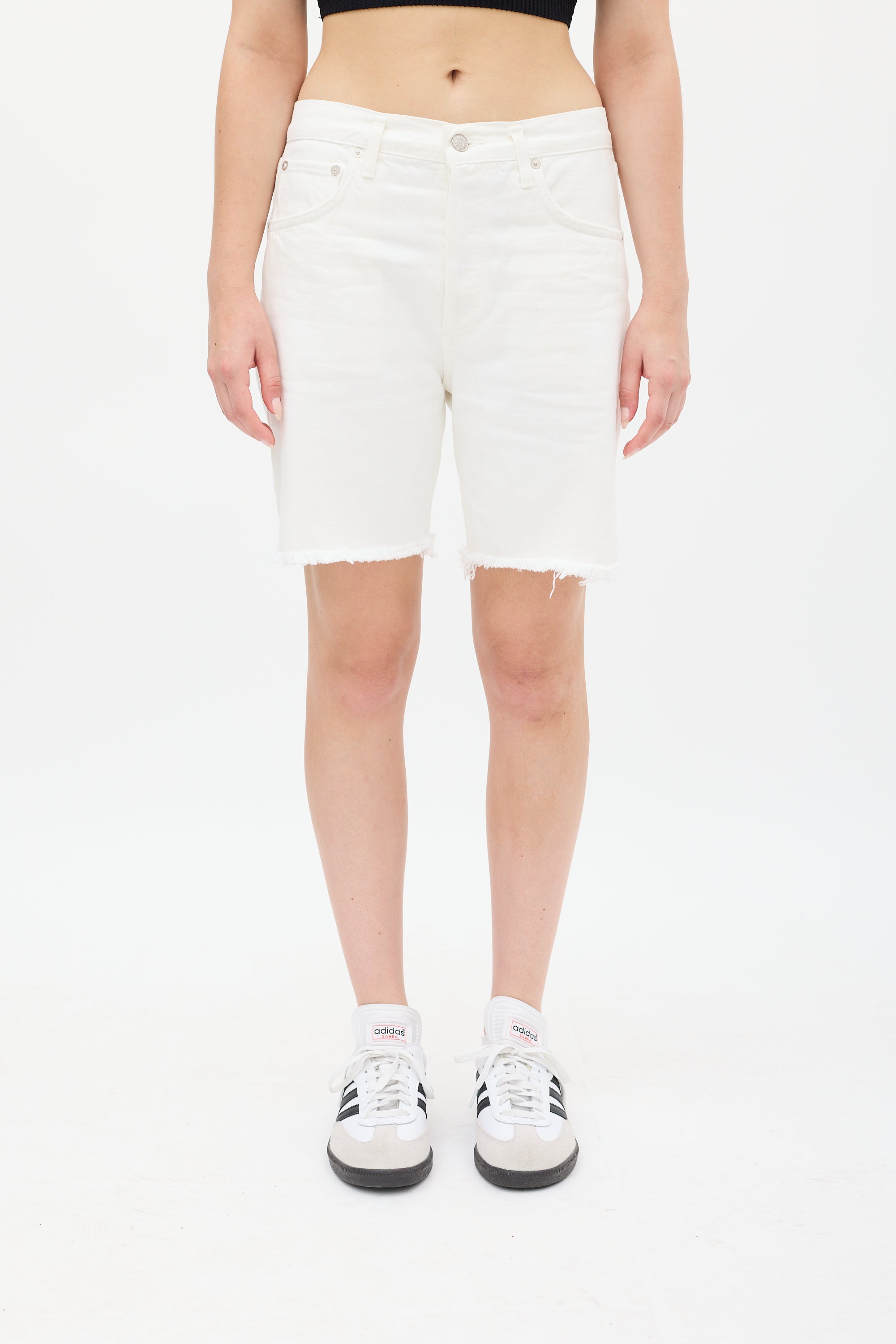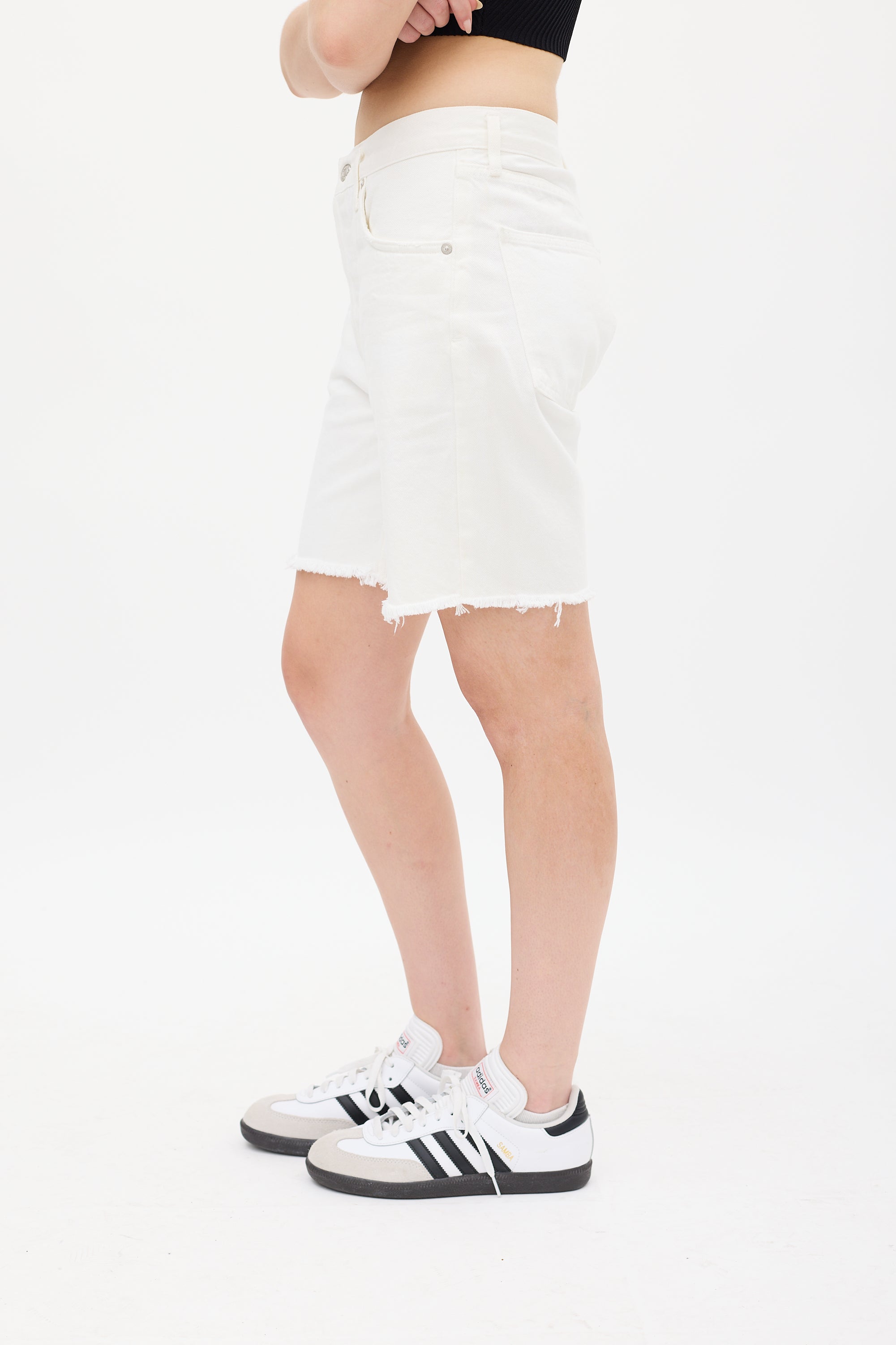Pre-owned Agolde white denim Rumi shorts featuring a high waist, mid length design, five pocket styling, raw hem, and button fly.