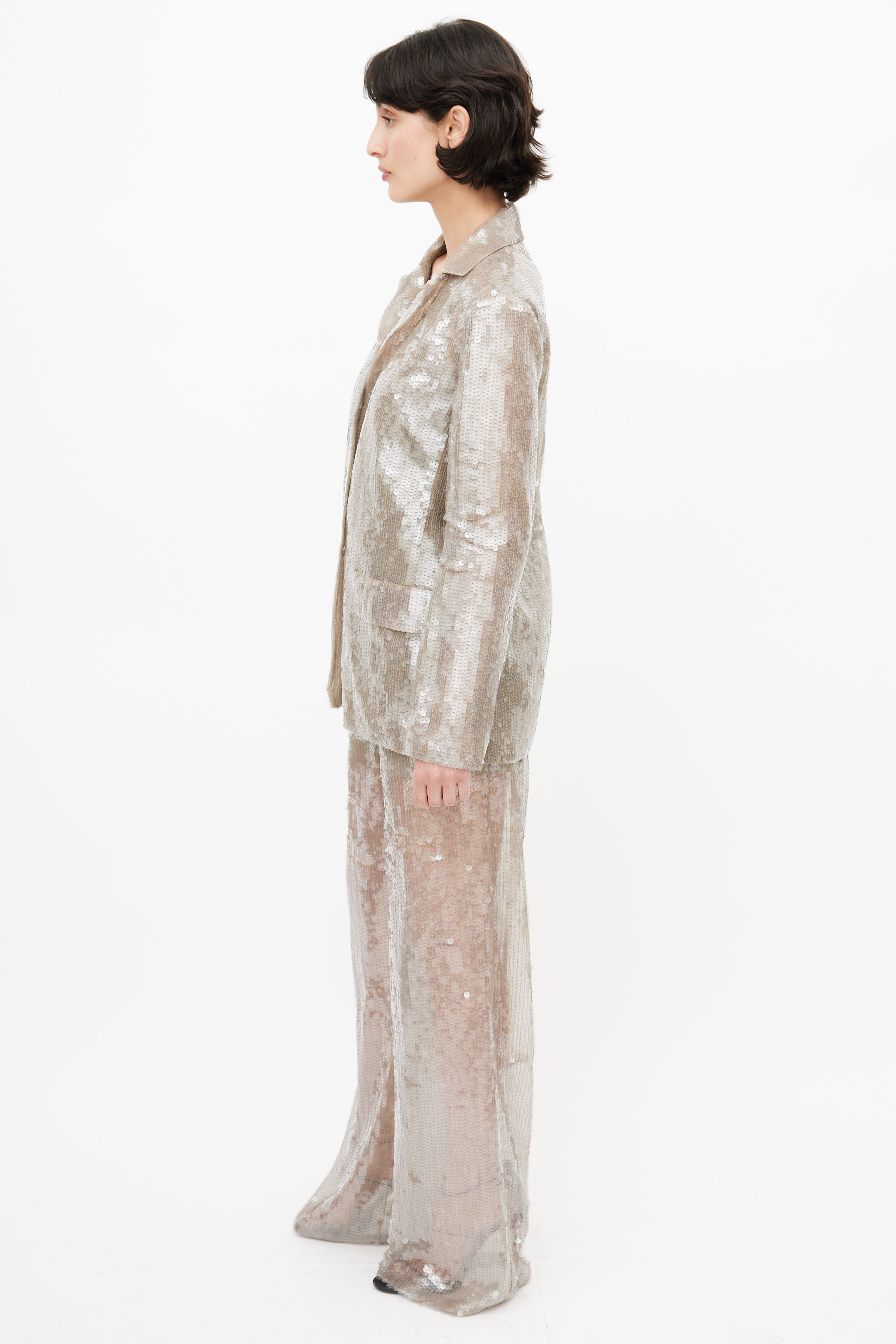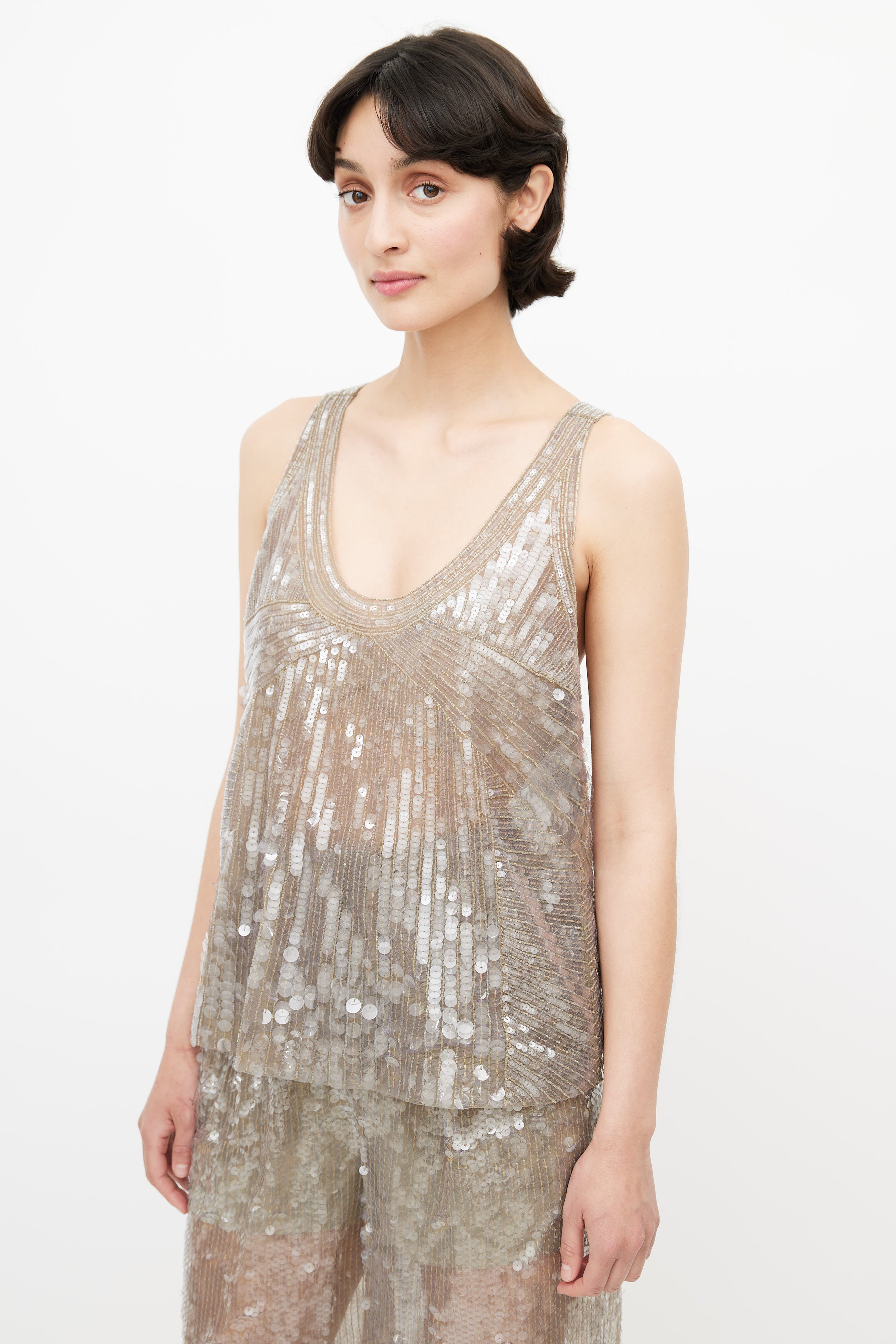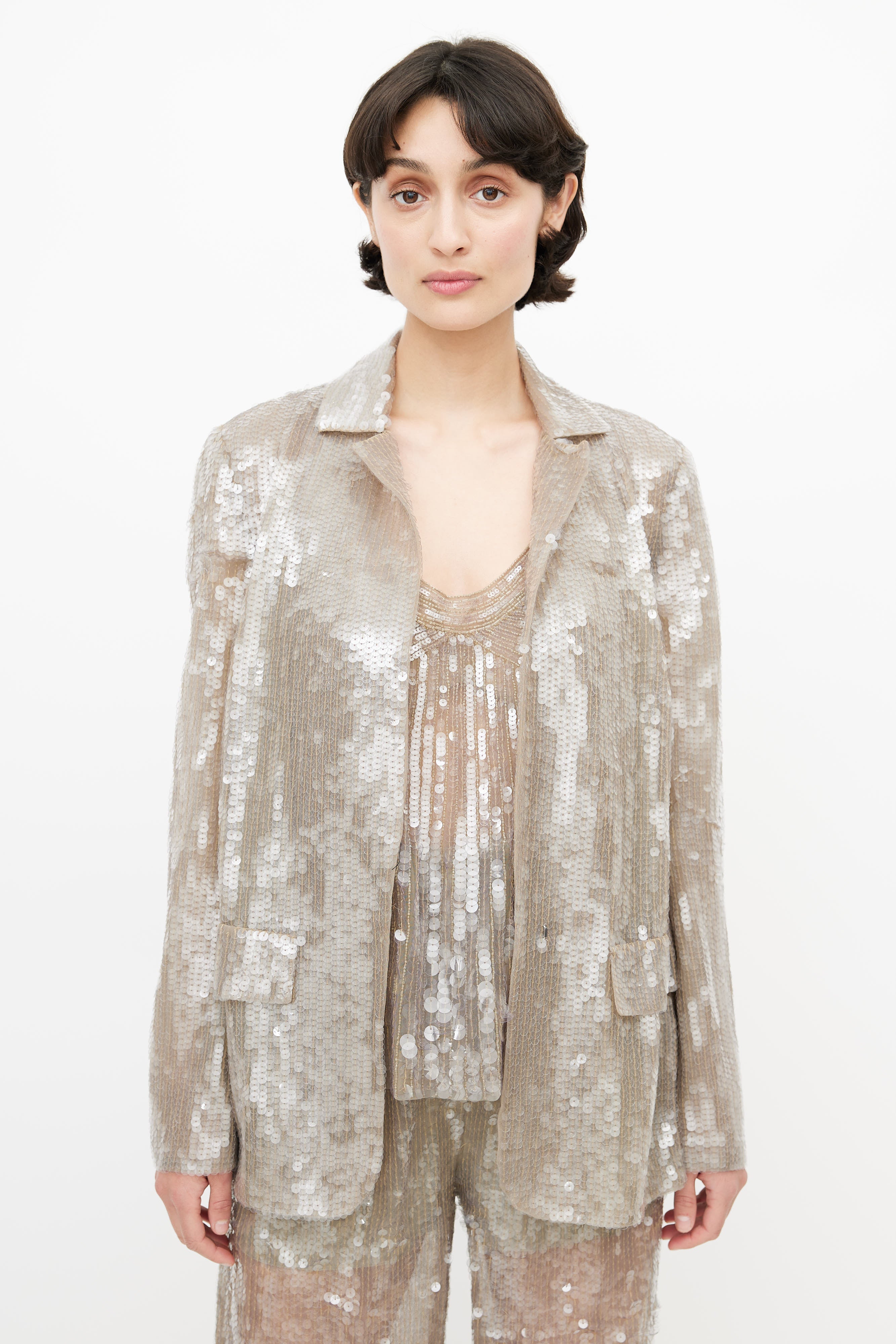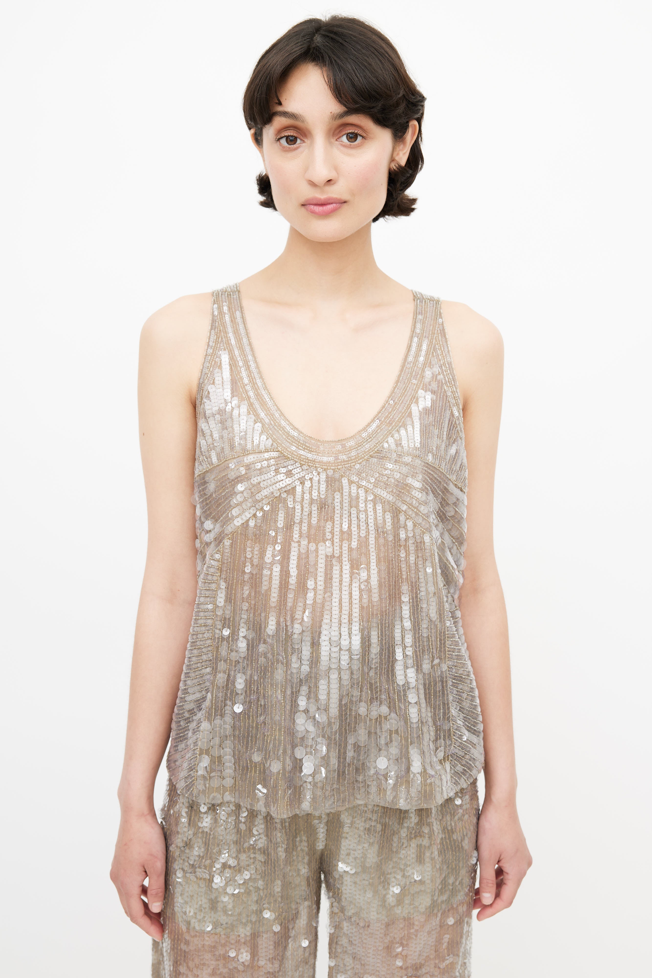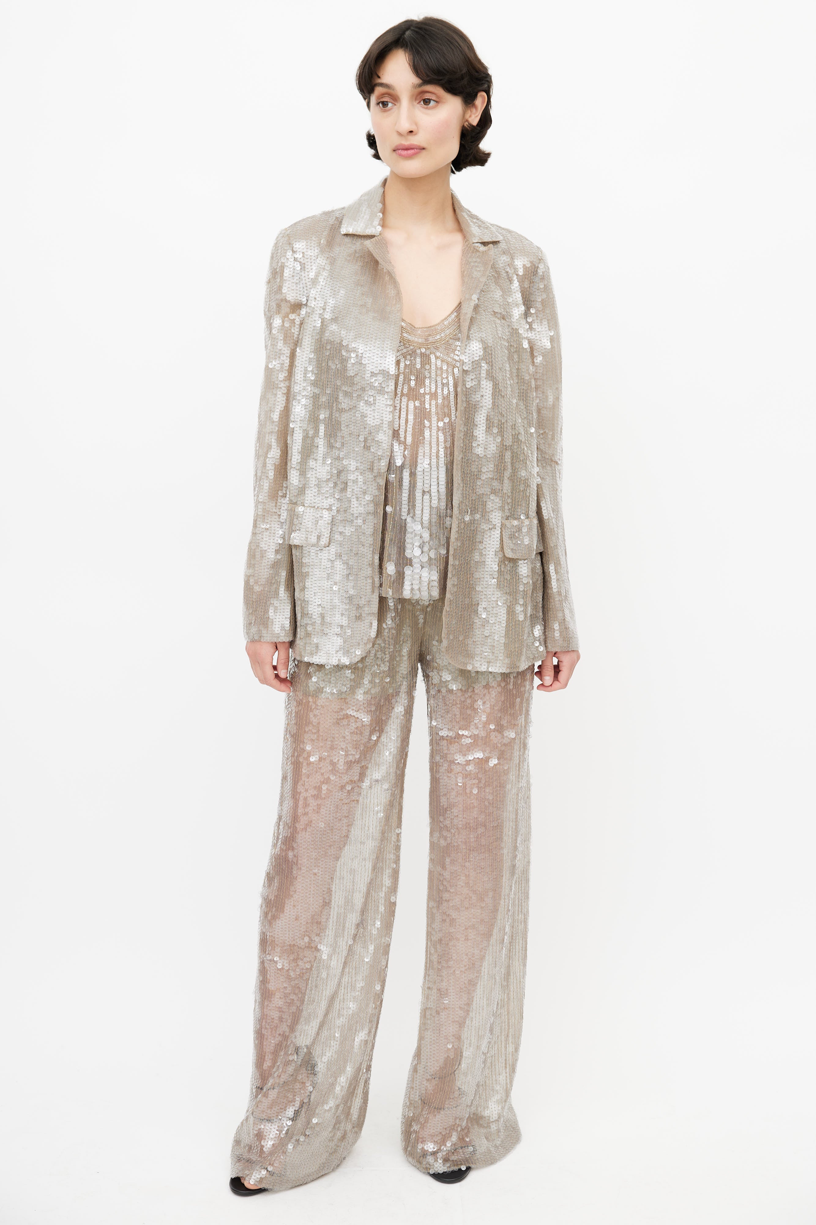 Pre-owned Alberta Ferretti grey sequin three piece suit featuring a blazer with notched lapel, two faux flap pockets at hip, and hook and eye closure. Tank features bead embellishment throughout, scoop neckline, and panelling throughout. Pants feature two slash pockets at hip, pleating at front, wide leg, and a zip fly with snap button closure. All garments lined. Clipped to fit model.