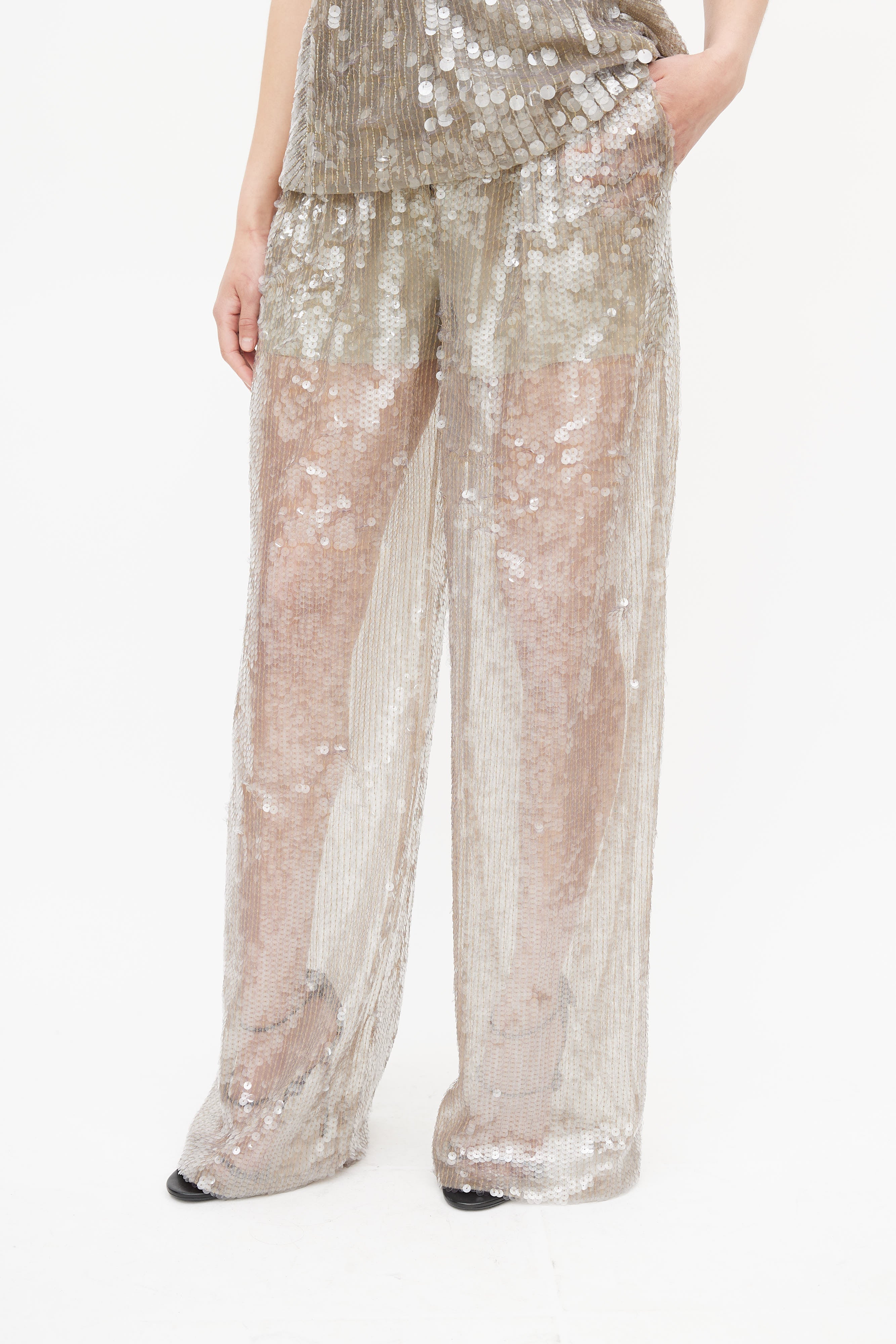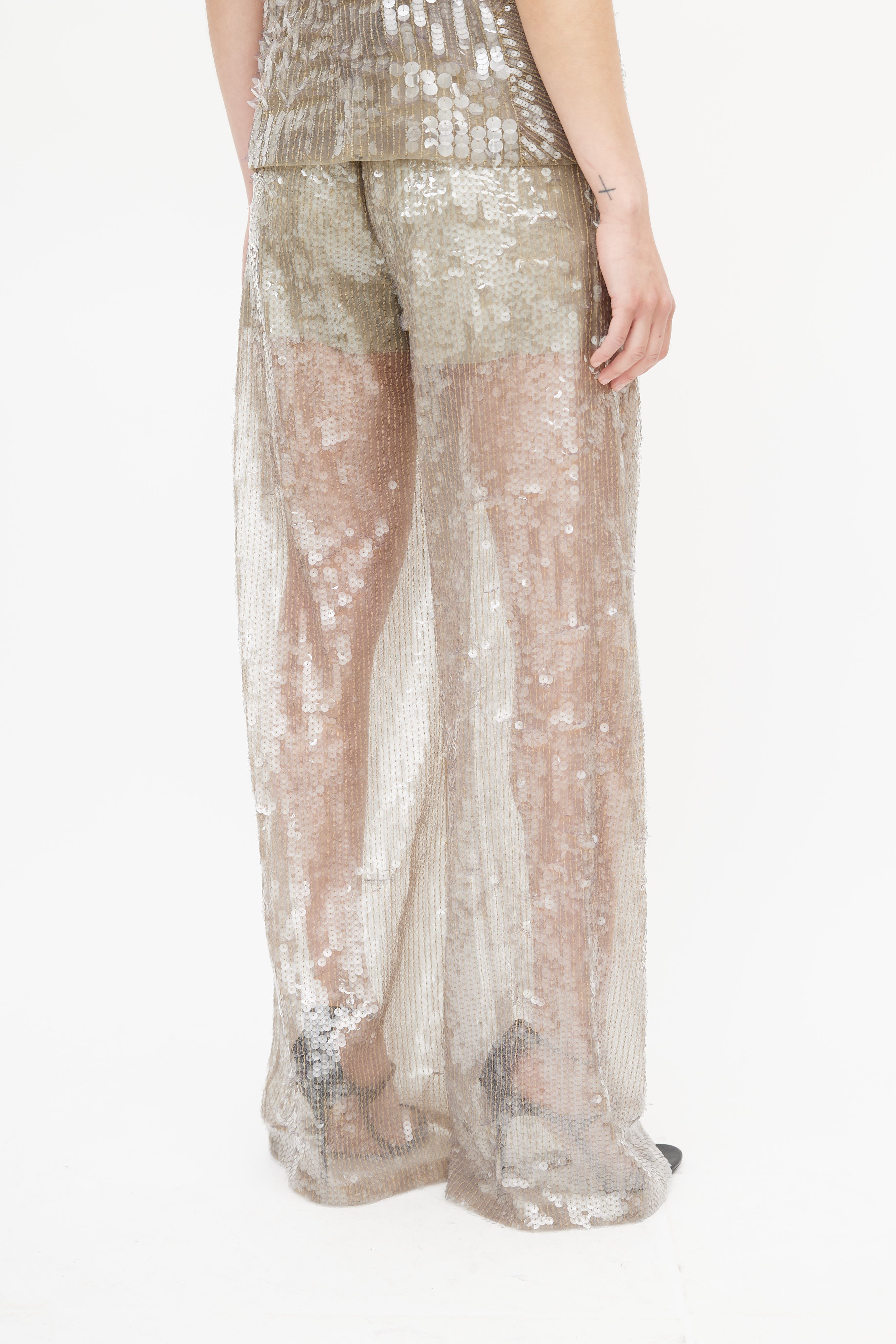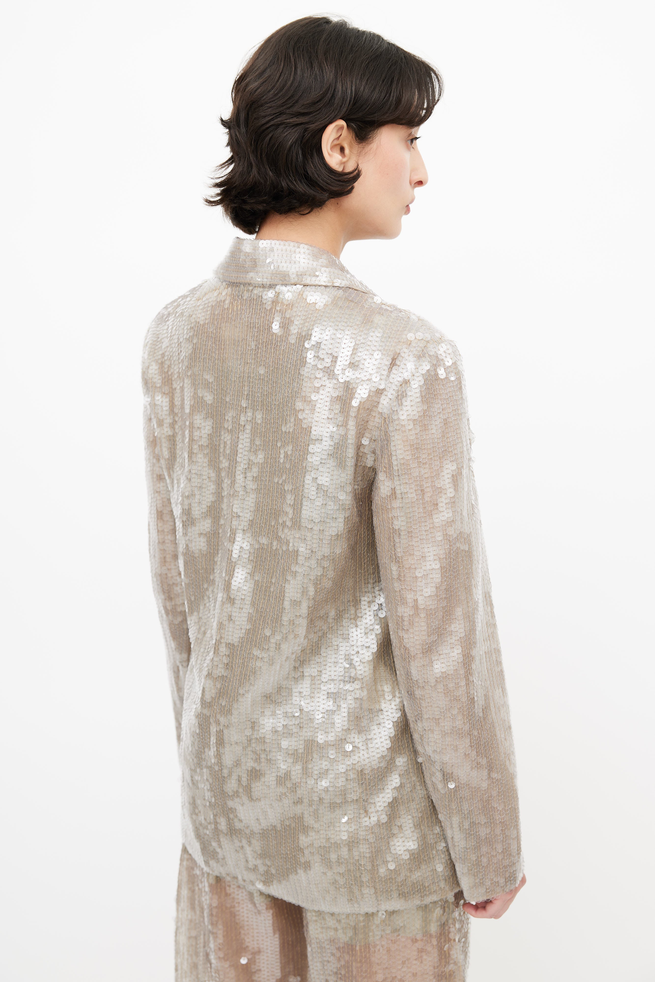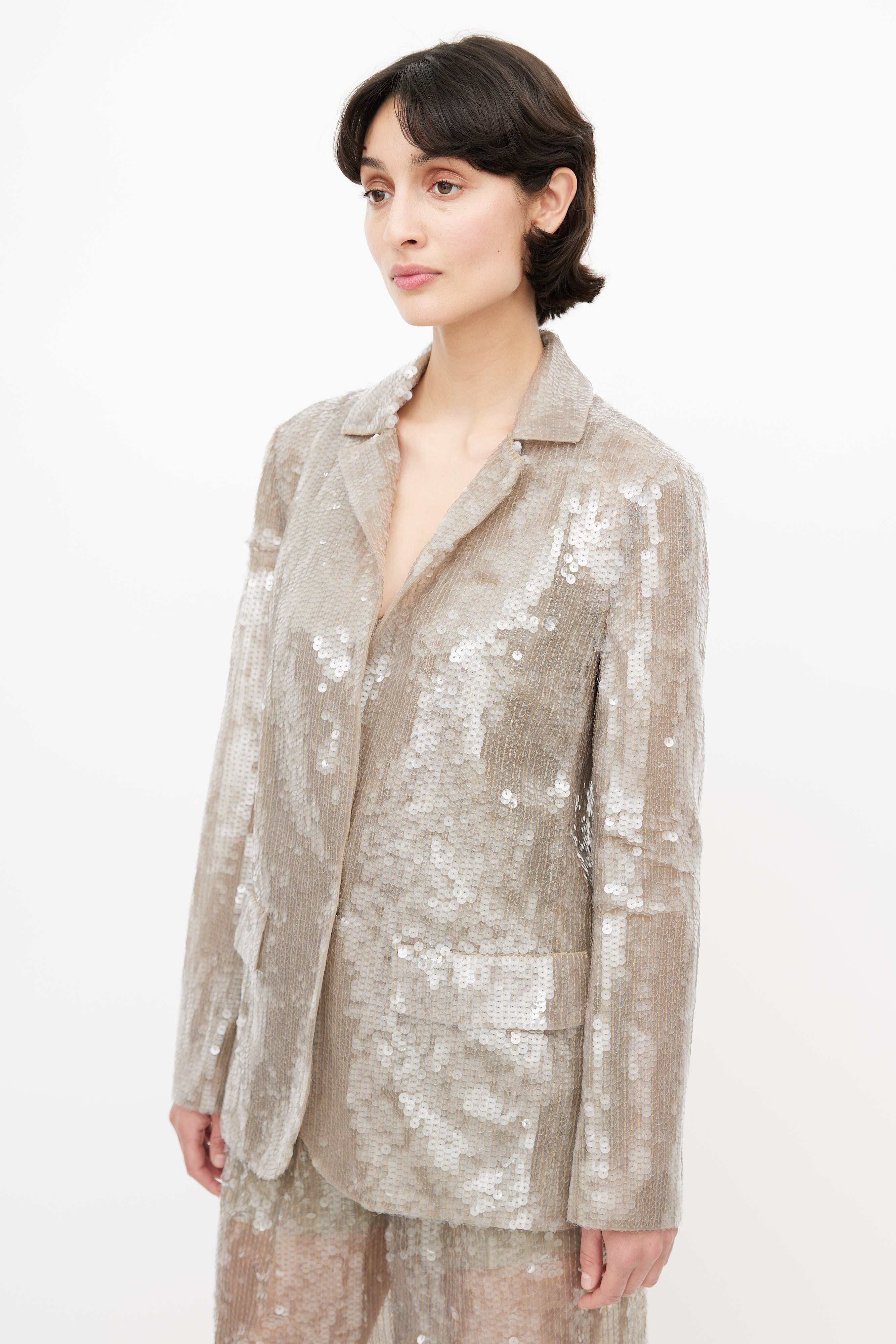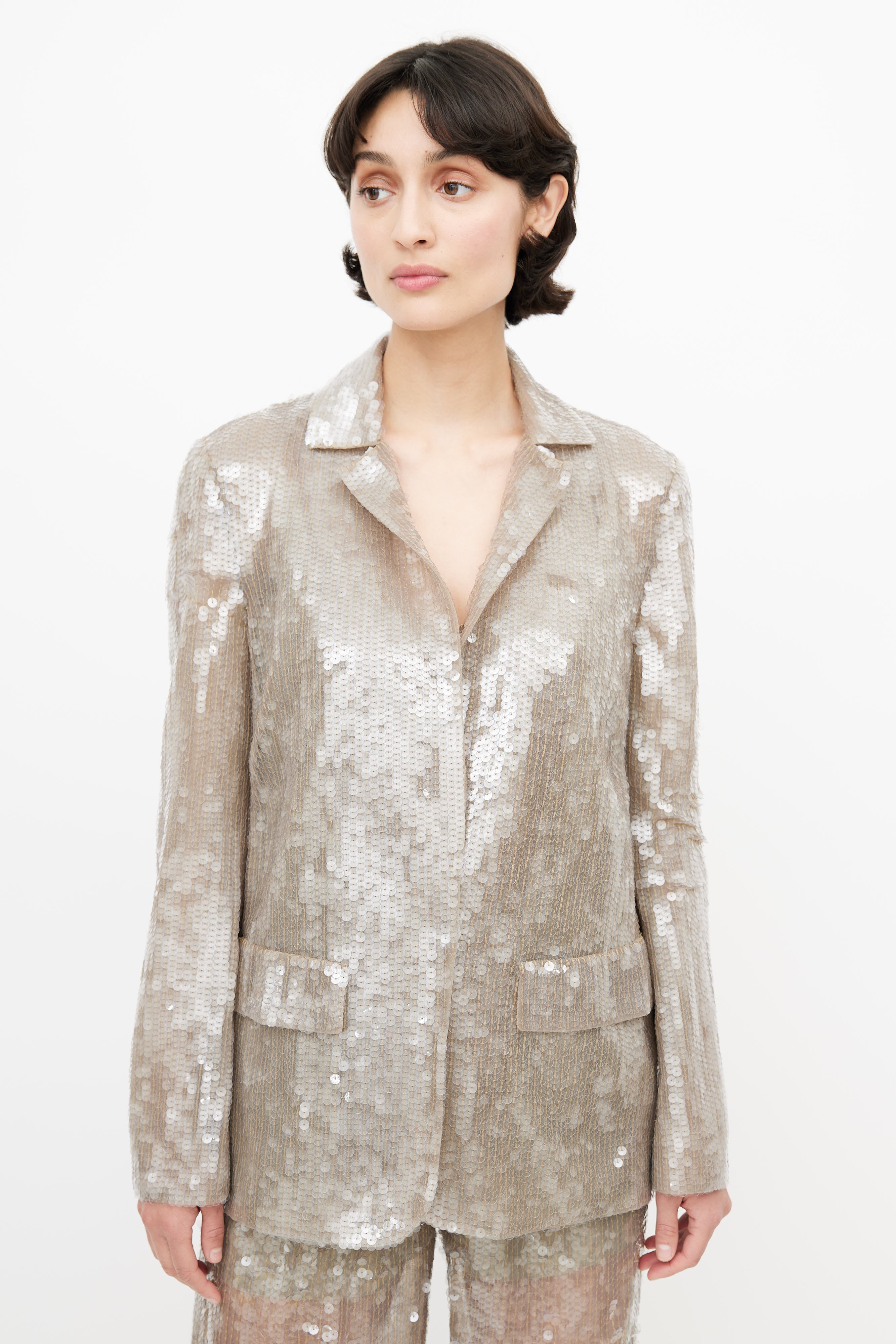 Pre-owned Alberta Ferretti grey sequin three piece suit featuring a blazer with notched lapel, two faux flap pockets at hip, and hook and eye closure. Tank features bead embellishment throughout, scoop neckline, and panelling throughout. Pants feature two slash pockets at hip, pleating at front, wide leg, and a zip fly with snap button closure. All garments lined. Clipped to fit model.
