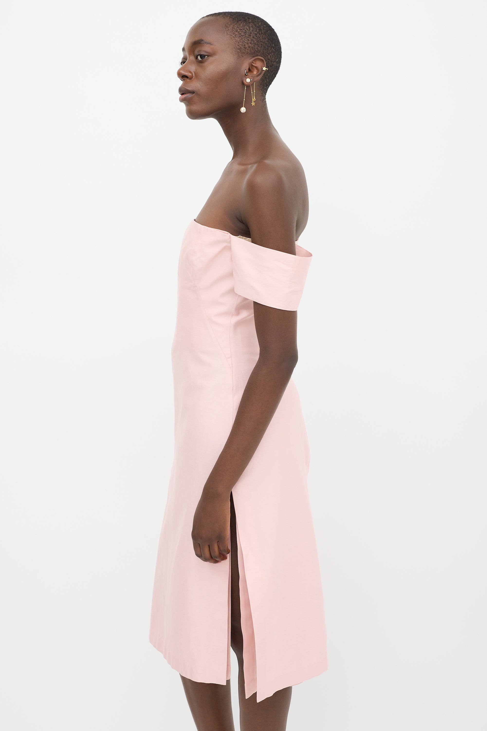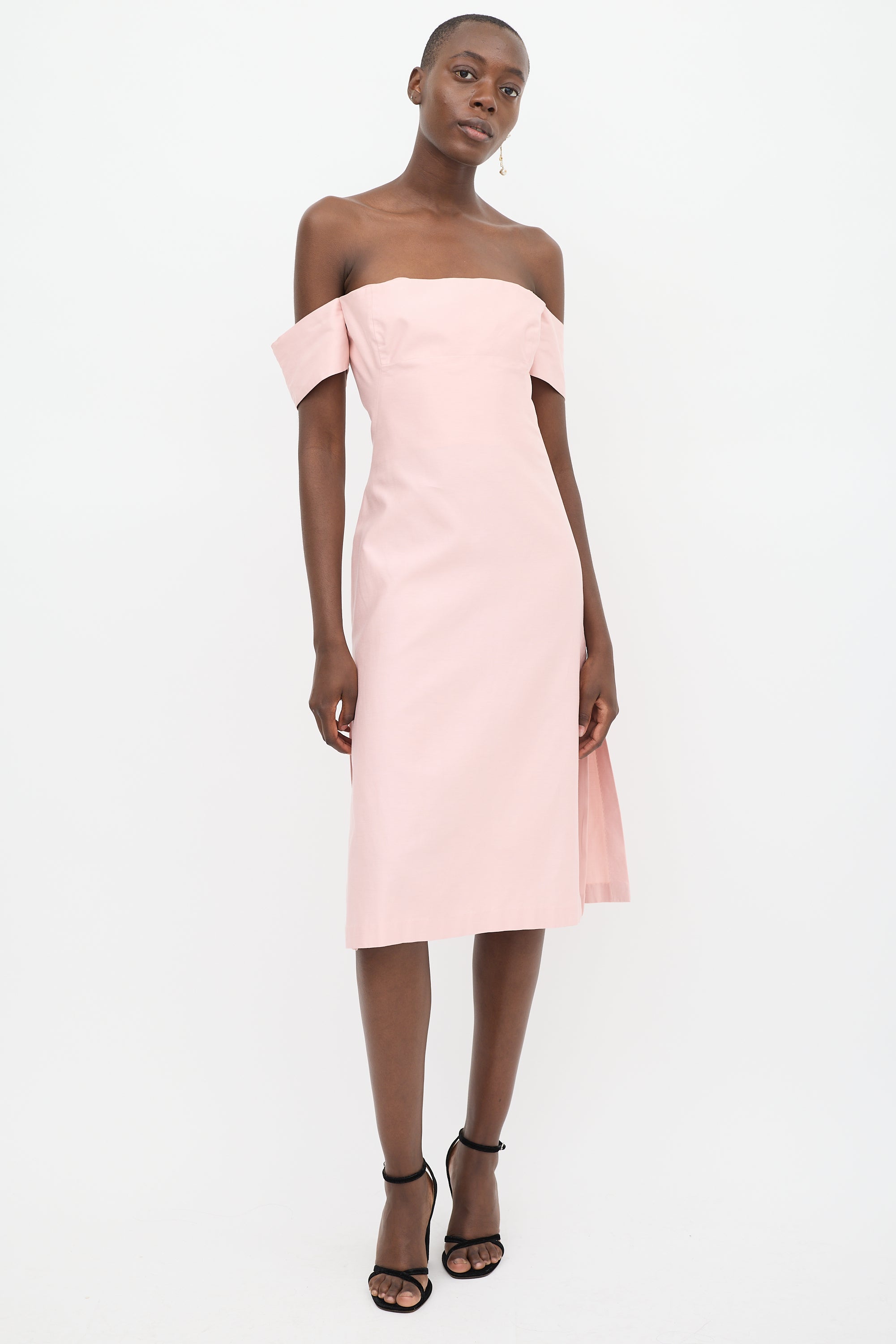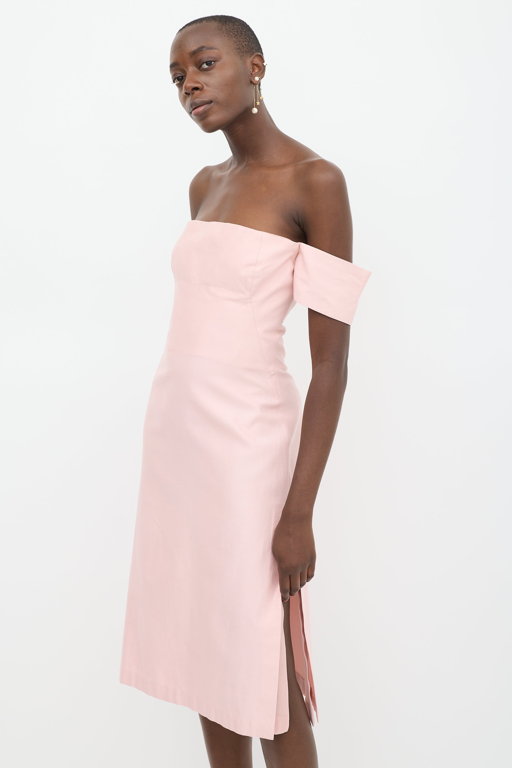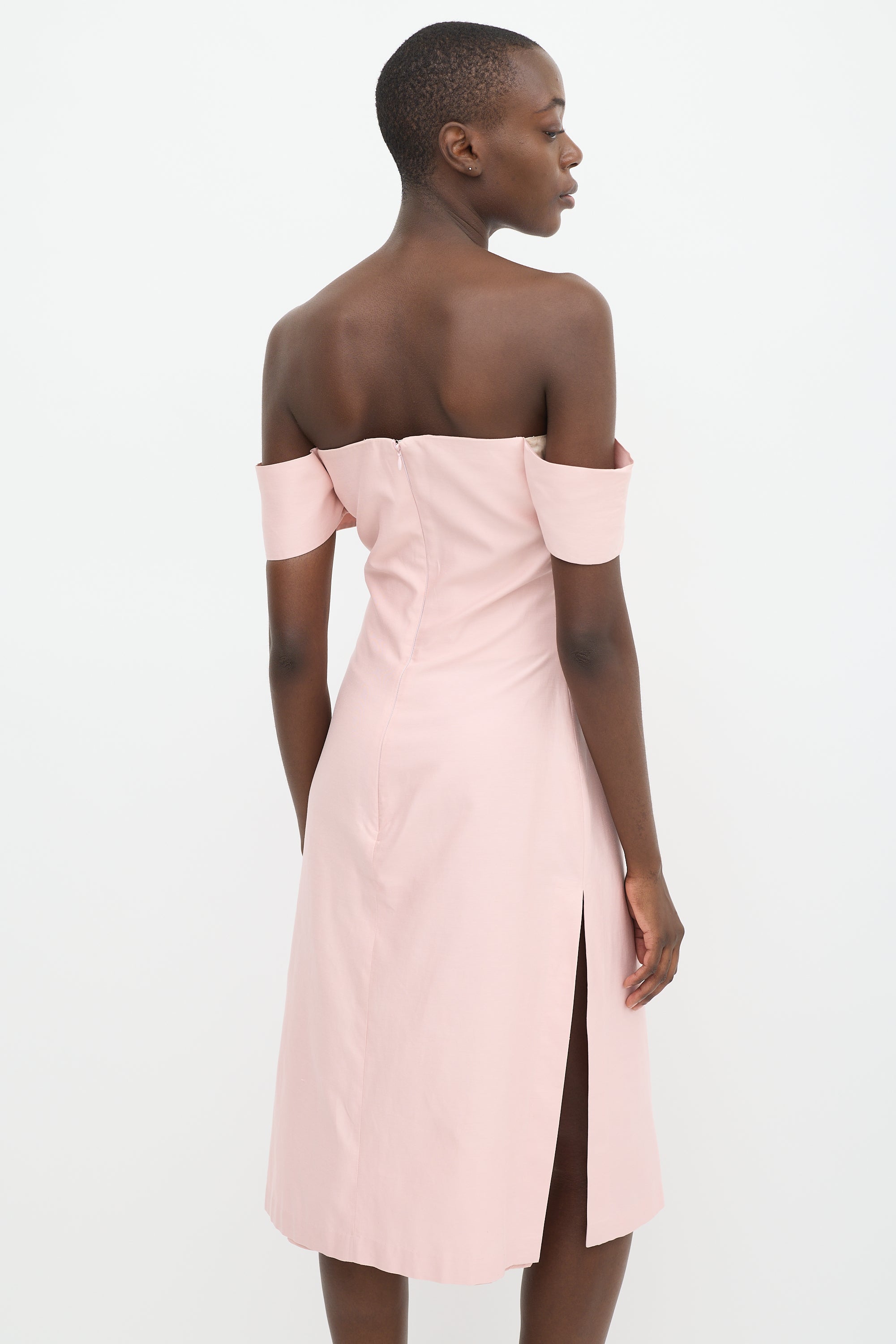 Pre-owned Alexander McQueen pink midi dress featuring a square neckline, cap sleeves, structured bust, slits at hem, and zip at back with hook and eye closure. Lined.