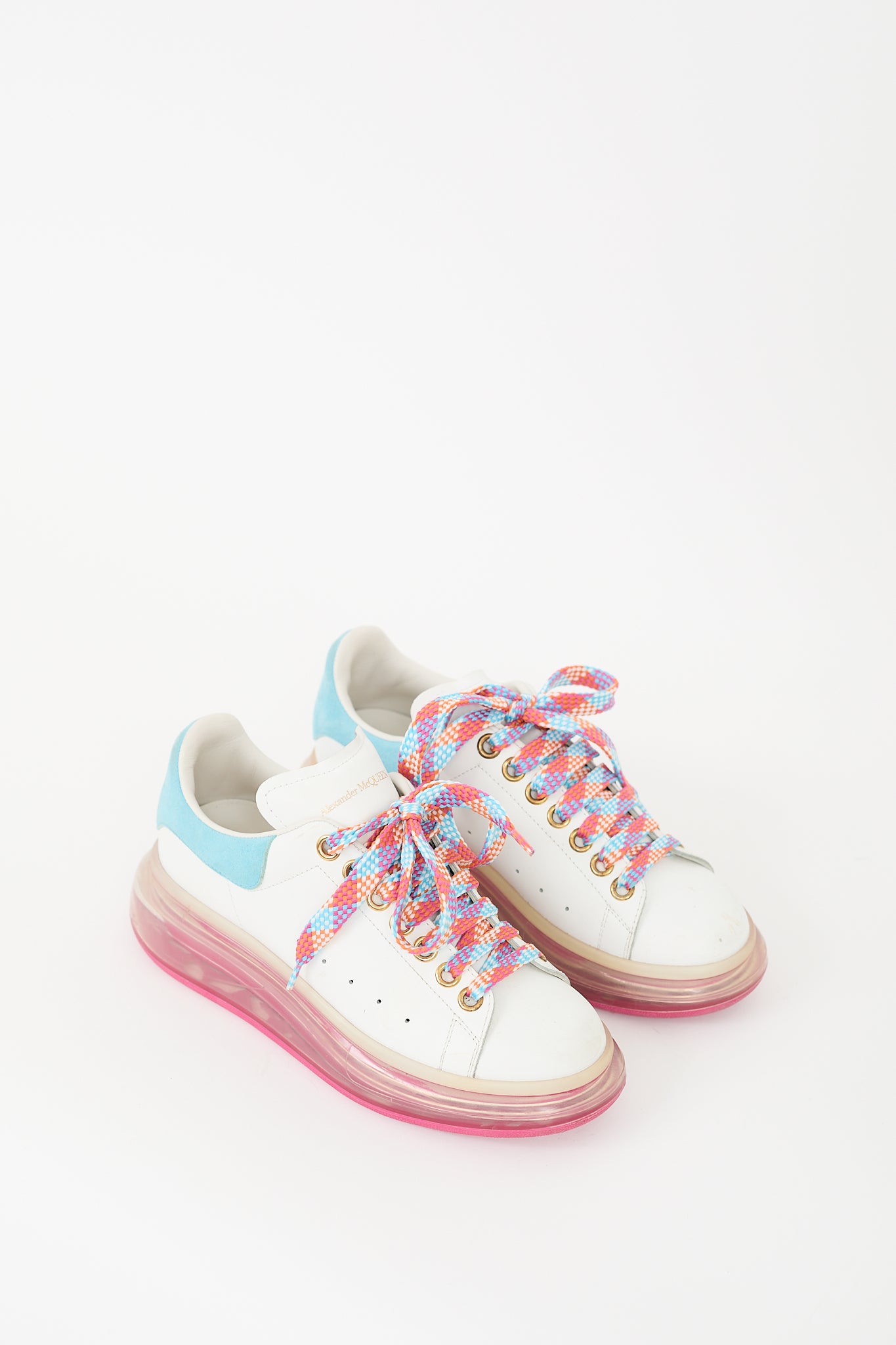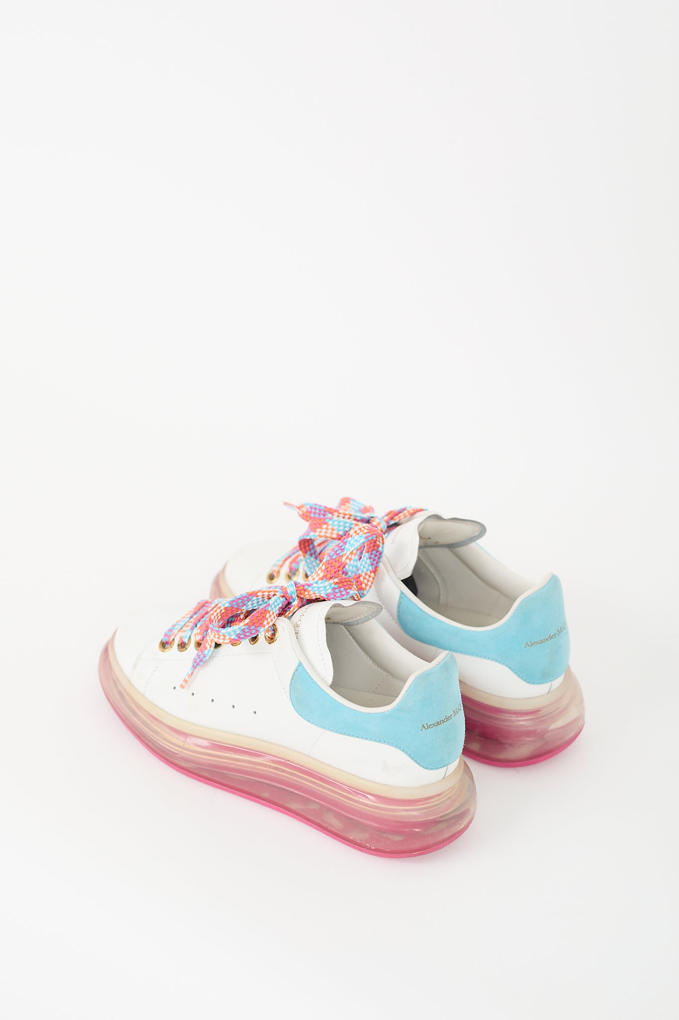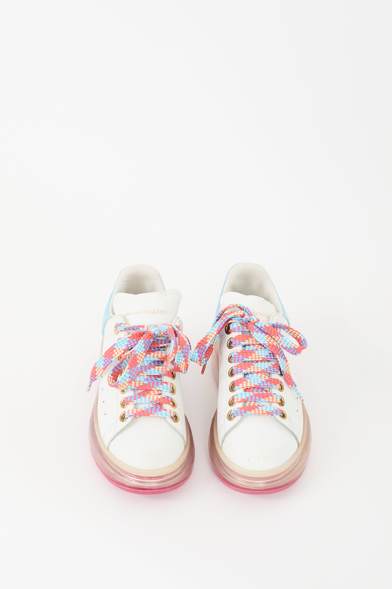 Pre-owned Alexander McQueen white leather Oversized sneakers featuring rounded toe, multicolour lace up front, blue suede counter with stamped logo, and platform clear and pink PVC sole.