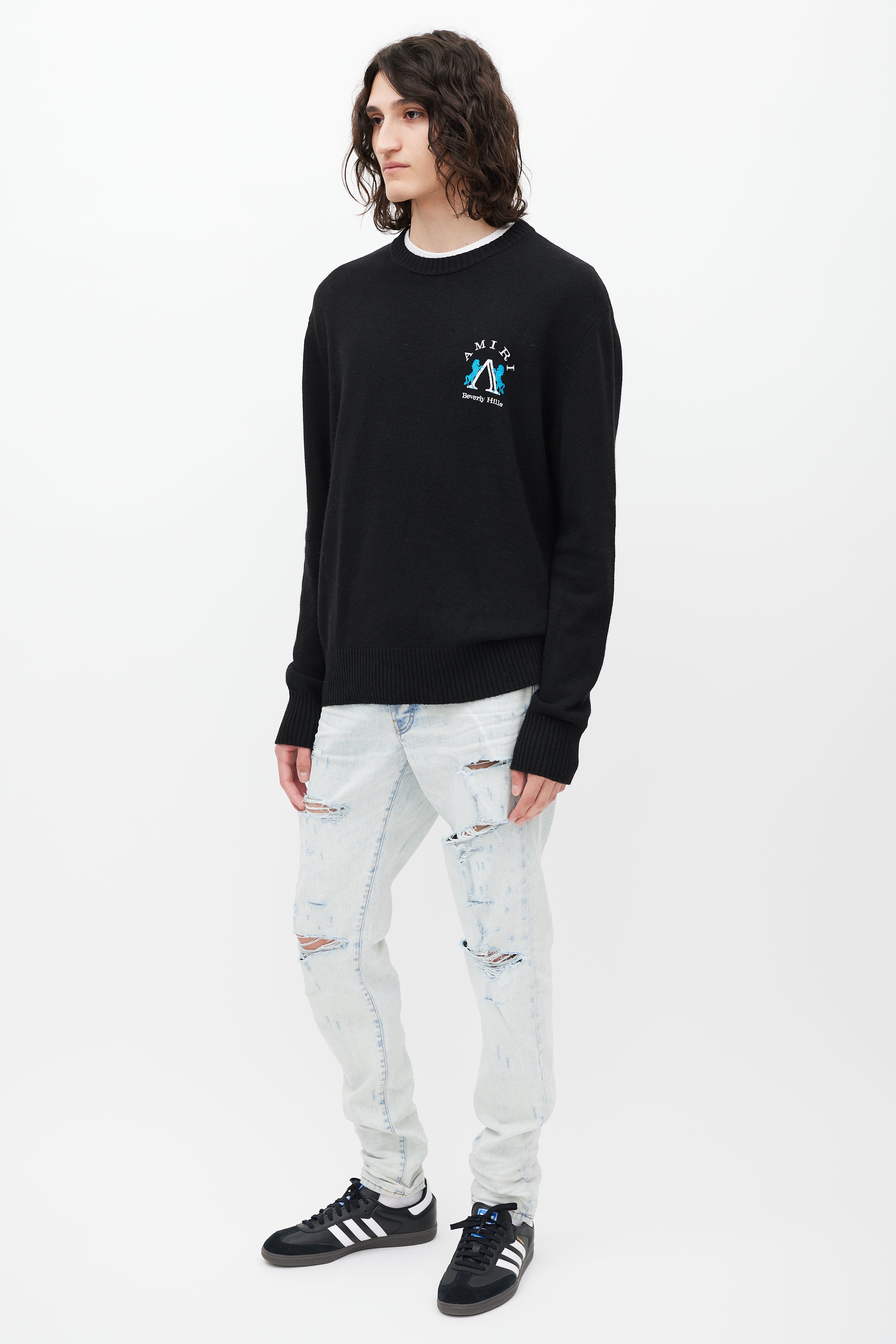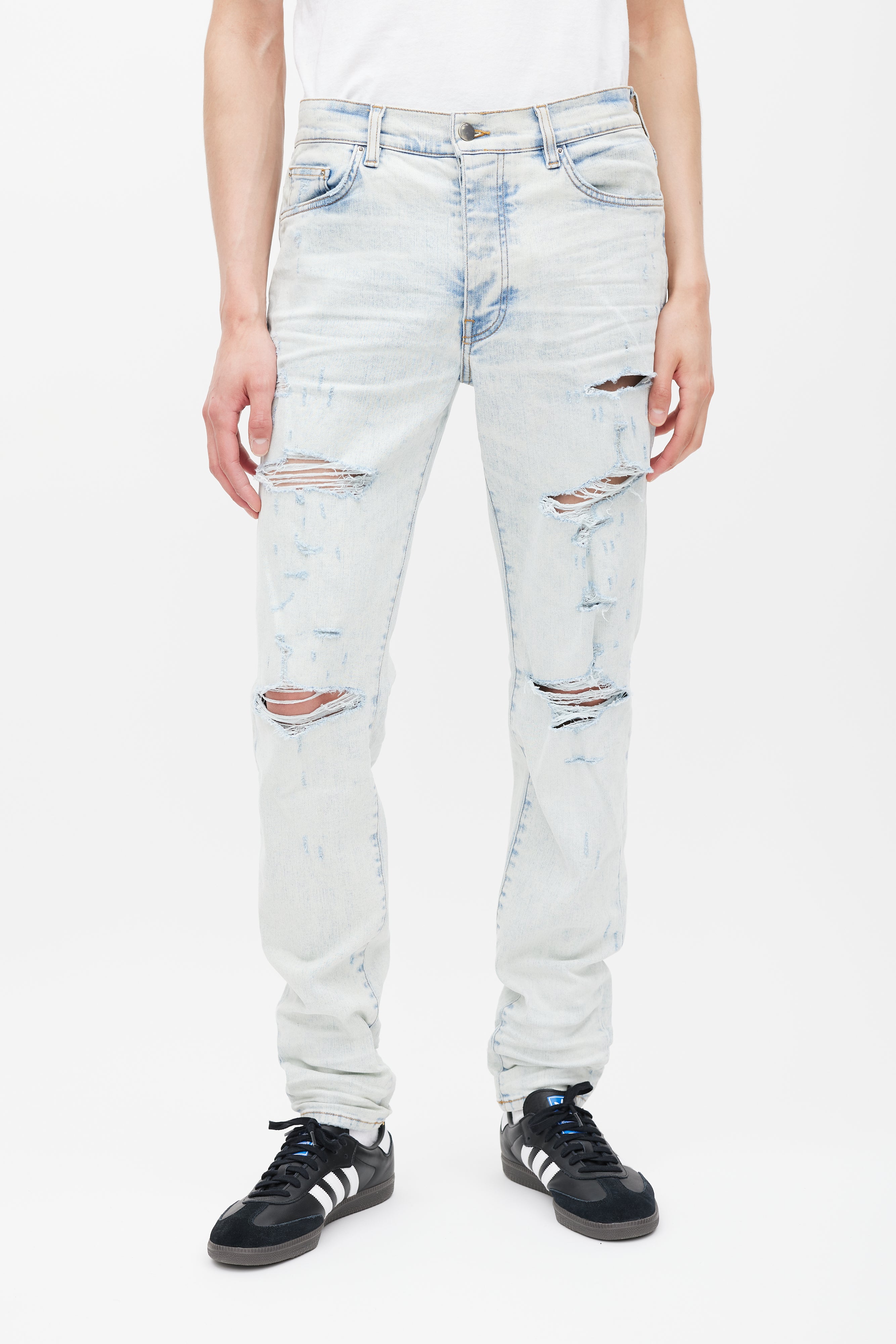 Pre-owned Amiri light blue wash jeans featuring distressing throughout, five pocket styling, debossed silver tone hardware at back right pocket, black leather logo patch at back right waist, and concealed front button fly closure.