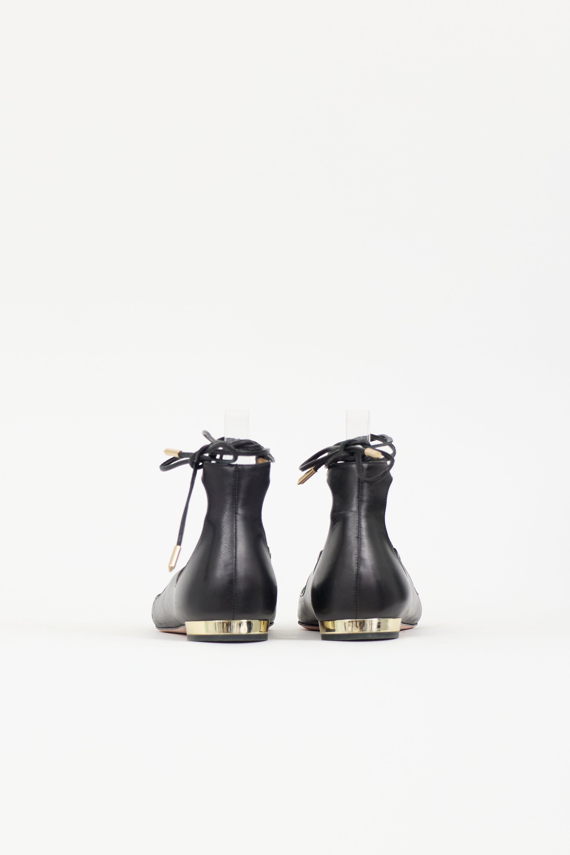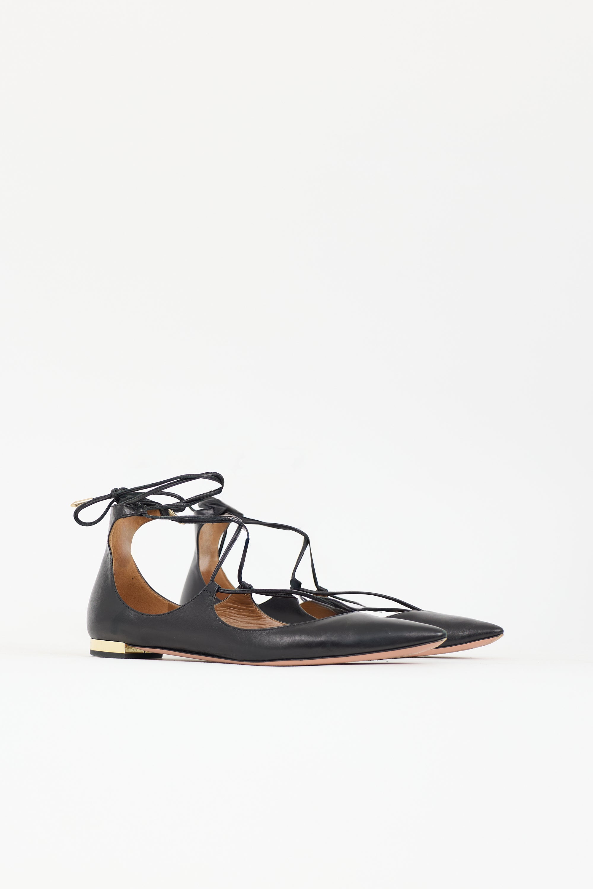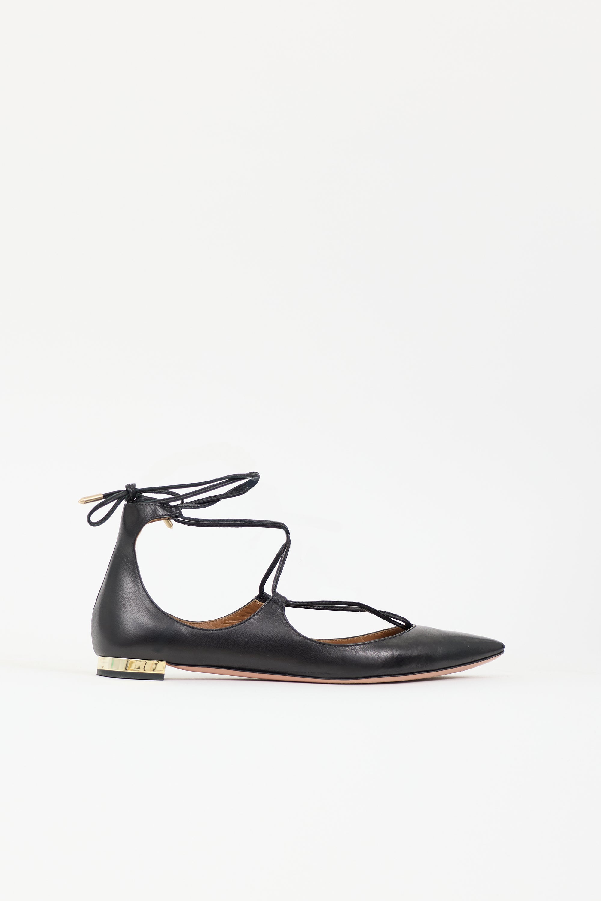 Pre-owned Aquazzura black leather Christy flats featuring a pointed toe, lace up front, and gold tone hardware covered heel.