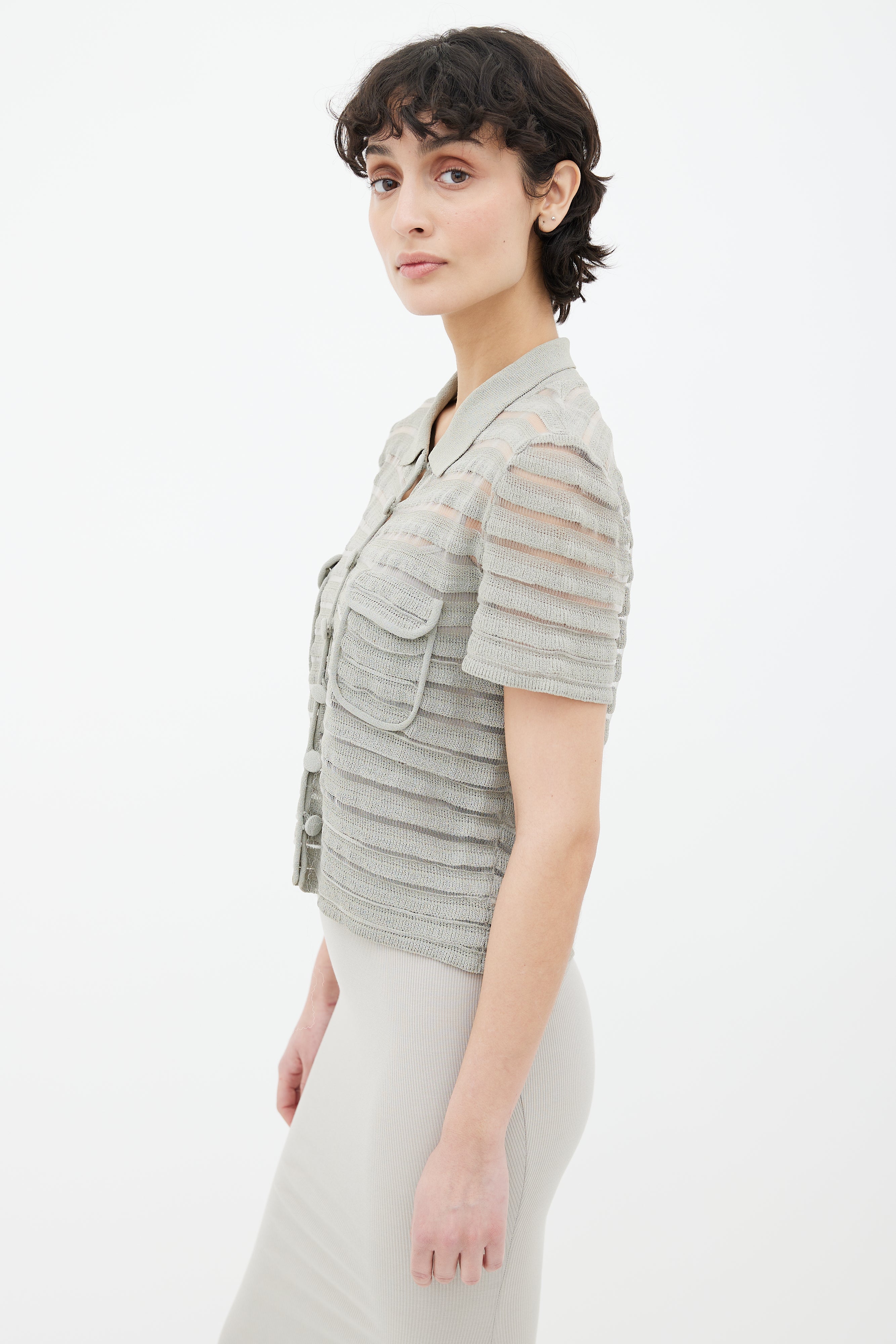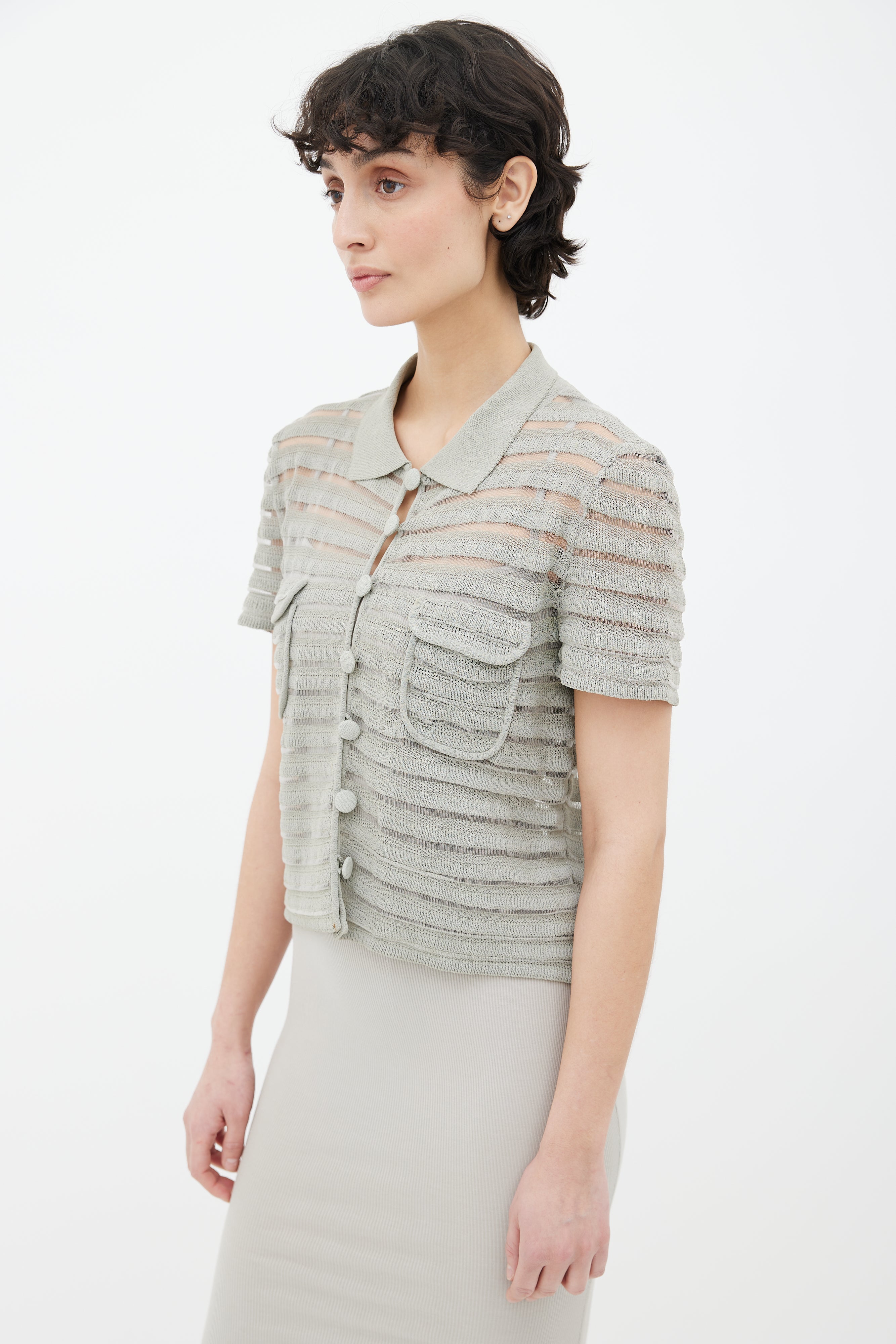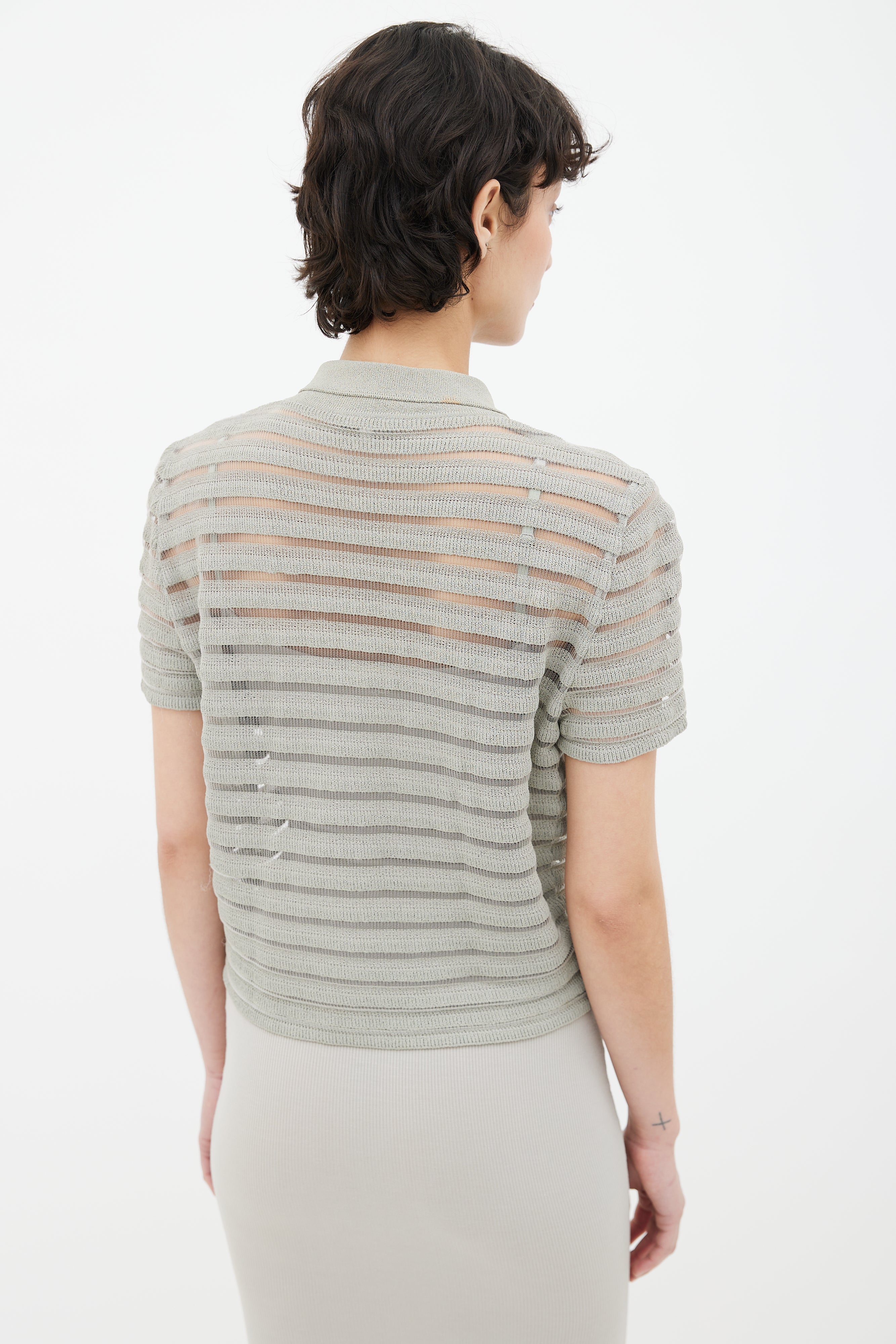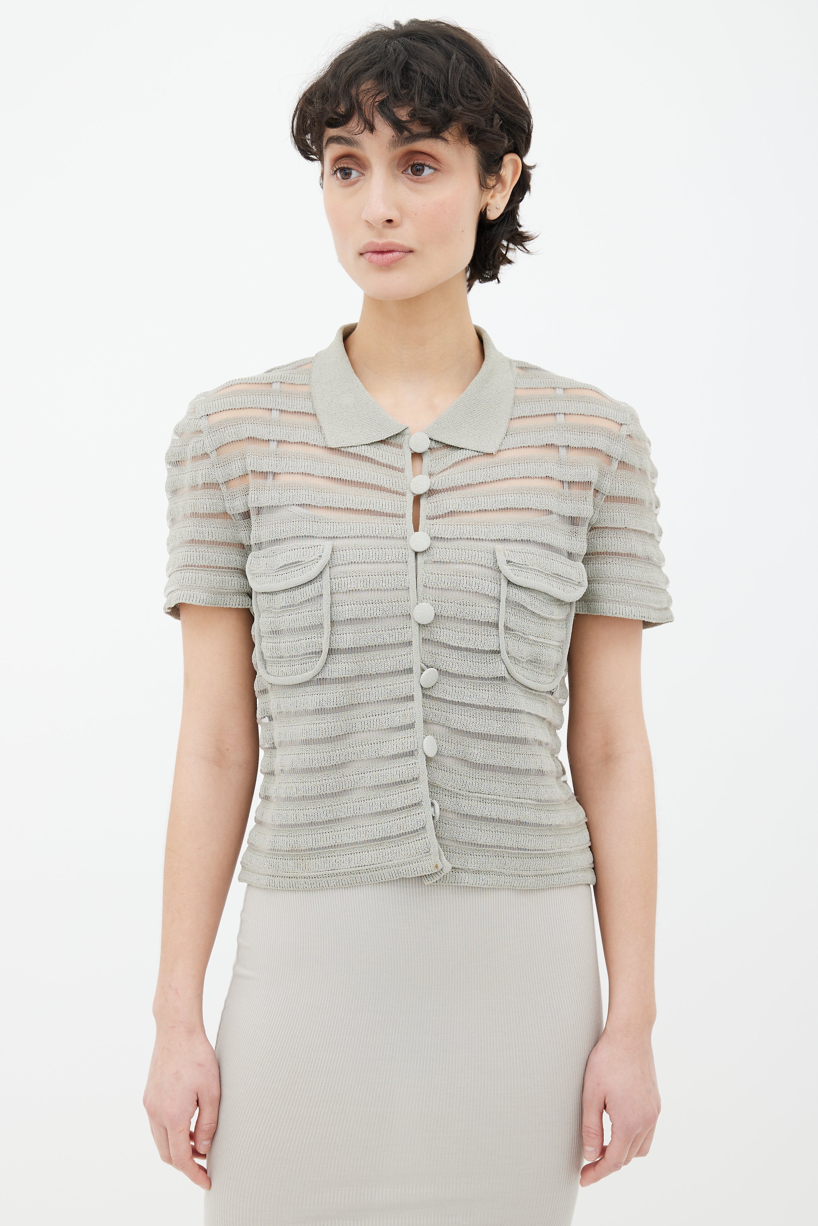 Pre-owned Giorgio Armani greige semi sheer striped knit shirt featuring rib knit wide spread collar, short sleeves, seven button-up closure, two flap pockets at front chest and semi sheer stripes throughout.