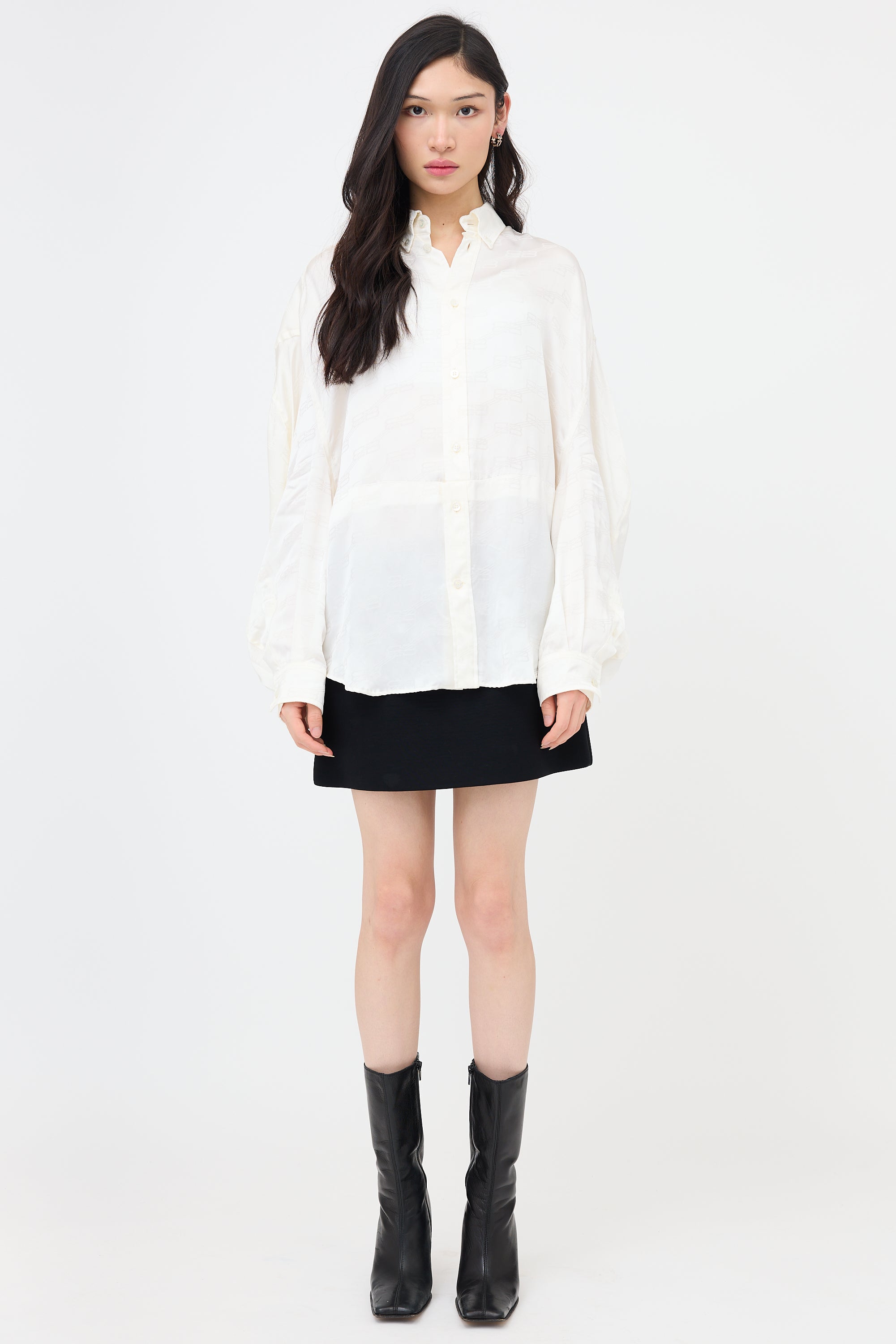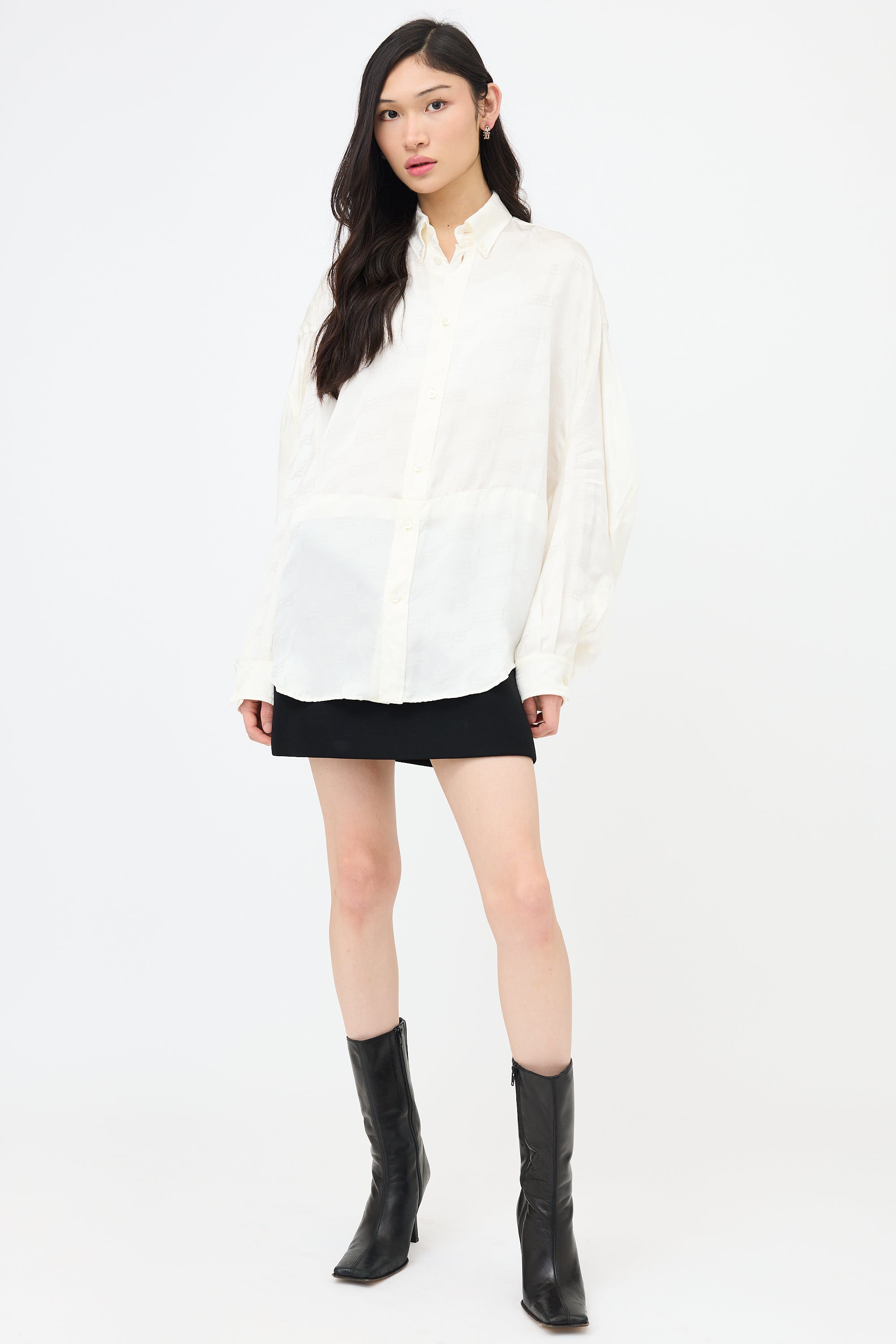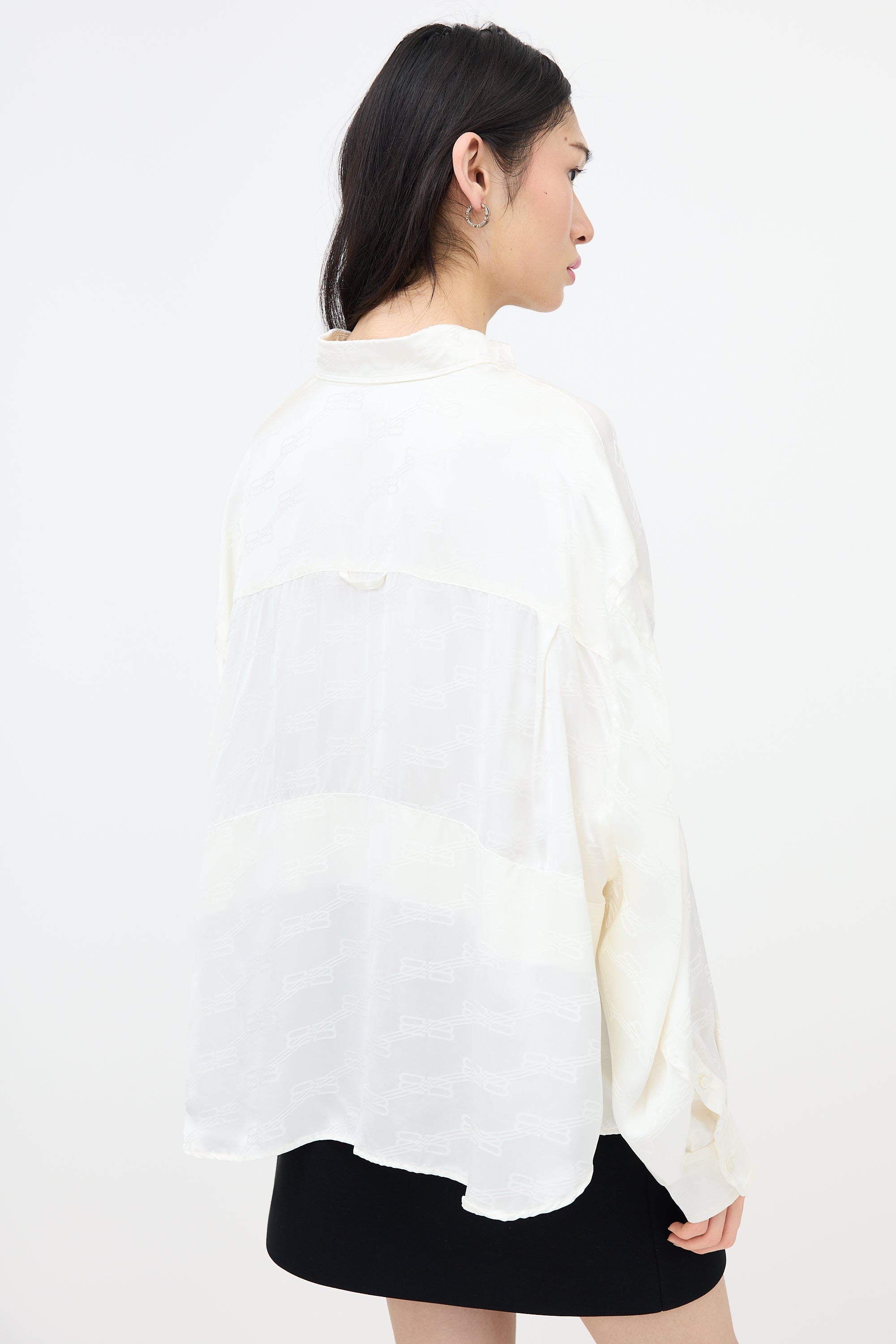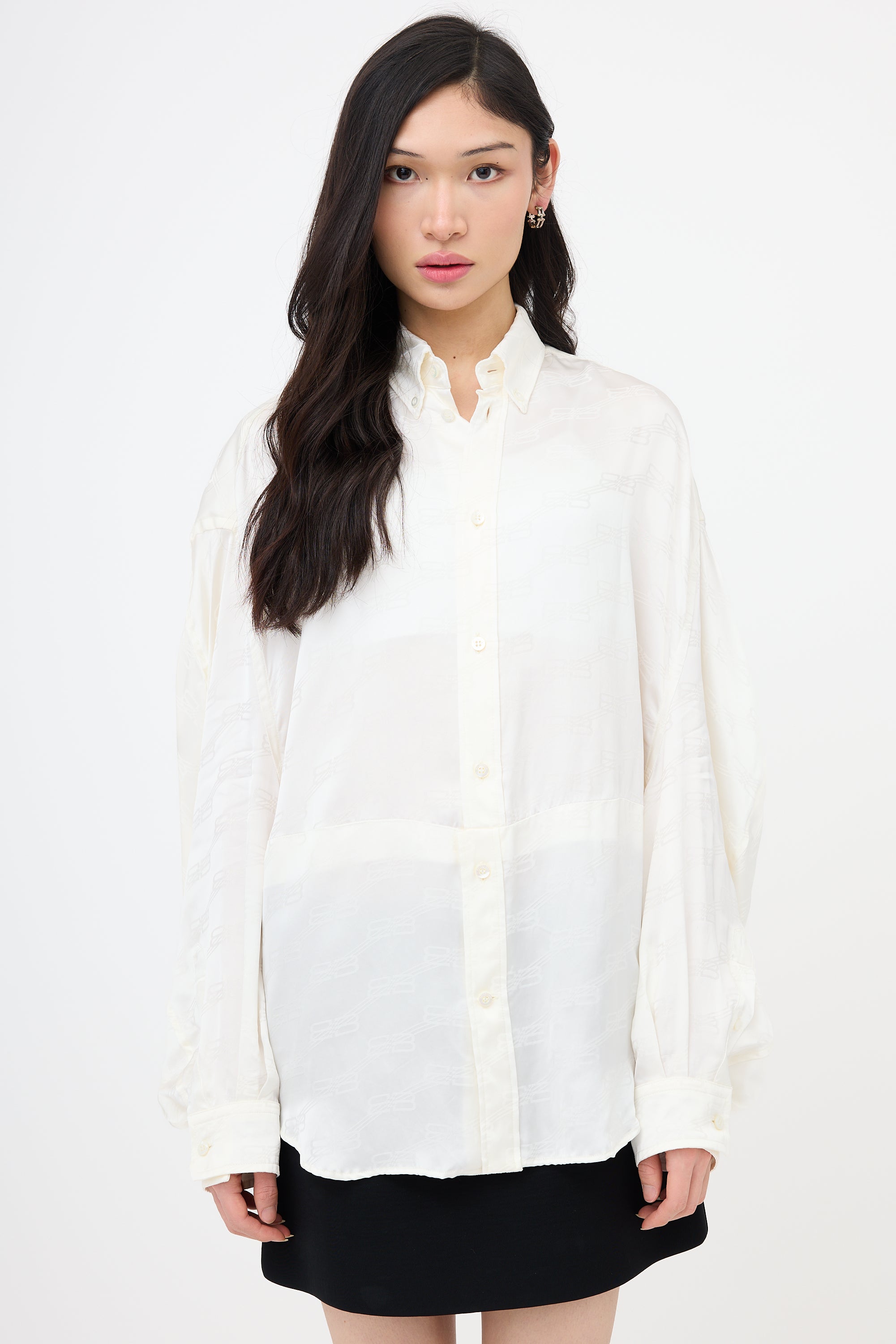 Pre-owned Balenciaga white oversized shirt featuring a tonal BB logo pattern, spread collar, button front, twisted sleeves, black logo tab at left side, and asymmetrical hem panel.