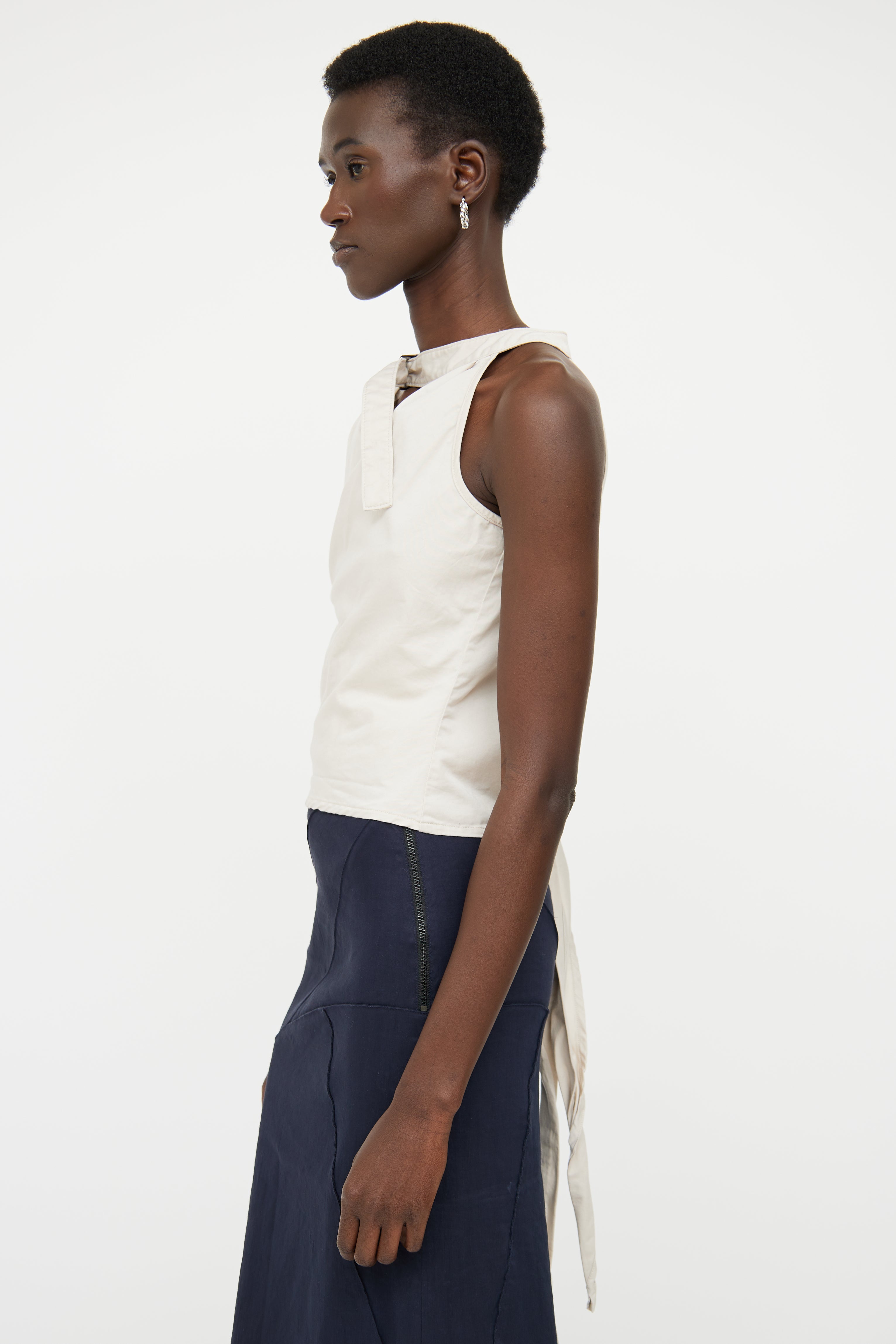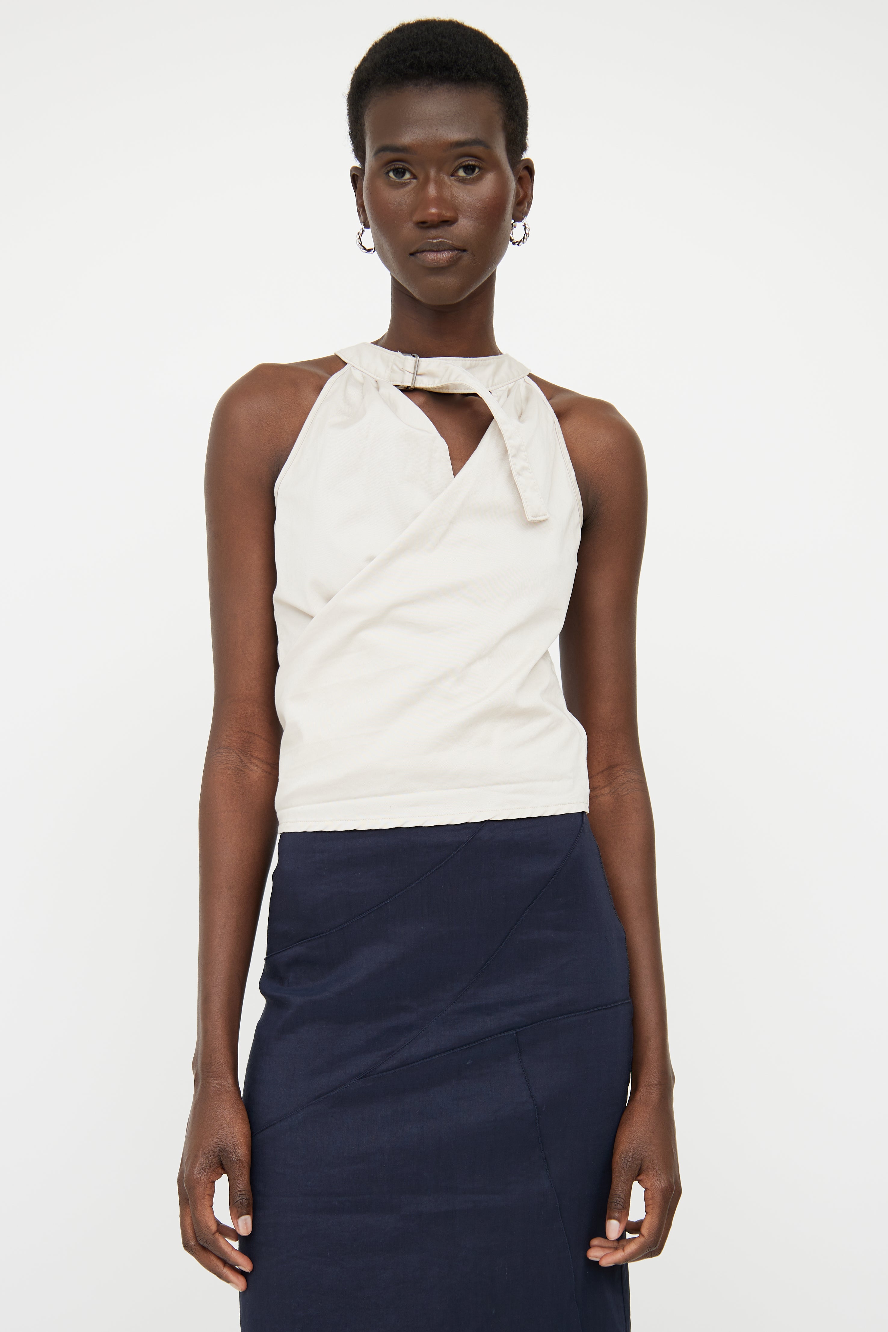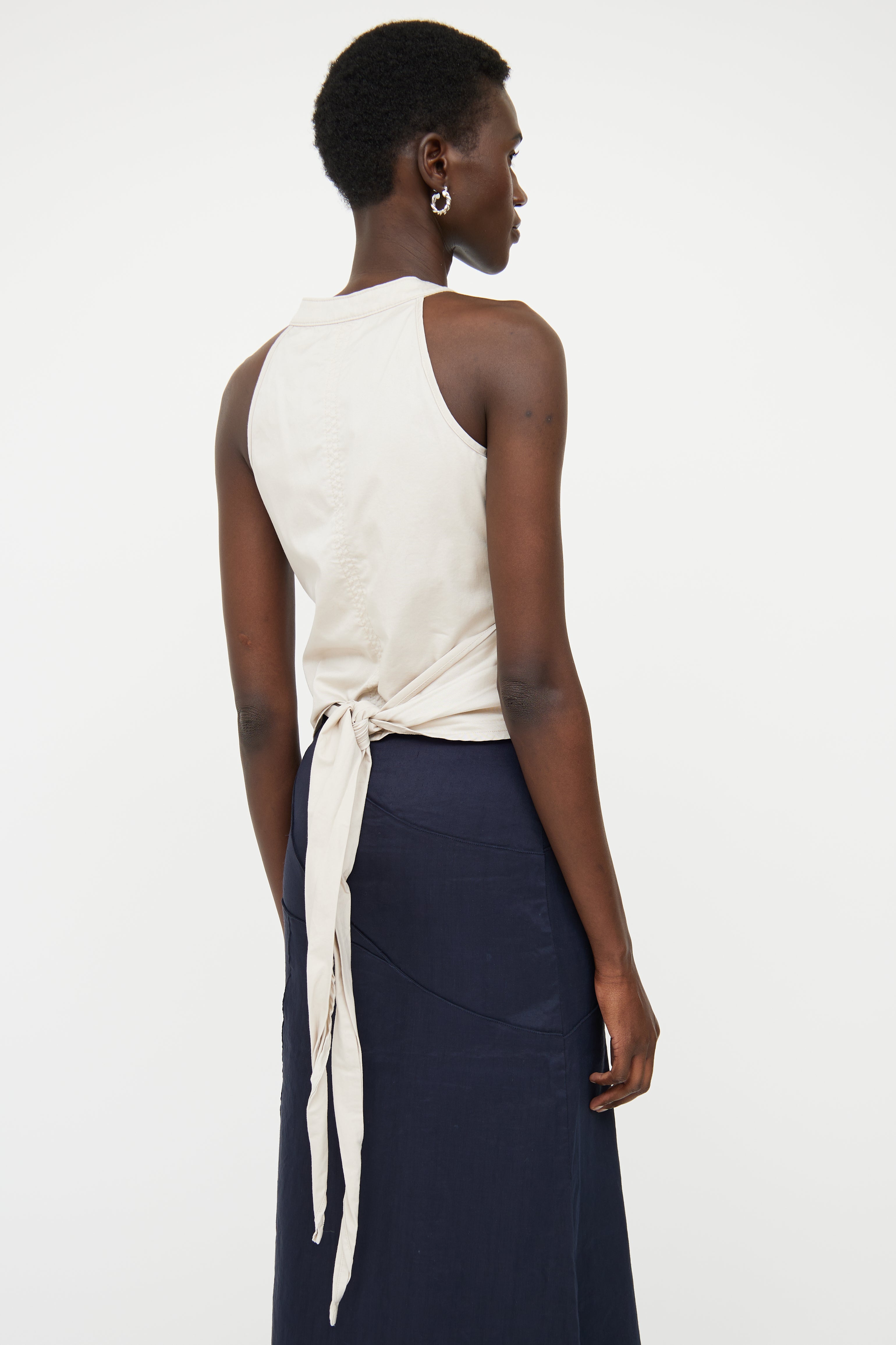 Pre-owned Sarah Pacini beige sleeveless top featuring halter style belted neckline, pleat detailing at top and wrap styling with tie closure.