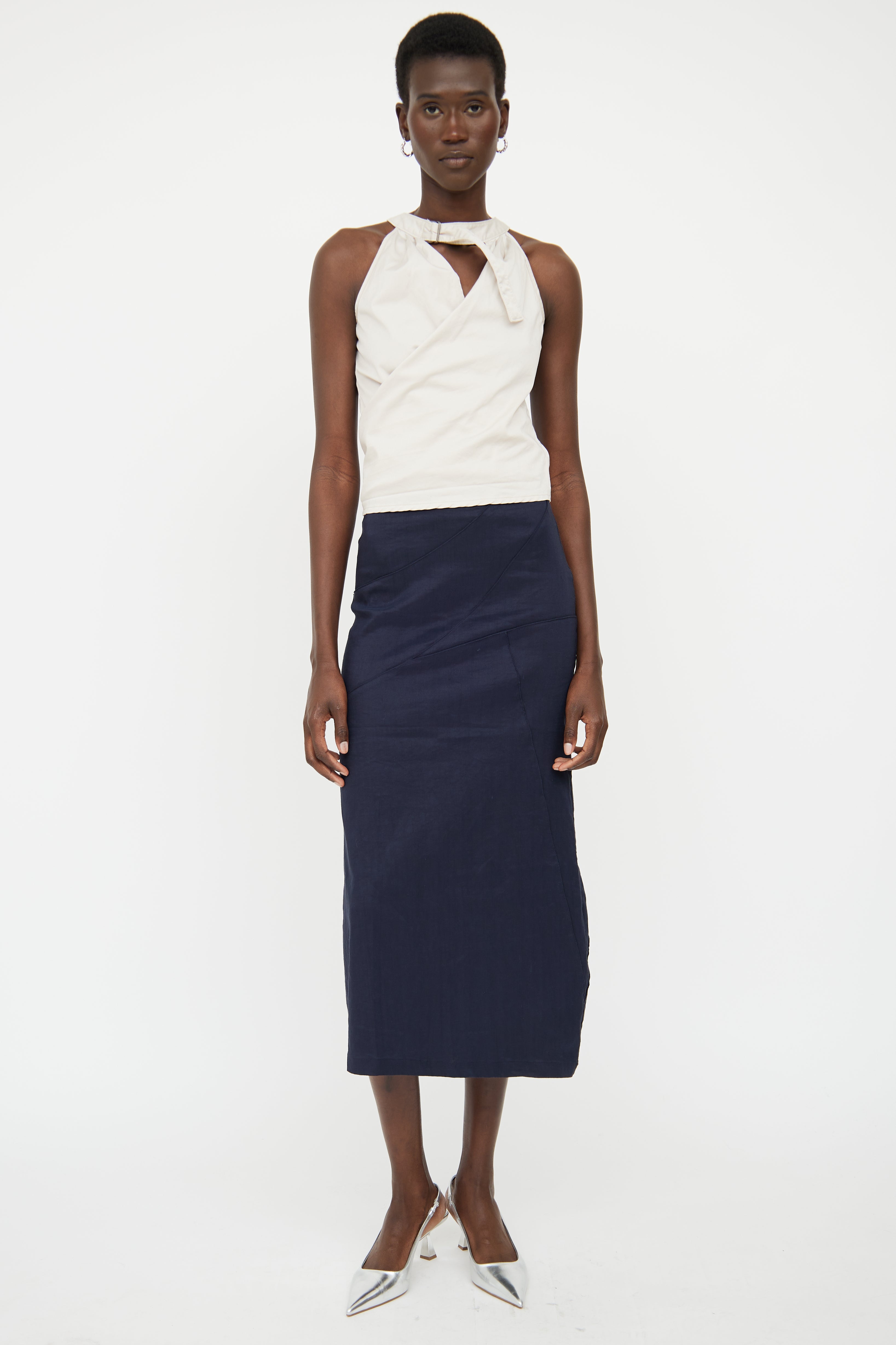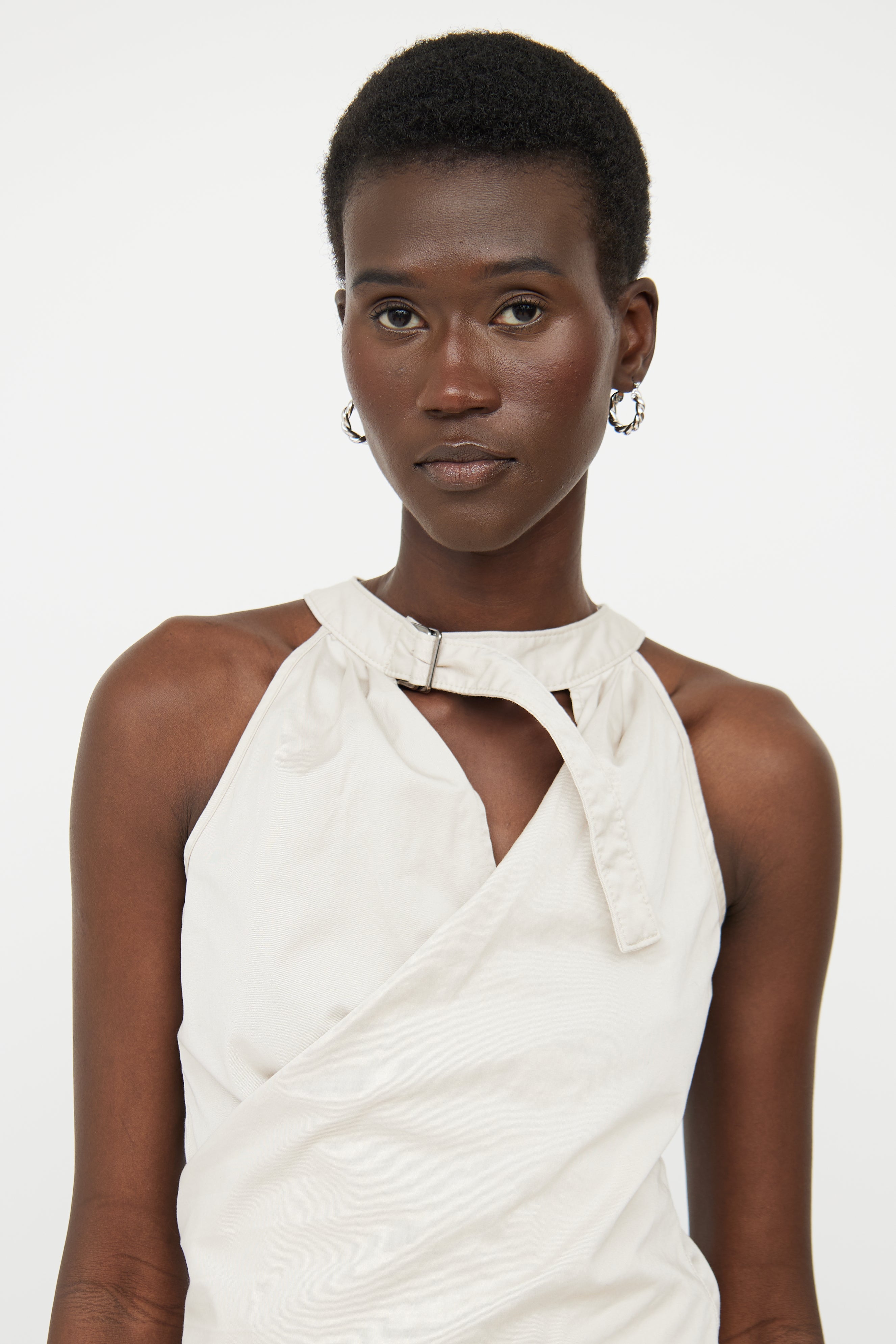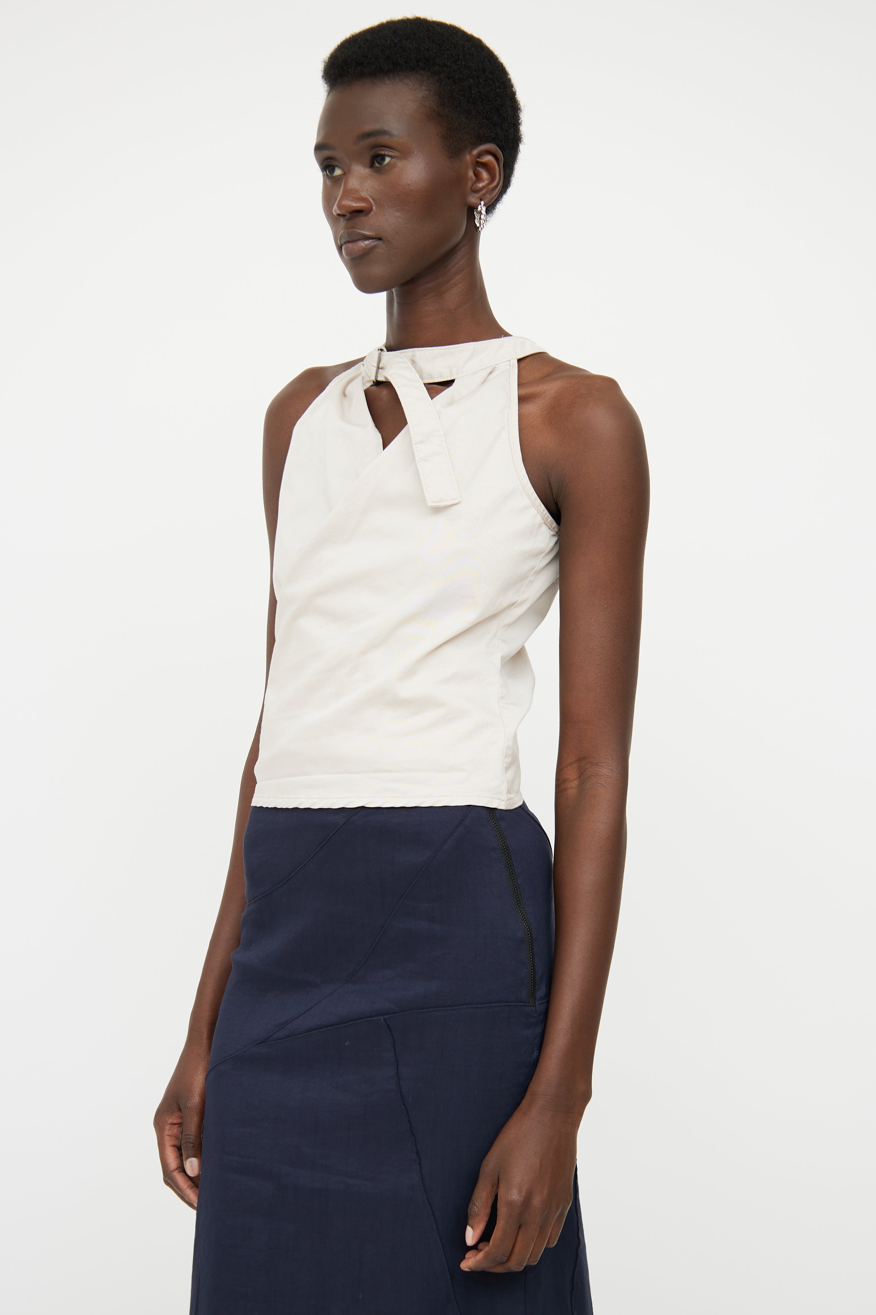 Pre-owned Sarah Pacini beige sleeveless top featuring halter style belted neckline, pleat detailing at top and wrap styling with tie closure.