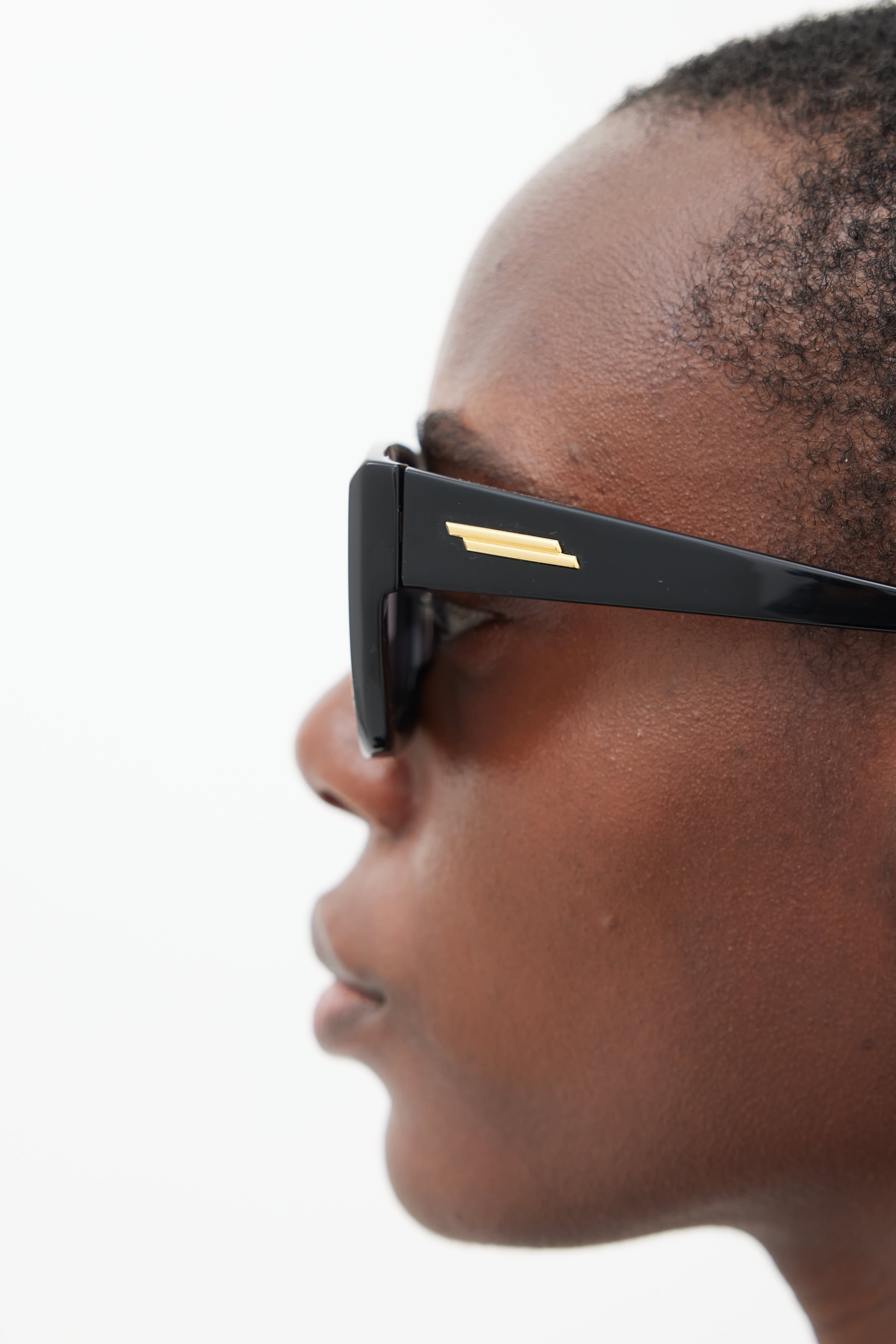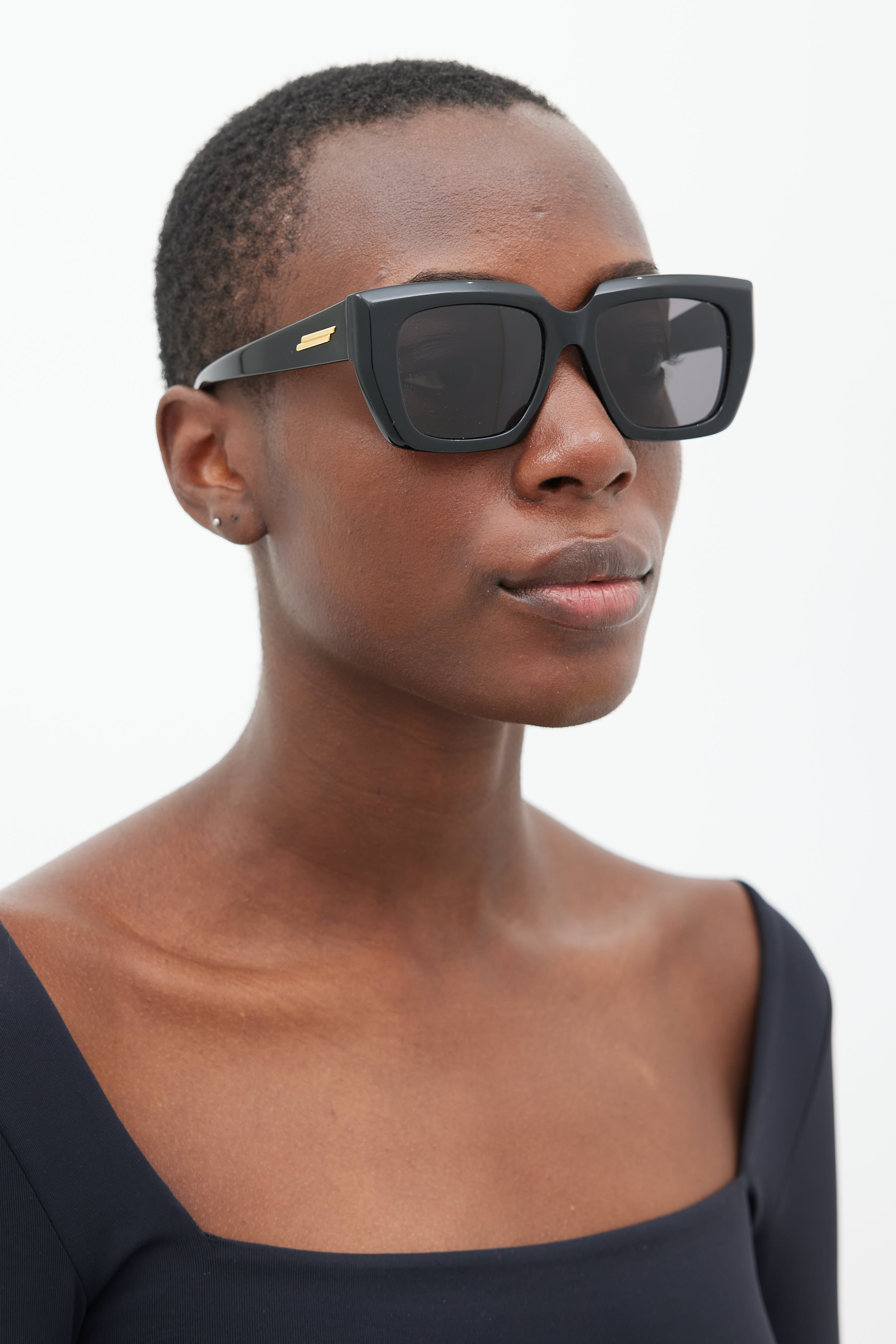 Pre-owned Bottega Veneta BV1030S sunglasses featuring a black angular square frame, black lenses, and gold tone emblem decal at temples. Comes with case and box.