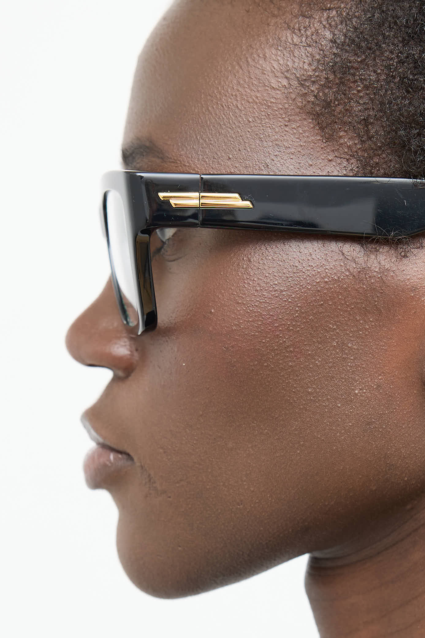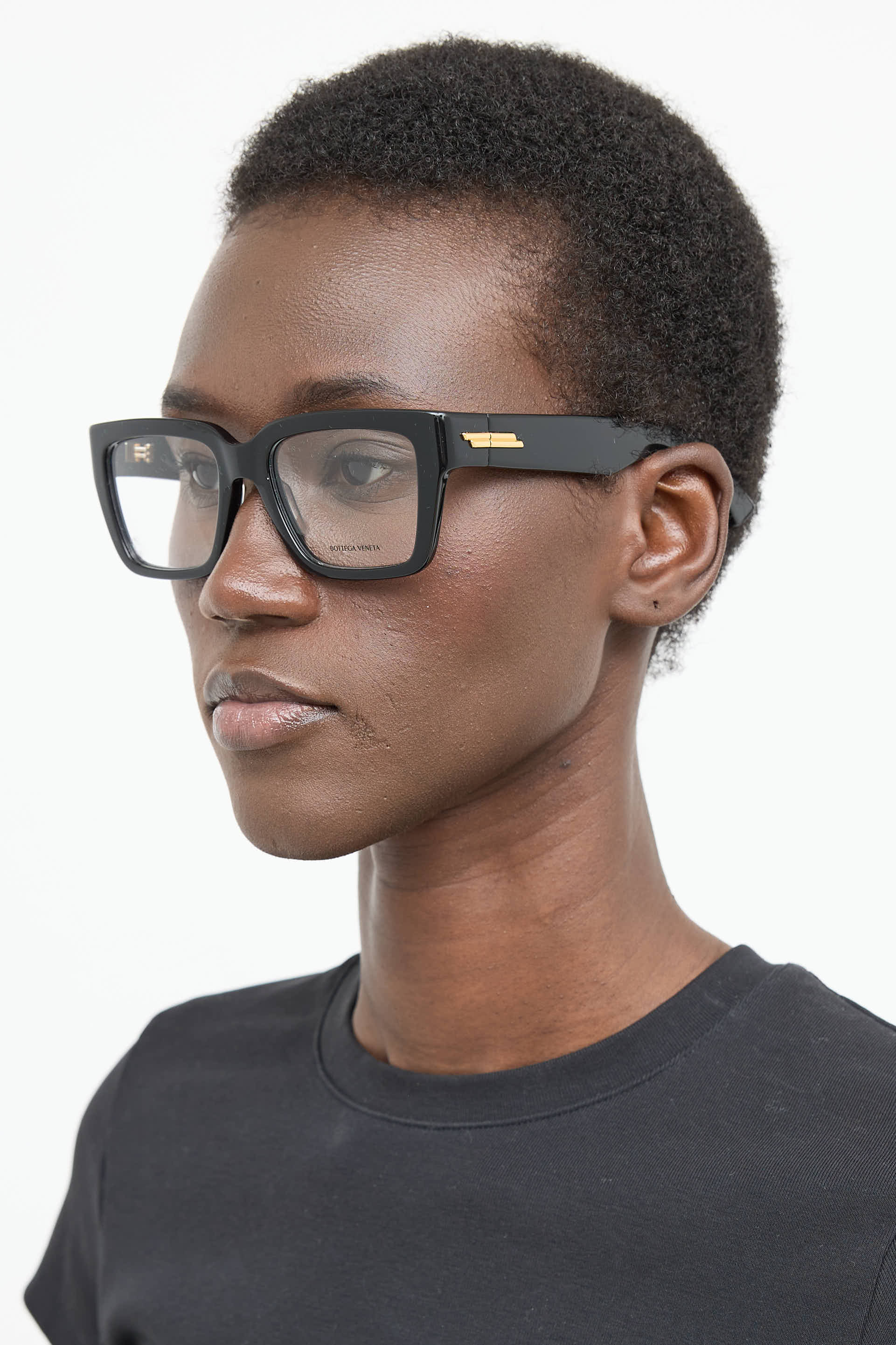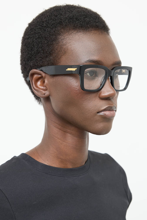 Pre-owned Bottega Veneta black square frames, nose saddle bridge, clear lenses and gold tone plaque at temples.