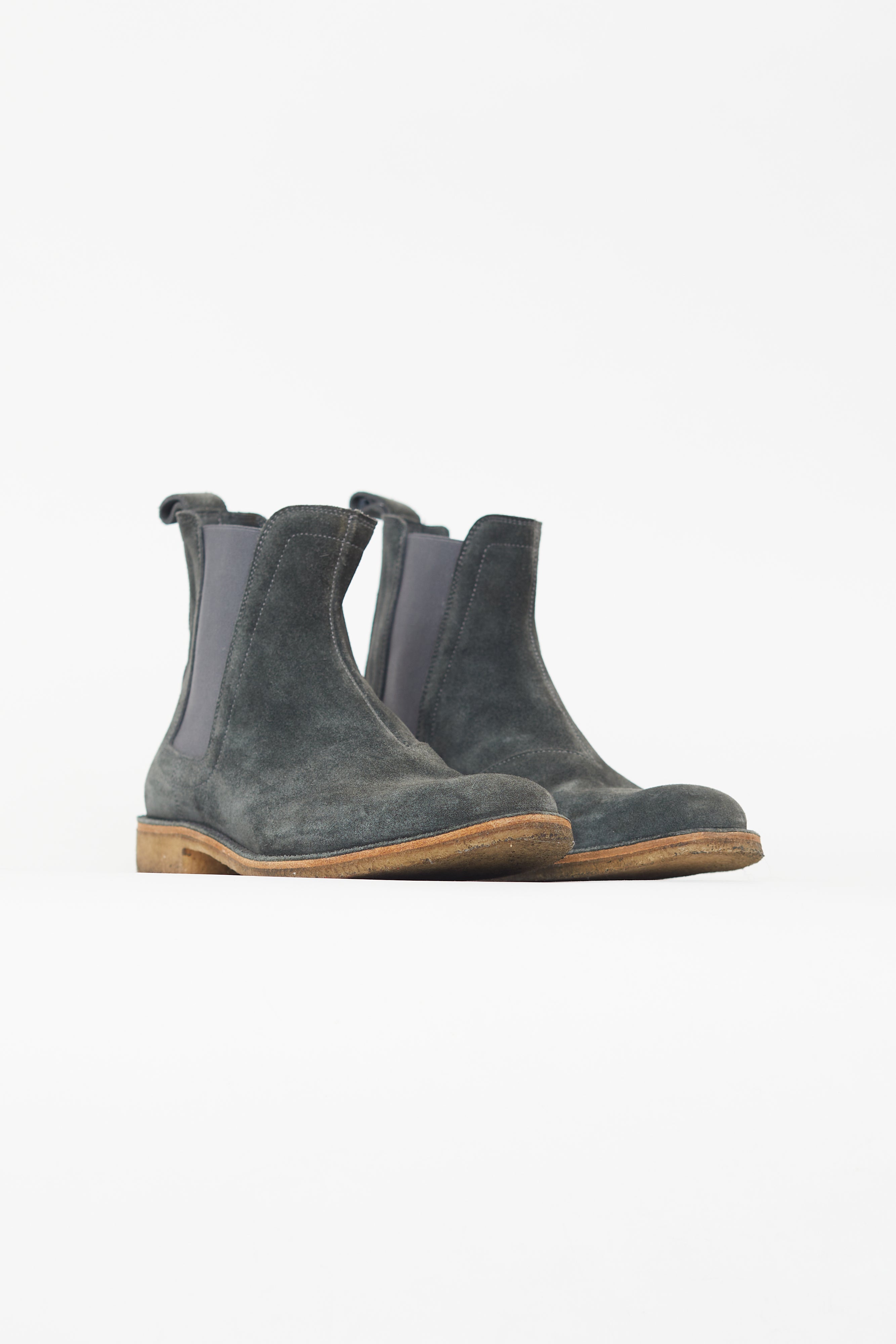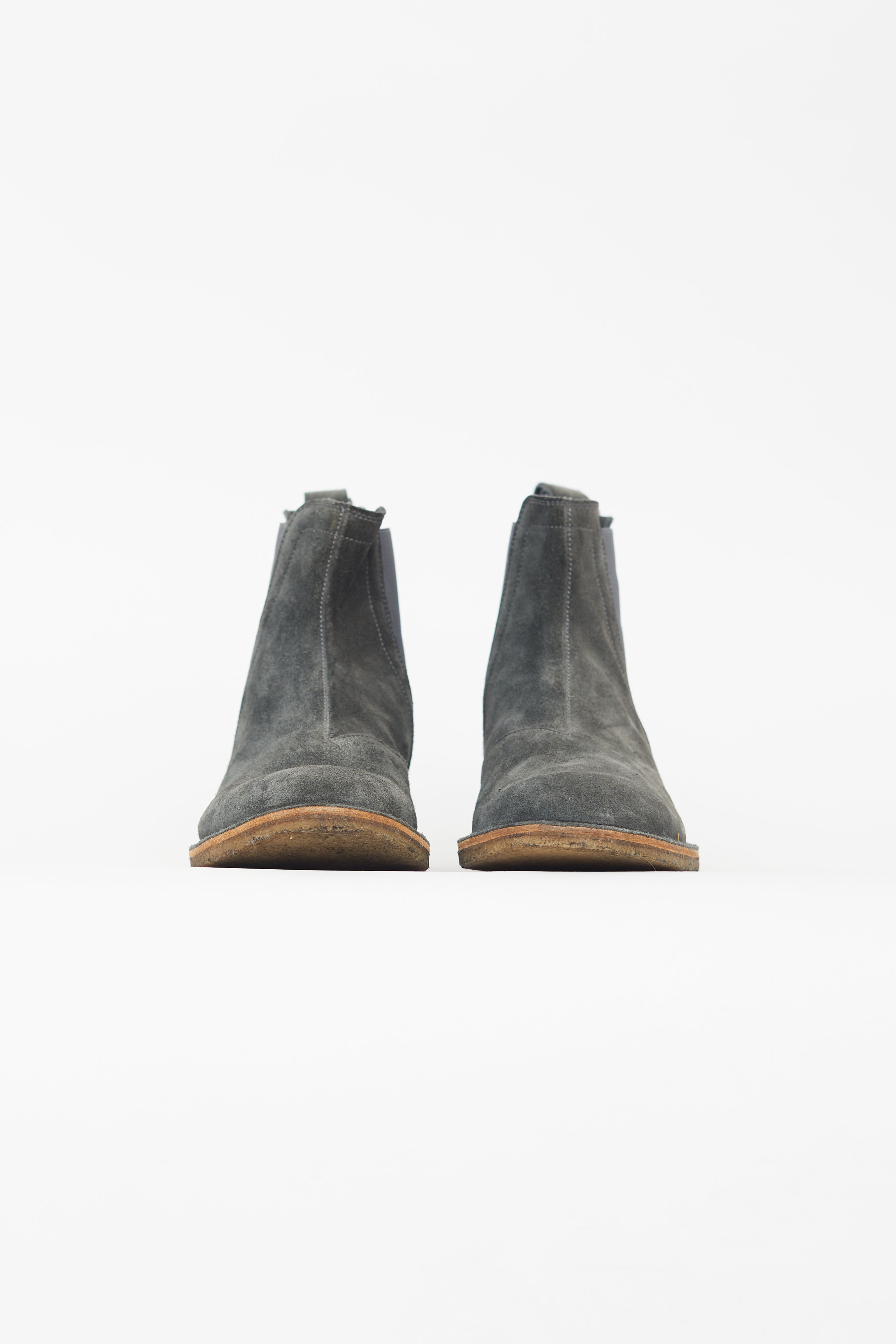 Pre-owned Bottega Veneta grey suede chelsea boots featuring a round toe, gussets at side, pull tab at heel, crepe sole, and pull on entry.