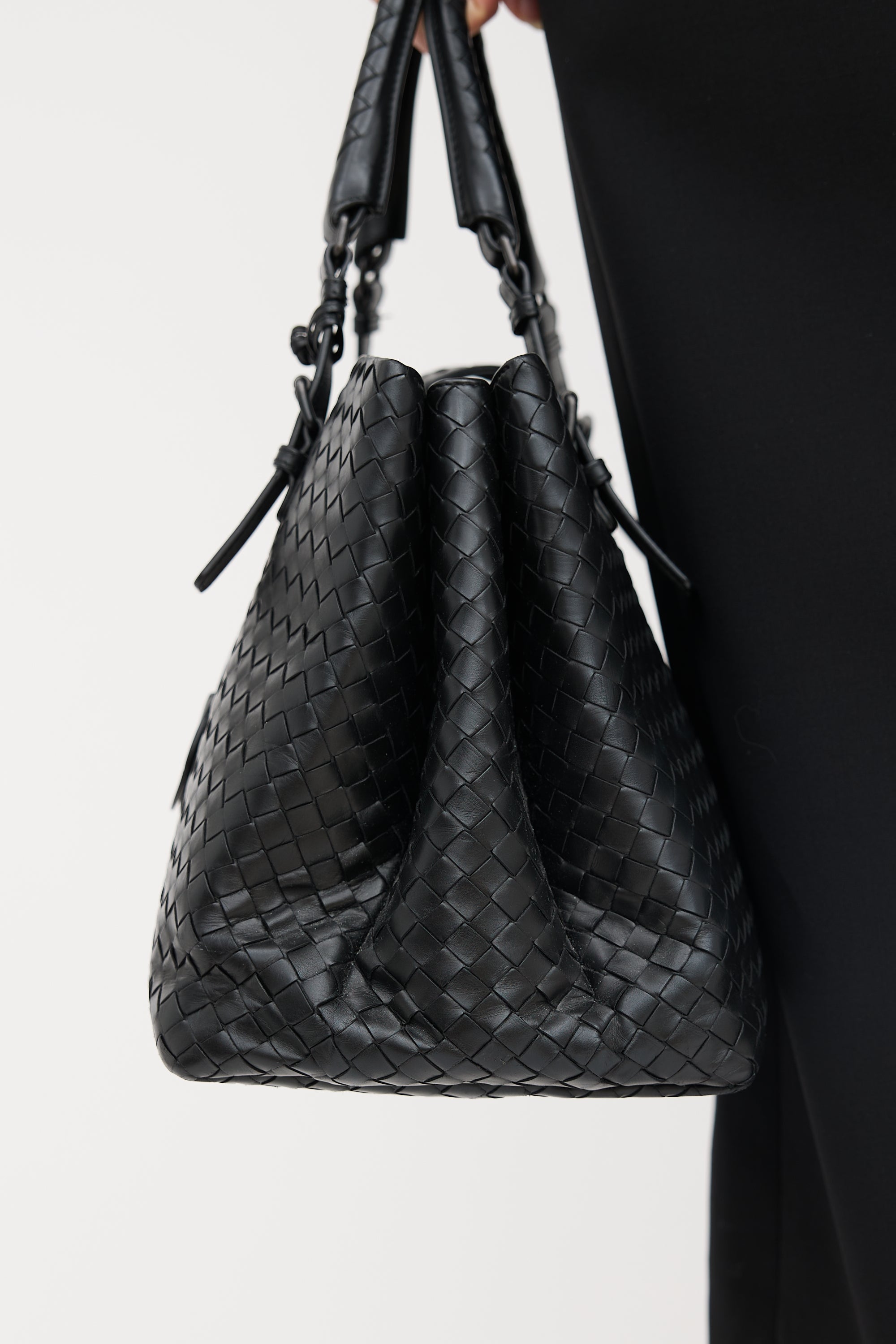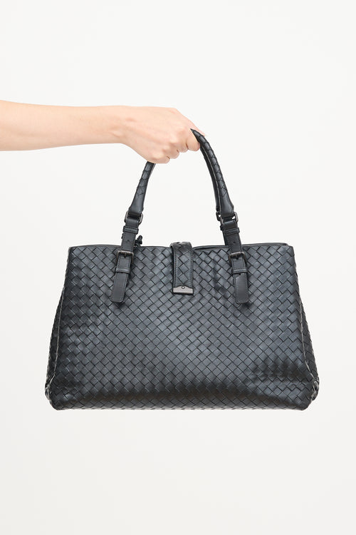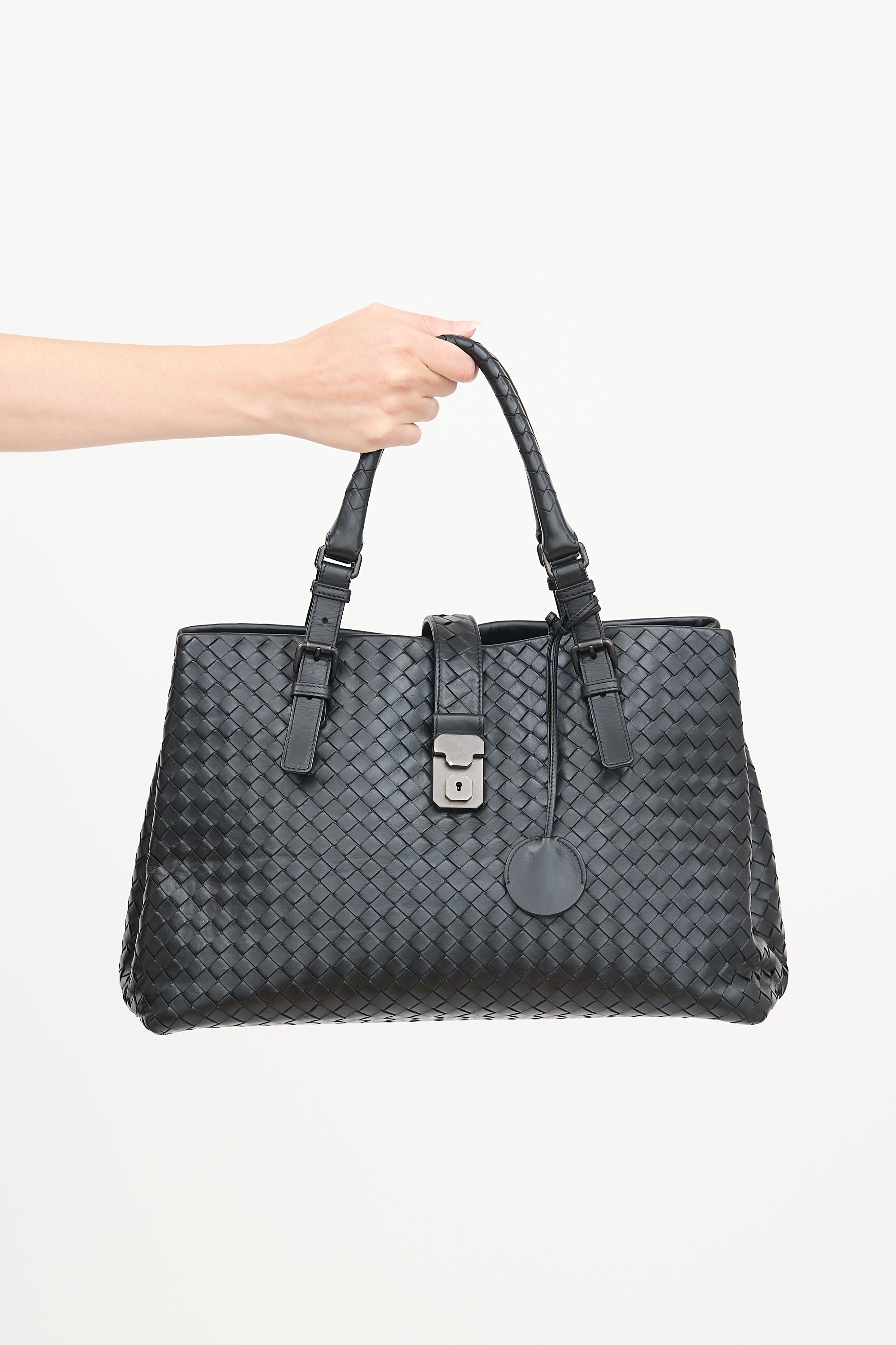Pre-owned Bottega Veneta black Roma bag featuring signature Intrecciato woven leather, gunmetal hardware, dual rolled top handles, key clochette at handle, front slide clasp closure, three lined main compartments, snap button closure at middle compartment, and interior zip pocket.