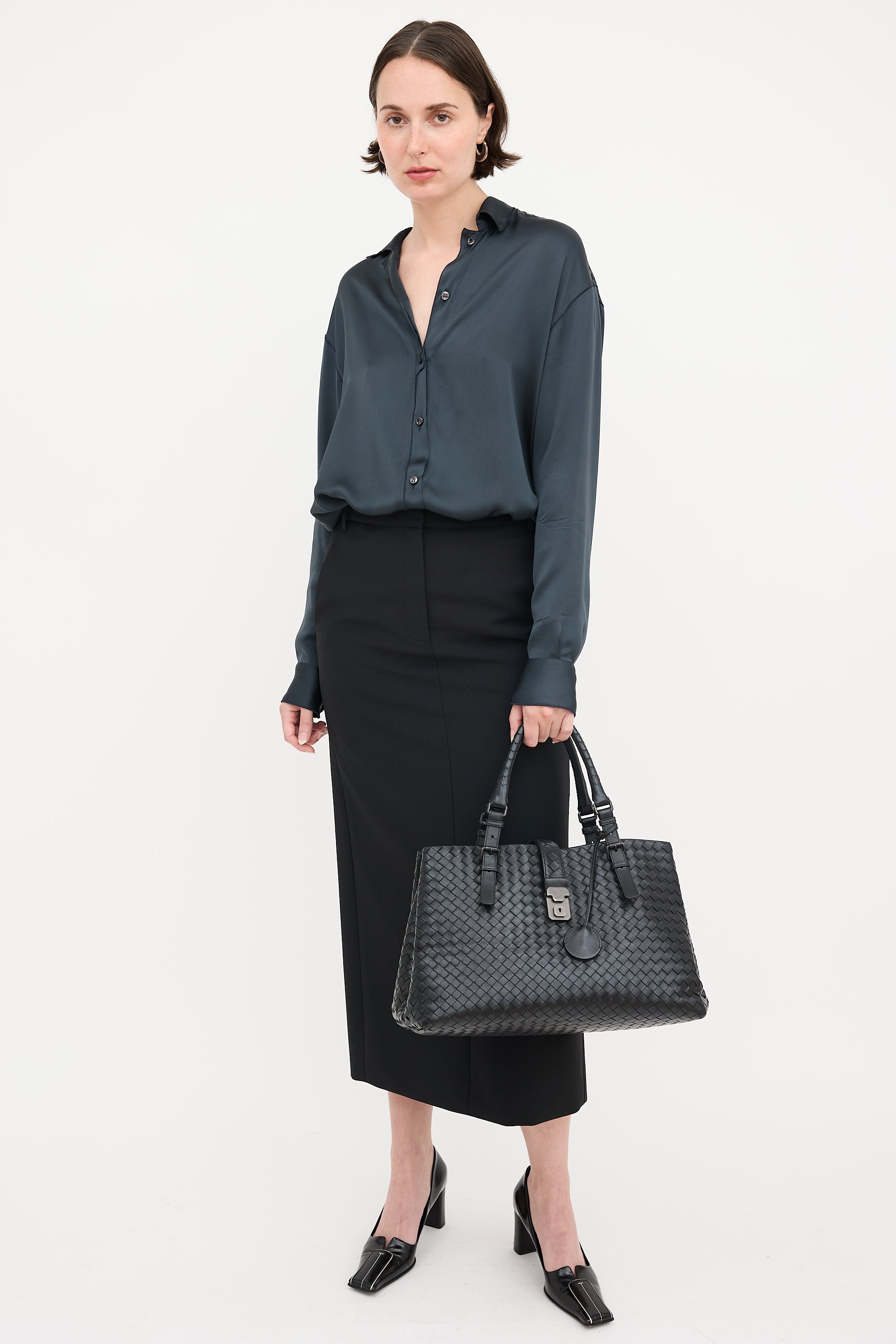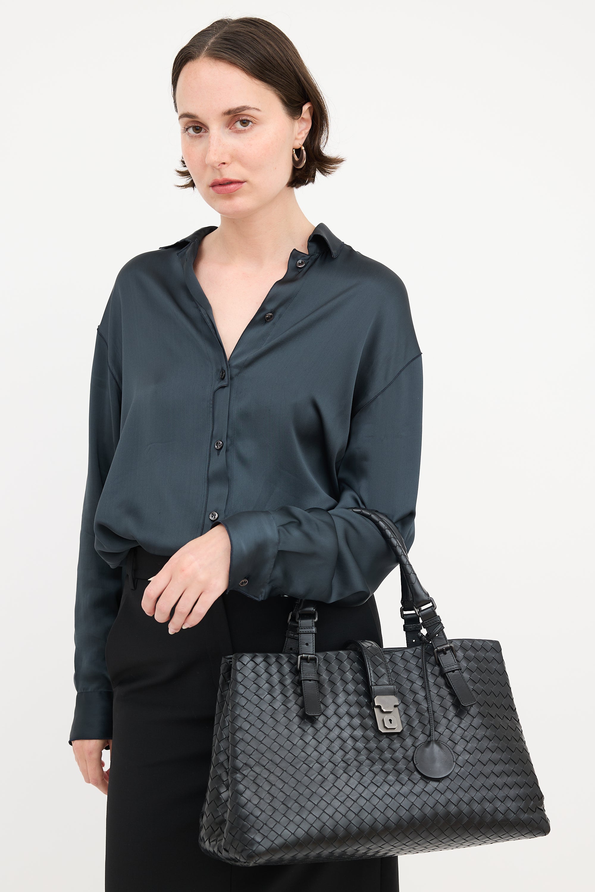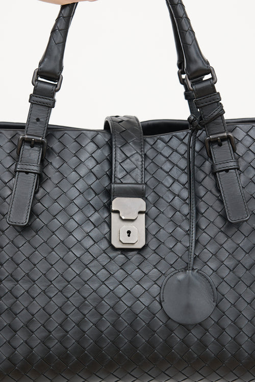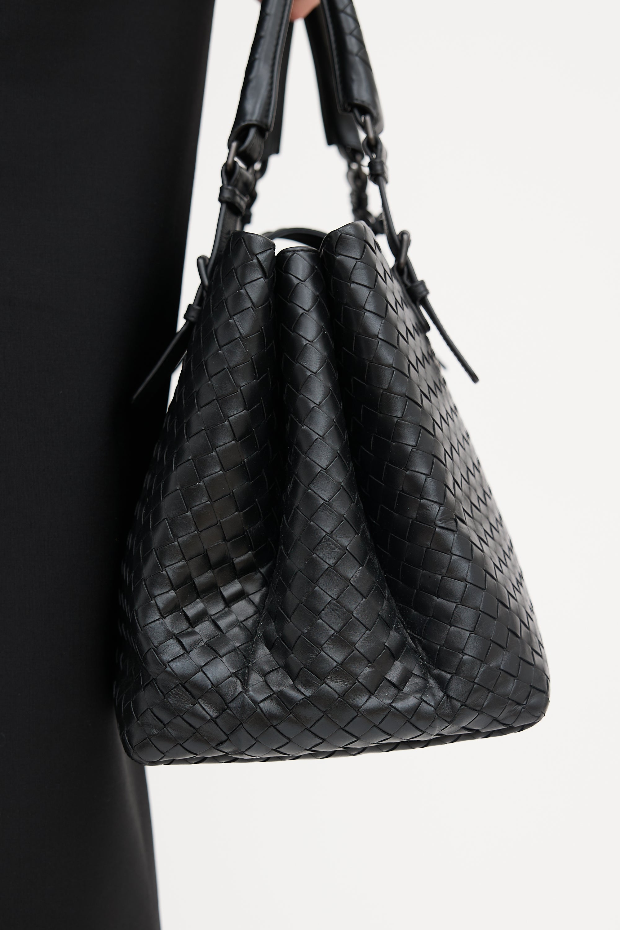 Pre-owned Bottega Veneta black Roma bag featuring signature Intrecciato woven leather, gunmetal hardware, dual rolled top handles, key clochette at handle, front slide clasp closure, three lined main compartments, snap button closure at middle compartment, and interior zip pocket.