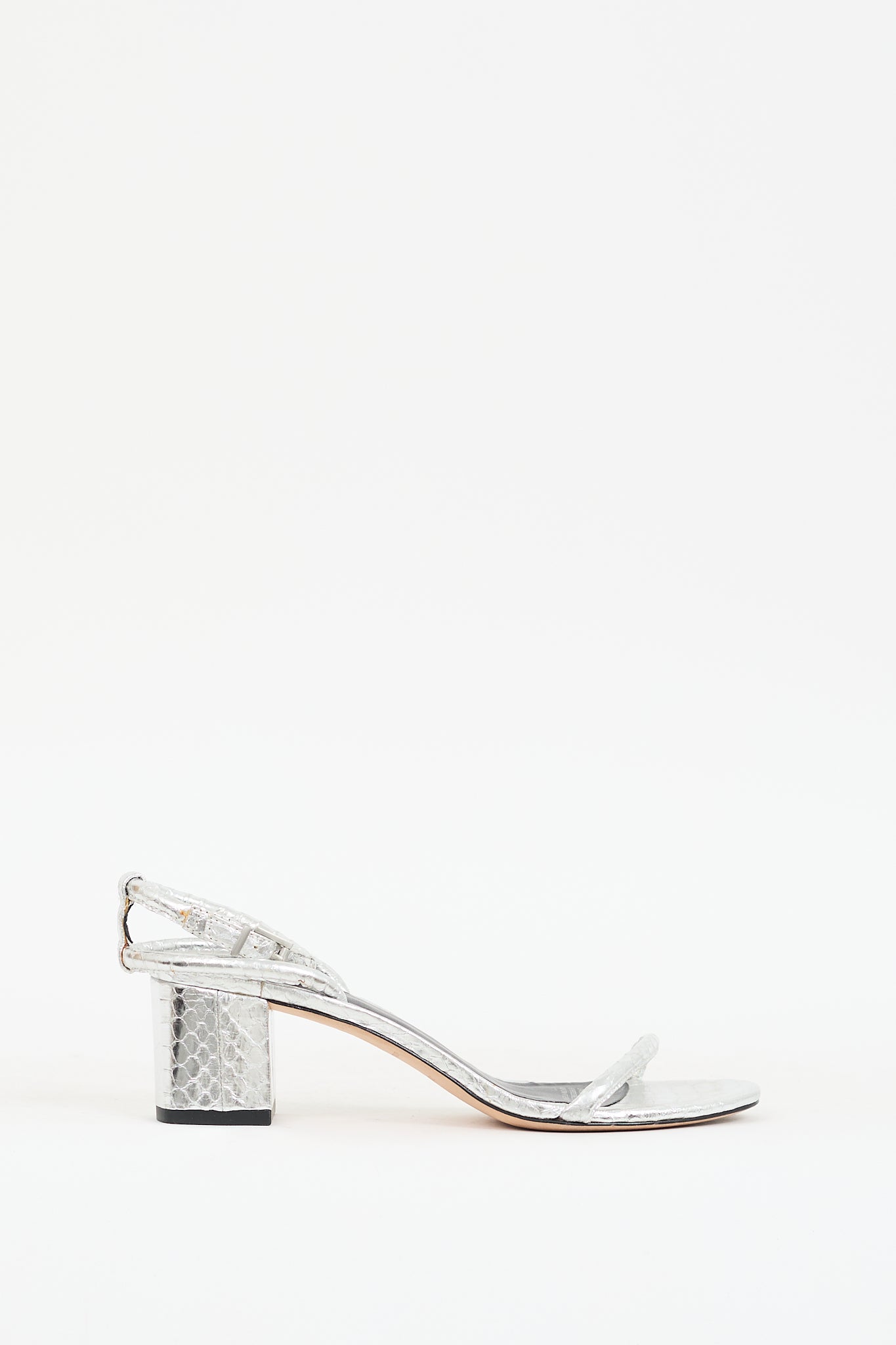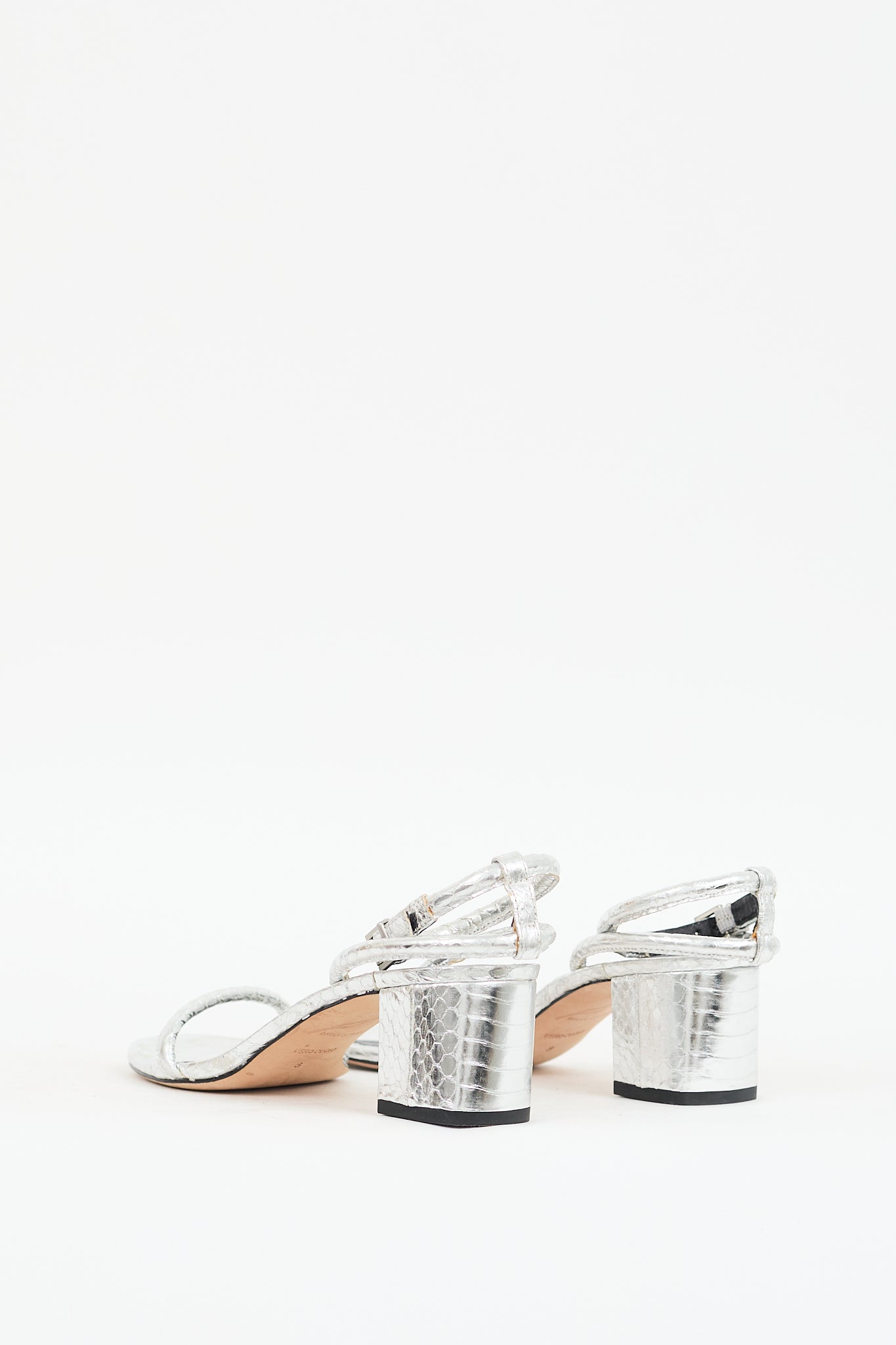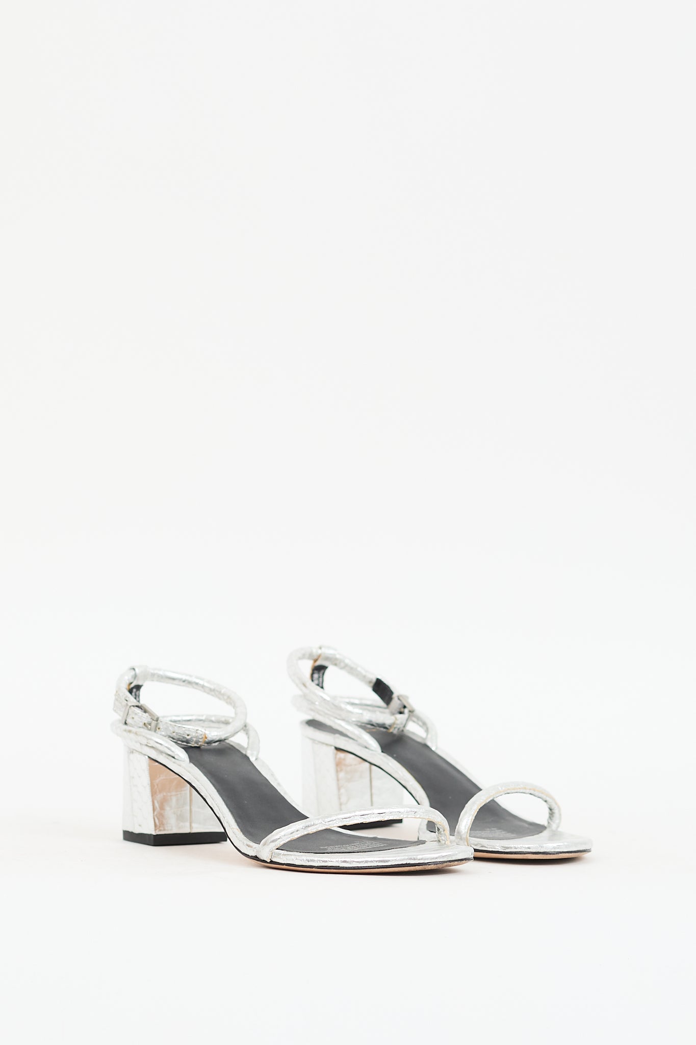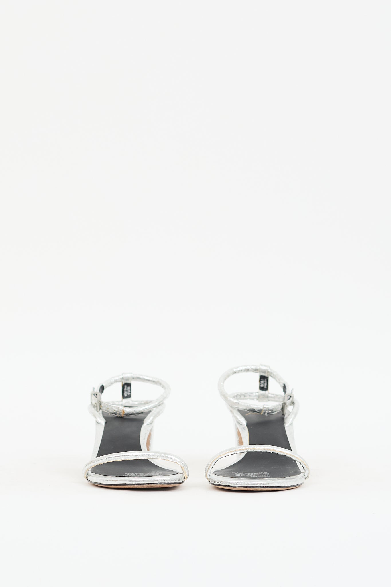 Pre-owned Brian Atwood silver tone sandals featuring an open rounded toe, strap across vamp, adjustable ankle strap, covered block heel, and leather insole and outsole.