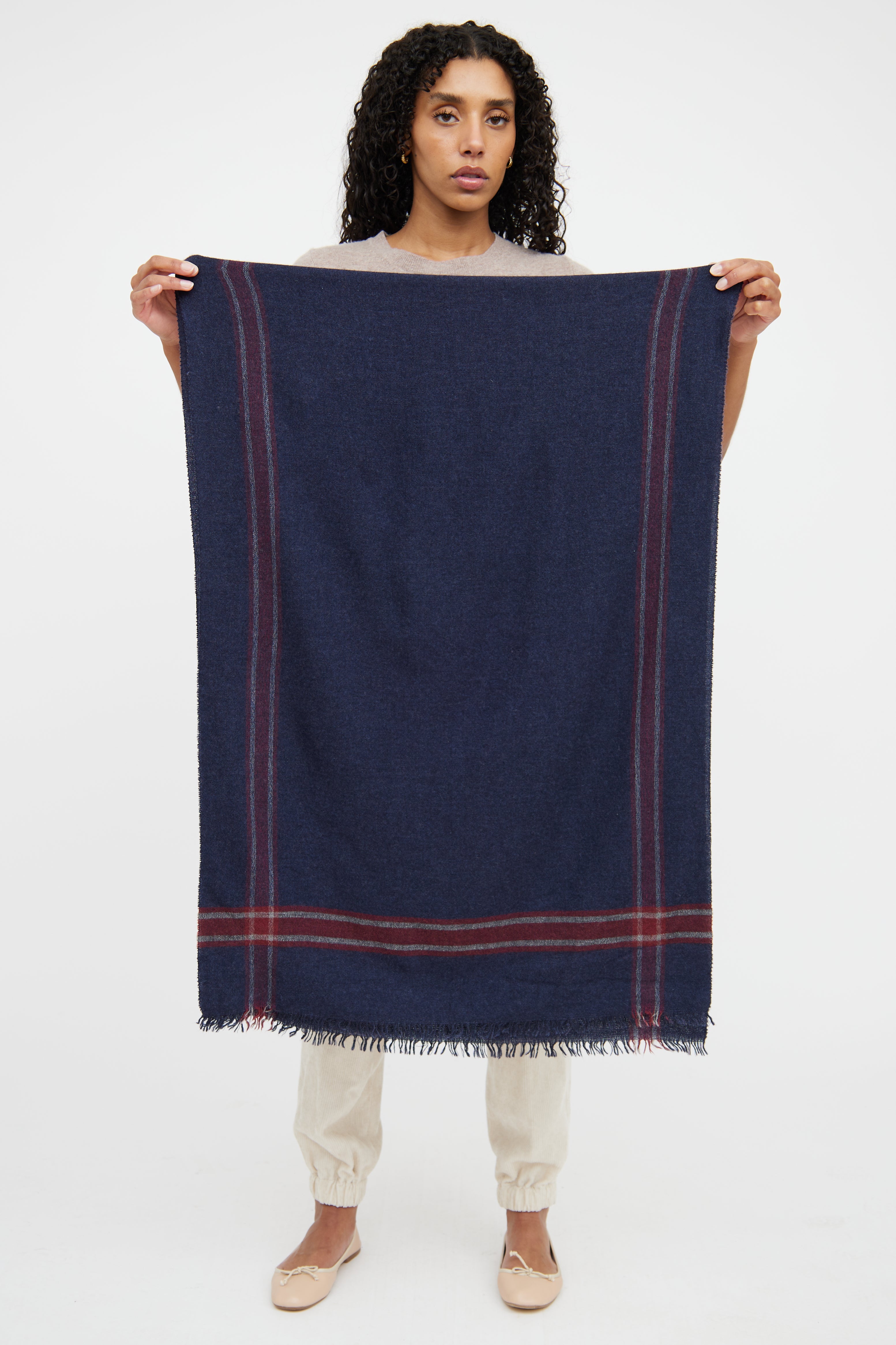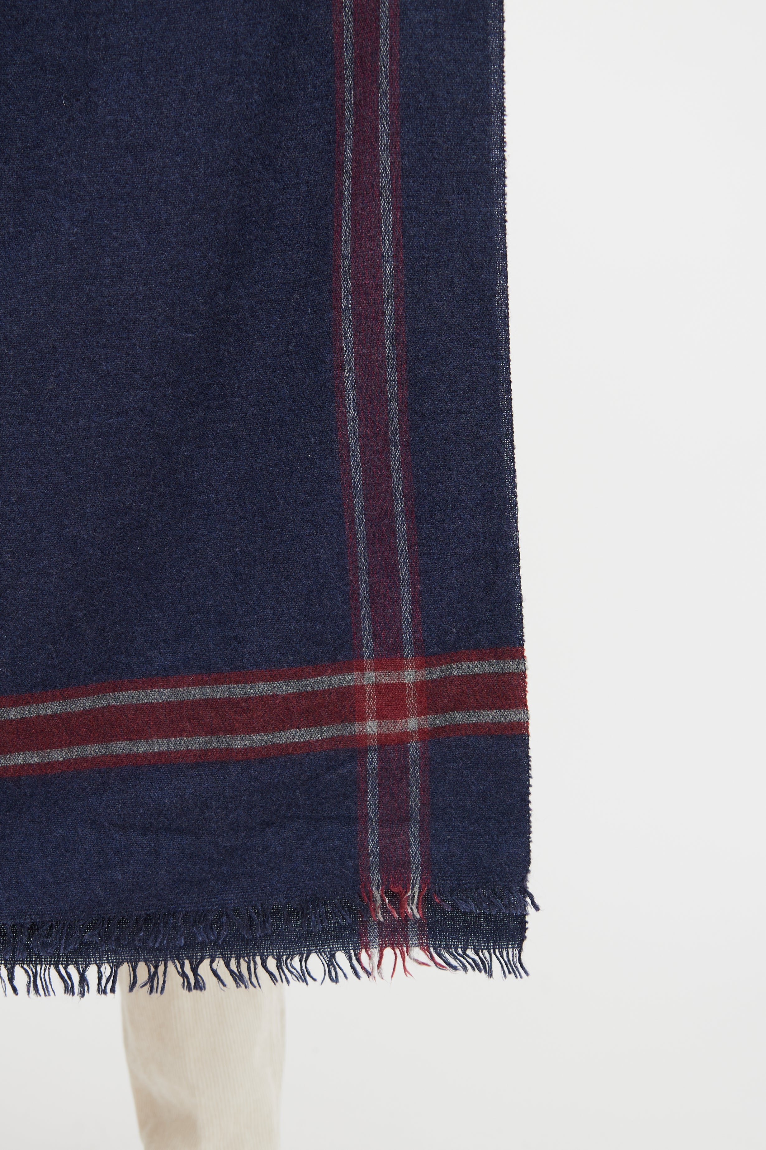 Pre-owned Brunello Cucinelli blue and red plaid cashmere scarf featuring finished edges, plaid detailing throughout, and fringe detailing at ends.