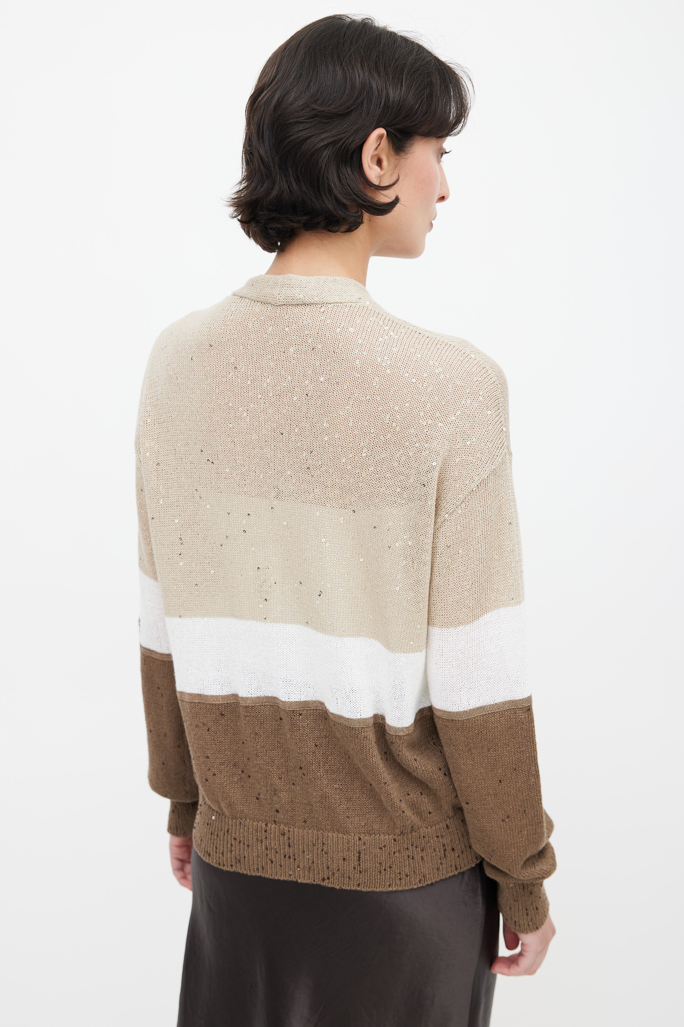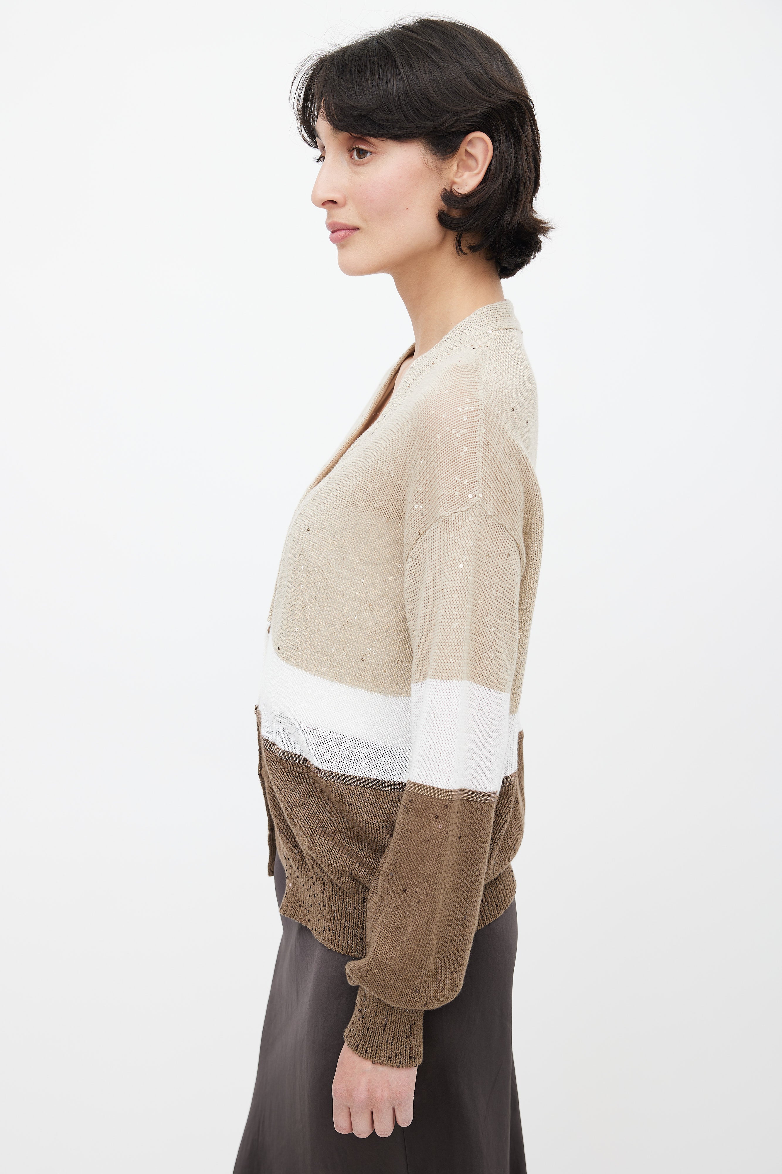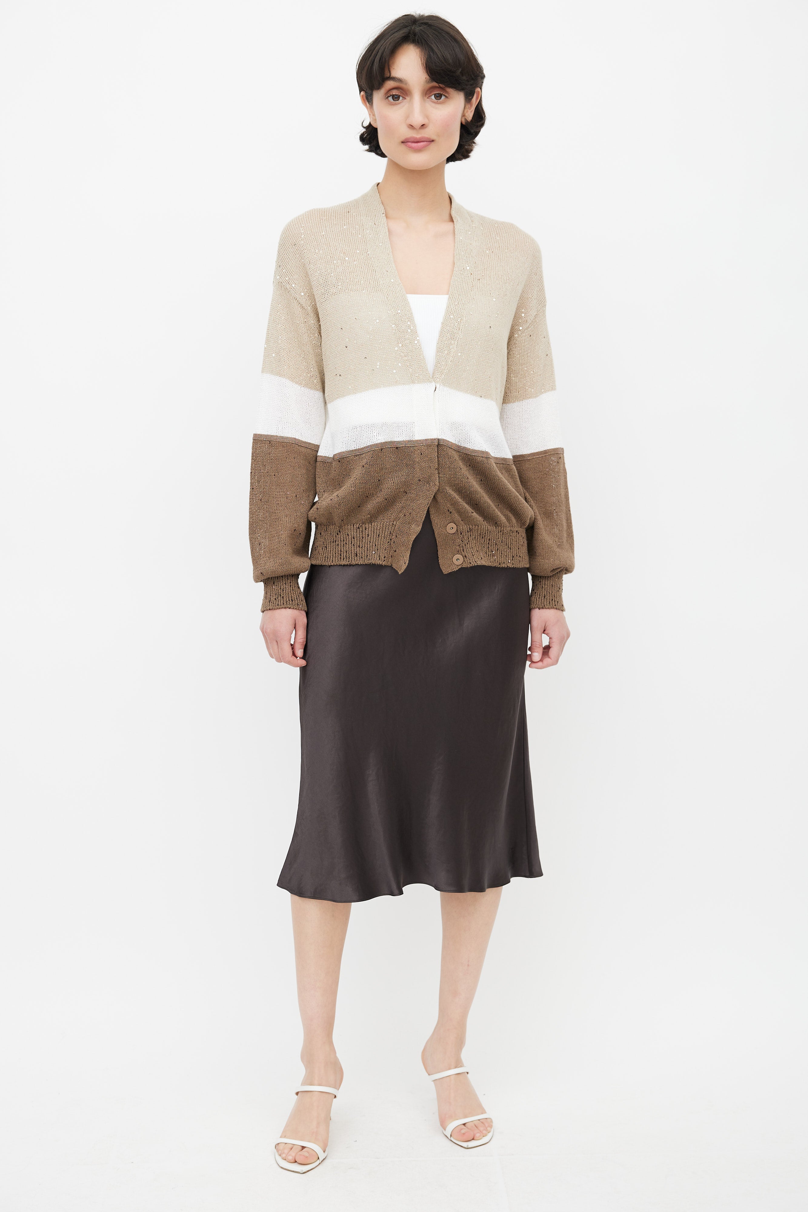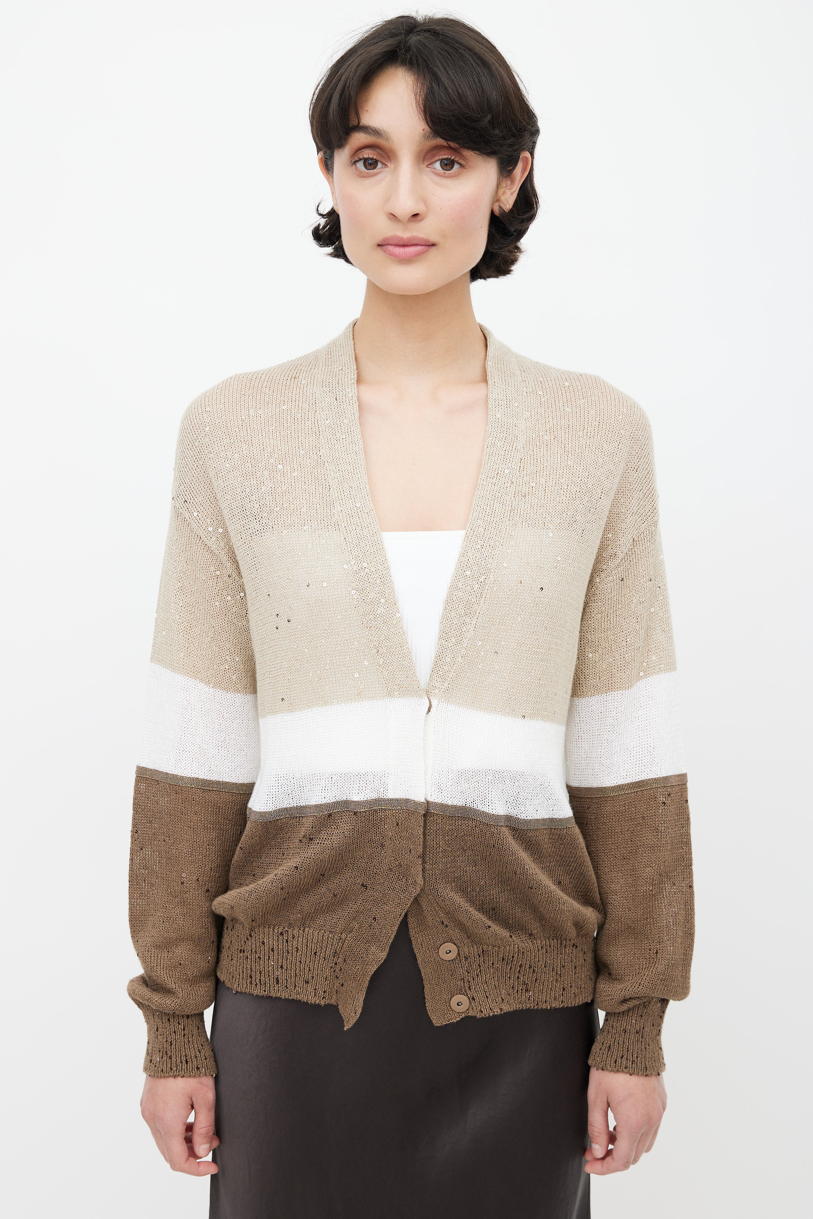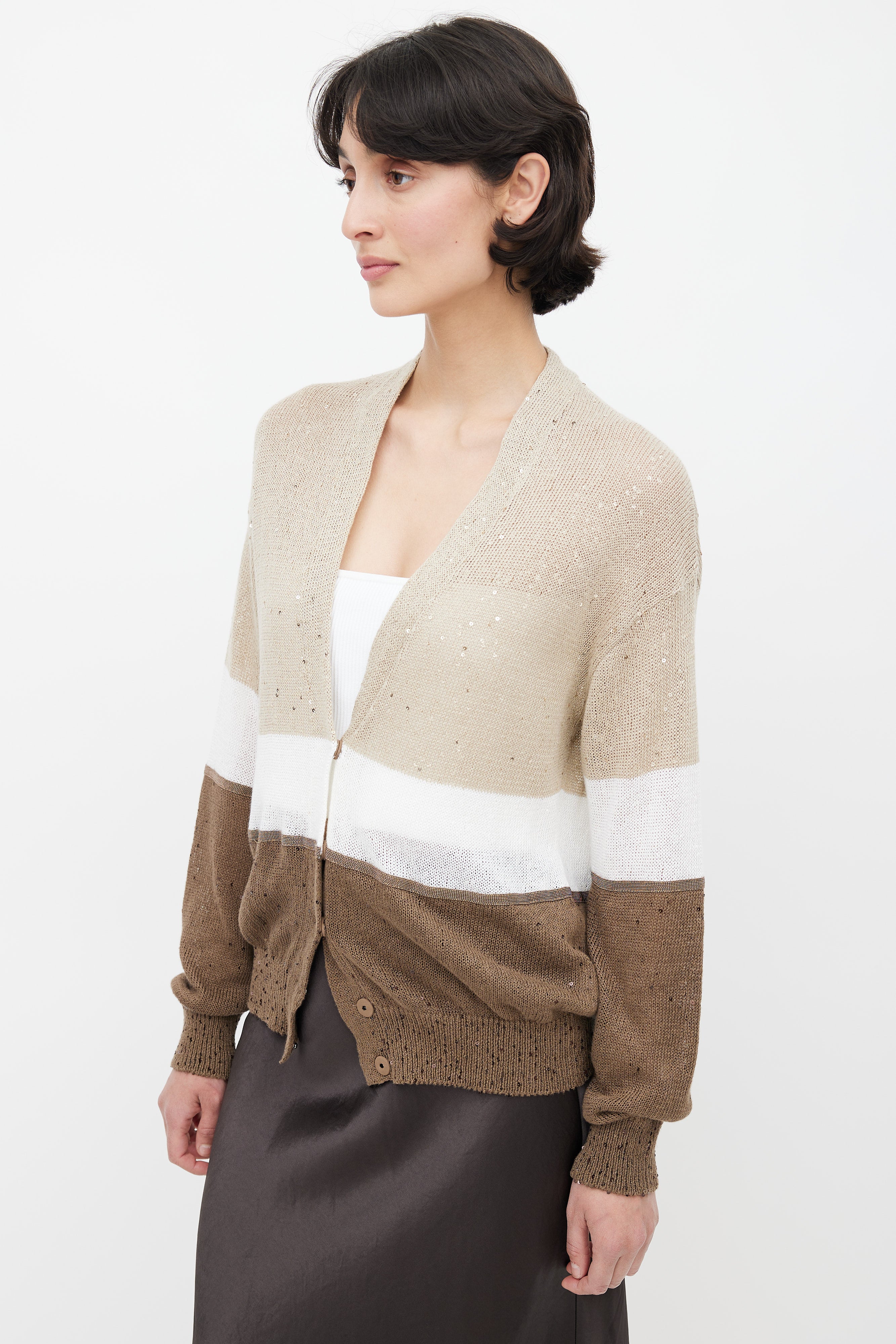 Pre-owned Brunello Cucinelli brown cardigan featuring V-neckline, gold tone Monili bead stripes at waist, colourblock, button up front, and sequin embellishment throughout.