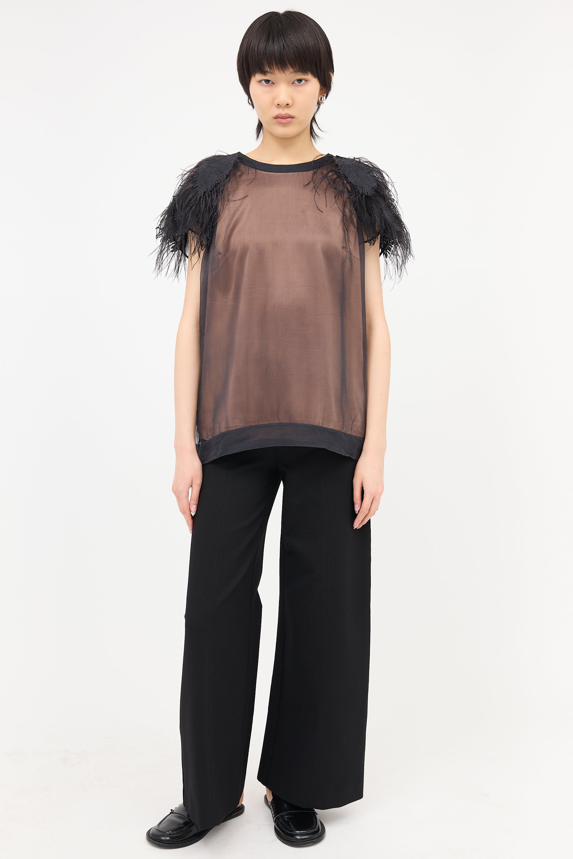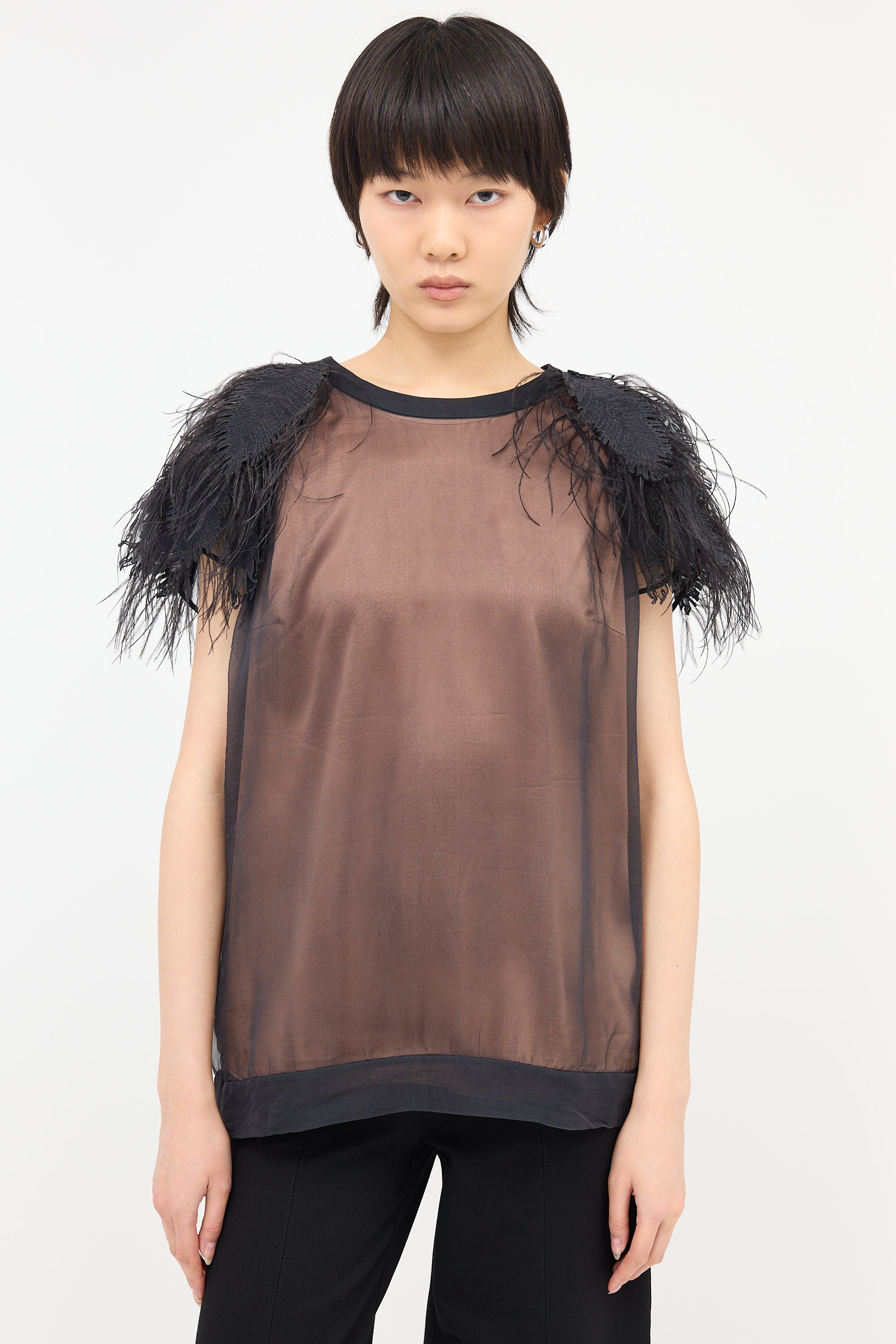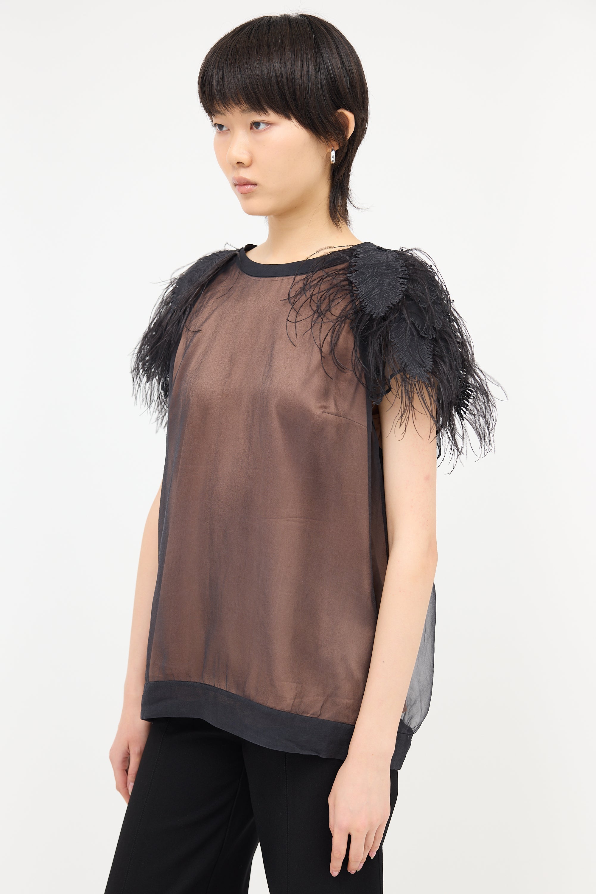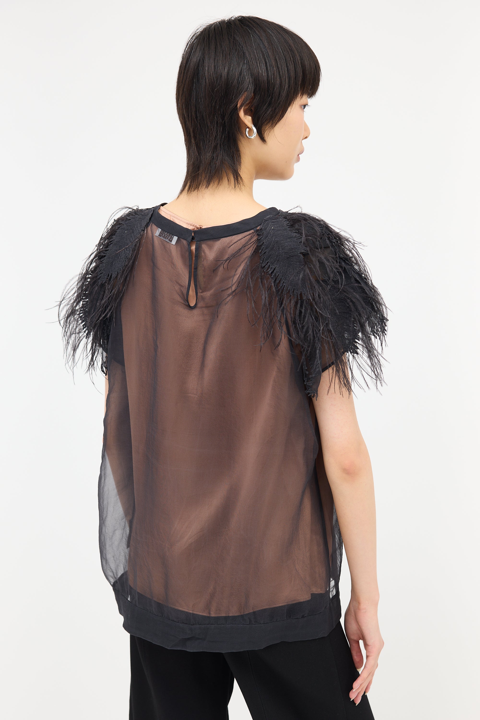 Pre-owned Brunello Cucinelli black silk chiffon blouse featuring a round neckline, feather applique at shoulder with ostrich feather detail, cap sleeves, beige silk lining, and keyhole back collar with button closure.