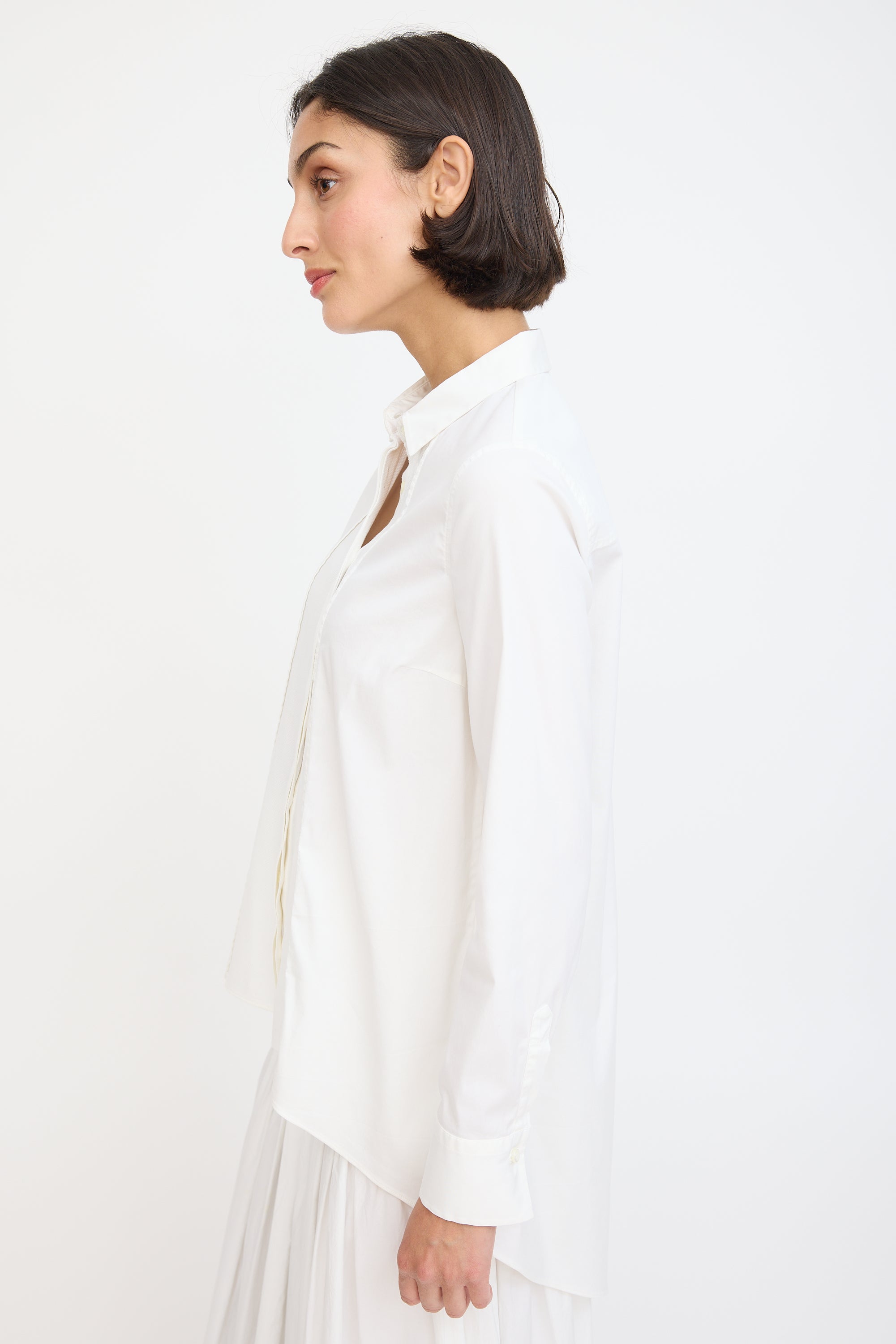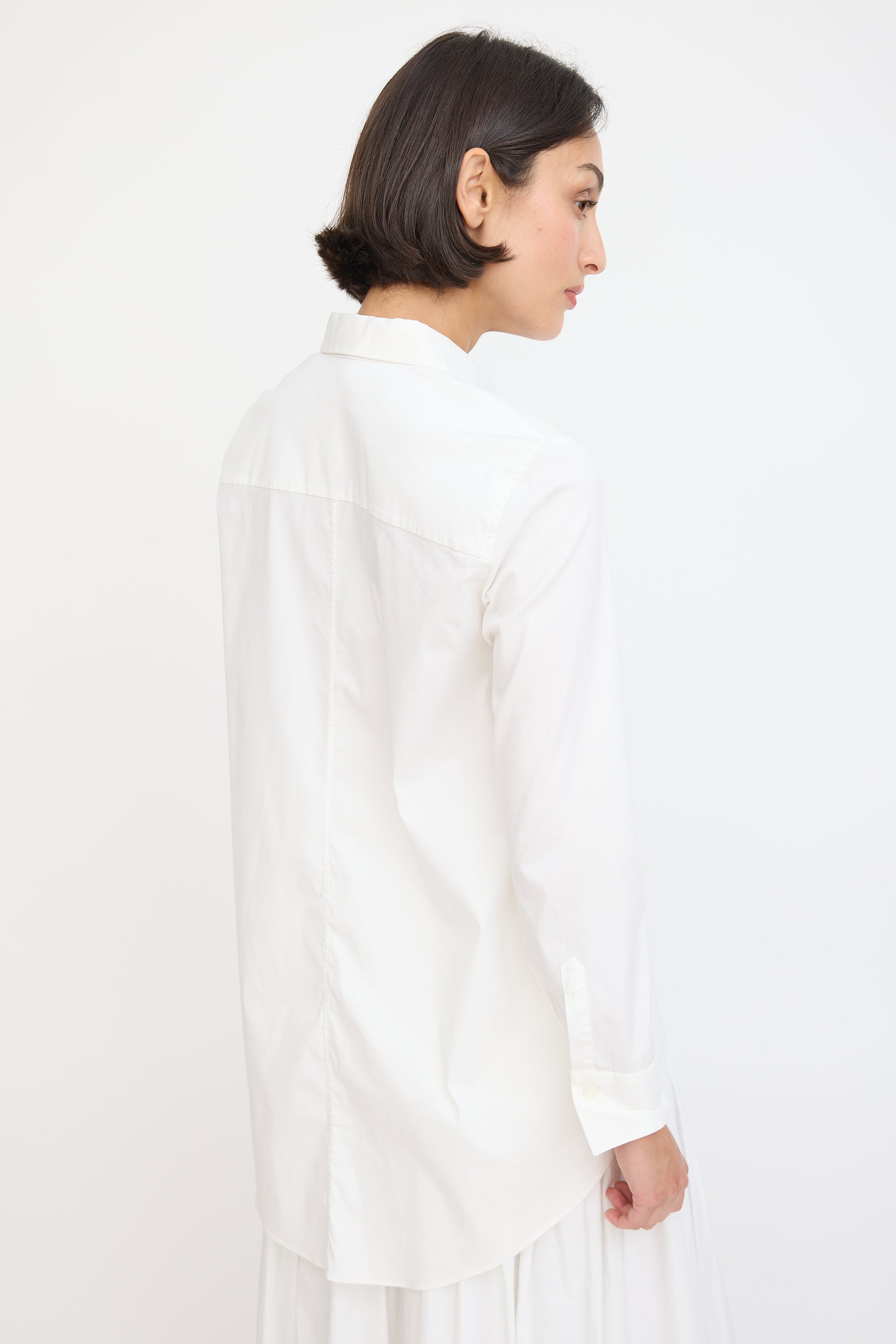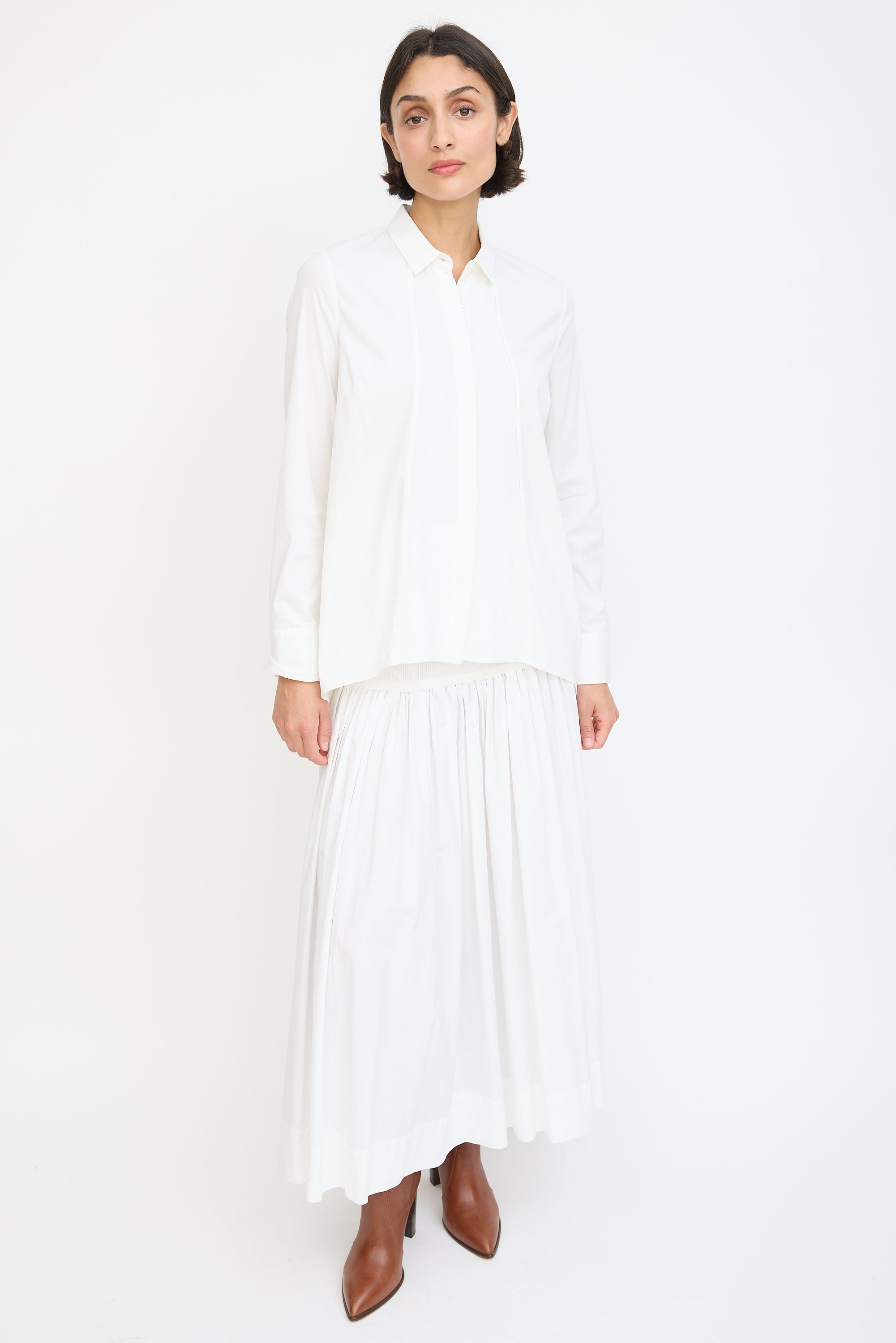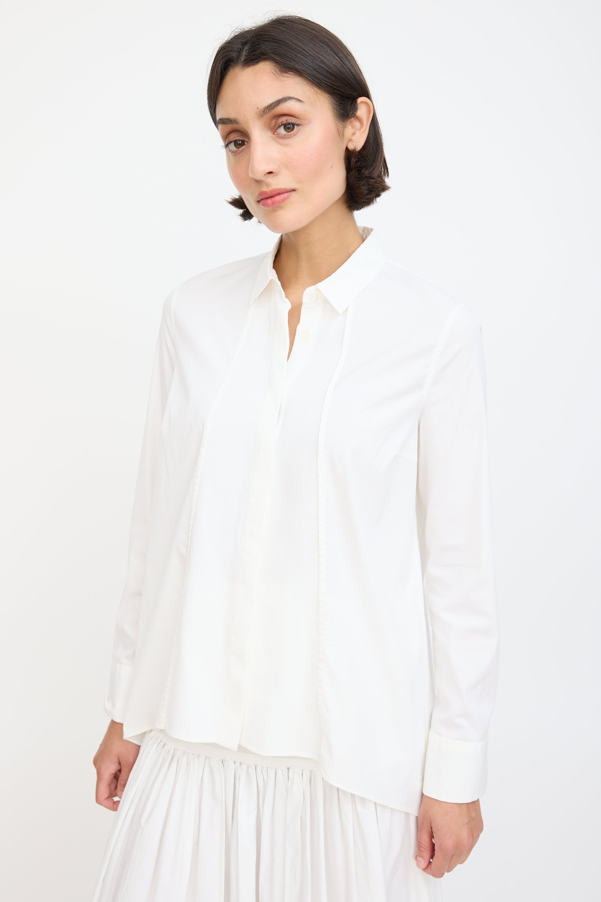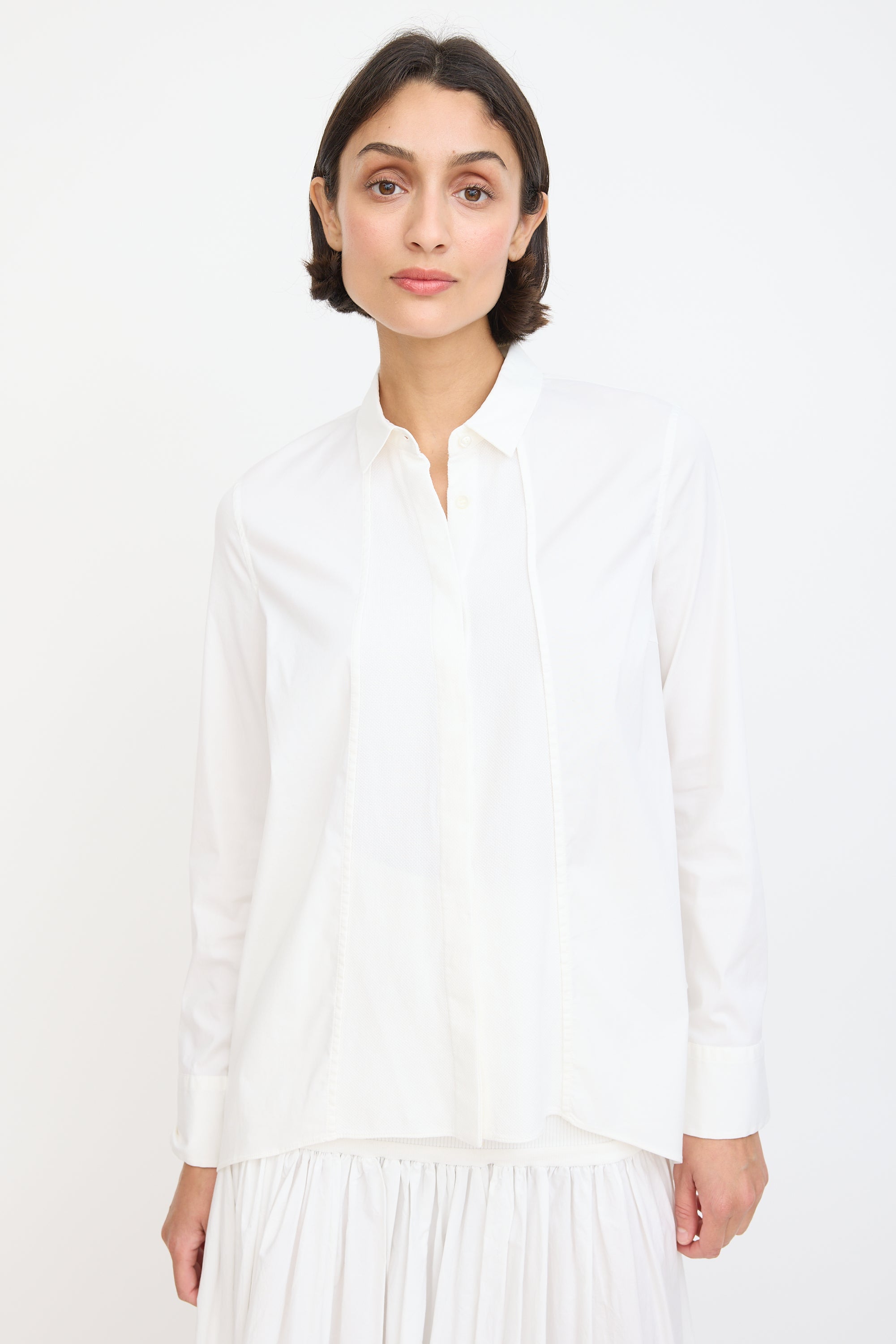 Pre-owned Brunello Cucinelli white shirt featuring a spread collar, panelled and concealed button up front, long sleeves with buttoned cuffs, and high low hem.