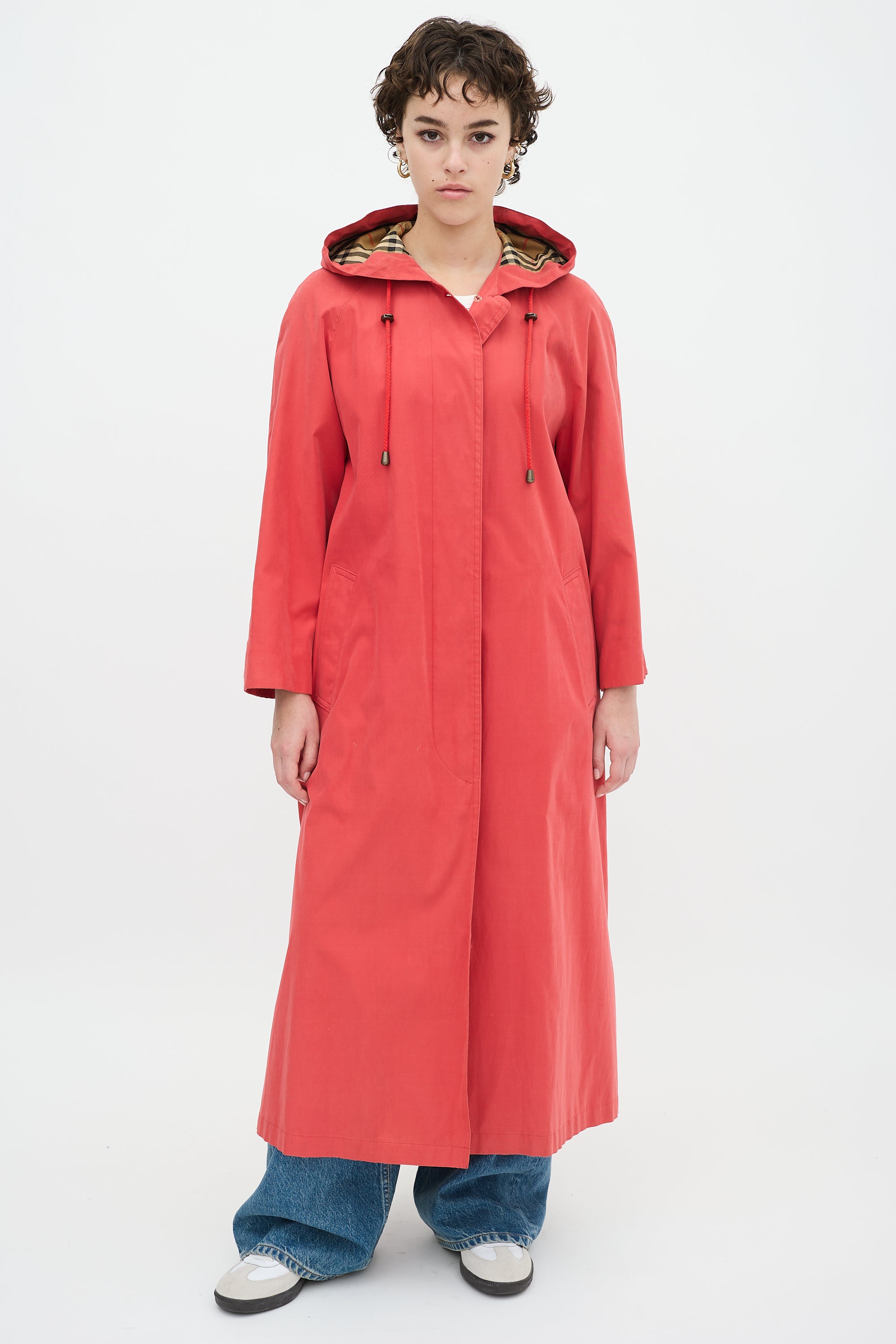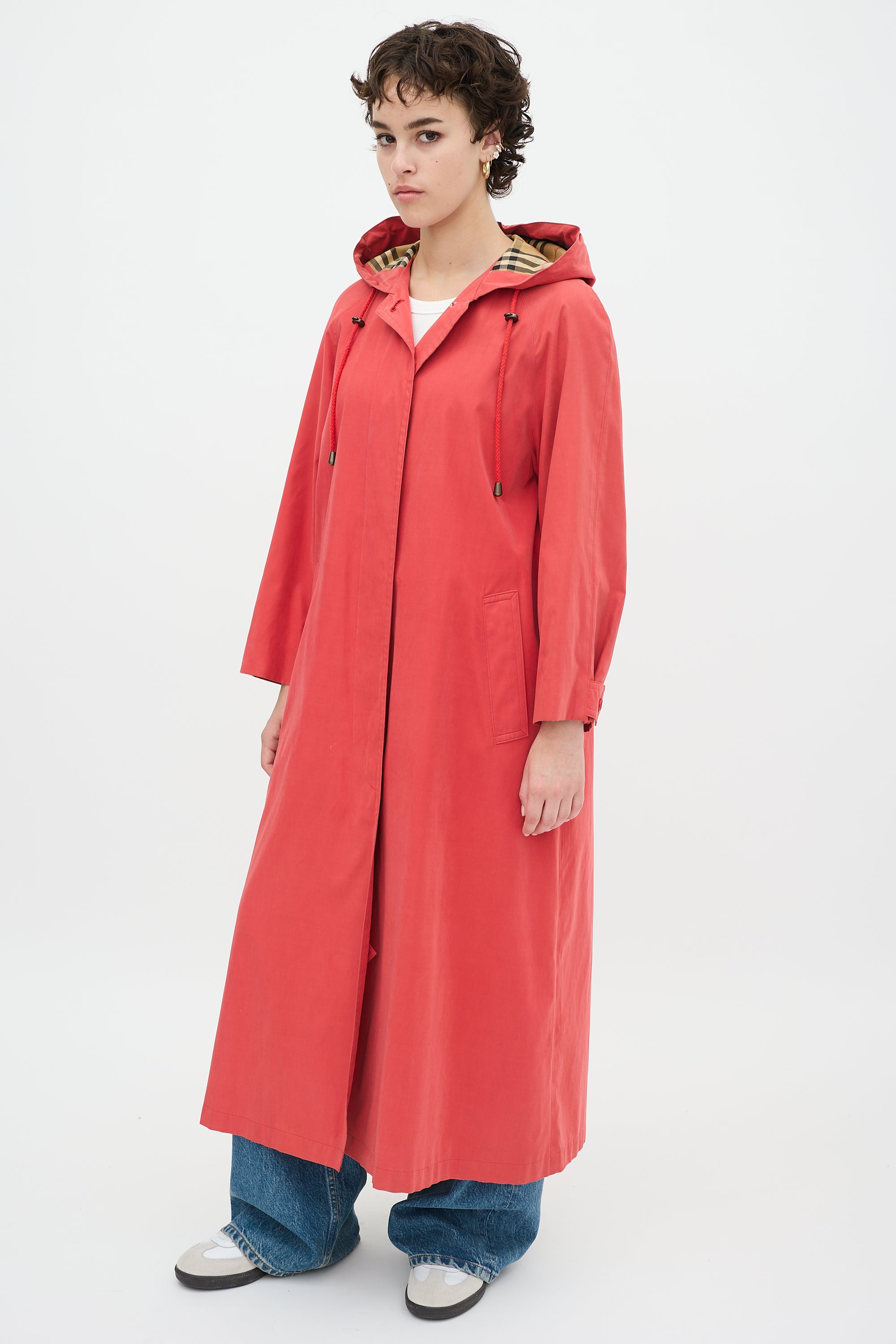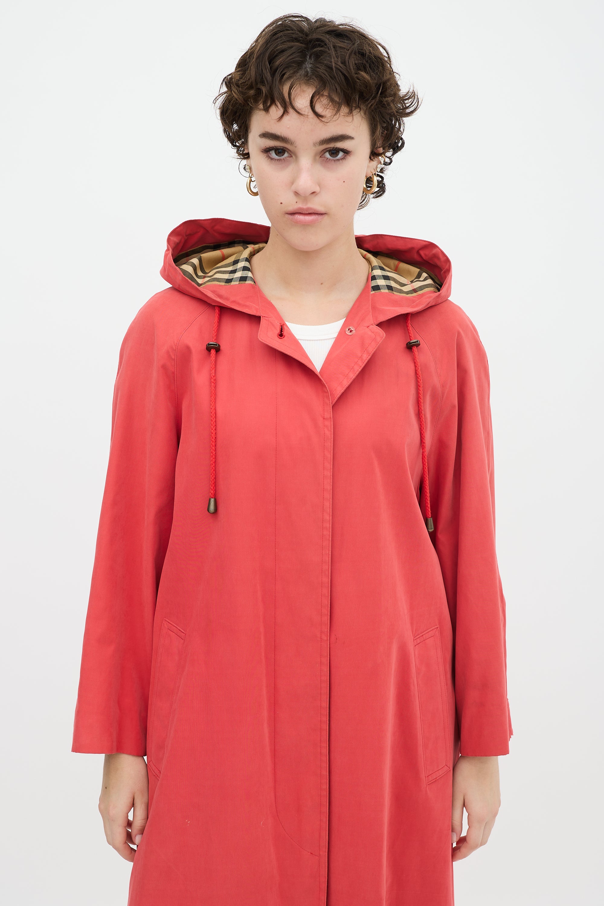 Pre-owned Burberry red nylon blend coat featuring with signature brown and multicolour Nova Check lining and toggled drawstring, concealed button up front, two front slip pockets, and long sleeves with buttoned strapped cuffs.