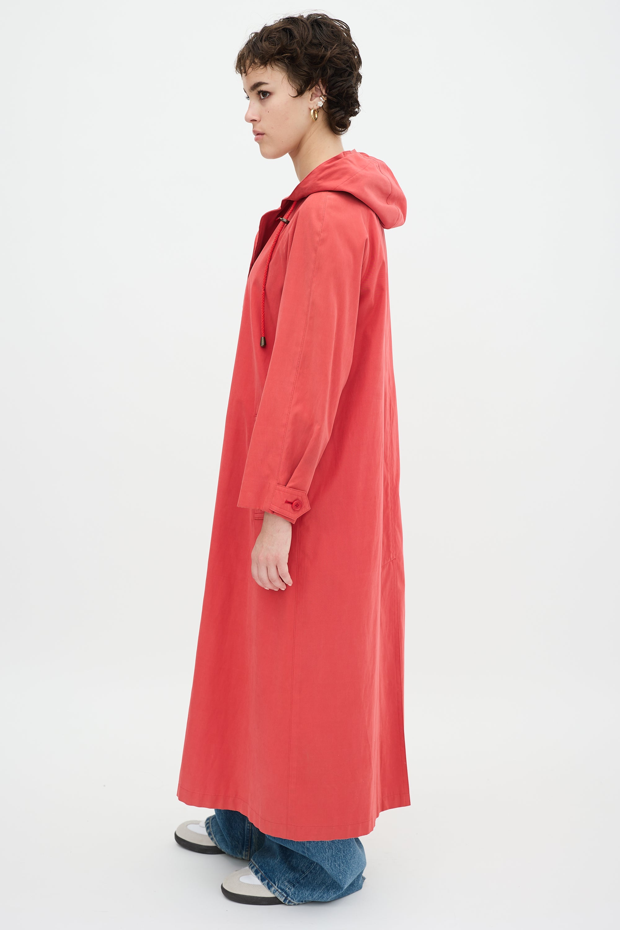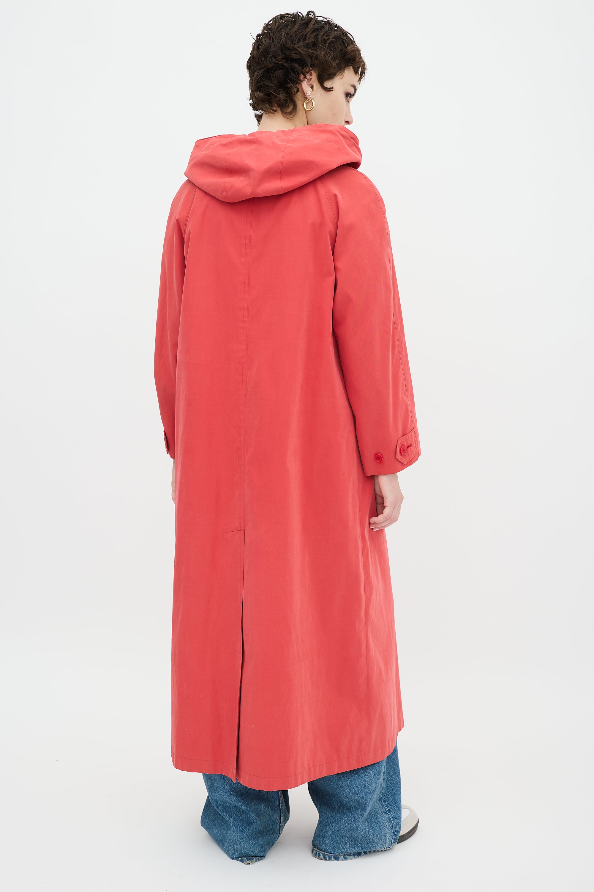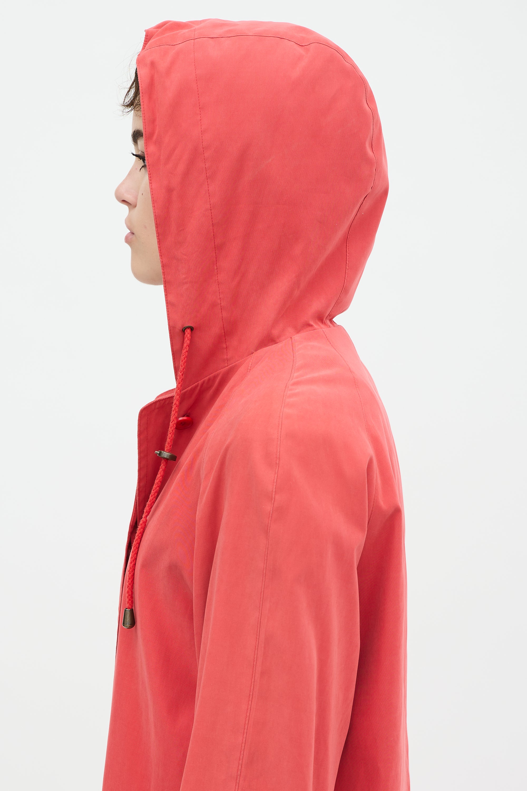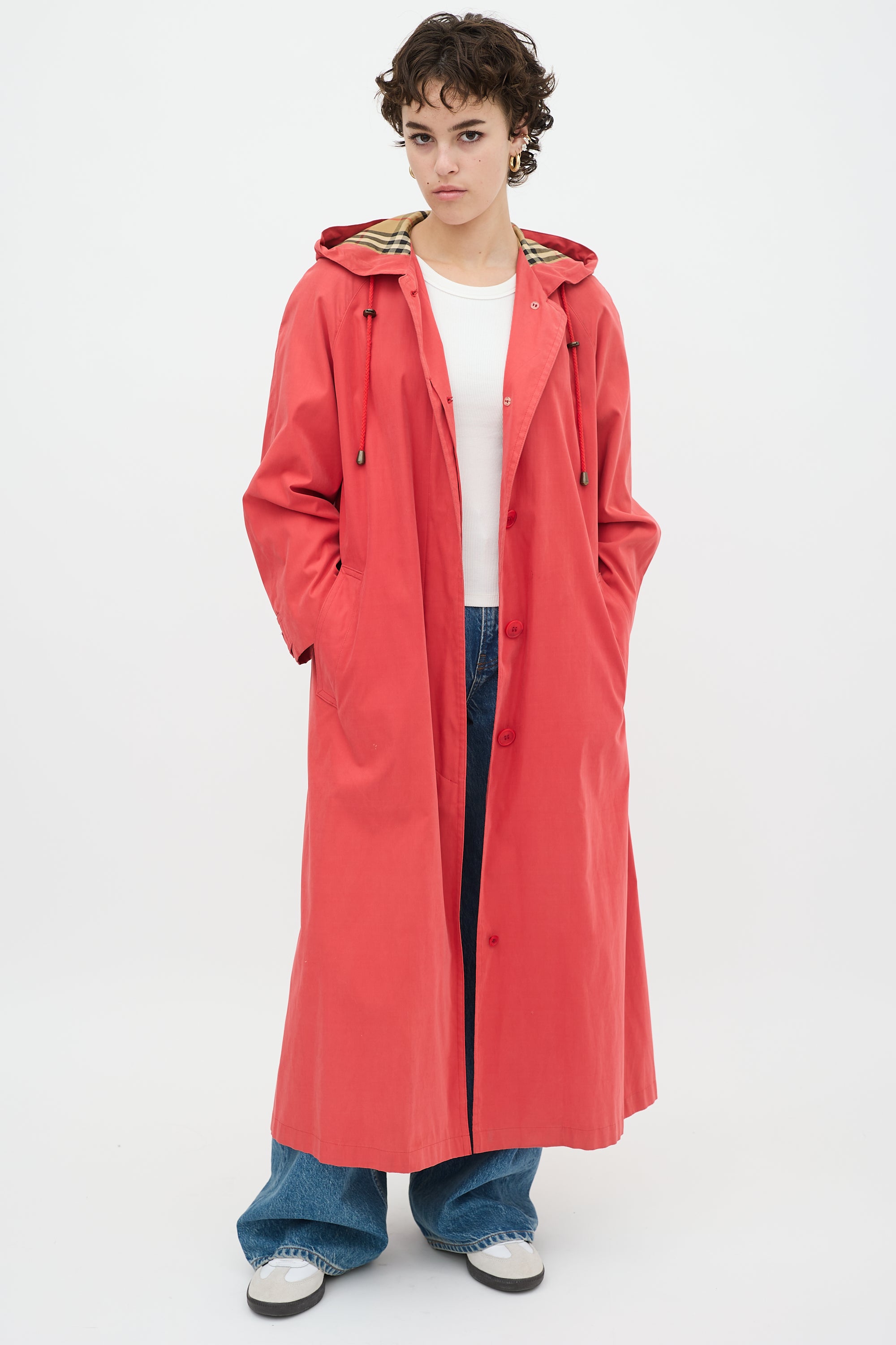 Pre-owned Burberry red nylon blend coat featuring with signature brown and multicolour Nova Check lining and toggled drawstring, concealed button up front, two front slip pockets, and long sleeves with buttoned strapped cuffs.