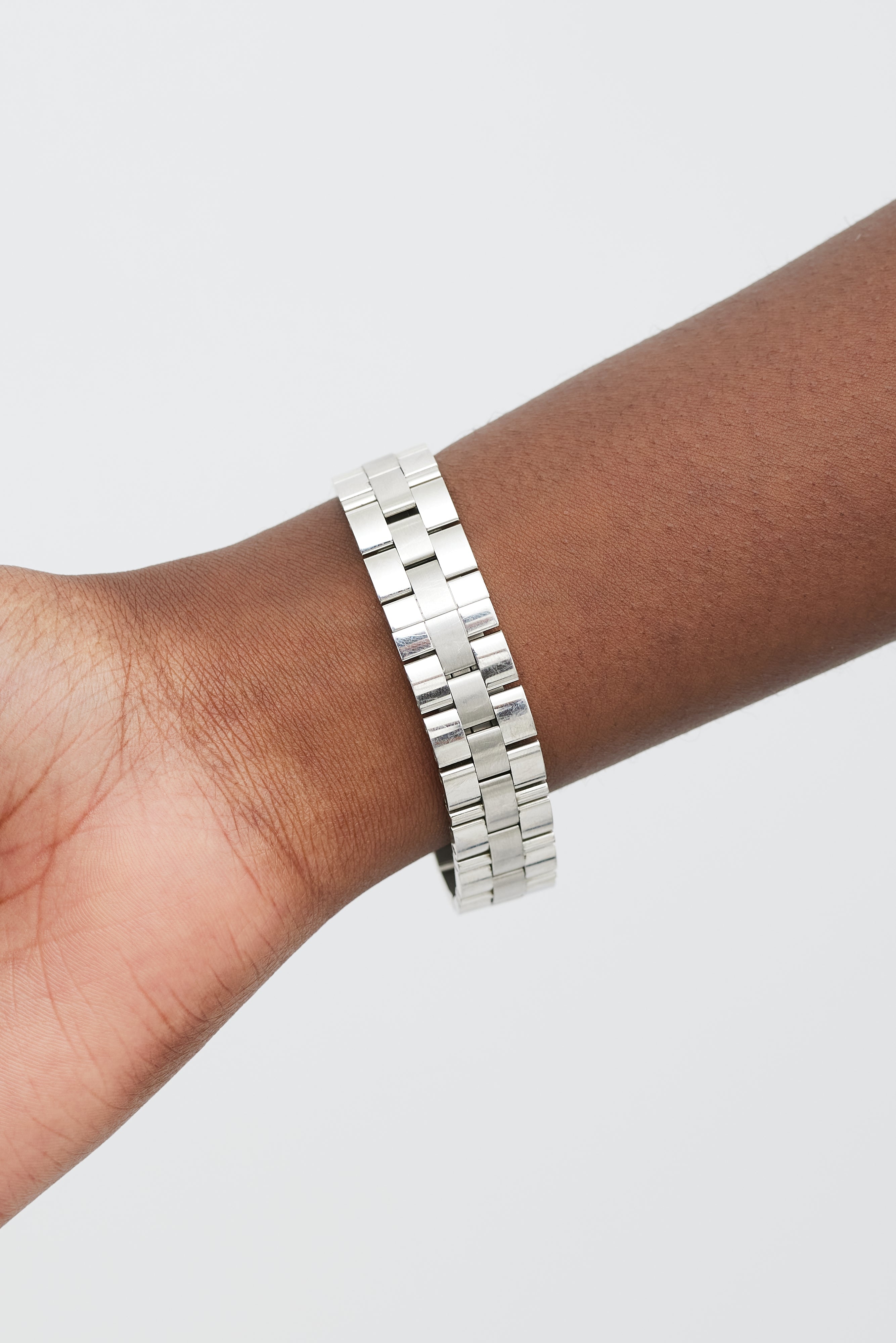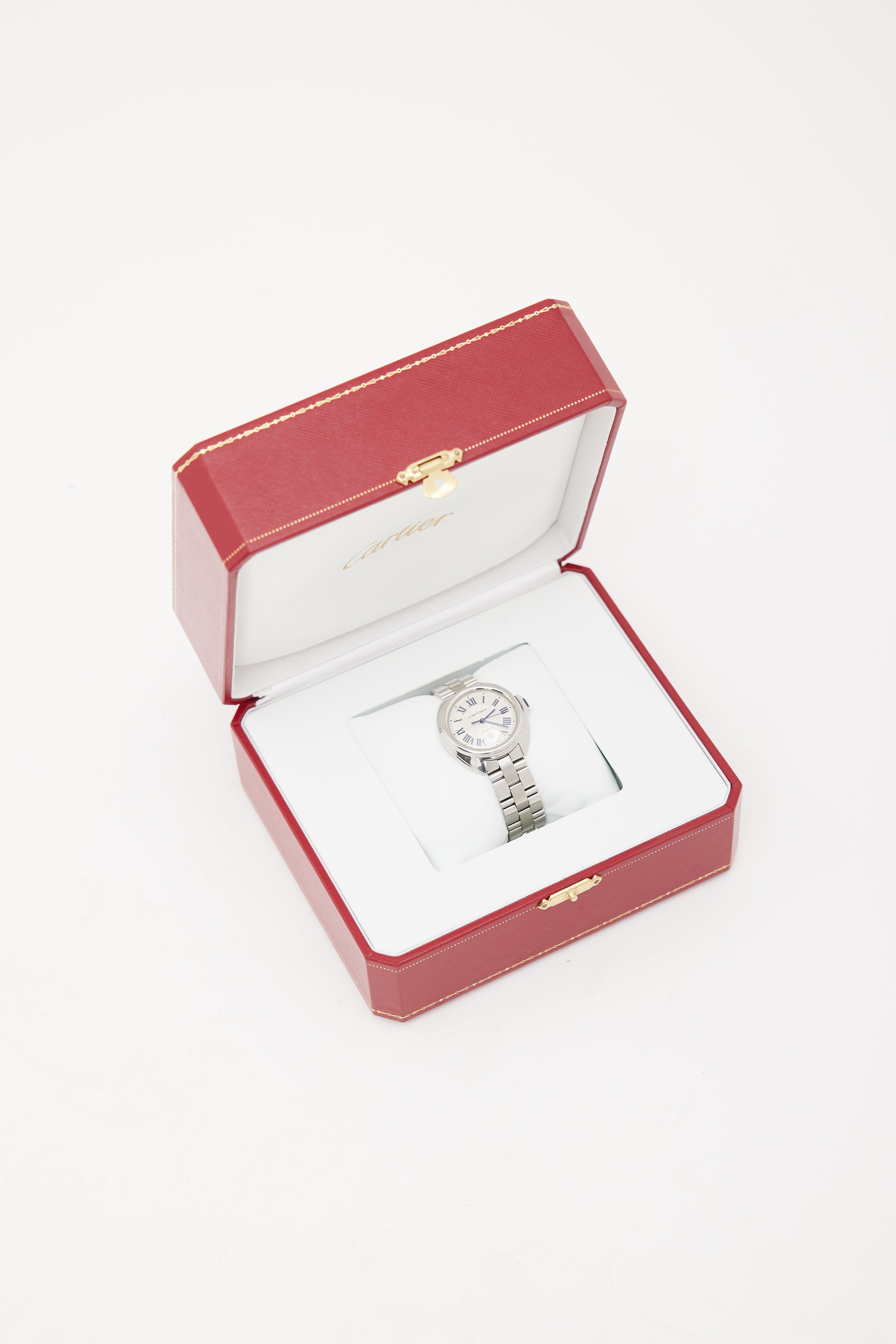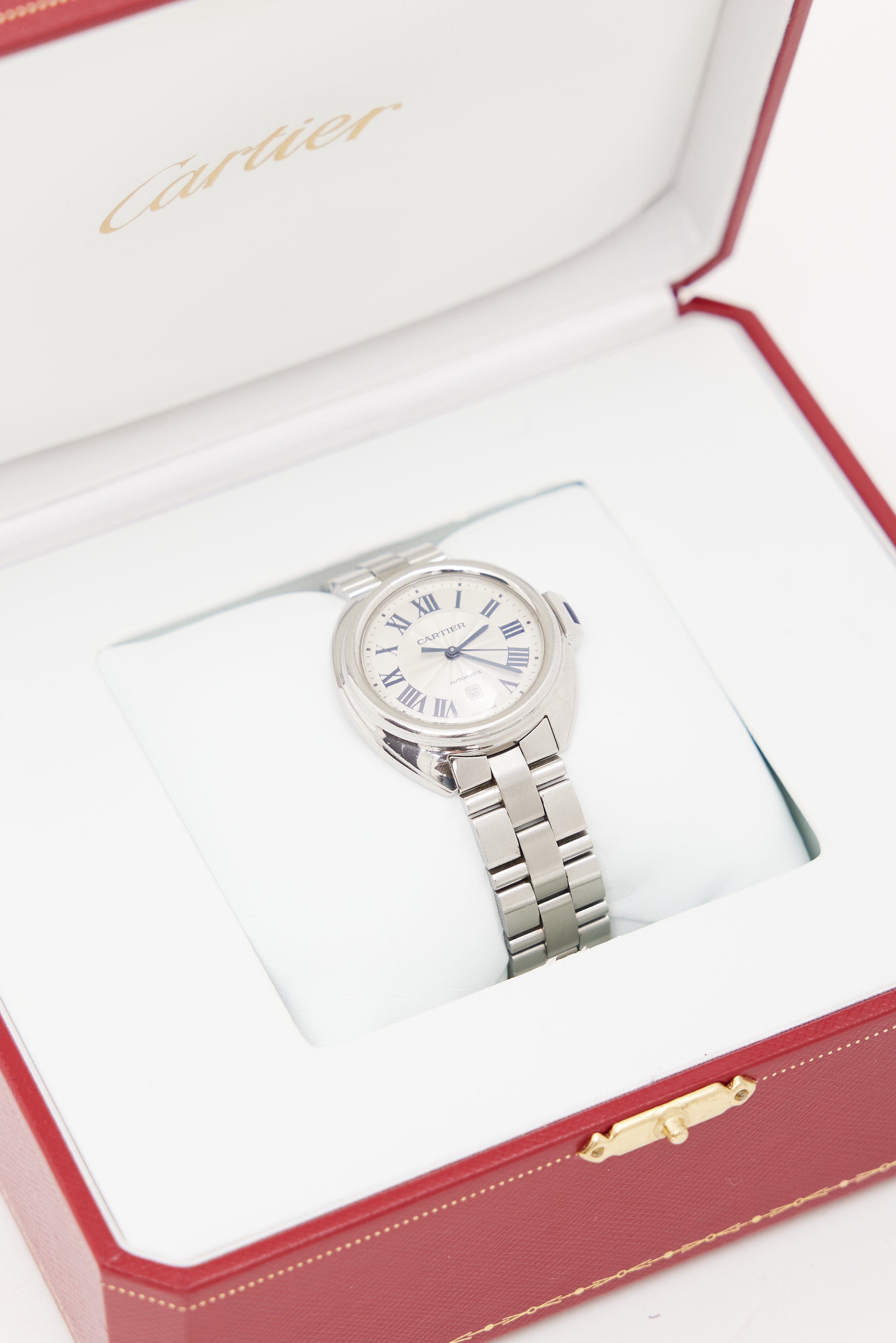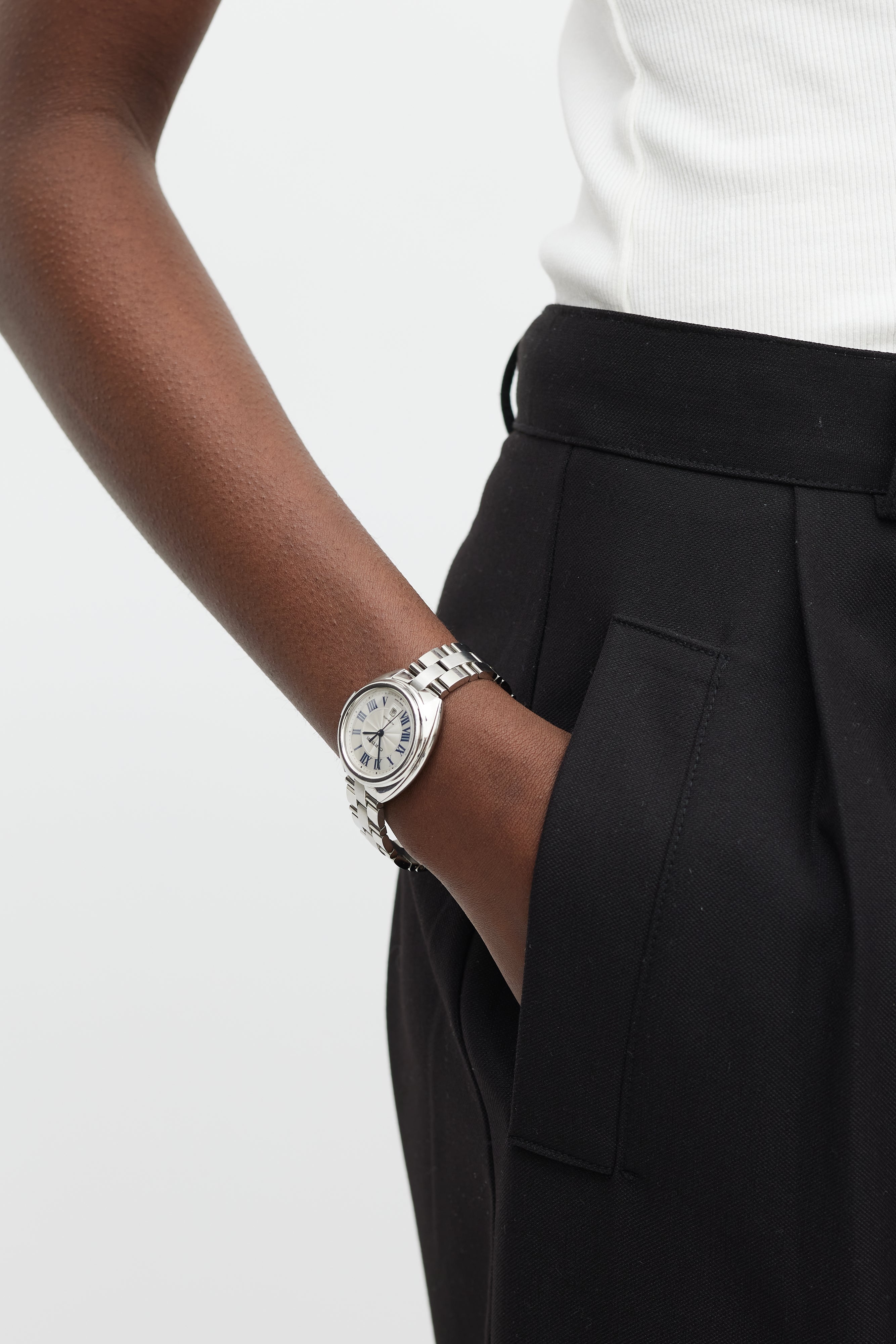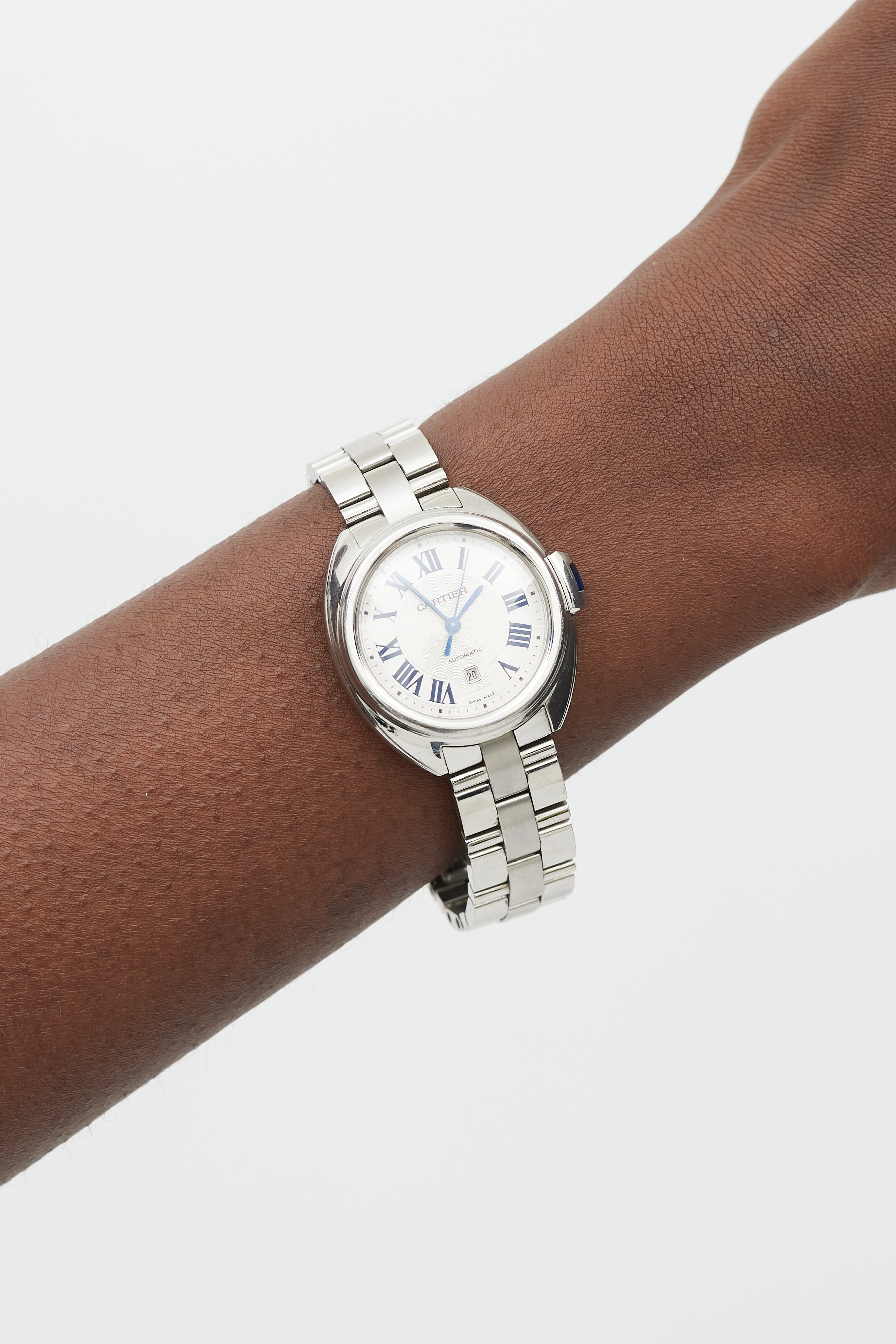 Pre-owned Cartier silver CLE De Cartier watch in stainless steel featuring a 31mm circular face, smooth bezel, white dial, dual blued-steel hands, automatic movement, roman numeral markers, date indicator, sapphire crystal at crown, link bracelet, and double fold clasp closure.