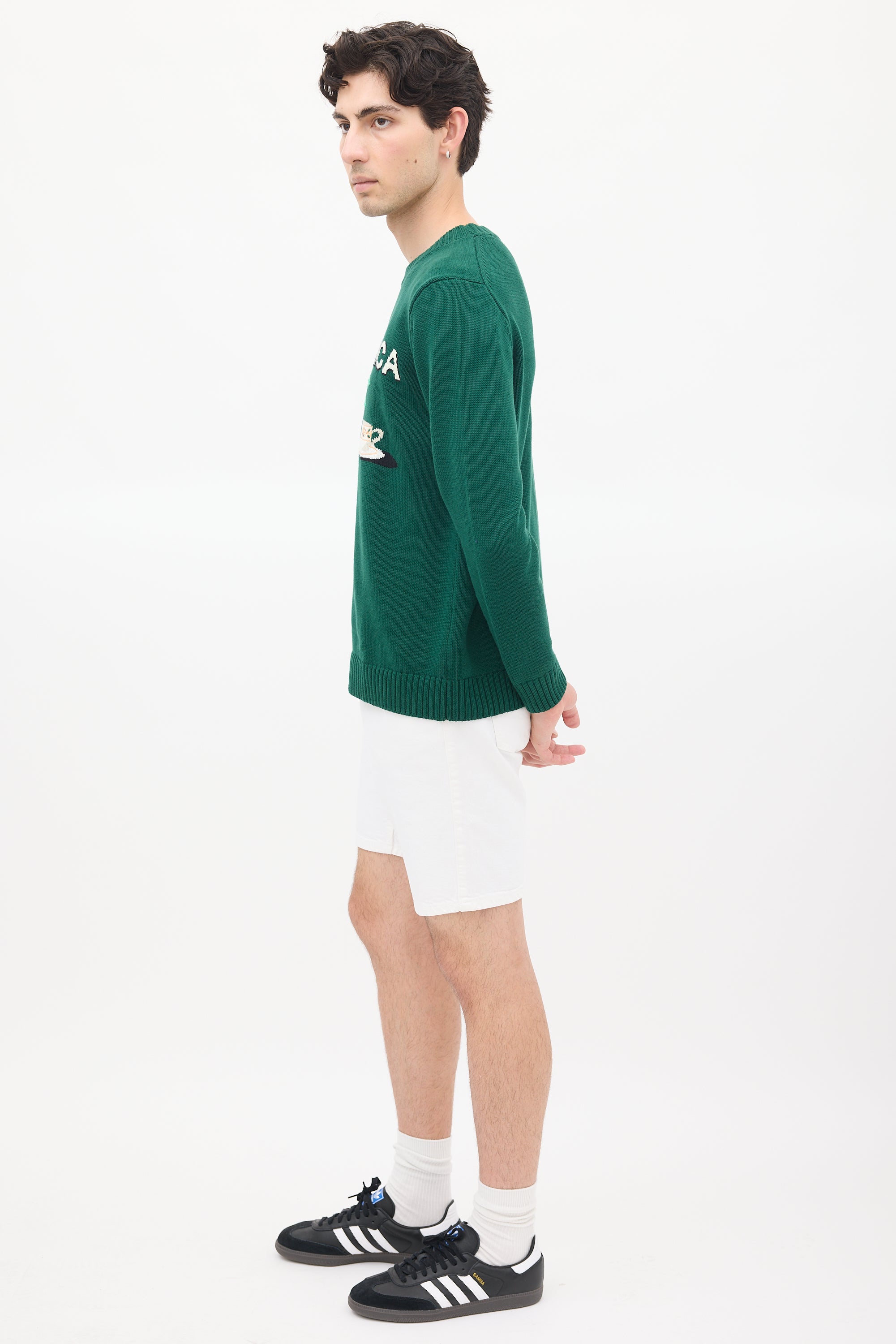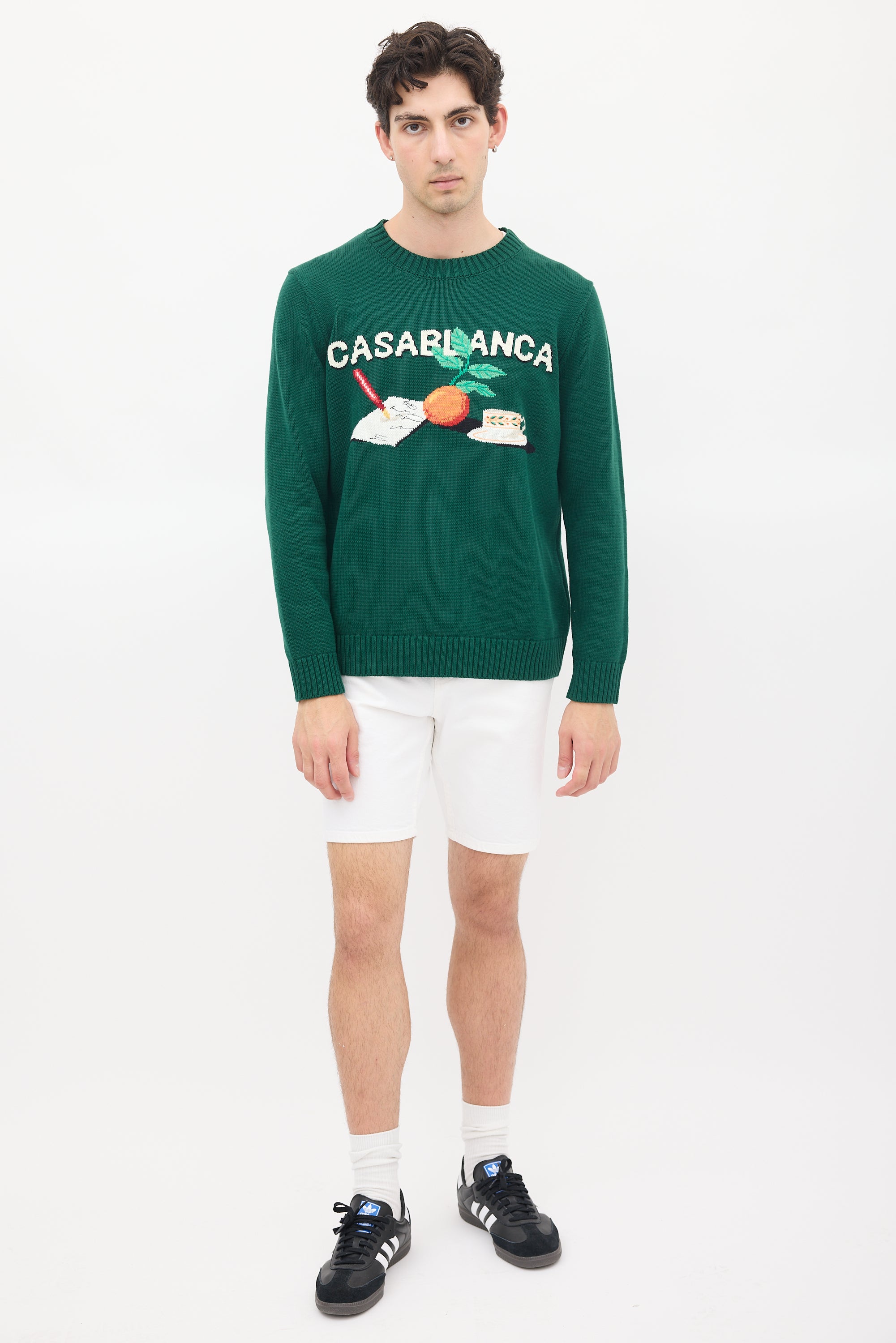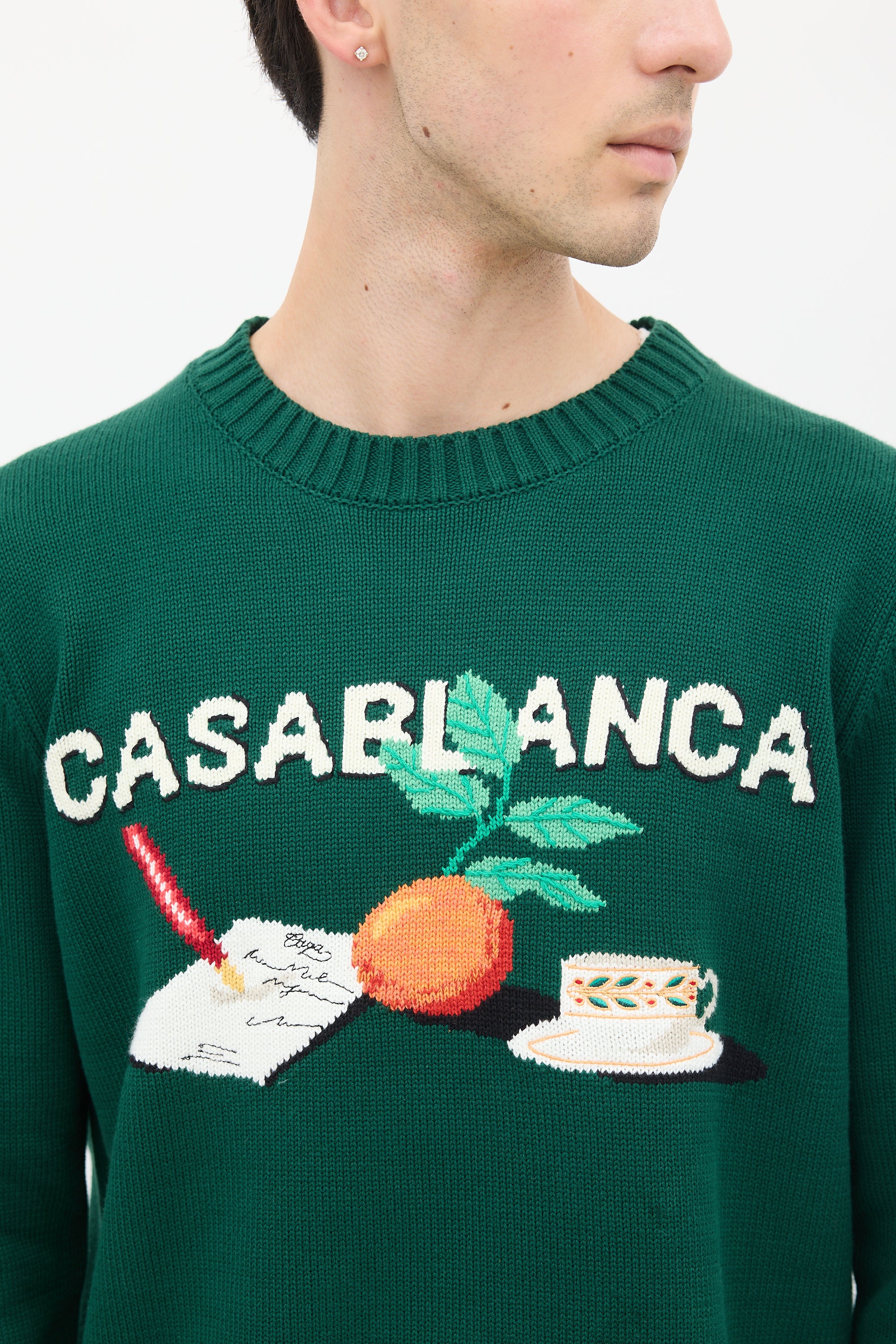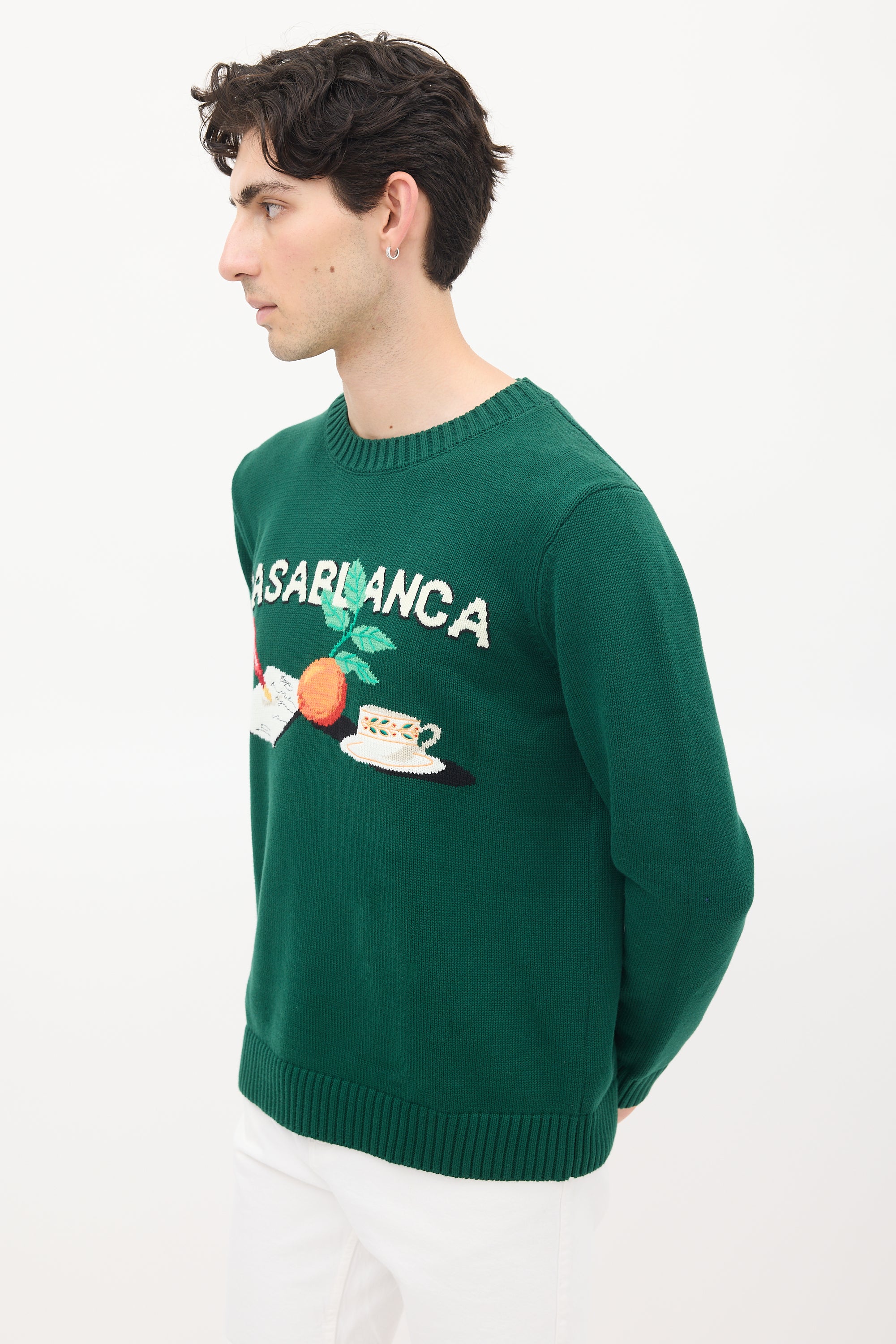 Pre-owned Casablanca green cotton sweater featuring a round neckline, multicolour orange and teacup motif graphic intarsia with embroidered detailing at front, even hem, long sleeves, and ribbing at neck, hem, and cuffs.