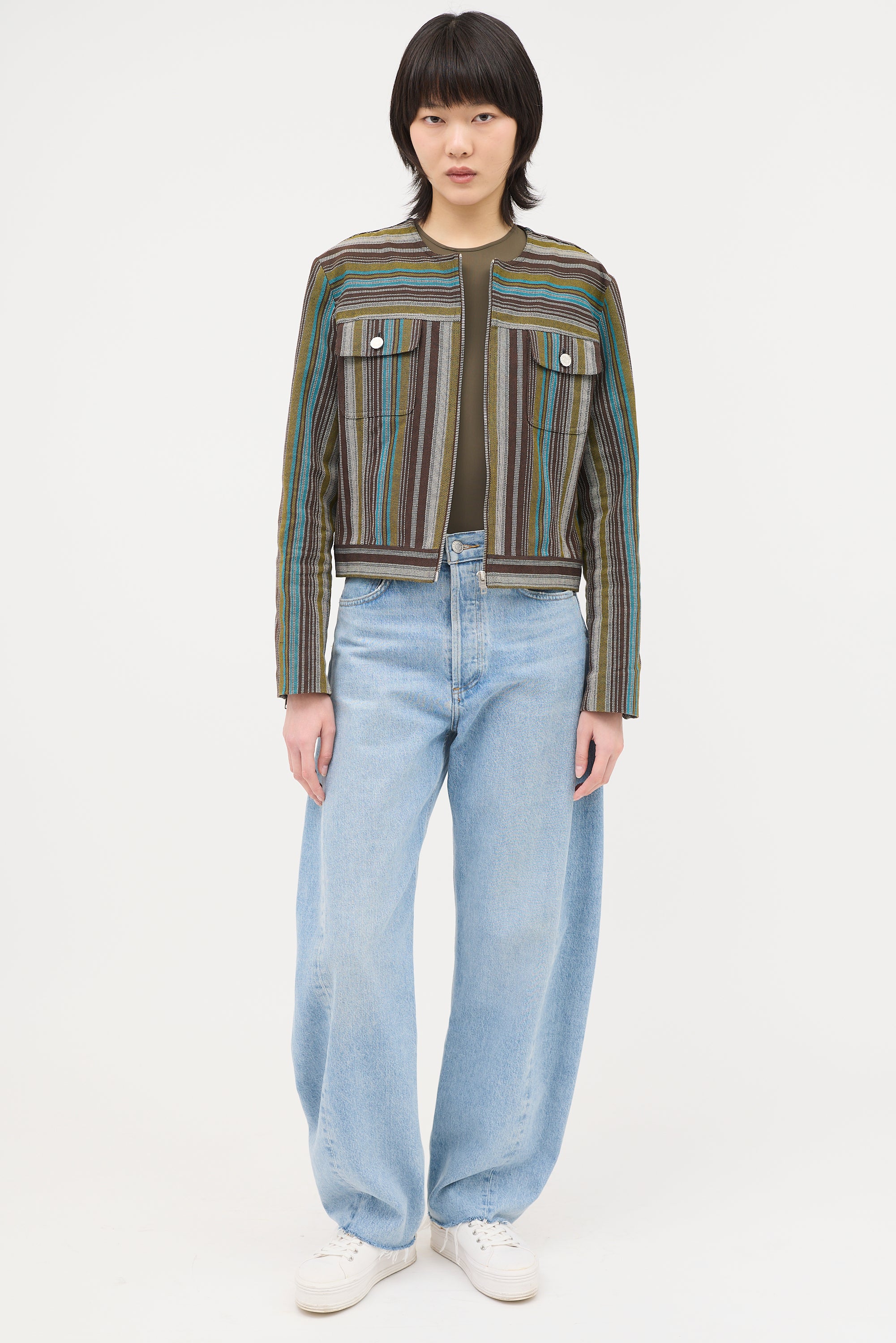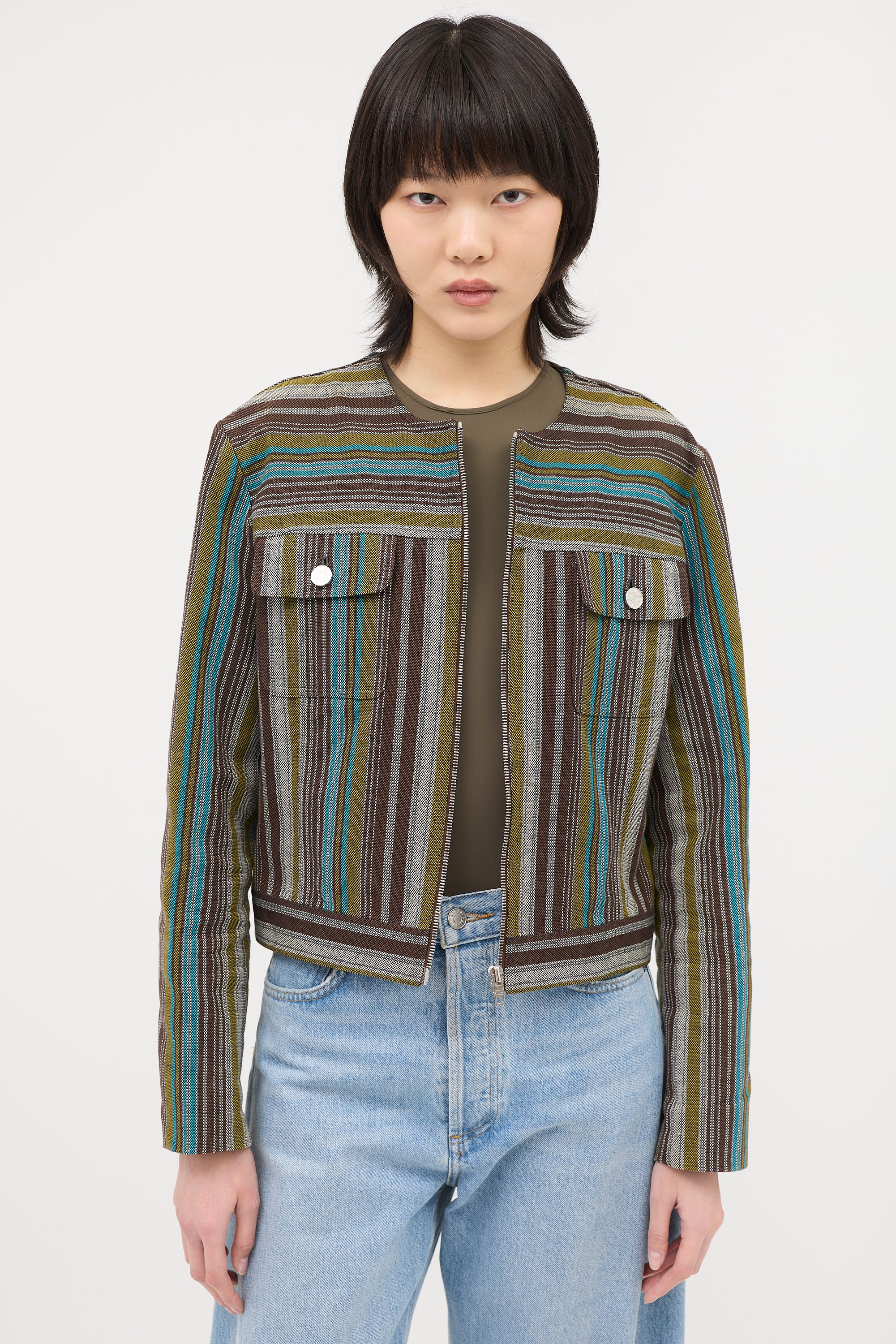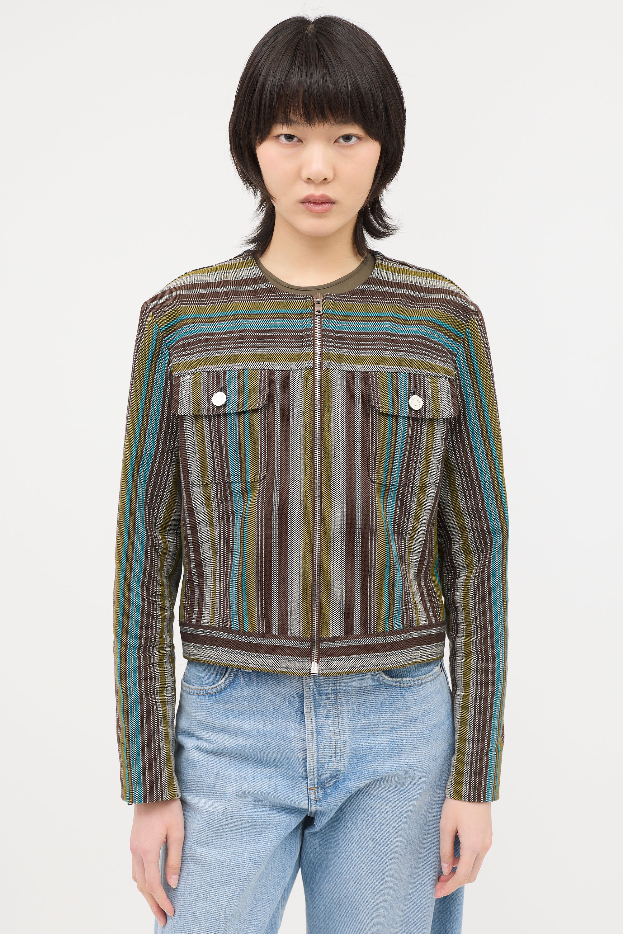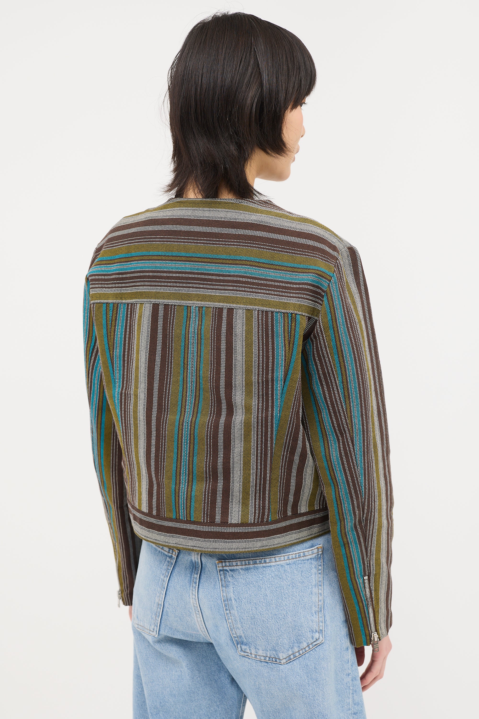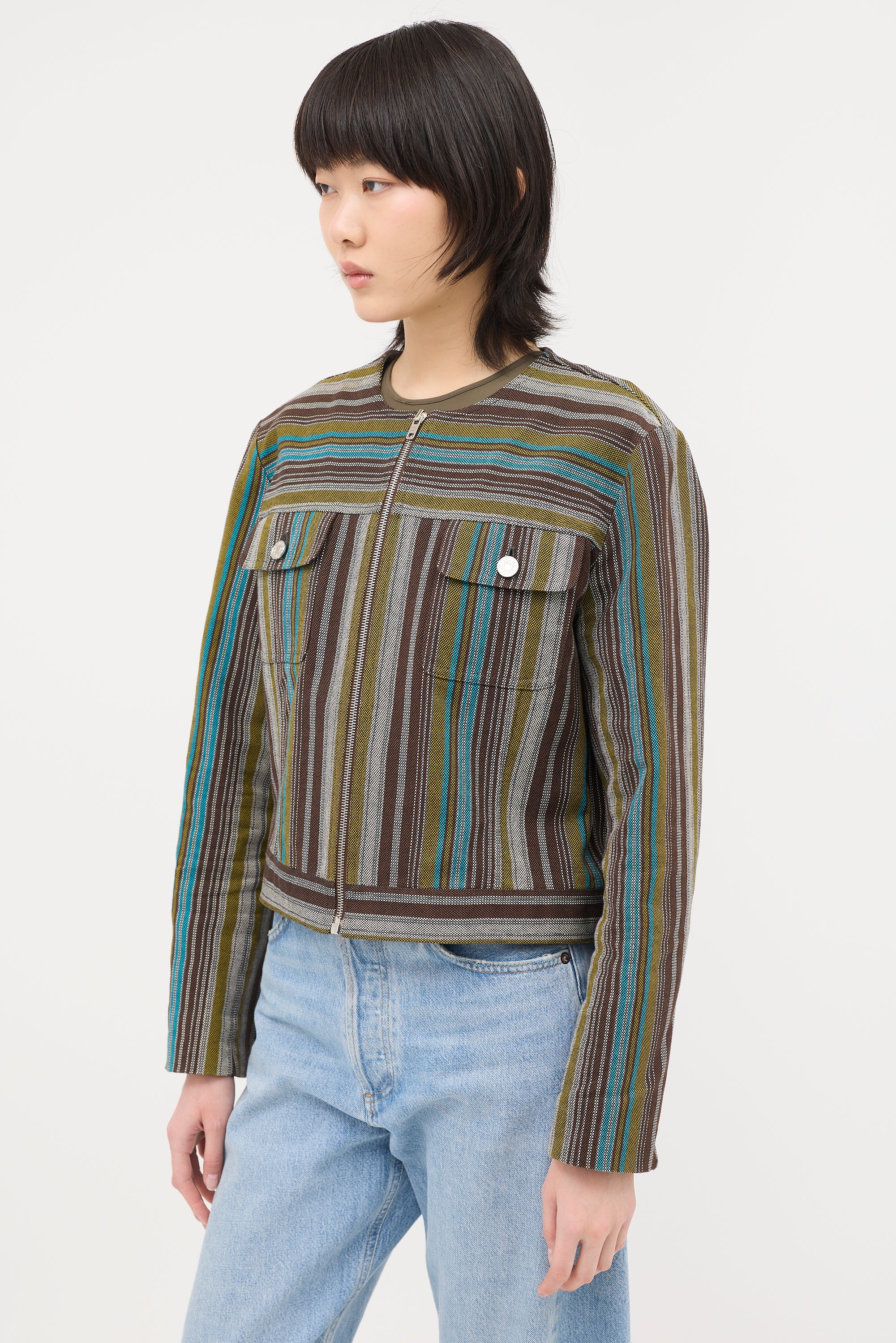 Pre-owned Celine 2000s brown and multicolour jacket featuring jacquard stripes, round neckline, zipped front, two flap pockets at chest, and zipped cuffs. Unlined.