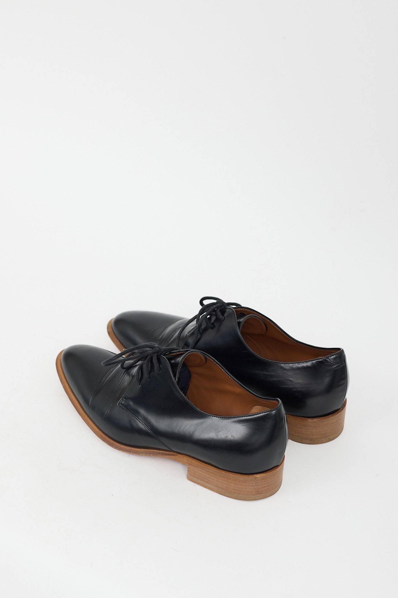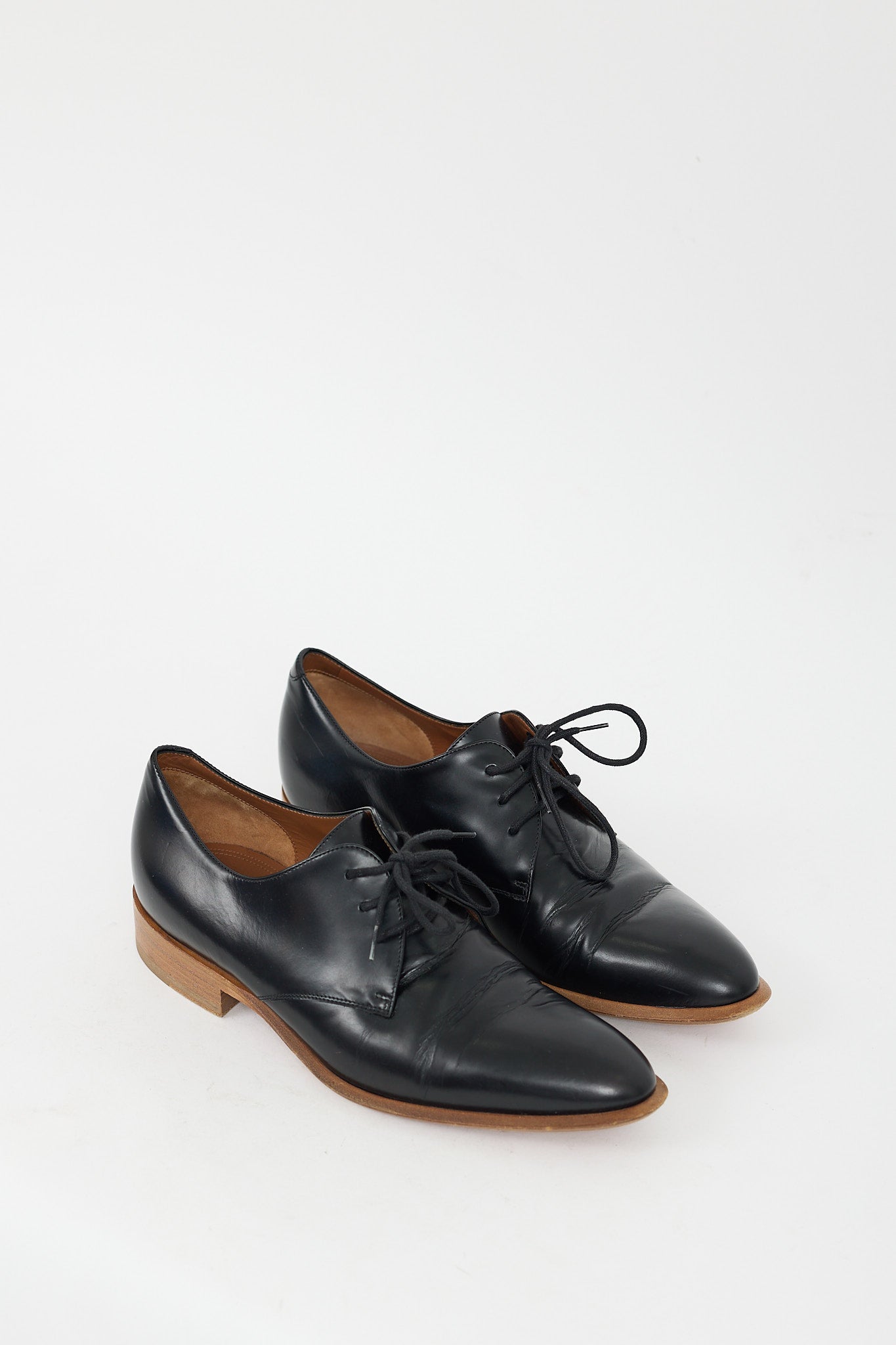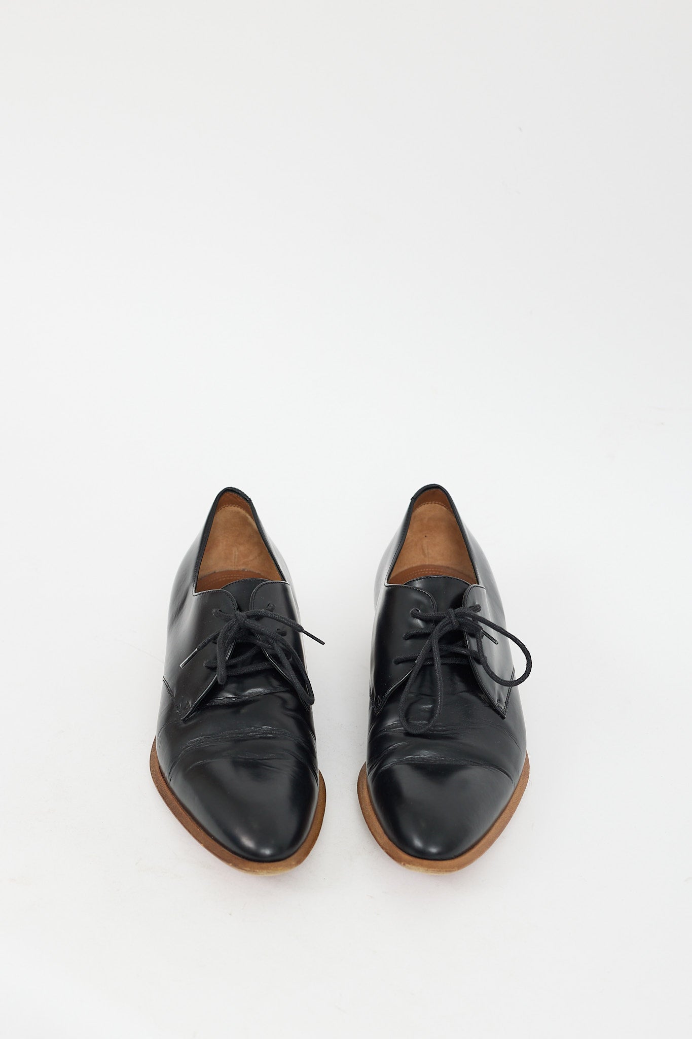 Pre-owned Celine black leather oxford featuring pointed toe, lace up front, and short stacked heel. Comes with original dust bag.