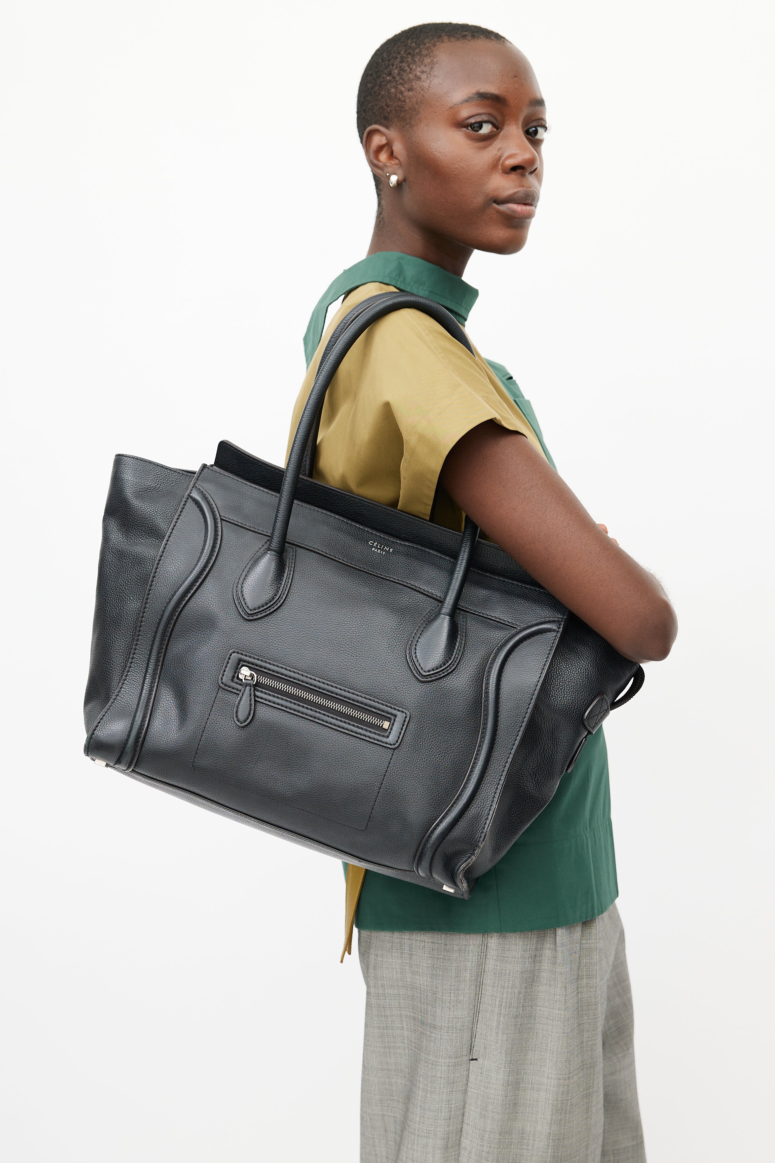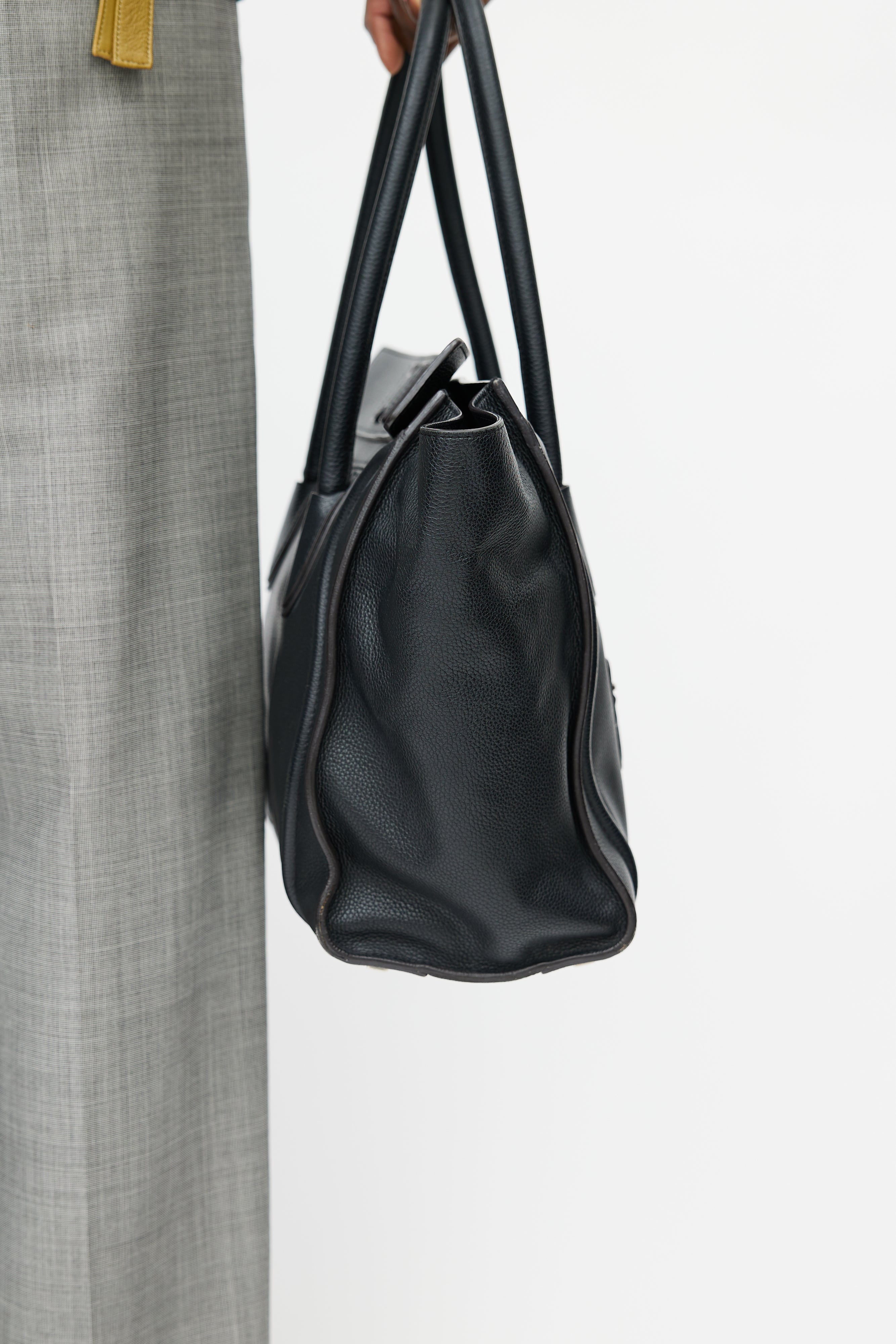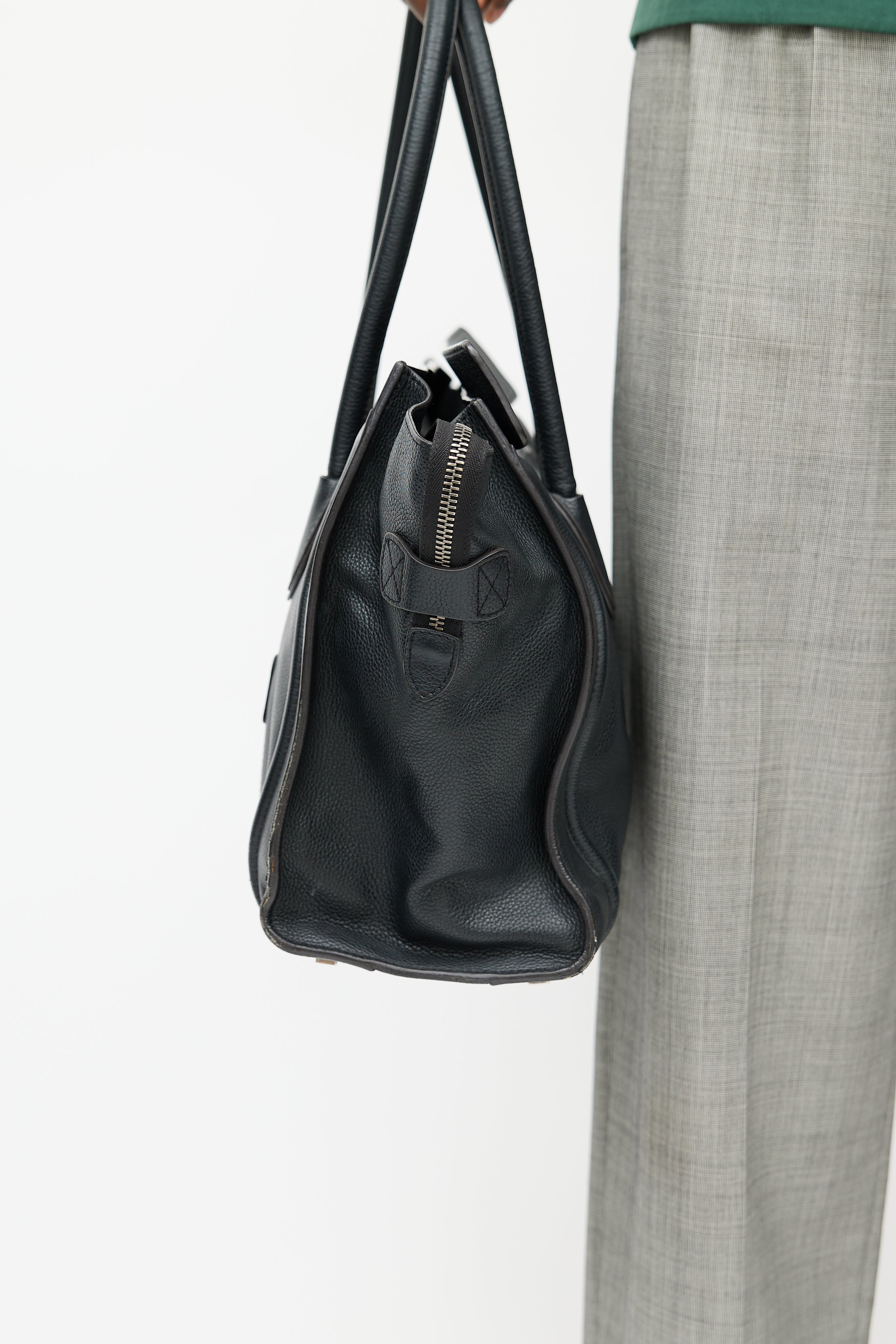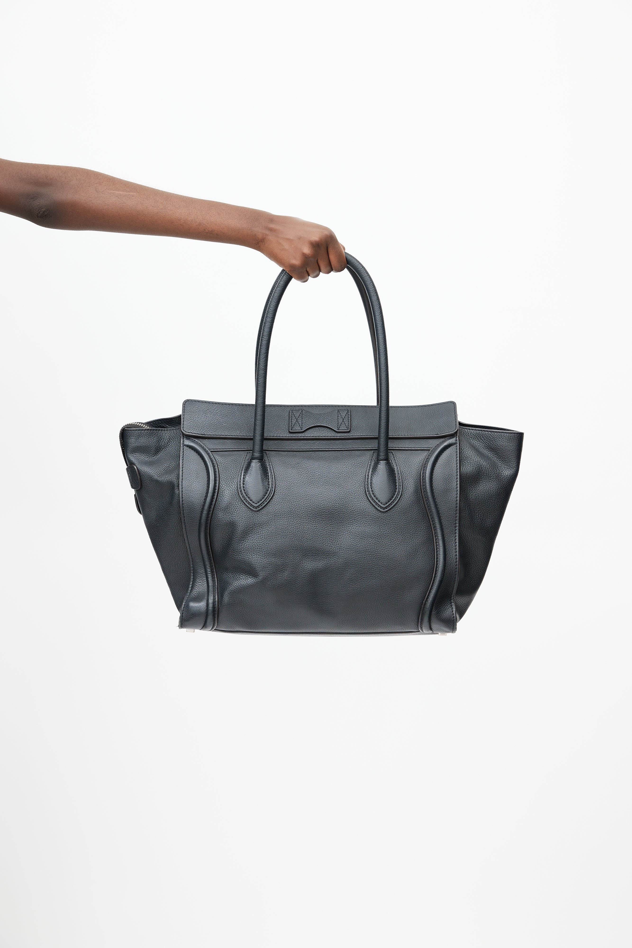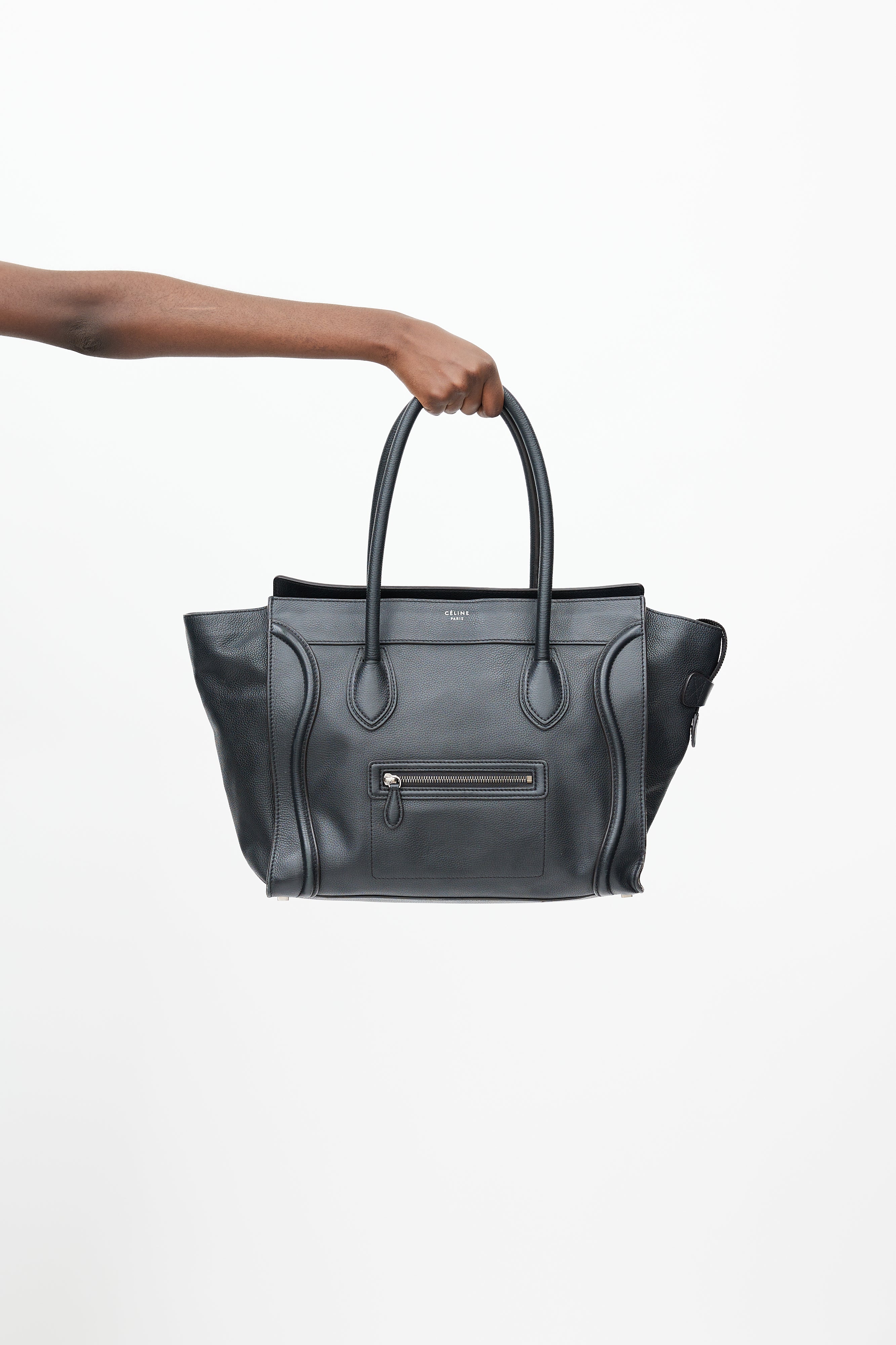 Pre-owned Celine black Phantom leather tote featuring an embossed logo at front, two wrapped top handles, one zip pocket at front, one main compartment with one zip pocket and two slip pockets, and top zip closure.