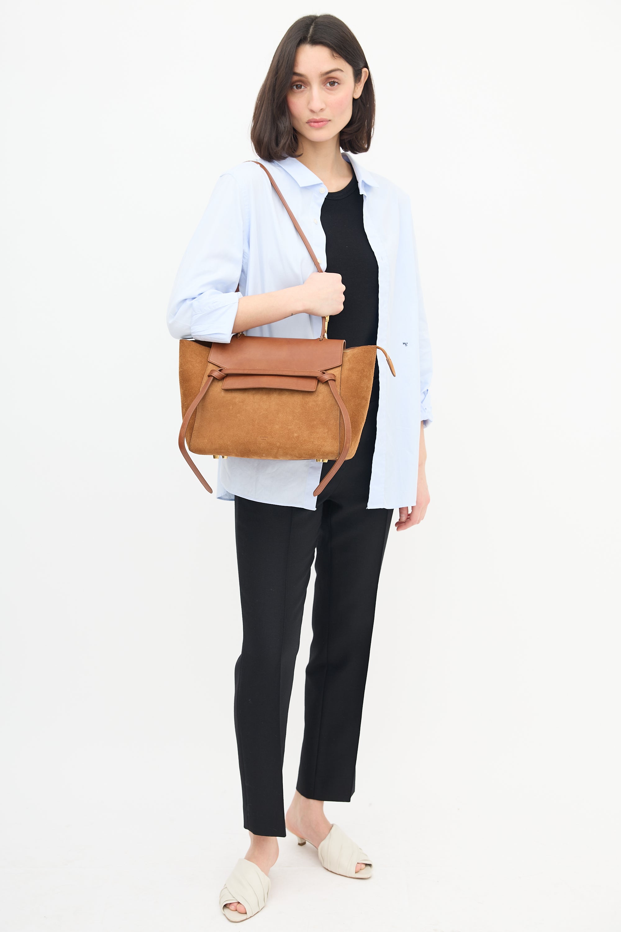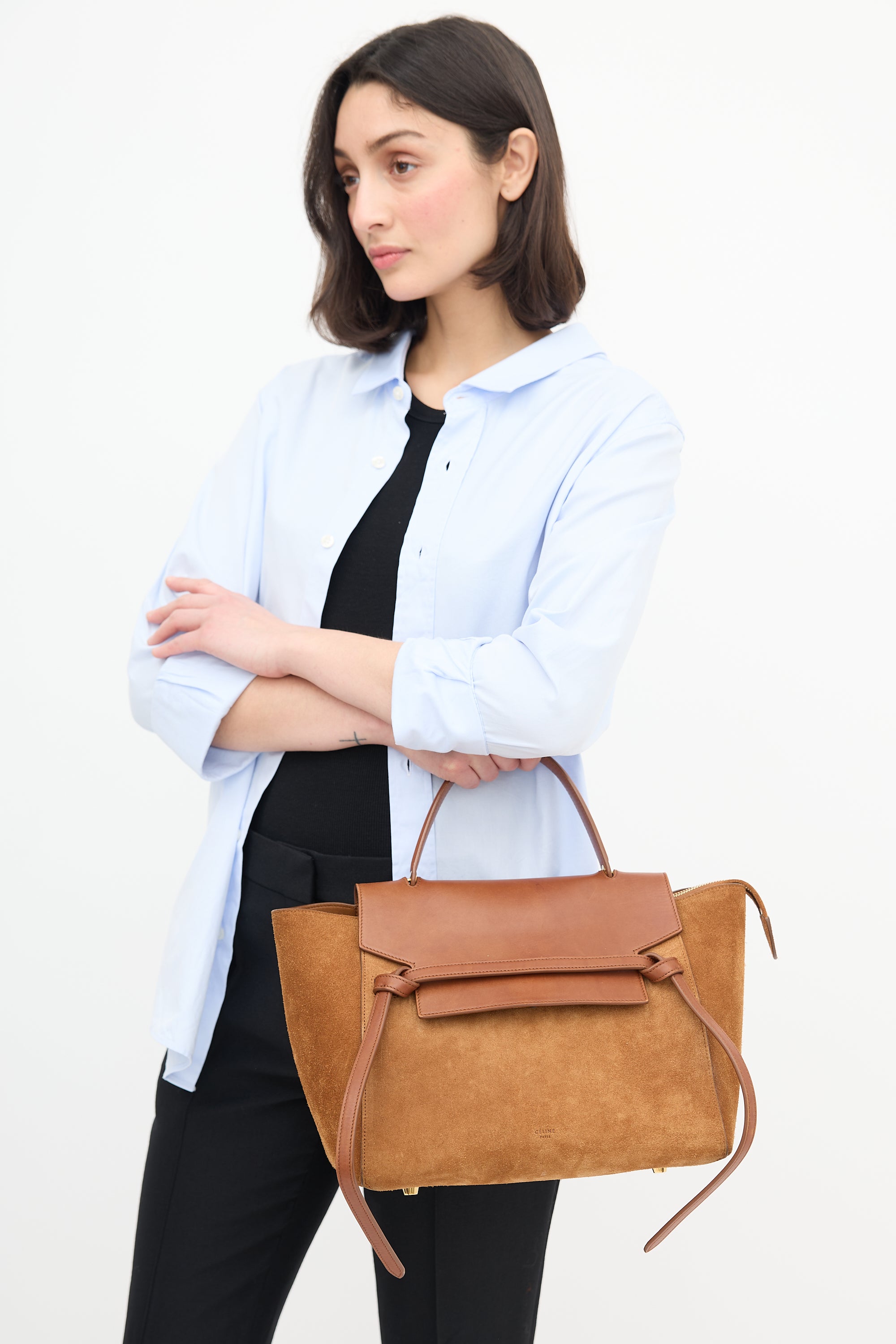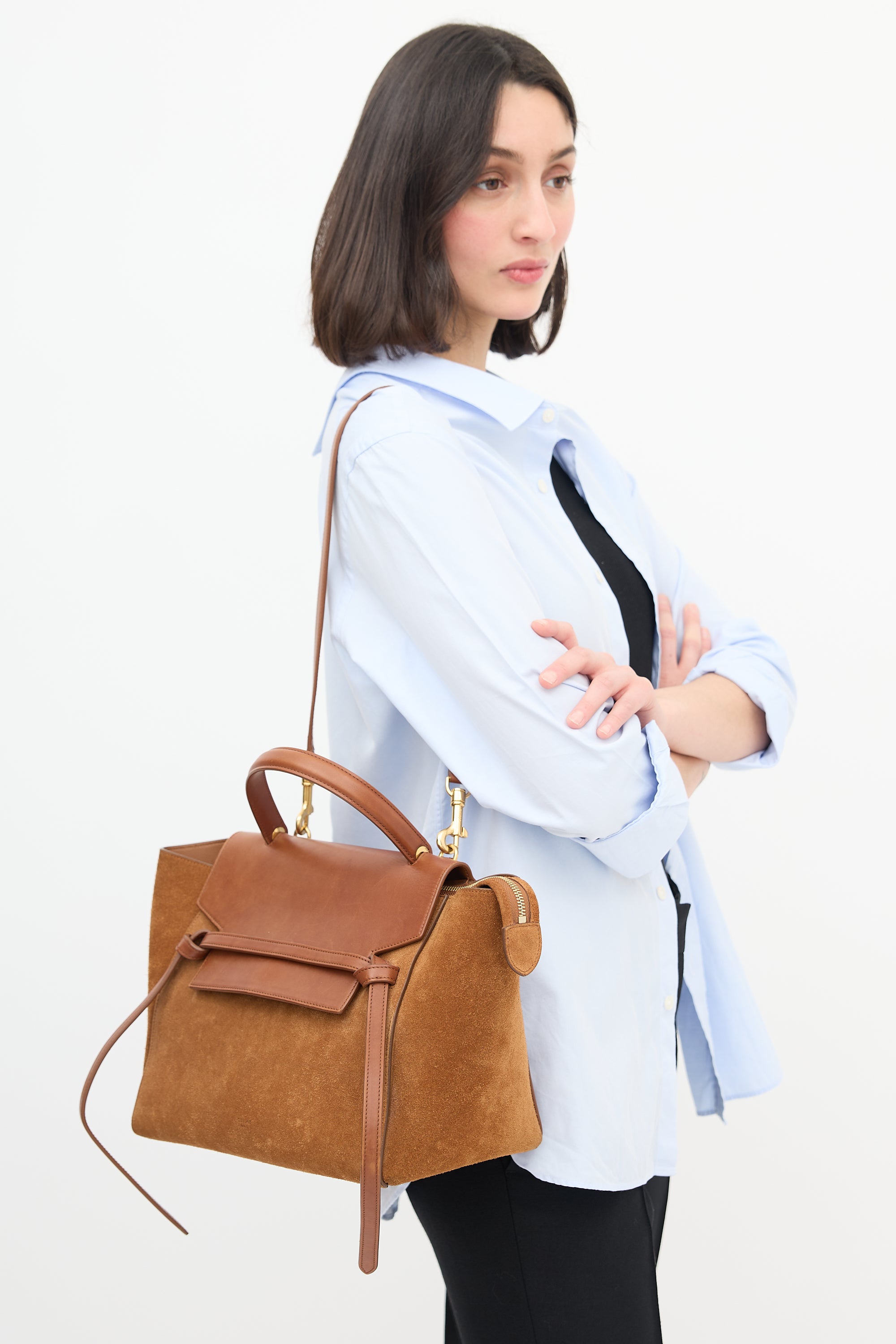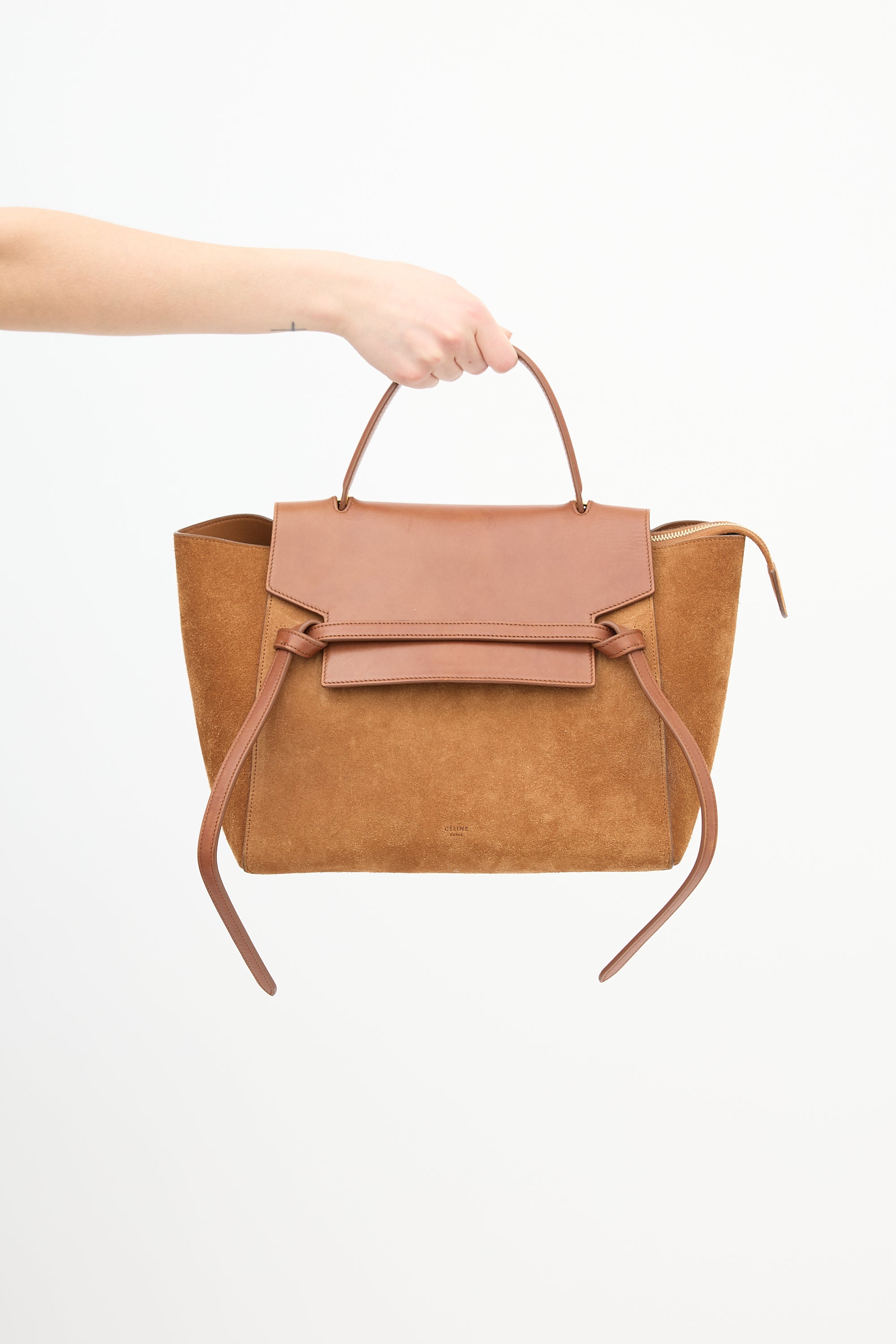 Pre-owned Celine brown suede and leather Mini Belt bag featuring a single top handle, detachable shoulder strap, top flap with hook closure, leather strap at front, gold tone hardware, zip closure at main compartment, two slip pockets inside, and four protective feet. Comes with original dust bag.