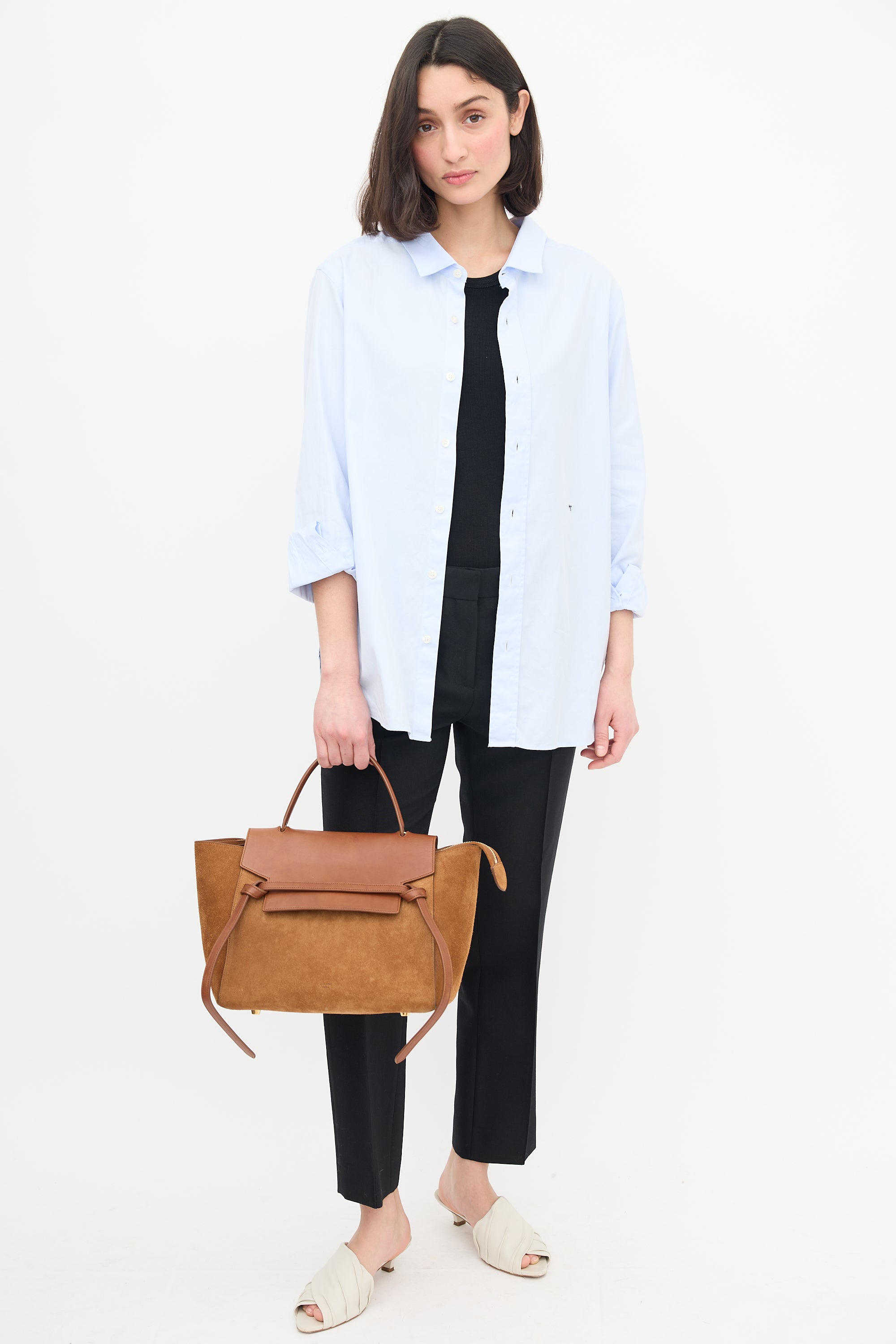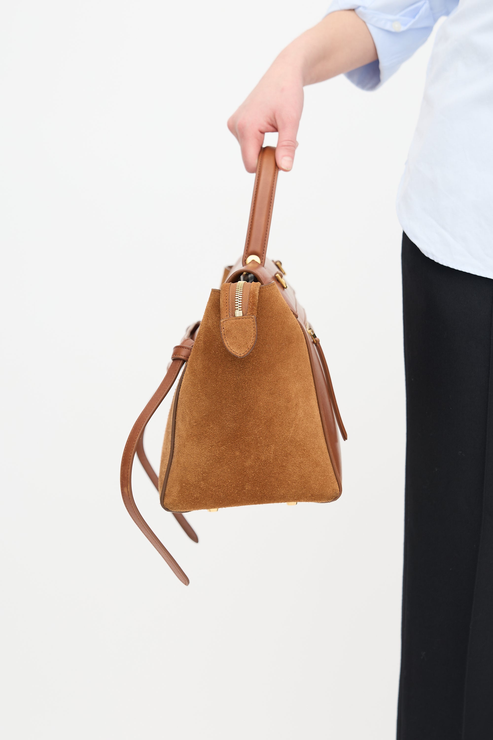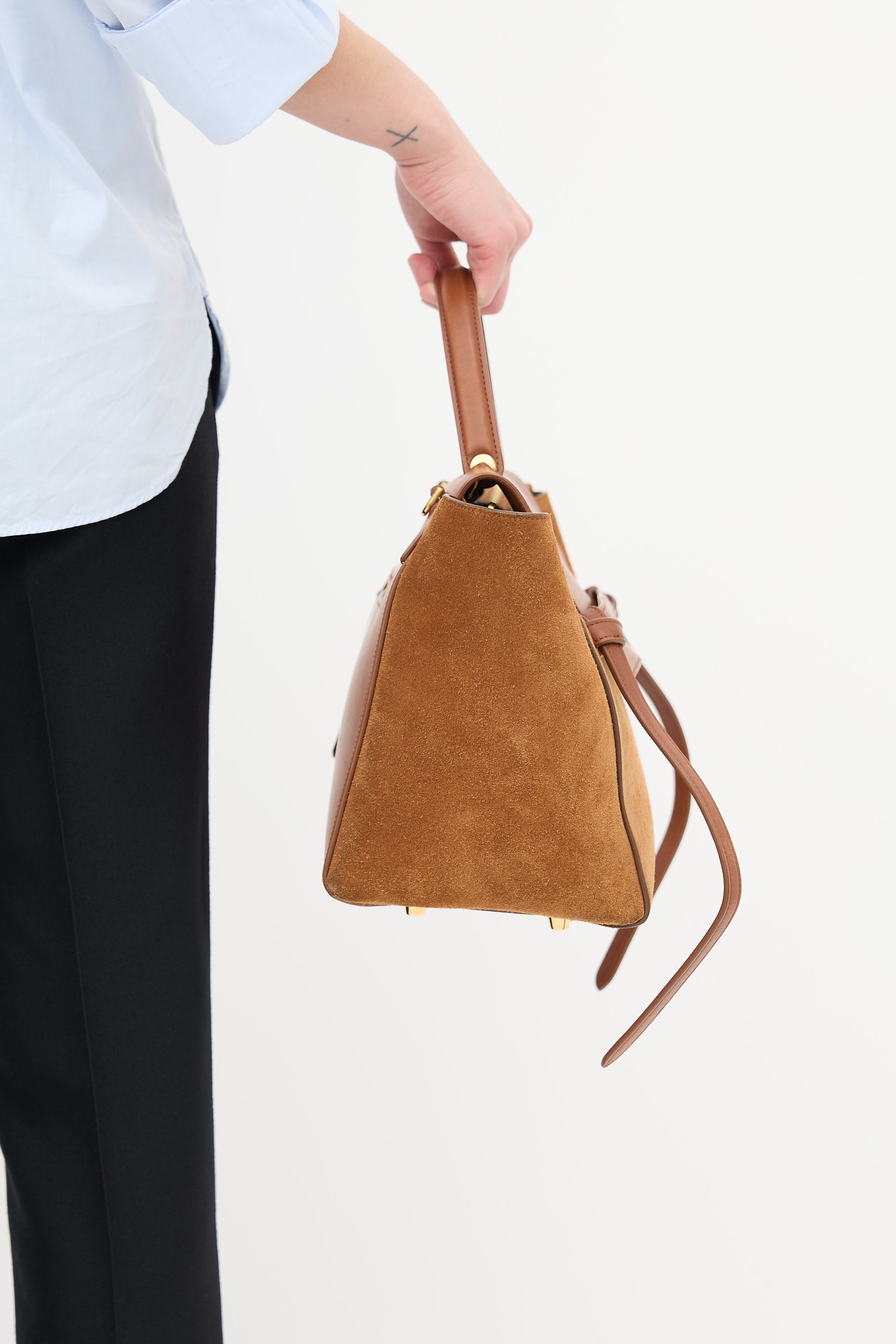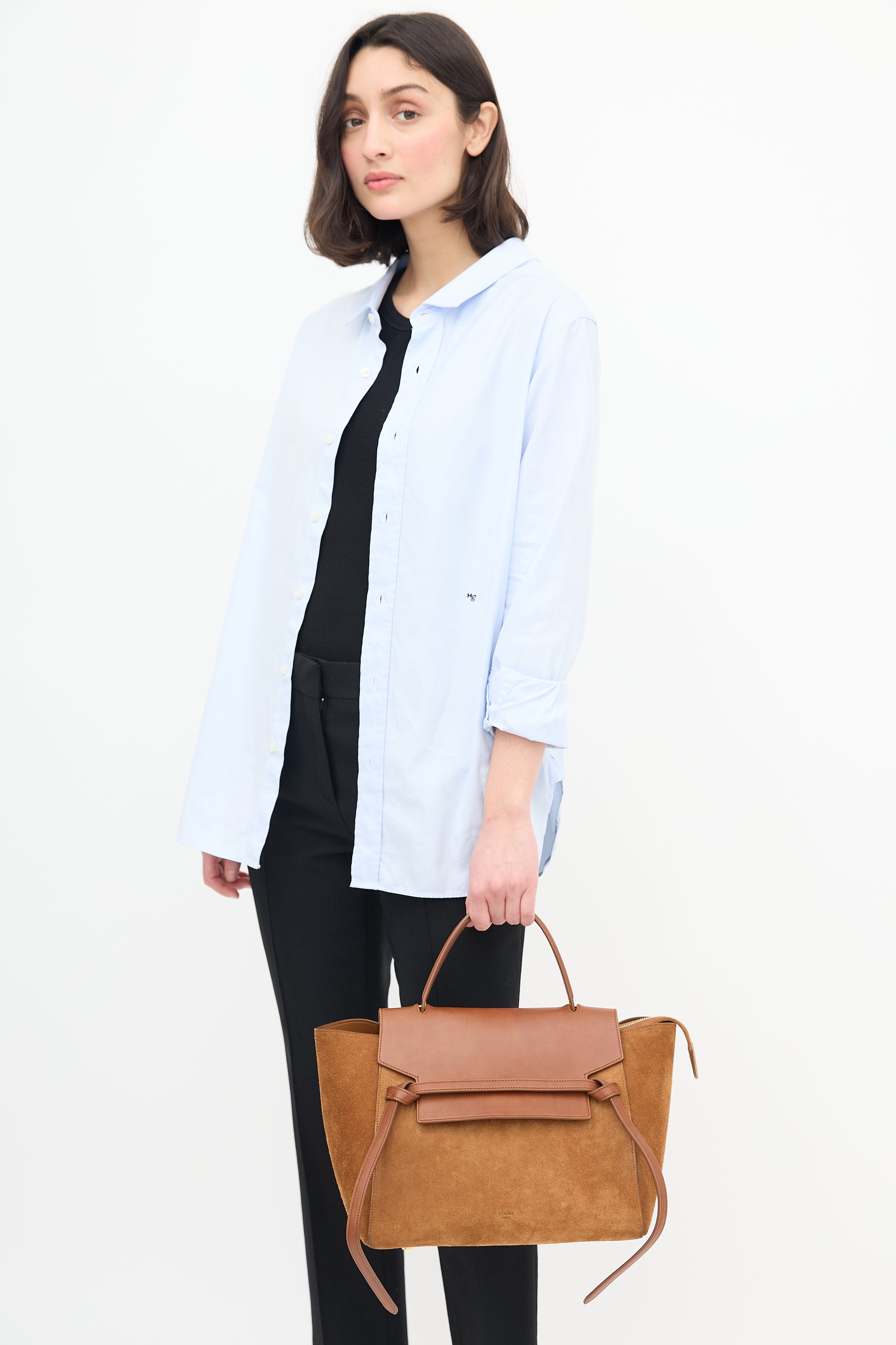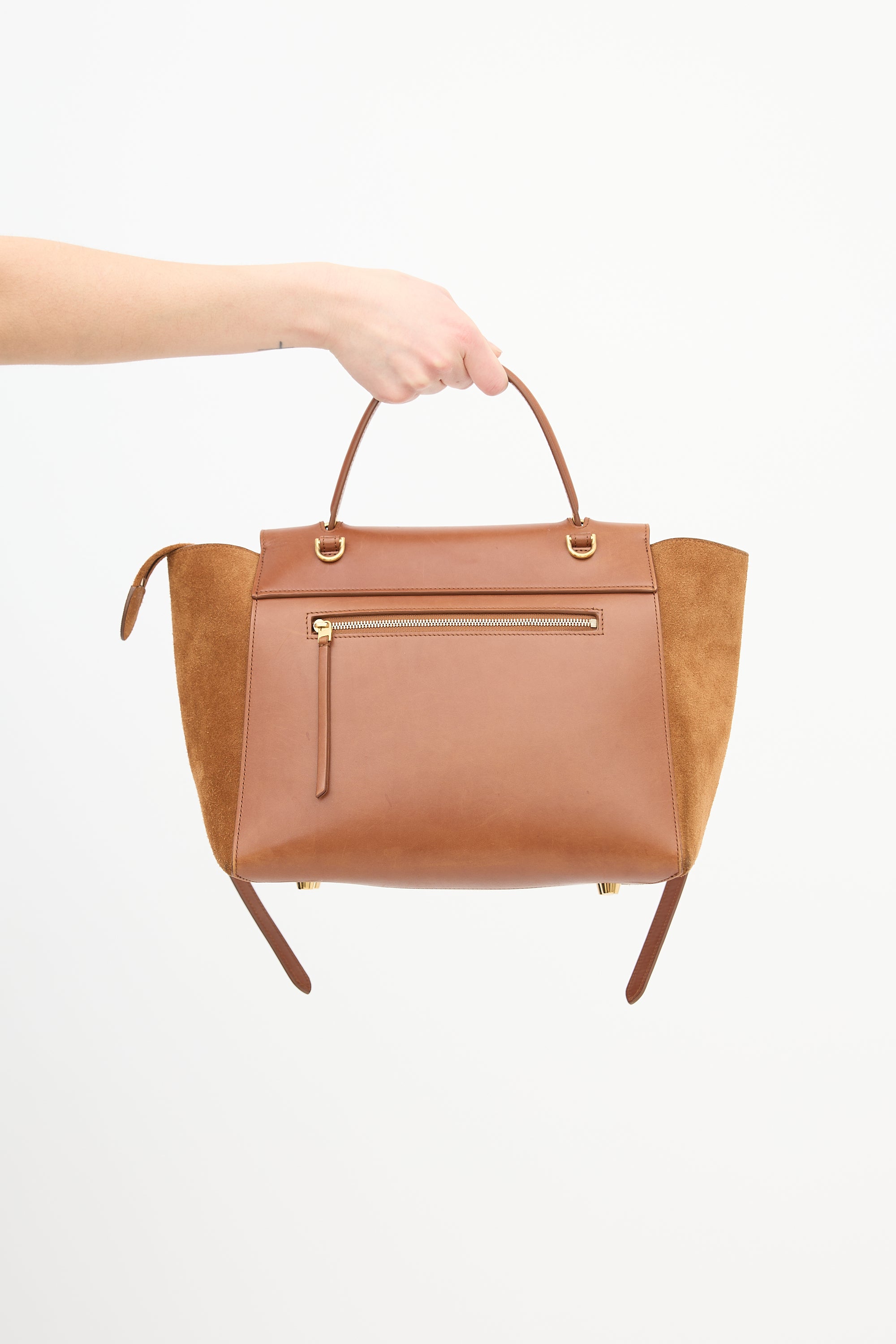 Pre-owned Celine brown suede and leather Mini Belt bag featuring a single top handle, detachable shoulder strap, top flap with hook closure, leather strap at front, gold tone hardware, zip closure at main compartment, two slip pockets inside, and four protective feet. Comes with original dust bag.